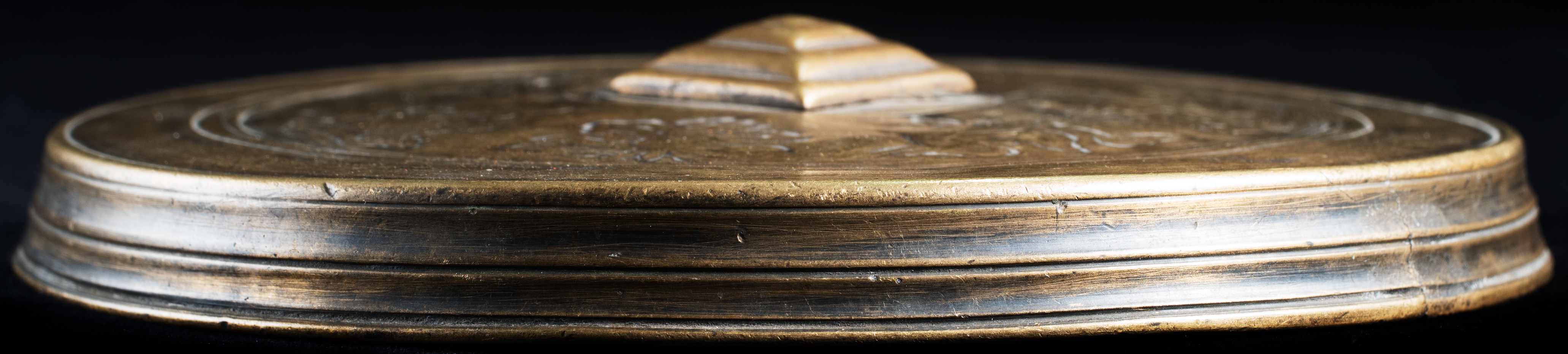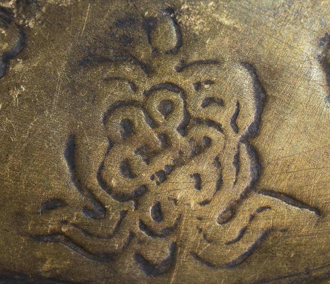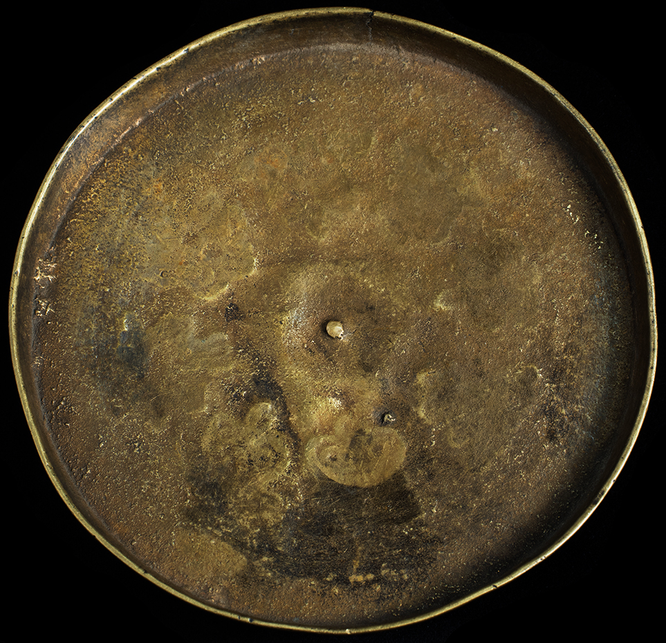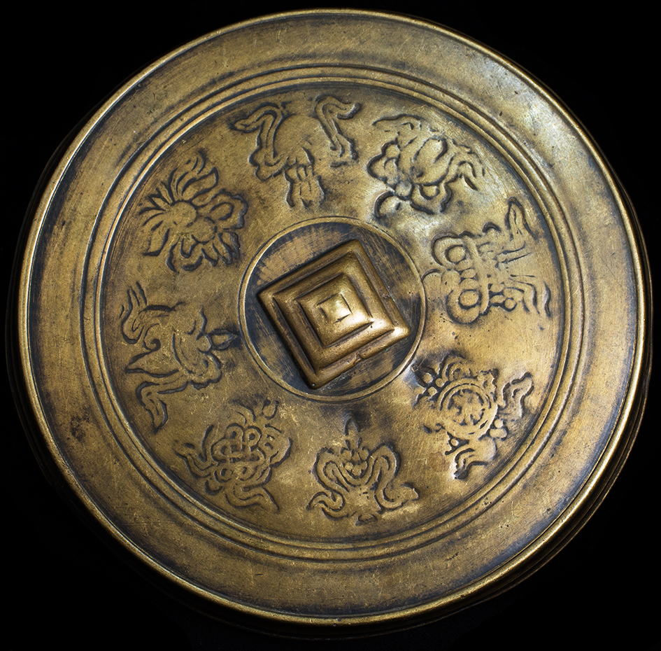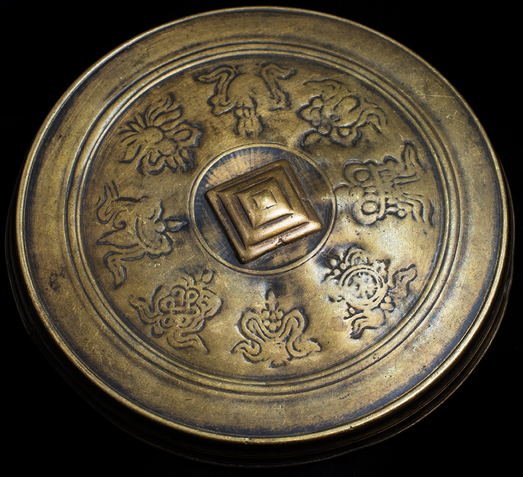 Antique Mongolian Mandala. 5.5 inches in diameter. Used to meditate on enlightenment for all sentient beings. Made of cast bronze or brass (most are made of thin repoussé copper and are much lighter weight). Has what look to be astrological signs on it (some of the cast ones are plain). The bump in the center represents Mount Meru, the cosmic center of the universe. It measures 0.5 inches tall x 5.25 inches in diameter.