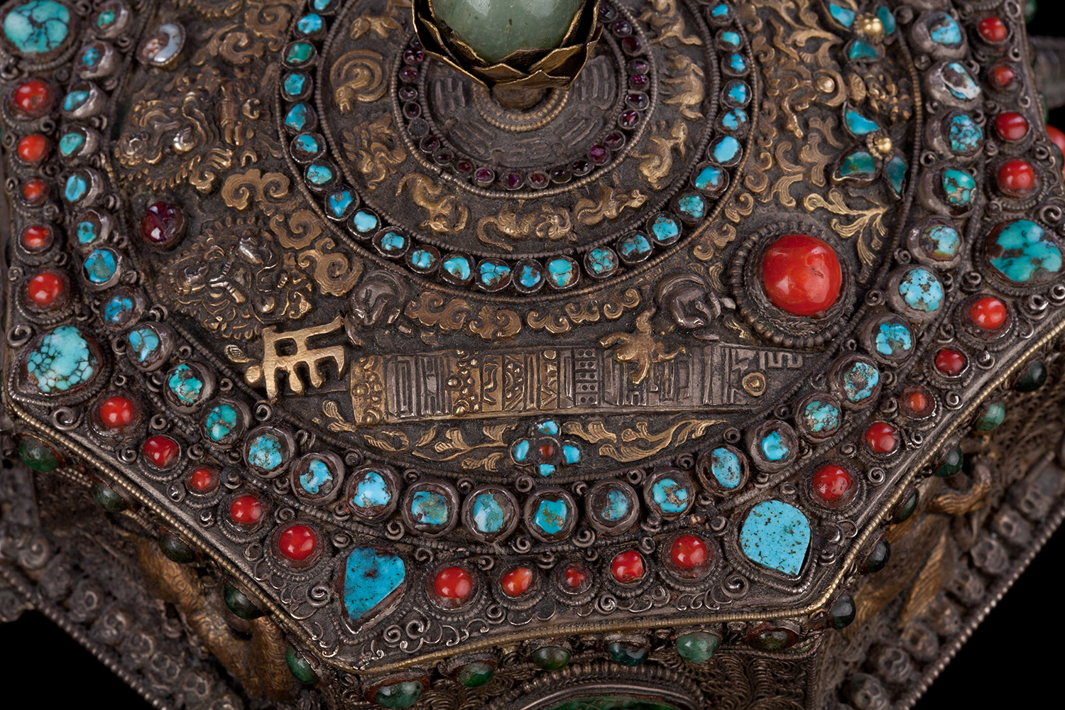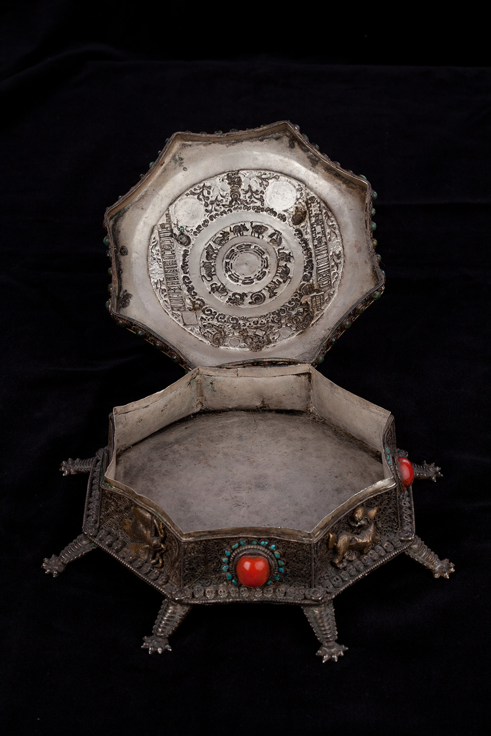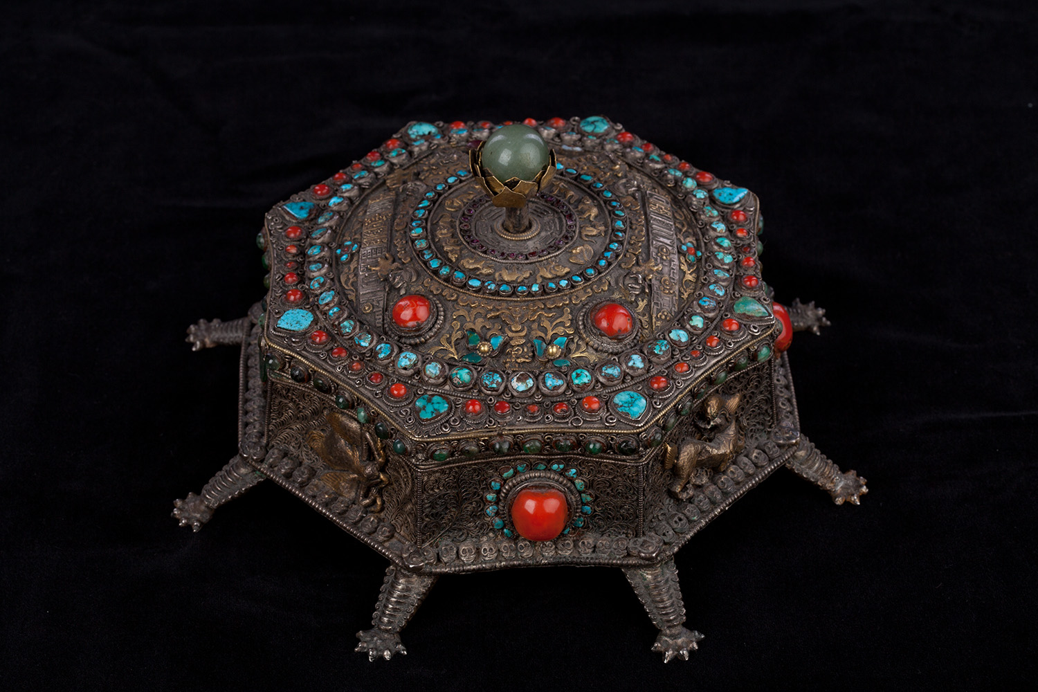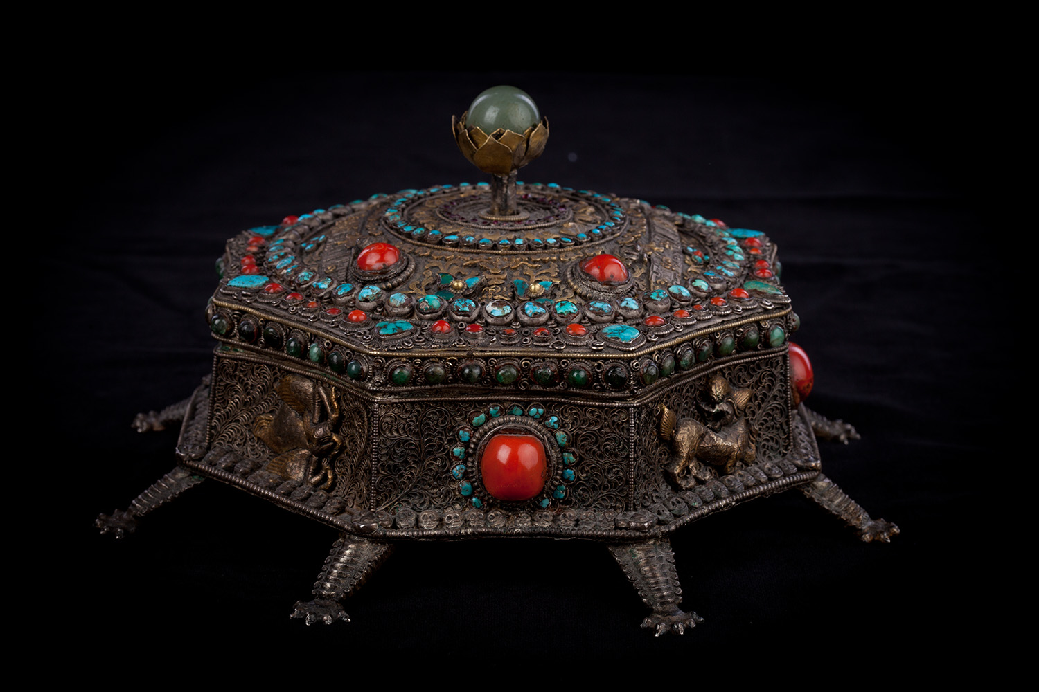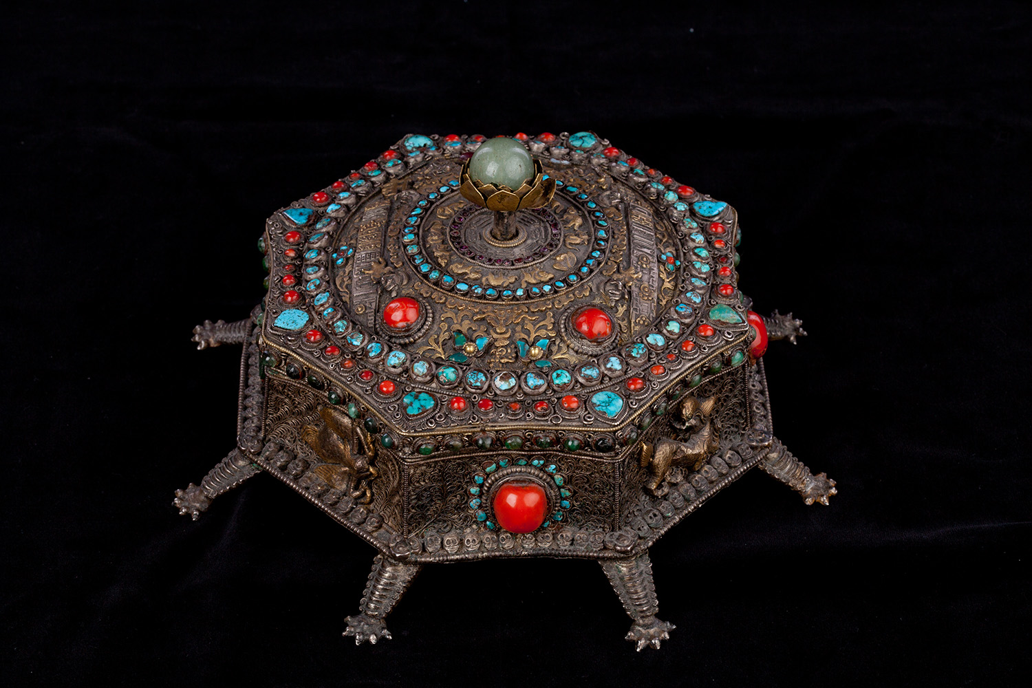 19thC three-dimensional Nepalese Mandala Box made of all silver--very finely worked, covered with very high quality semi-precious stones. The stones are of exceptional quality--much higher than typically found on the square copper Nepalese plaques (usually 20thC) that are covered with semi-precious stones. These have deep reds, greens, blues, and some of the small ones look to possibly be rubies or other precious gems. Parts (including animals on sides and many of the details on the top) are gilded. There are a very high number of of separately cast pieces added to the top and sides, after the original casting, to and complexity and dimesionality to the yantra aspect of the piece. Each has specific meaning and is done with deliberate ritual, purpose, and significance. The bottom has a mandala incised into the flat silver surface. Additional detail could be brought out with a careful cleaning, as I believe it has been a long time (if ever) since it has had one. Many people would leave it untouched. With such a complex silver object, this is a personal decision. Very rare with amazing detail. Not a tourist piece but made for practice. In amazing condition. The jade ball on the very top is removable for shipping and storage. Finest related object anyone who sees it has ever seen. Museum quality. From an old German collection. This and the posted large 19thC Nepalese Mandala also covered with semi-precious stones are from the same old German collection and are now in my personal collection. Height is 4 1/3 inches.