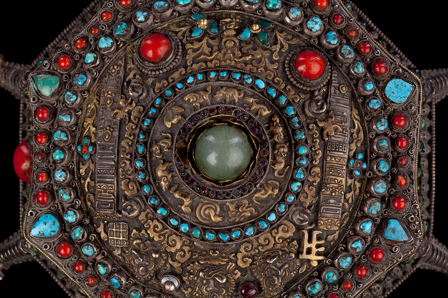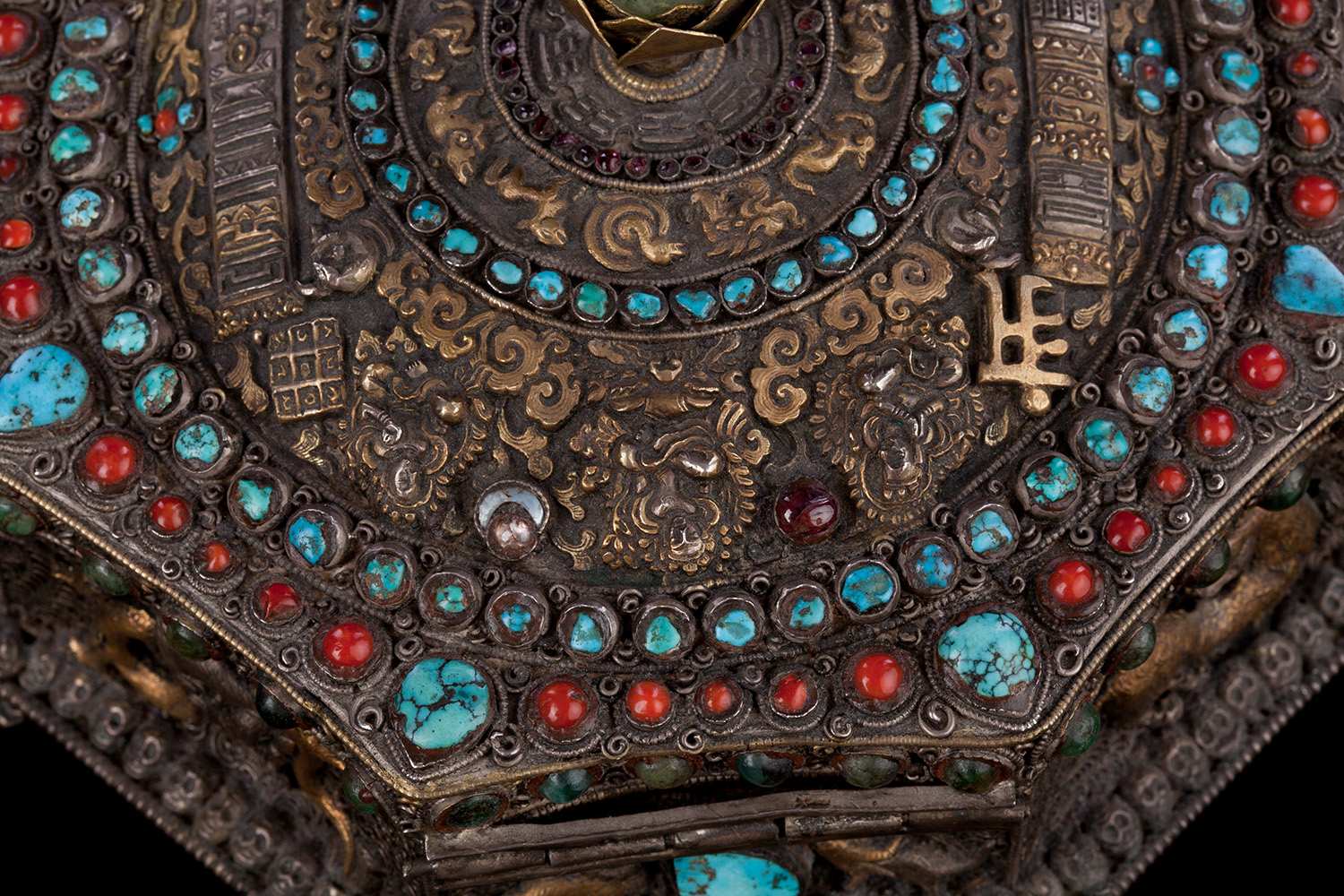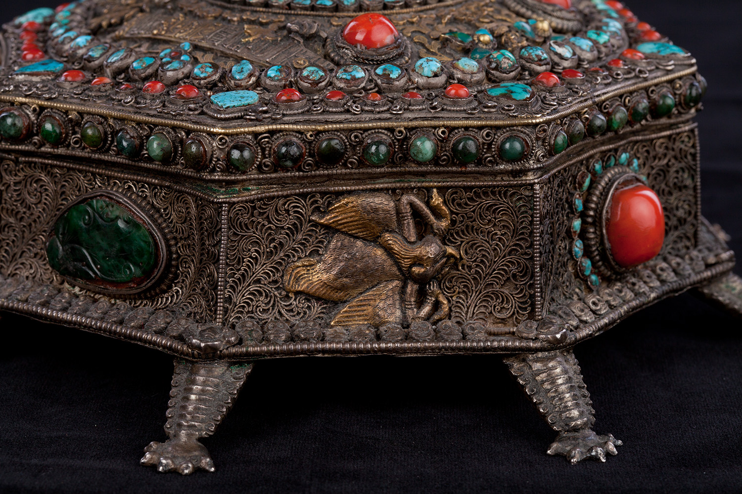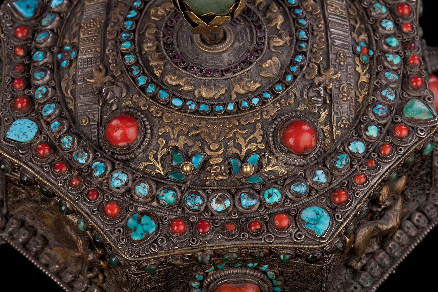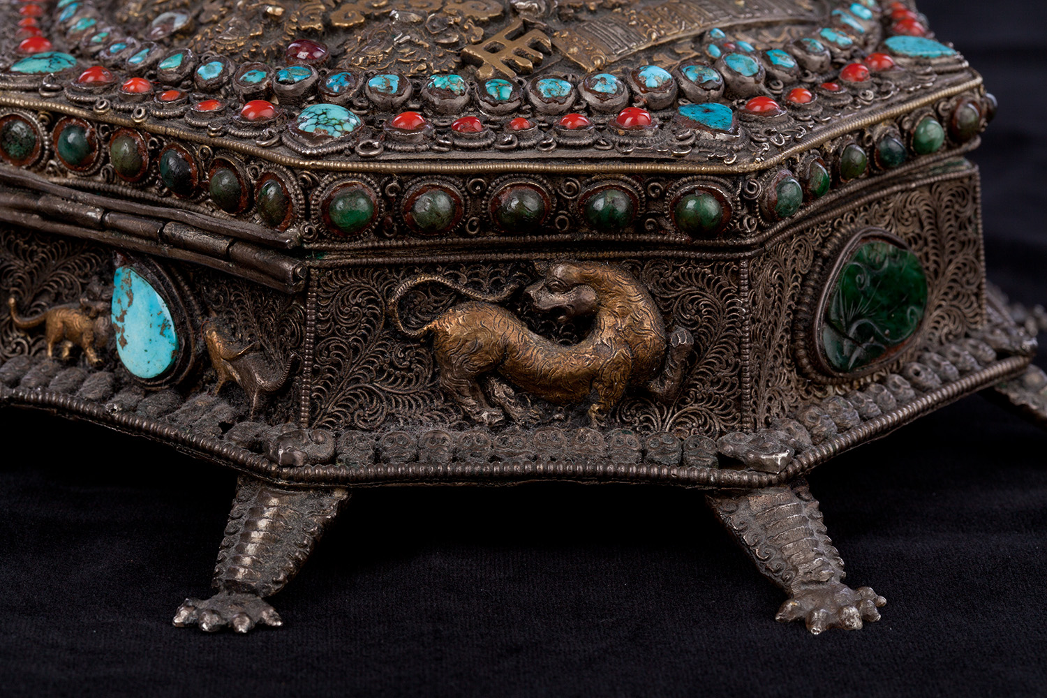 19thC three-dimensional Nepalese Mandala Box made of all silver--very finely worked, covered with very high quality semi-precious stones. The stones are of exceptional quality--much higher than typically found on the square copper Nepalese plaques (usually 20thC) that are covered with semi-precious stones. These have deep reds, greens, blues, and some of the small ones look to possibly be rubies or other precious gems. Parts (including animals on sides and many of the details on the top) are gilded. There are a very high number of of separately cast pieces added to the top and sides, after the original casting, to and complexity and dimesionality to the yantra aspect of the piece. Each has specific meaning and is done with deliberate ritual, purpose, and significance. The bottom has a mandala incised into the flat silver surface. Additional detail could be brought out with a careful cleaning, as I believe it has been a long time (if ever) since it has had one. Many people would leave it untouched. With such a complex silver object, this is a personal decision. Very rare with amazing detail. Not a tourist piece but made for practice. In amazing condition. The jade ball on the very top is removable for shipping and storage. Finest related object anyone who sees it has ever seen. Museum quality. From an old German collection. This and the posted large 19thC Nepalese Mandala also covered with semi-precious stones are from the same old German collection and are now in my personal collection. Height is 4 1/3 inches.