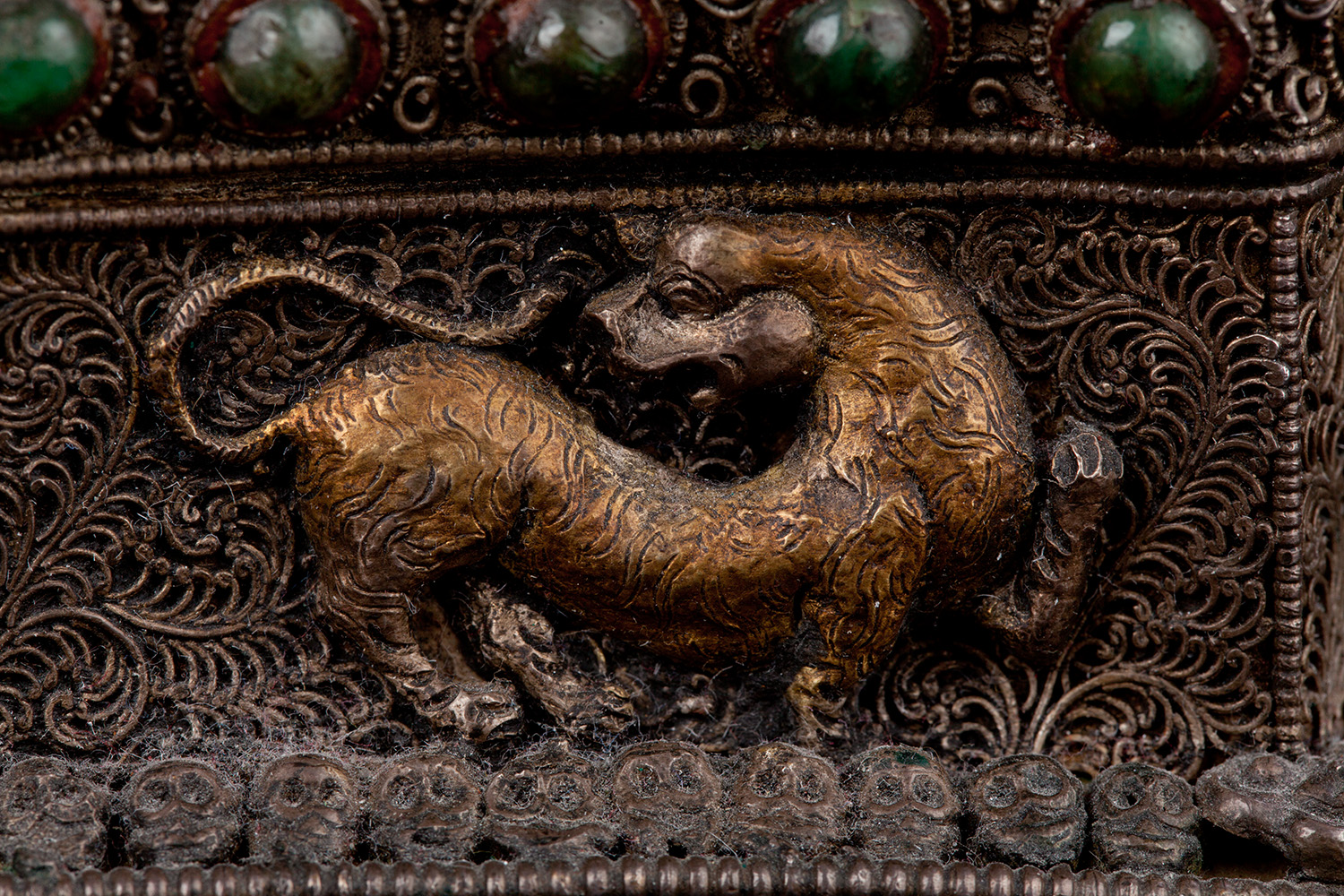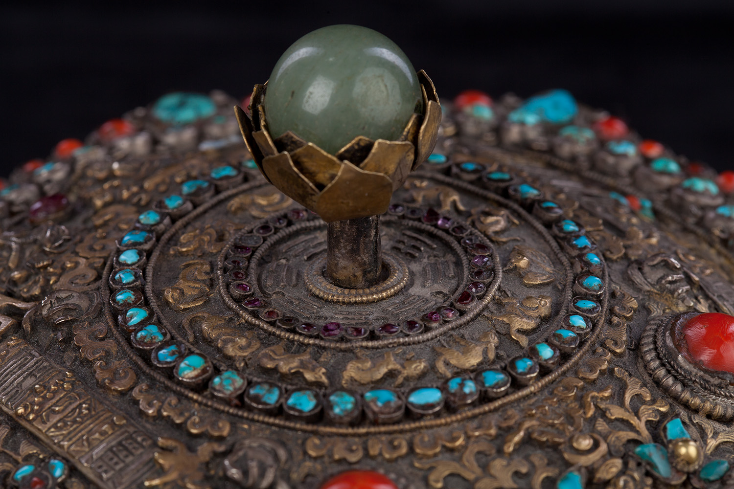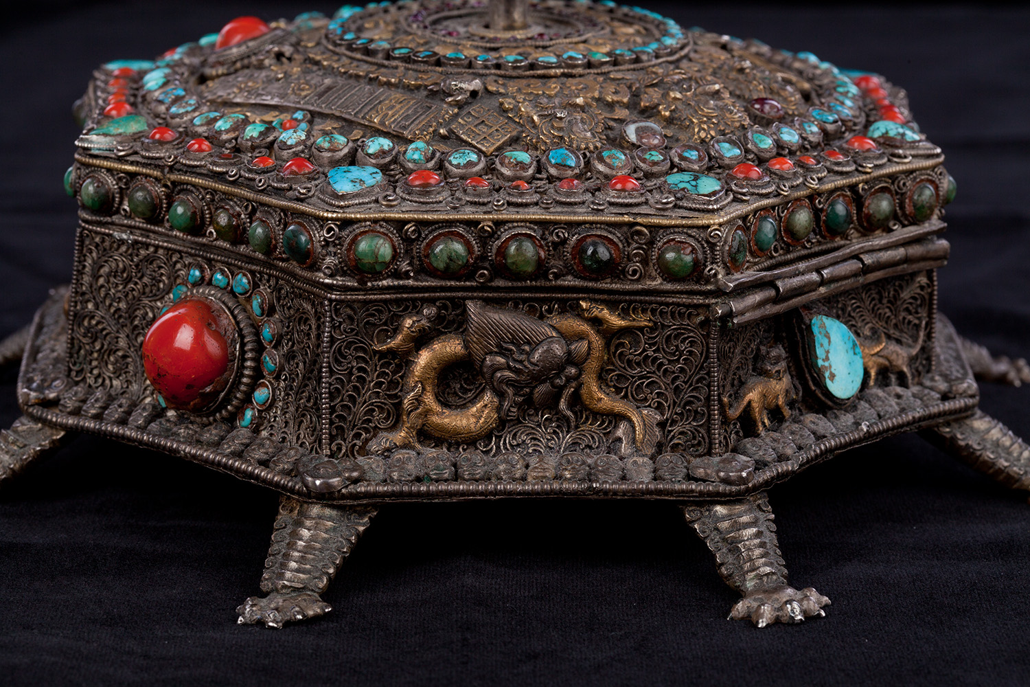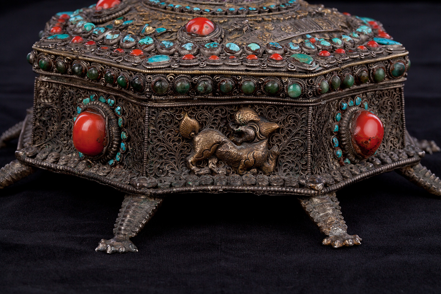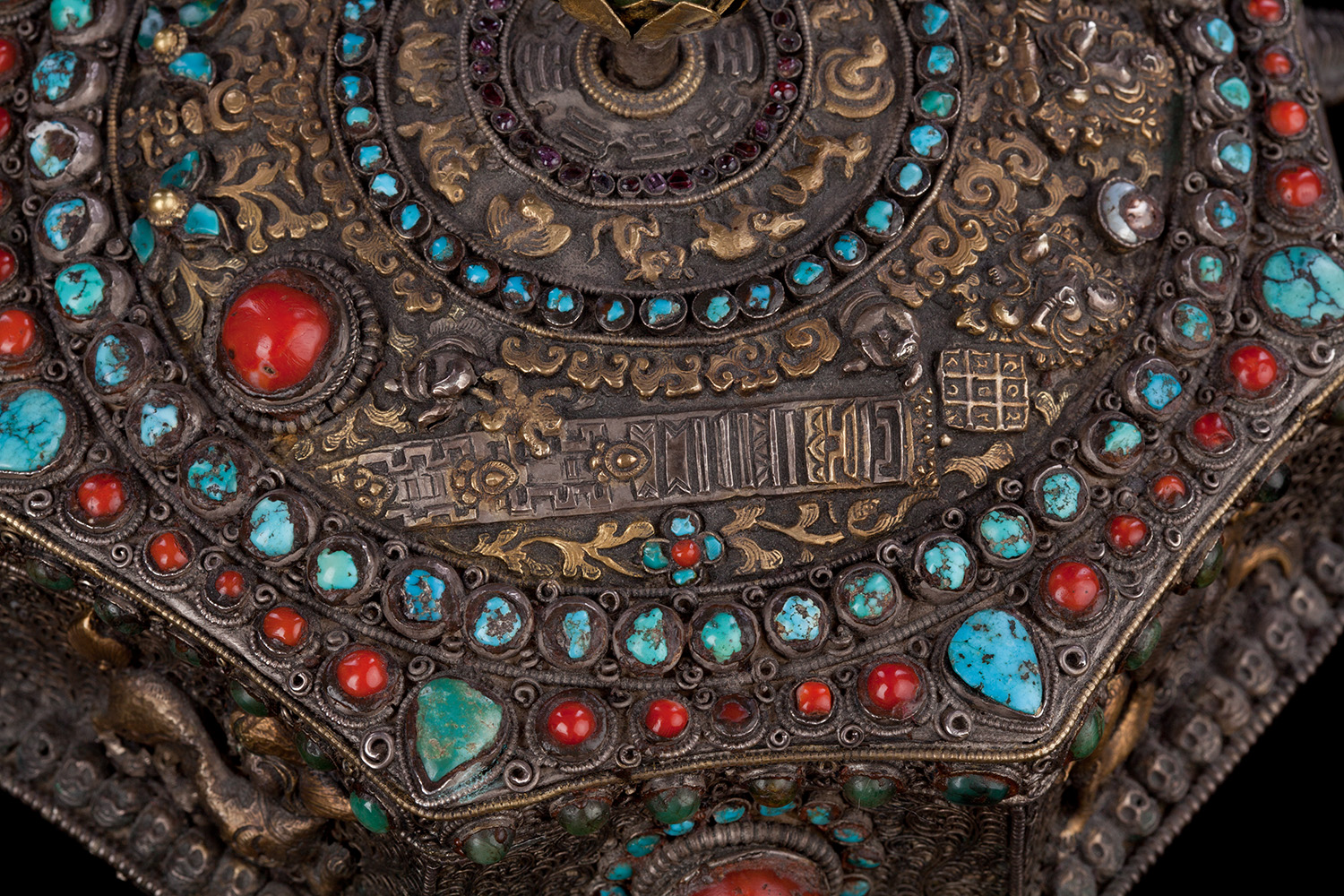 19thC three-dimensional Nepalese Mandala Box made of all silver--very finely worked, covered with very high quality semi-precious stones. The stones are of exceptional quality--much higher than typically found on the square copper Nepalese plaques (usually 20thC) that are covered with semi-precious stones. These have deep reds, greens, blues, and some of the small ones look to possibly be rubies or other precious gems. Parts (including animals on sides and many of the details on the top) are gilded. There are a very high number of of separately cast pieces added to the top and sides, after the original casting, to and complexity and dimesionality to the yantra aspect of the piece. Each has specific meaning and is done with deliberate ritual, purpose, and significance. The bottom has a mandala incised into the flat silver surface. Additional detail could be brought out with a careful cleaning, as I believe it has been a long time (if ever) since it has had one. Many people would leave it untouched. With such a complex silver object, this is a personal decision. Very rare with amazing detail. Not a tourist piece but made for practice. In amazing condition. The jade ball on the very top is removable for shipping and storage. Finest related object anyone who sees it has ever seen. Museum quality. From an old German collection. This and the posted large 19thC Nepalese Mandala also covered with semi-precious stones are from the same old German collection and are now in my personal collection. Height is 4 1/3 inches.