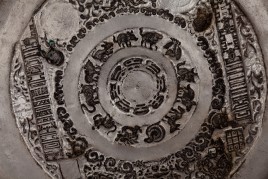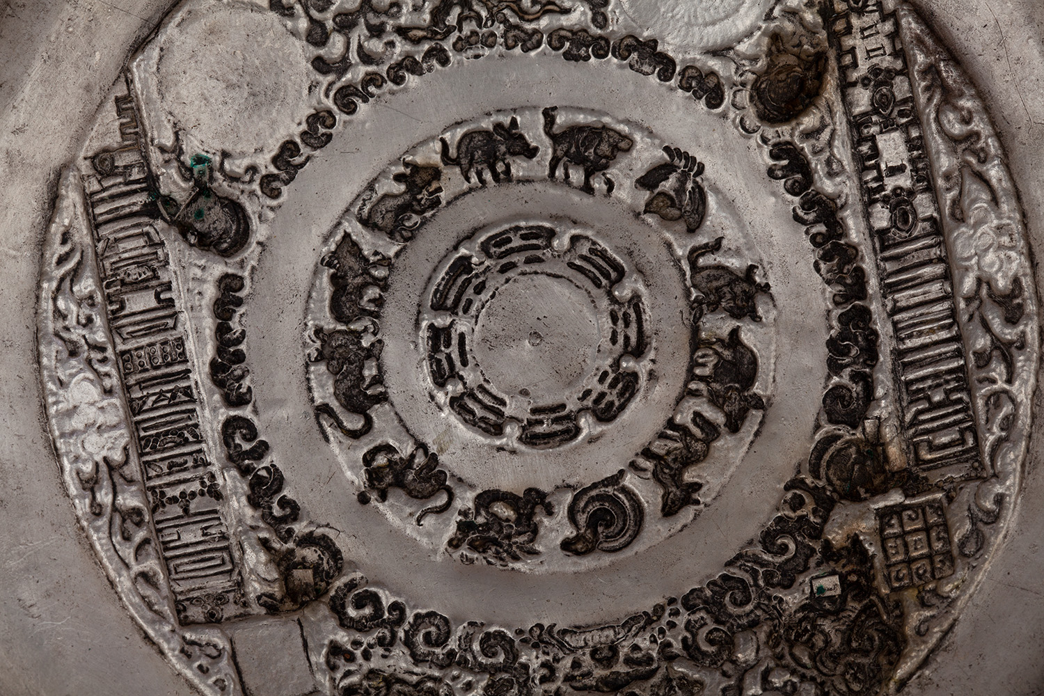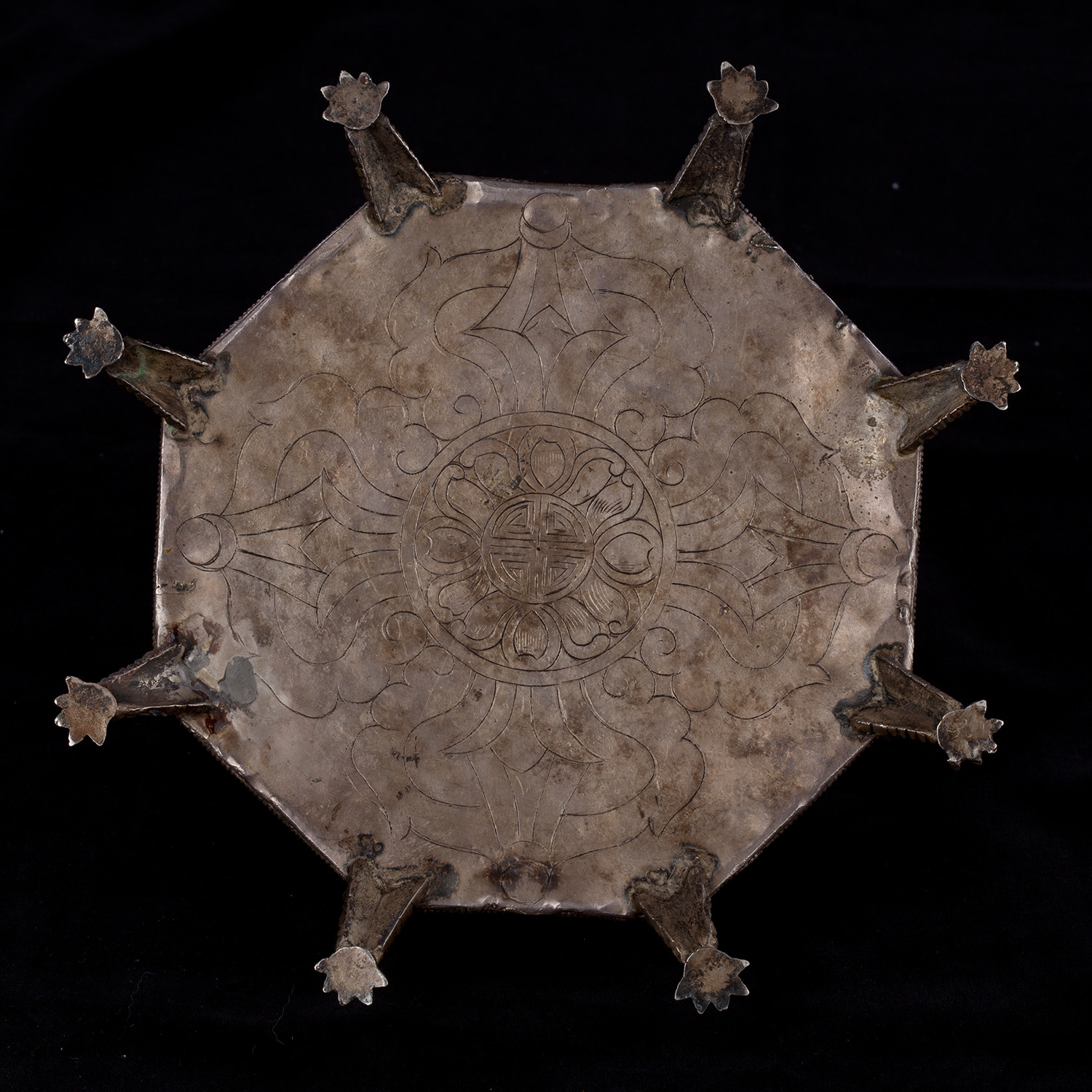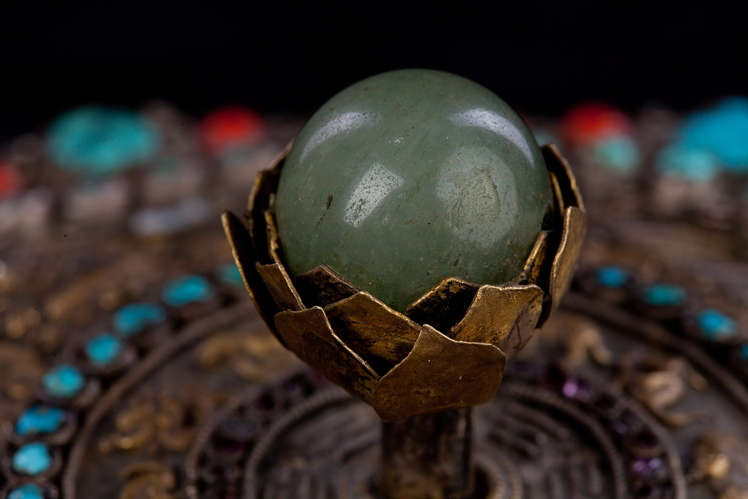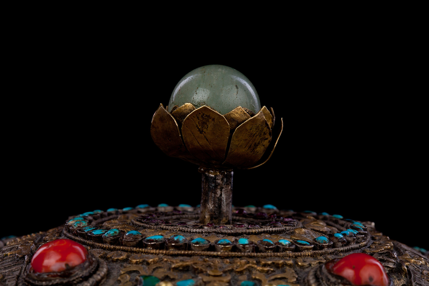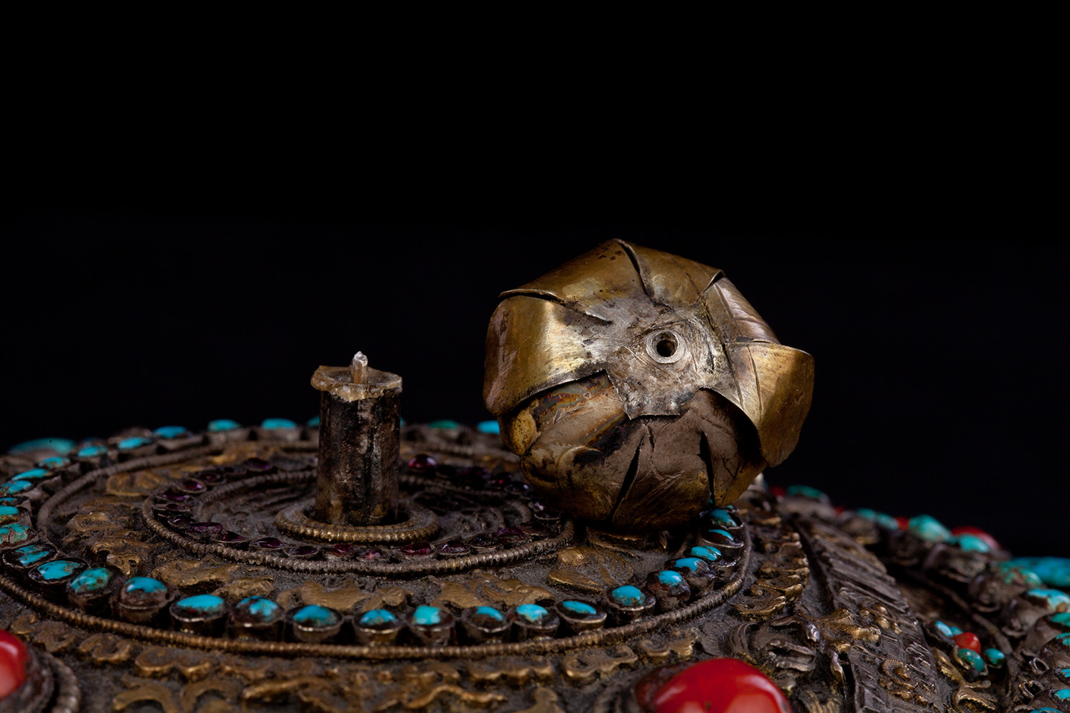 19thC three-dimensional Nepalese Mandala Box made of all silver--very finely worked, covered with very high quality semi-precious stones. The stones are of exceptional quality--much higher than typically found on the square copper Nepalese plaques (usually 20thC) that are covered with semi-precious stones. These have deep reds, greens, blues, and some of the small ones look to possibly be rubies or other precious gems. Parts (including animals on sides and many of the details on the top) are gilded. There are a very high number of of separately cast pieces added to the top and sides, after the original casting, to and complexity and dimesionality to the yantra aspect of the piece. Each has specific meaning and is done with deliberate ritual, purpose, and significance. The bottom has a mandala incised into the flat silver surface. Additional detail could be brought out with a careful cleaning, as I believe it has been a long time (if ever) since it has had one. Many people would leave it untouched. With such a complex silver object, this is a personal decision. Very rare with amazing detail. Not a tourist piece but made for practice. In amazing condition. The jade ball on the very top is removable for shipping and storage. Finest related object anyone who sees it has ever seen. Museum quality. From an old German collection. This and the posted large 19thC Nepalese Mandala also covered with semi-precious stones are from the same old German collection and are now in my personal collection. Height is 4 1/3 inches.