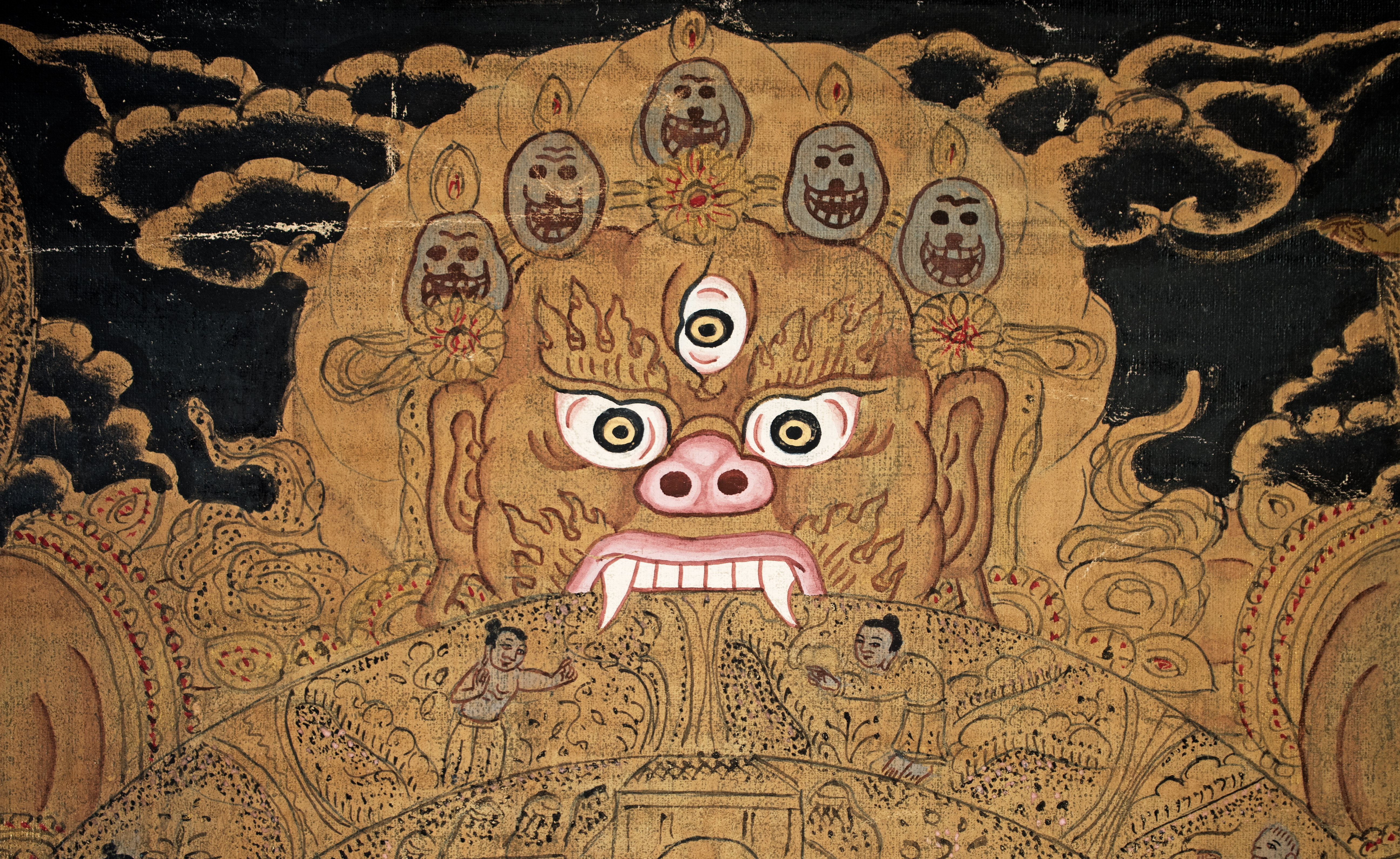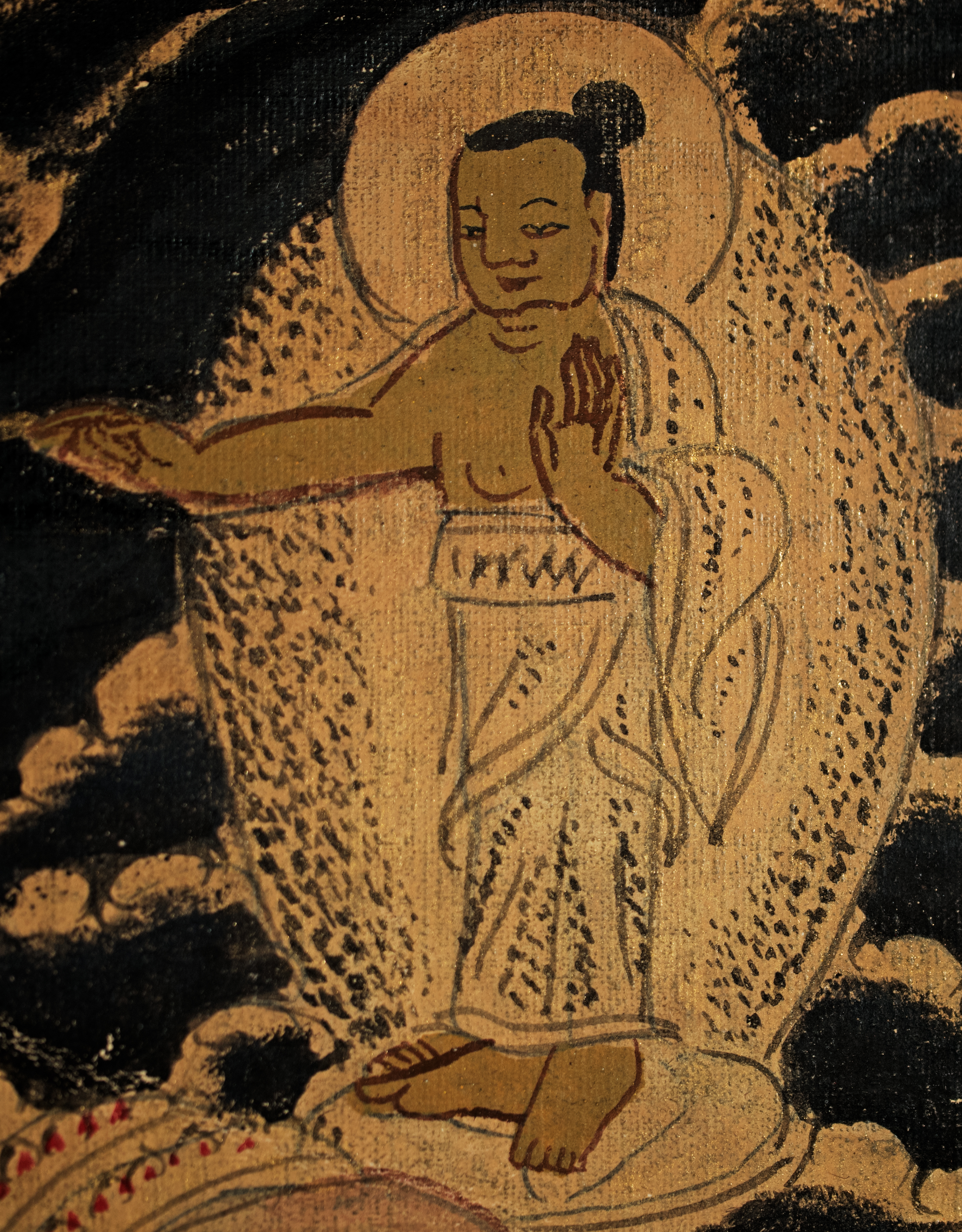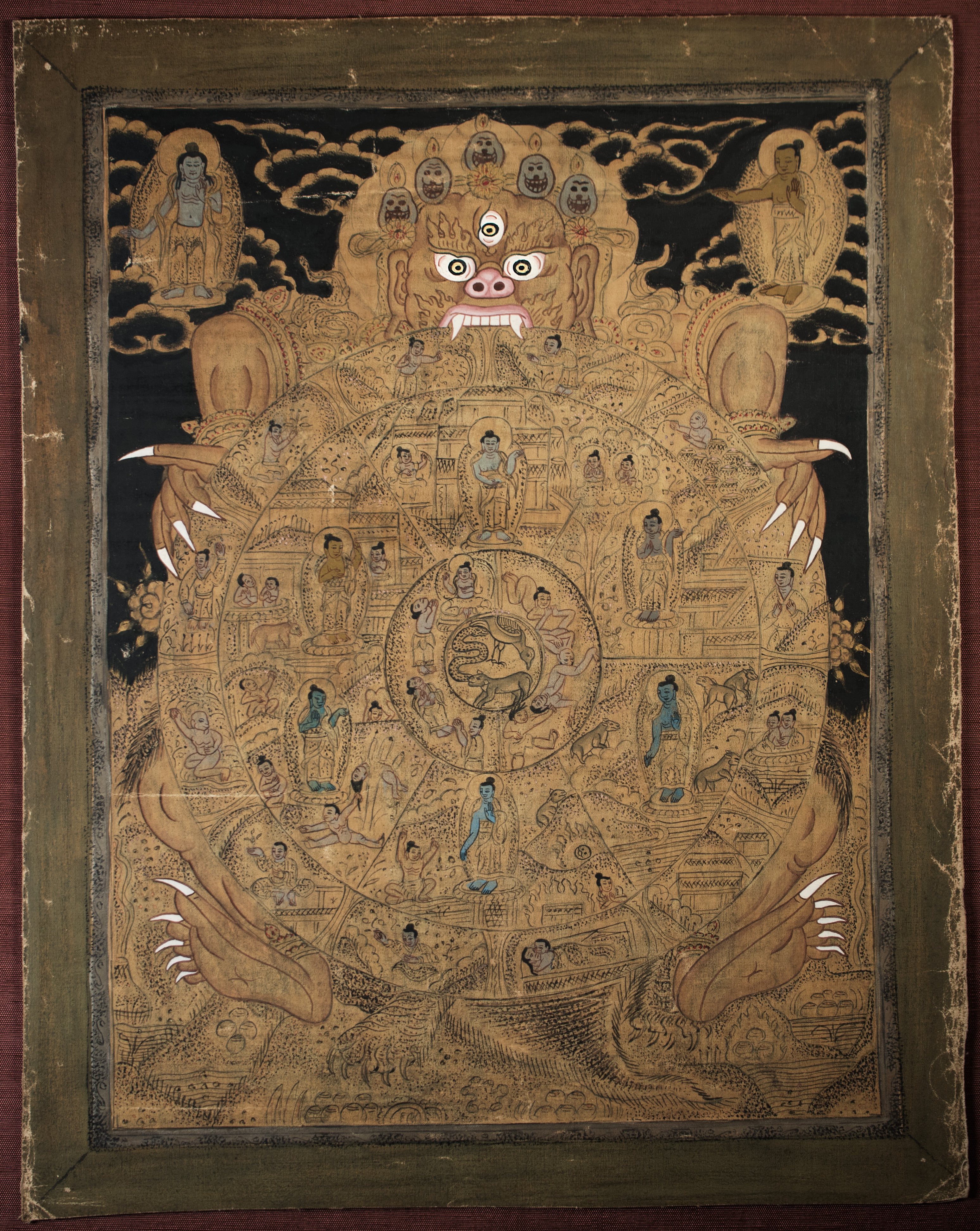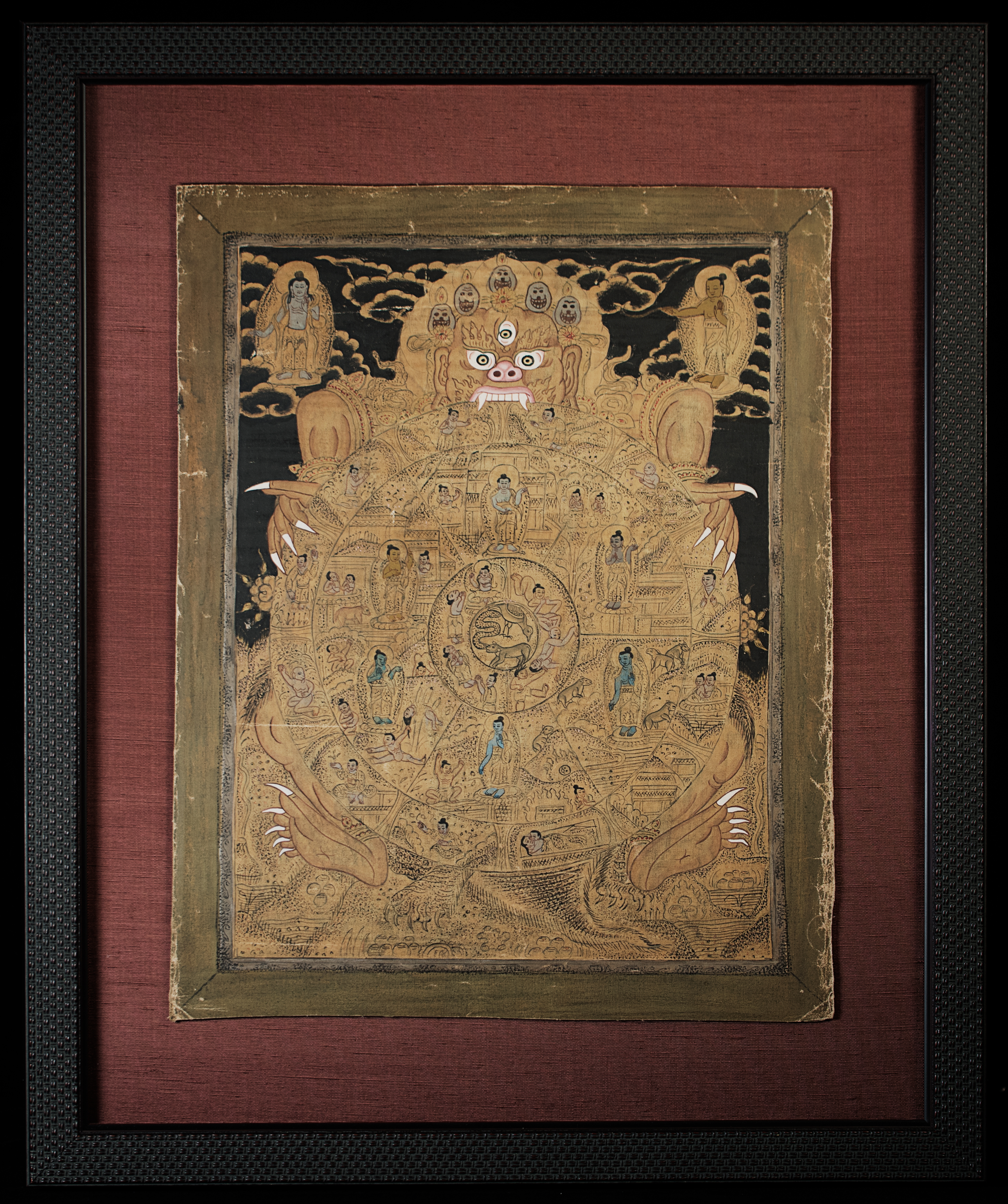 Antique Tibetan Thangka--unique in that it looks more like it was done with ink-like paint, so the detail is incredible and has a different quality than most thangkas. It has a mandala quality to it. Reportedly purchased by the previous owner's grandfather in the 1940s while in Asia during World War 2 and was supposedly not new when he purchased it. Custom-framed with museum glass and using Thai silk matting. Special; only seen one other like it in 30 years(from the same source--he had 2 closely related thangkas purchased at the same time 70 years ago). The other is also listed. Thangka measures 11.25 inches x 14 inches. The frame measures 16.5 inches x 20 inches x 1 inch. Starting price lowered