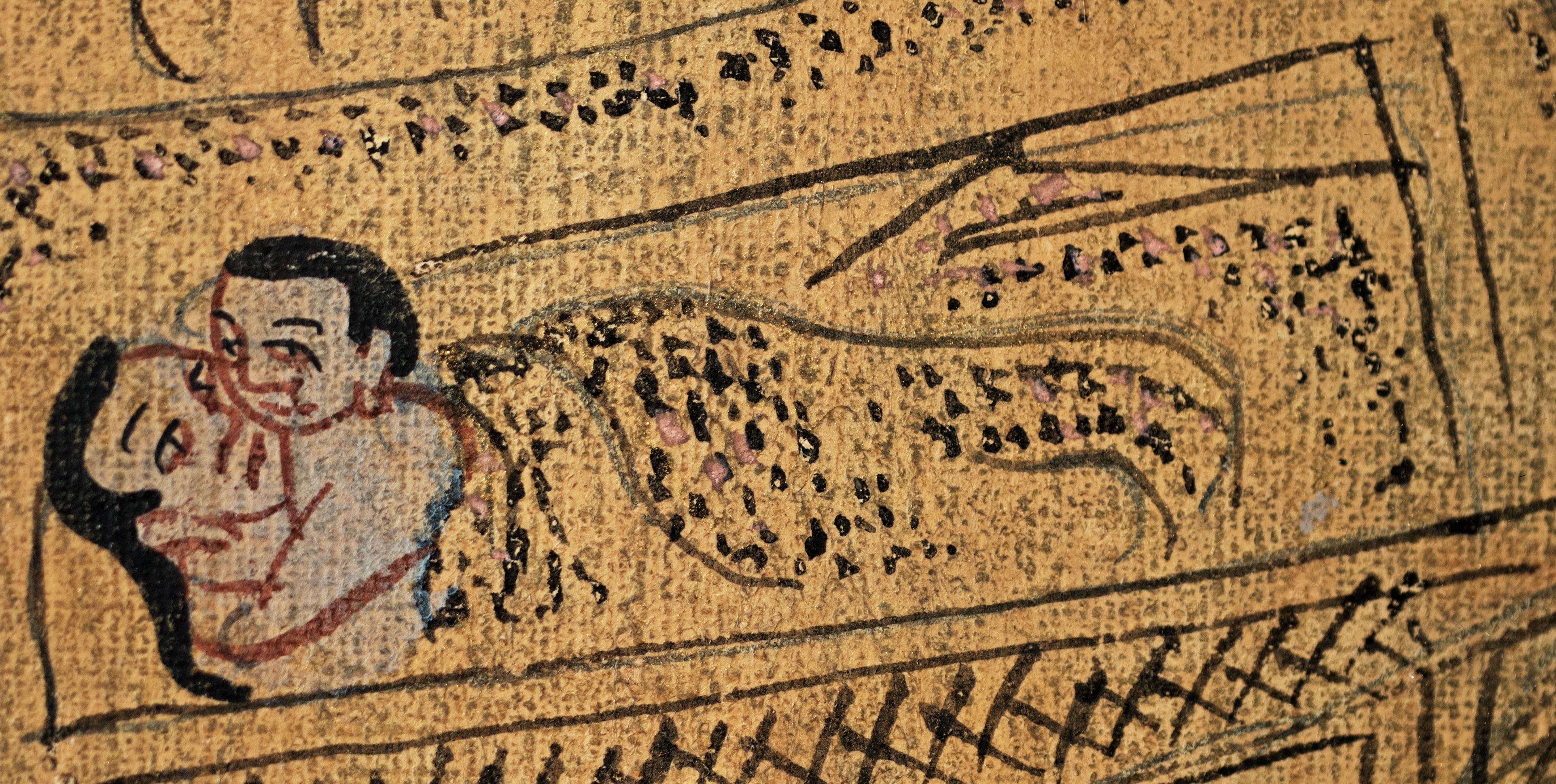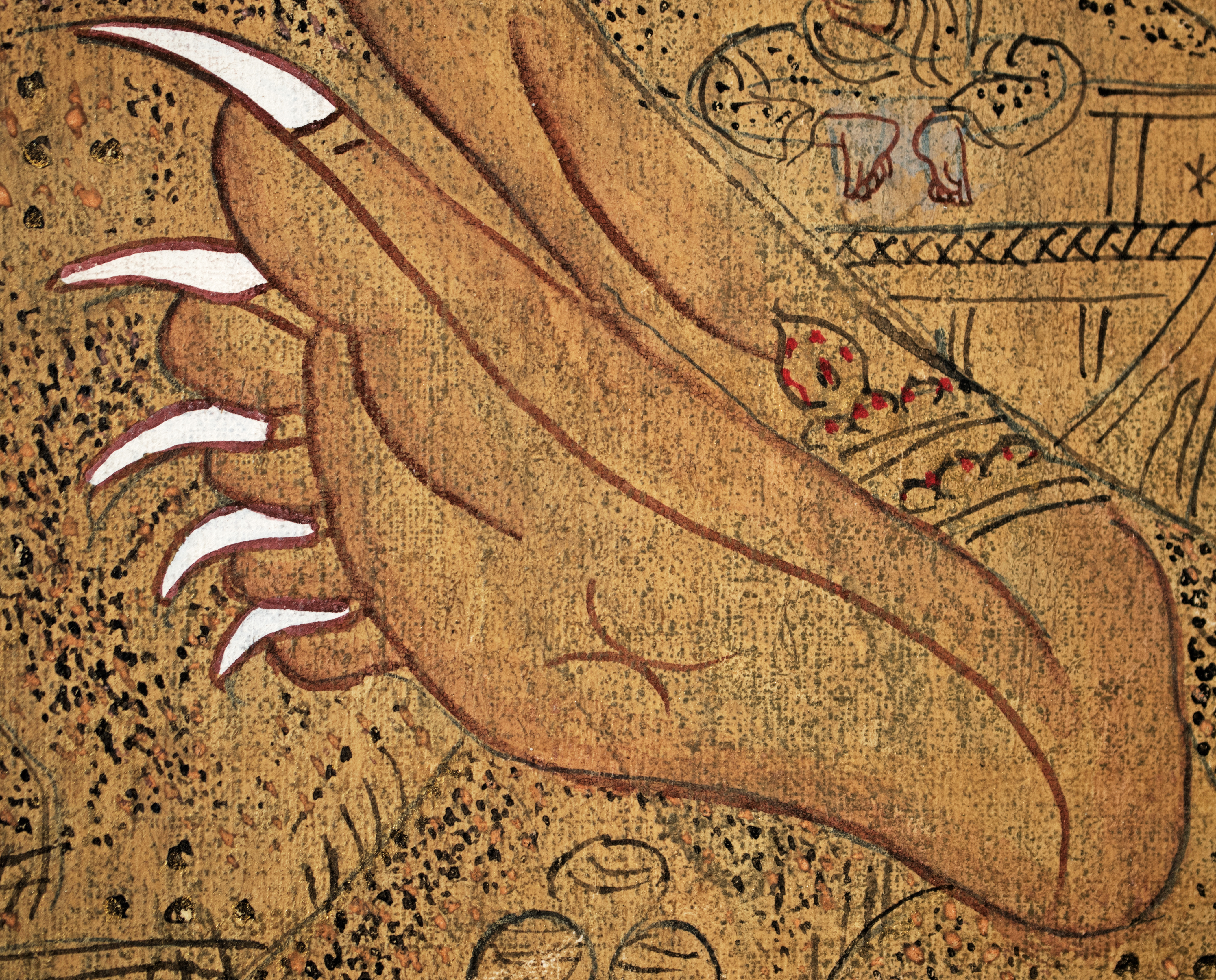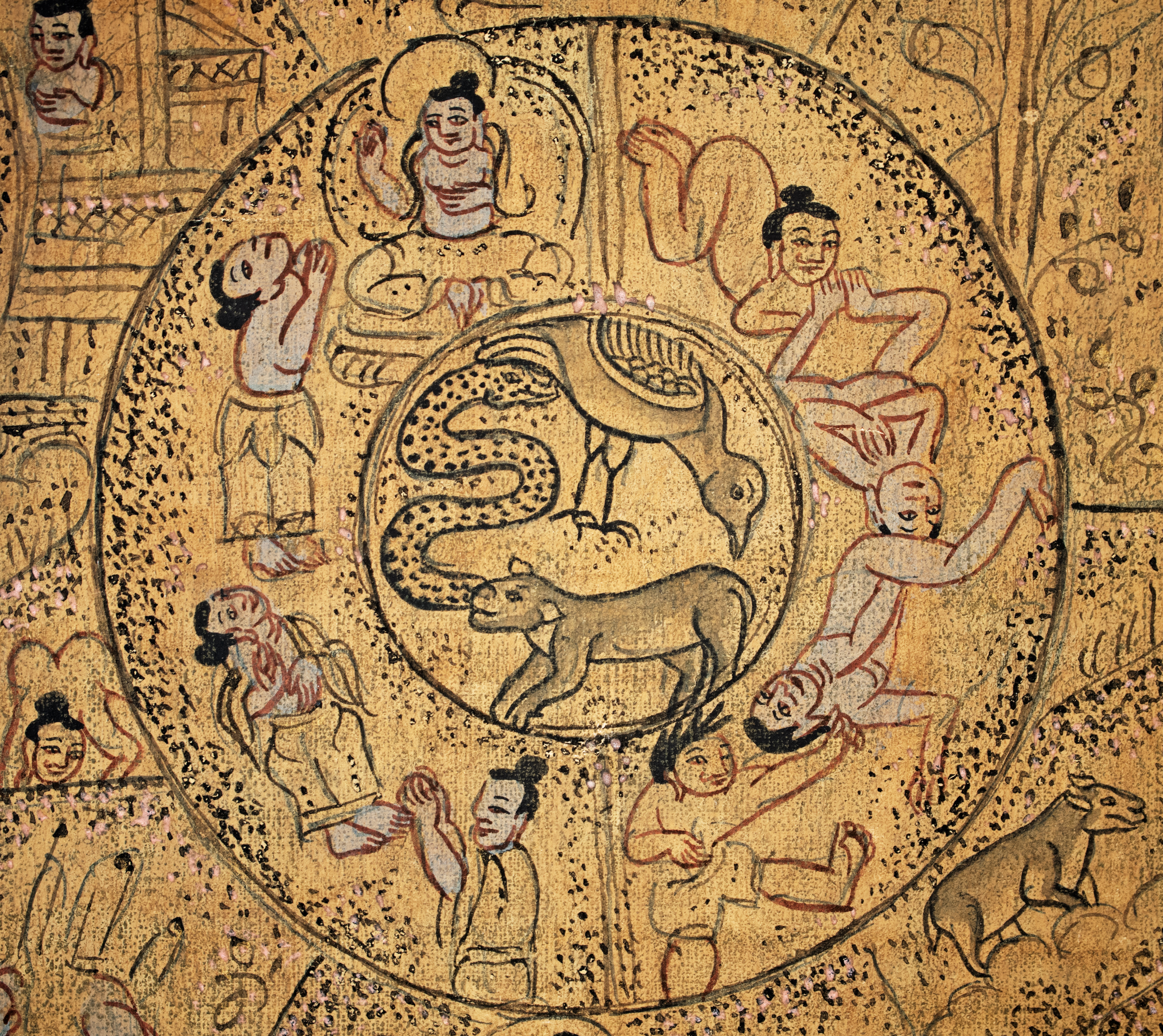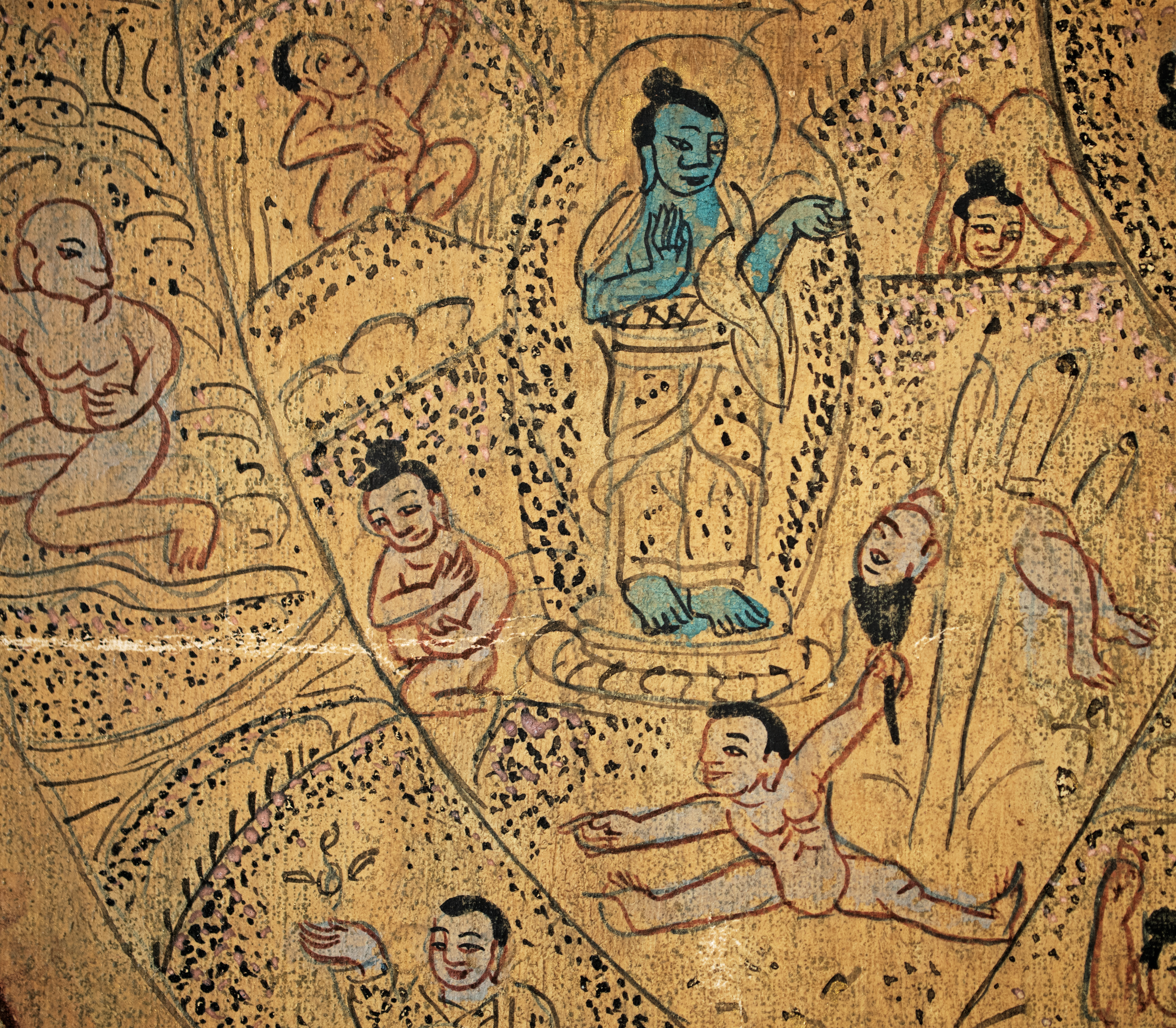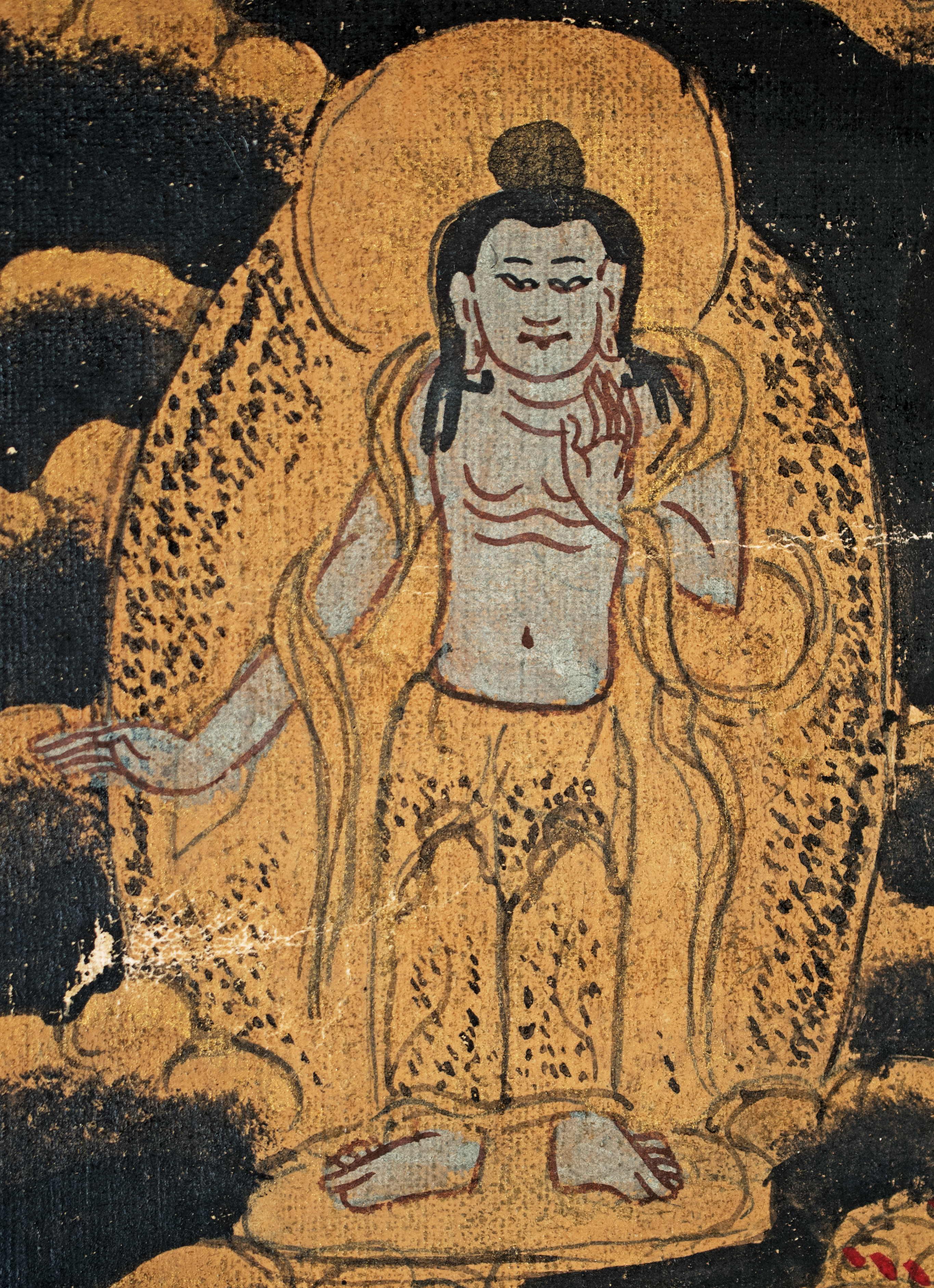 Antique Tibetan Thangka--unique in that it looks more like it was done with ink-like paint, so the detail is incredible and has a different quality than most thangkas. It has a mandala quality to it. Reportedly purchased by the previous owner's grandfather in the 1940s while in Asia during World War 2 and was supposedly not new when he purchased it. Custom-framed with museum glass and using Thai silk matting. Special; only seen one other like it in 30 years(from the same source--he had 2 closely related thangkas purchased at the same time 70 years ago). The other is also listed. Thangka measures 11.25 inches x 14 inches. The frame measures 16.5 inches x 20 inches x 1 inch. Starting price lowered