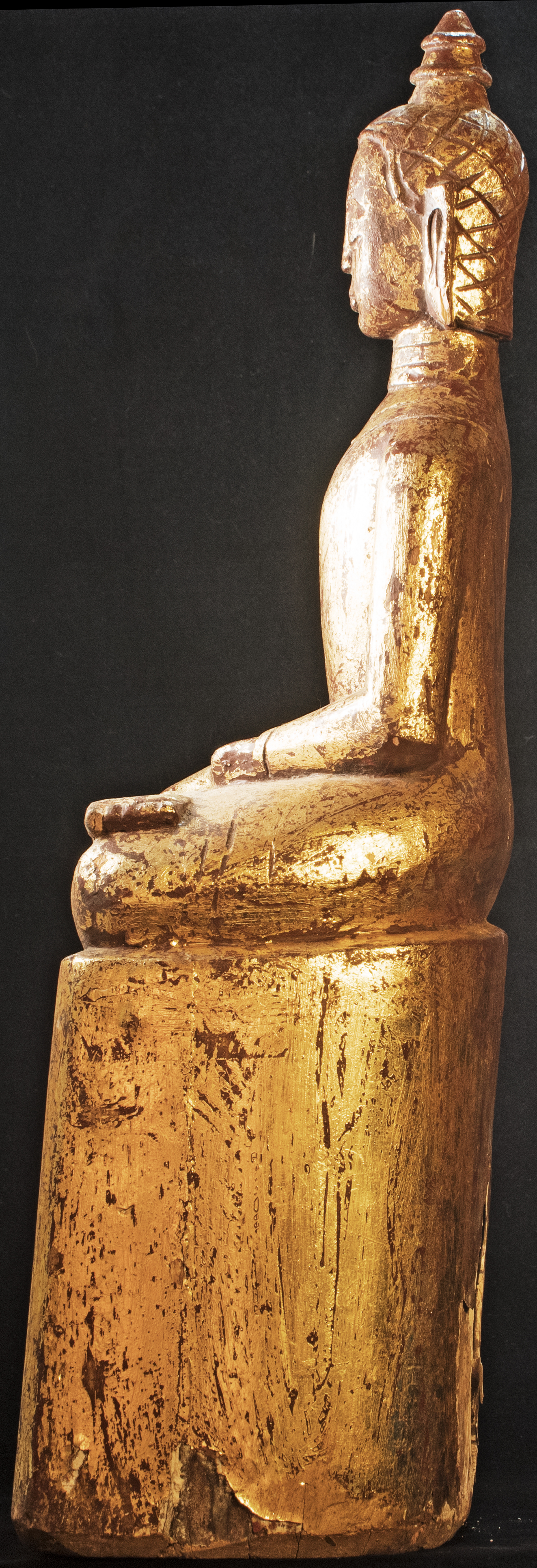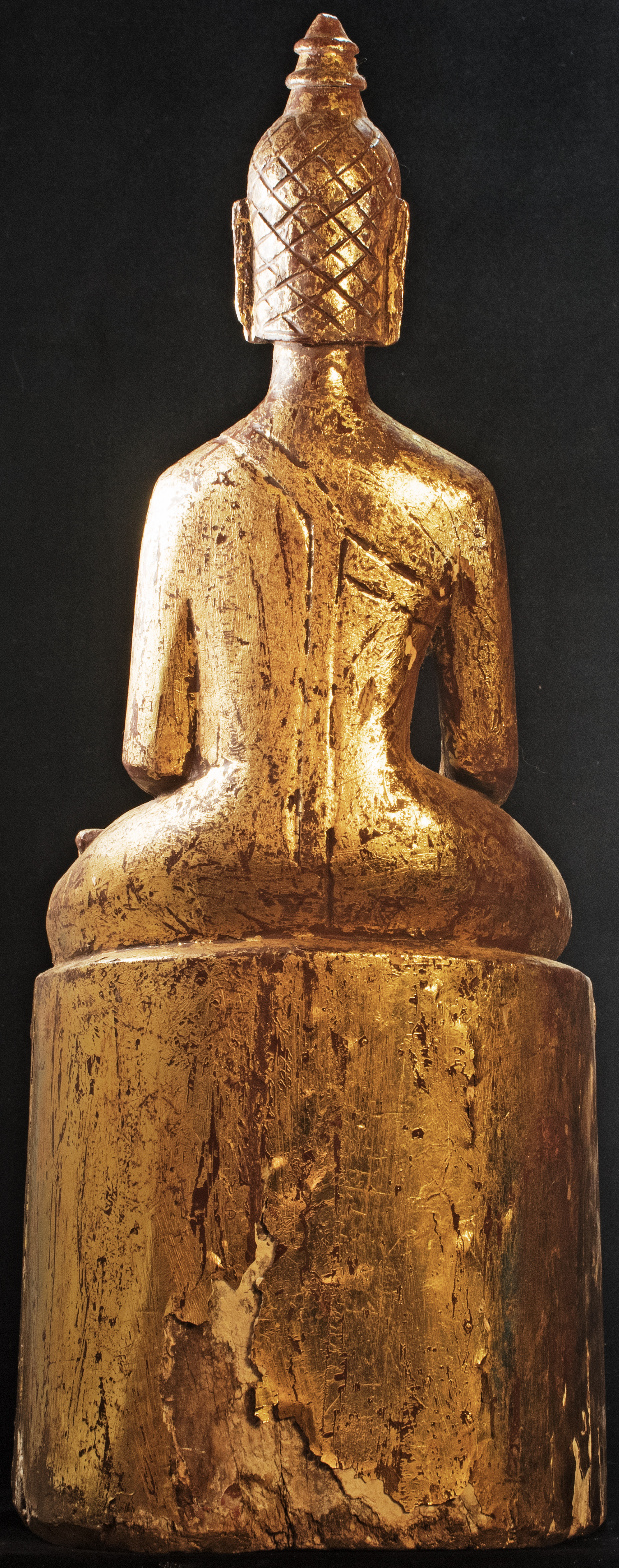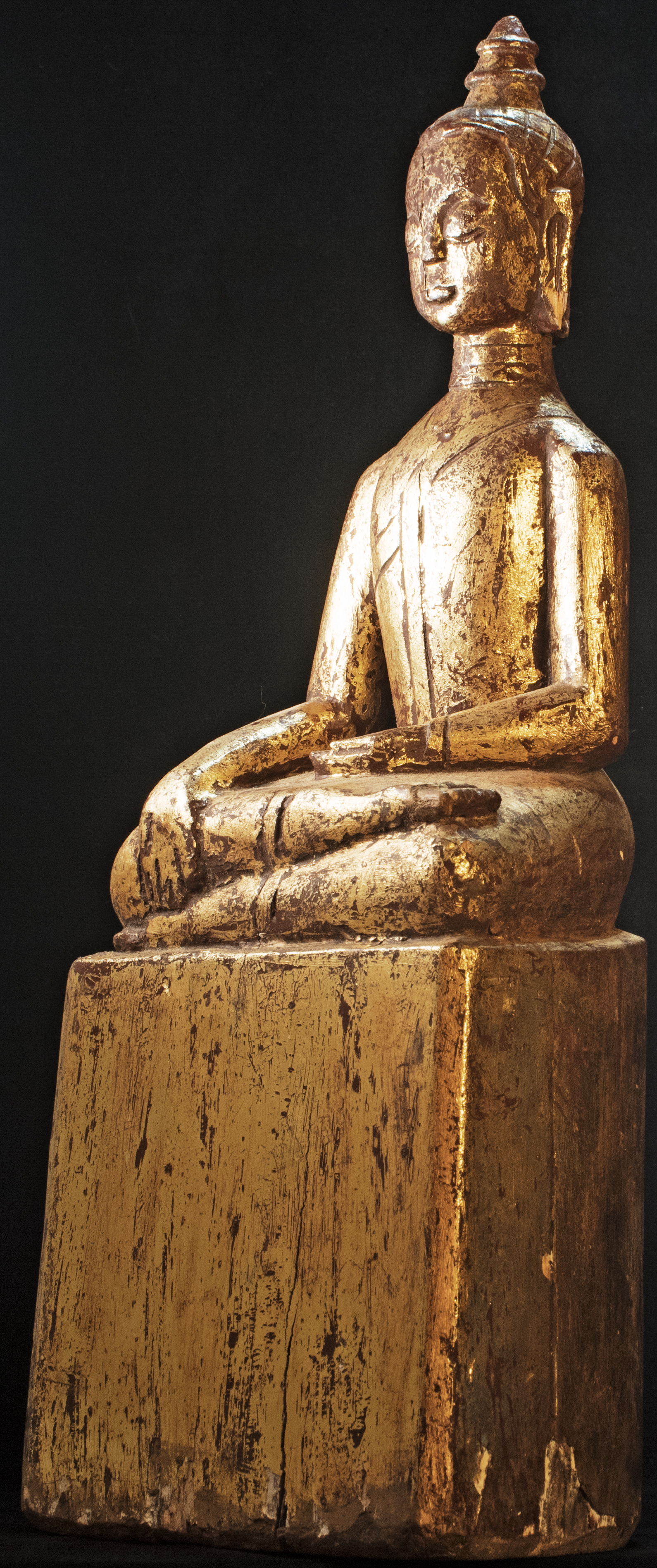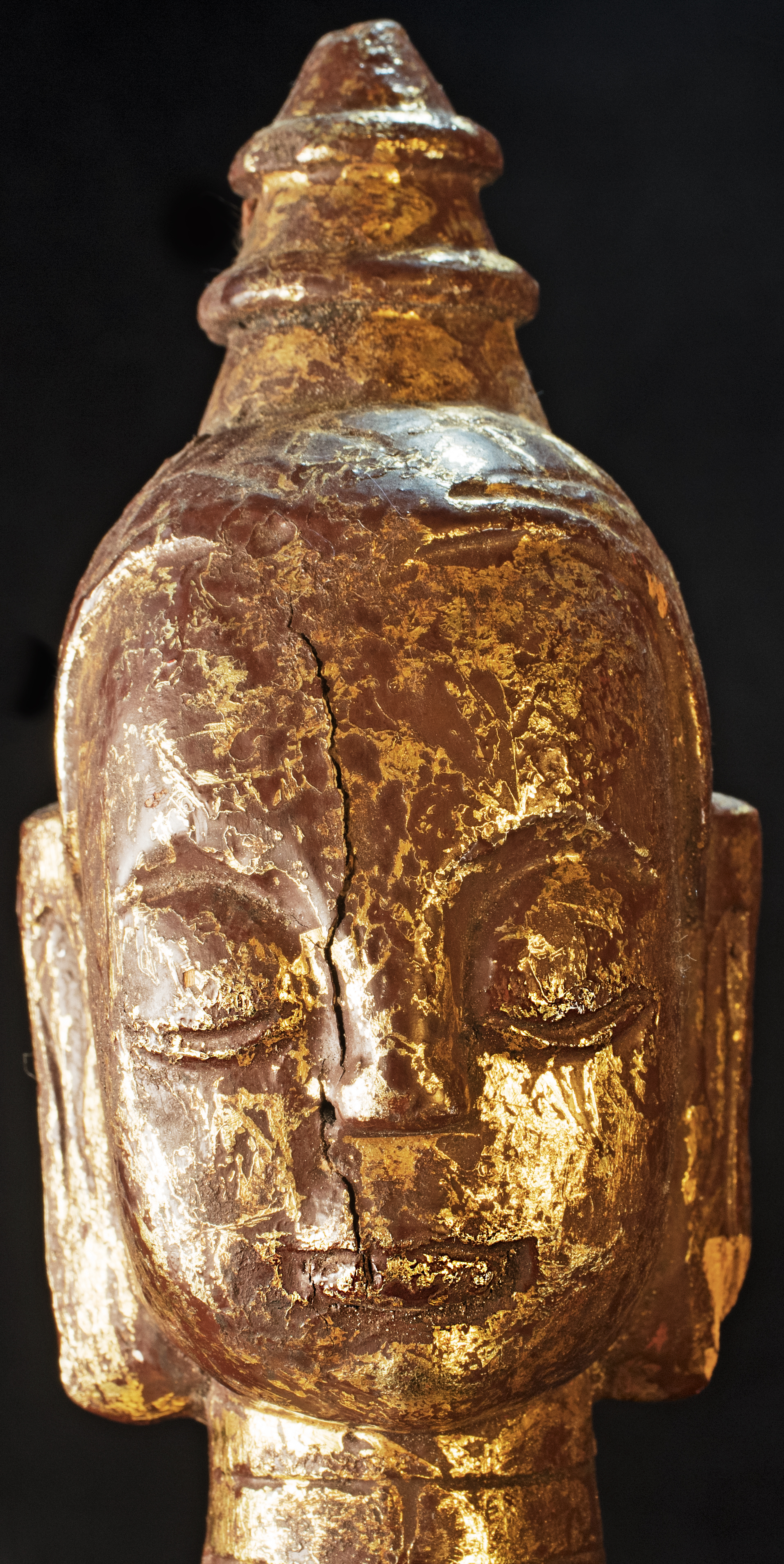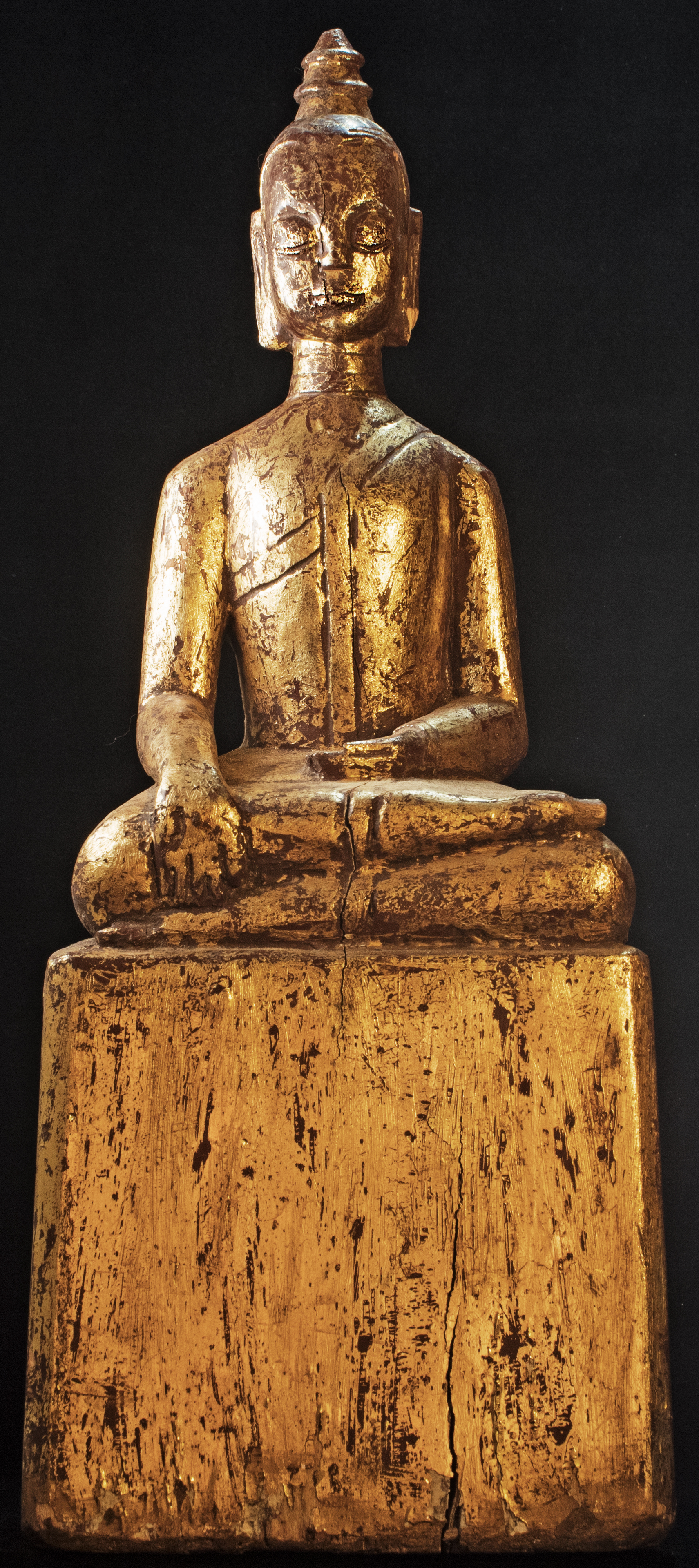 Large old Laos Buddha made of wood. 50 to 100 years old. Nice face. A lot of Buddha for the price. Measures 19.75 inches tall x 8.25 wide x 5.25 deep.