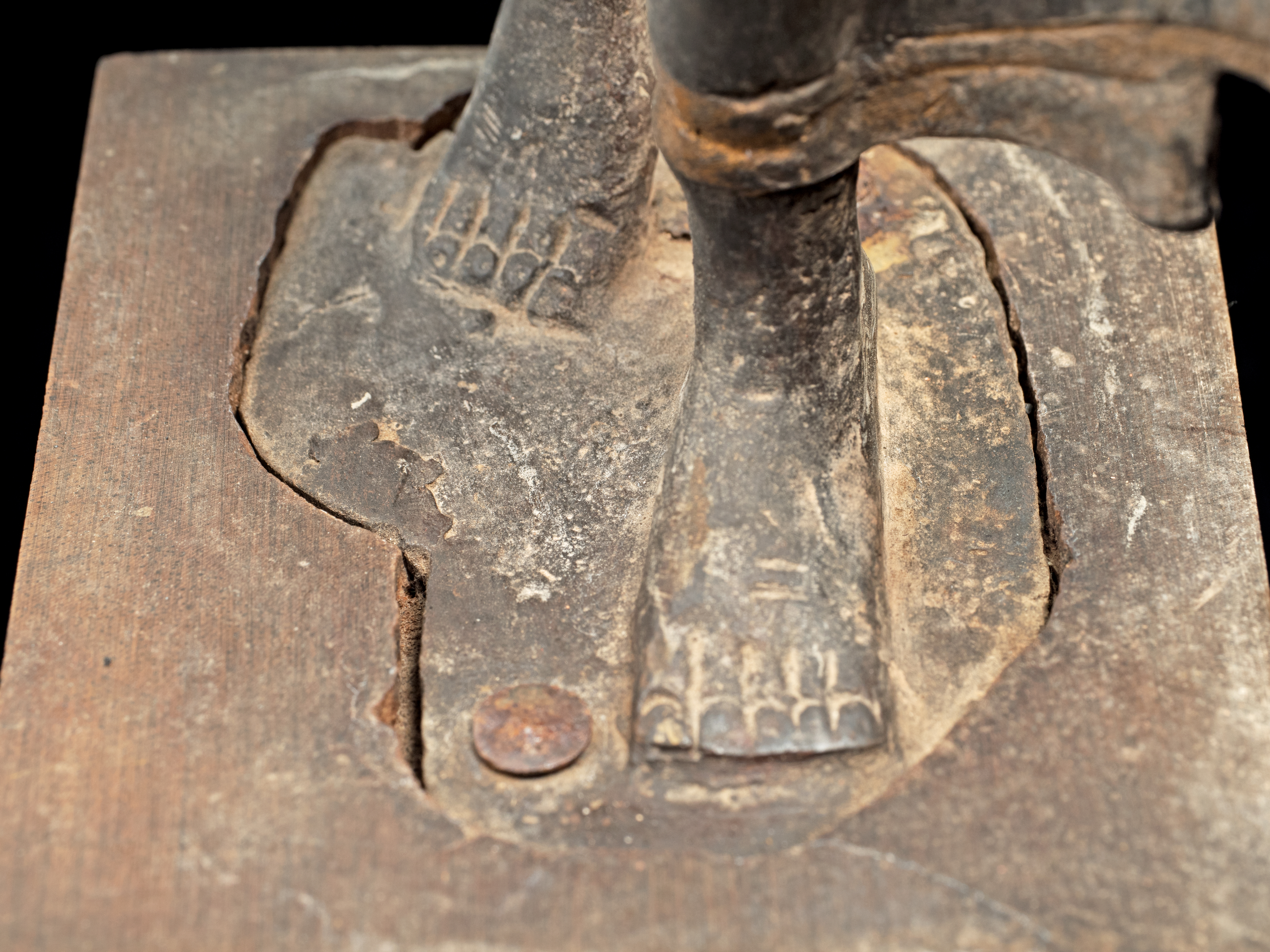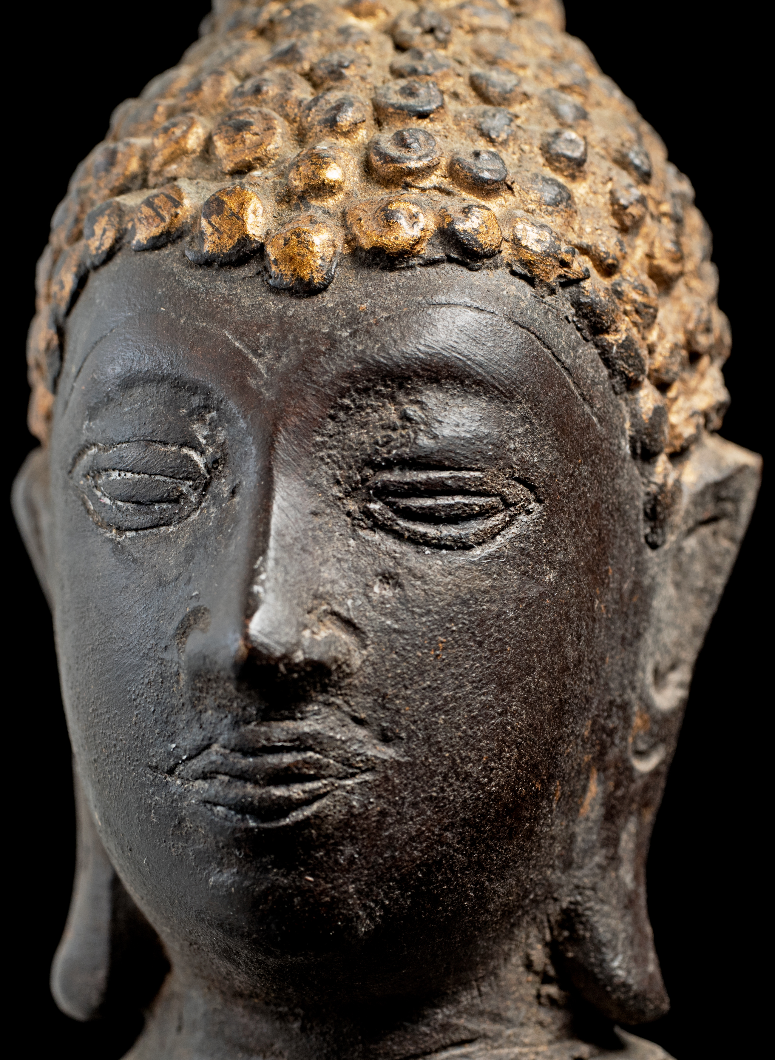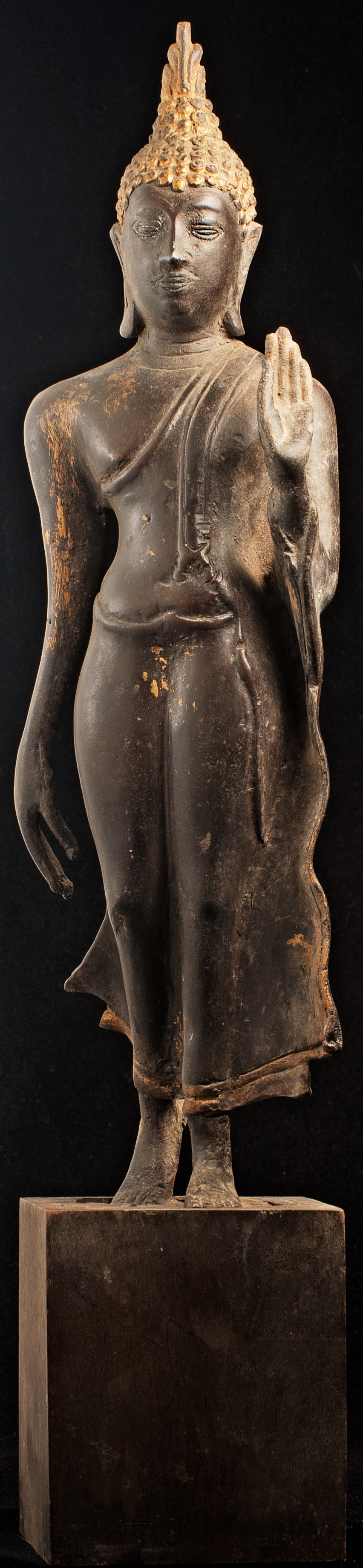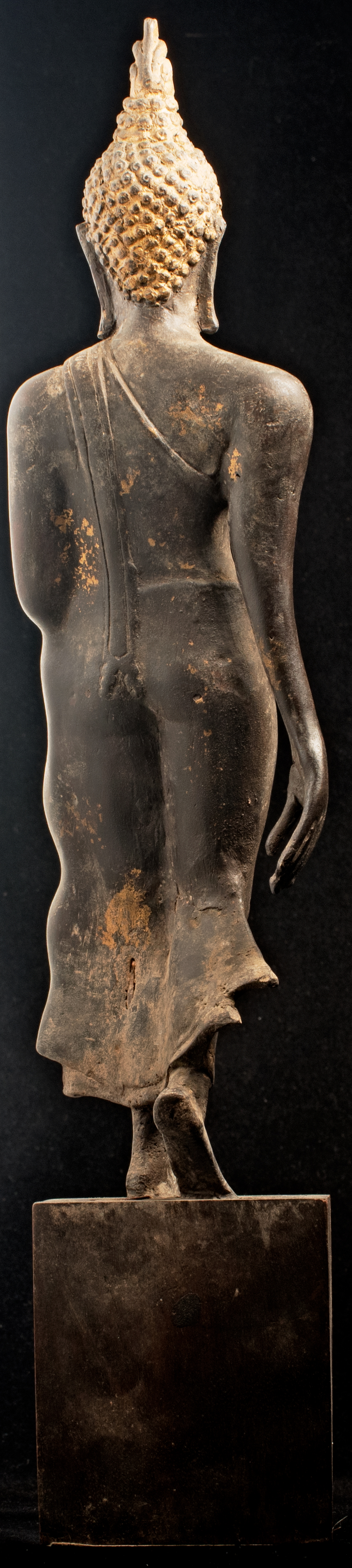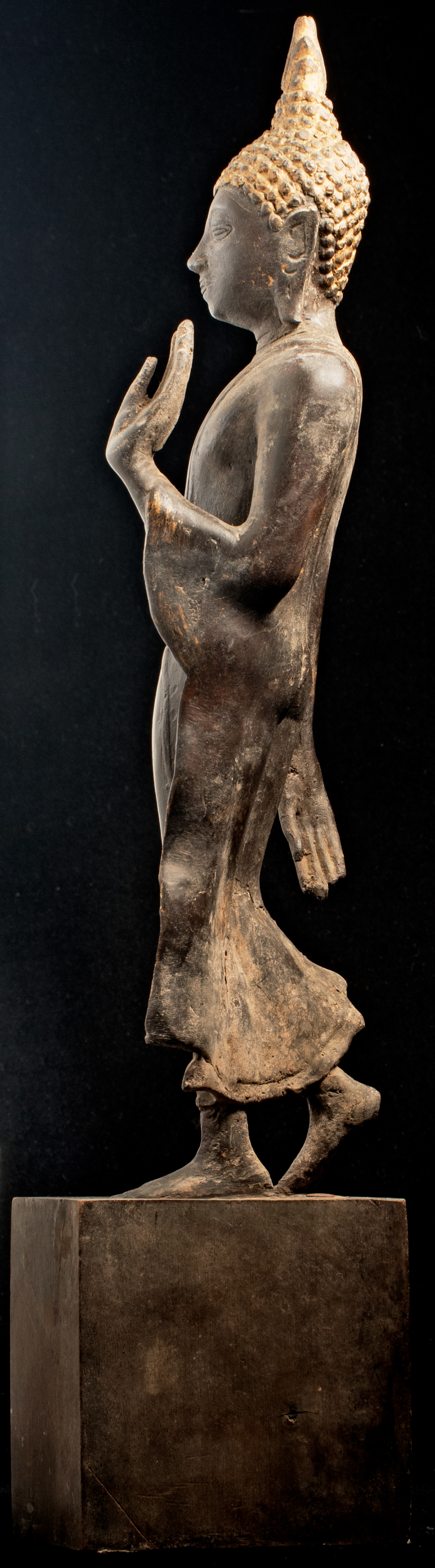 Very nice 19thC or earlier to beginning of the 20th C Thai Walking Buddha. There are many fakes--this is an authentic one. Most are 19thC- this one might be earlier, as the style is more Ayuthaya, which had ended by the 19thC Measures 12.5 inches tall; 15.75 inches tall including attached base. Base measures 3 inches wide x 3.5 inches deep.