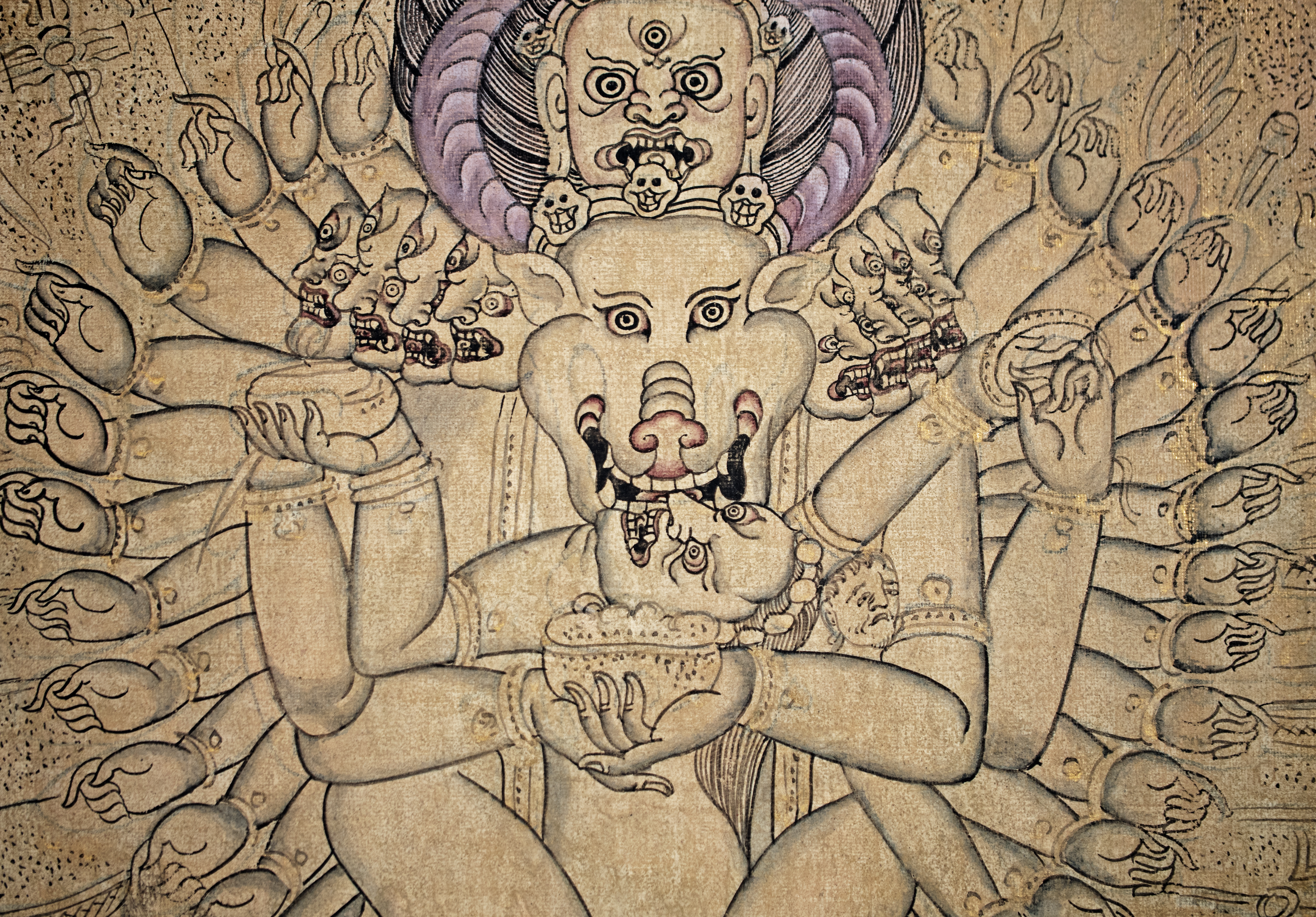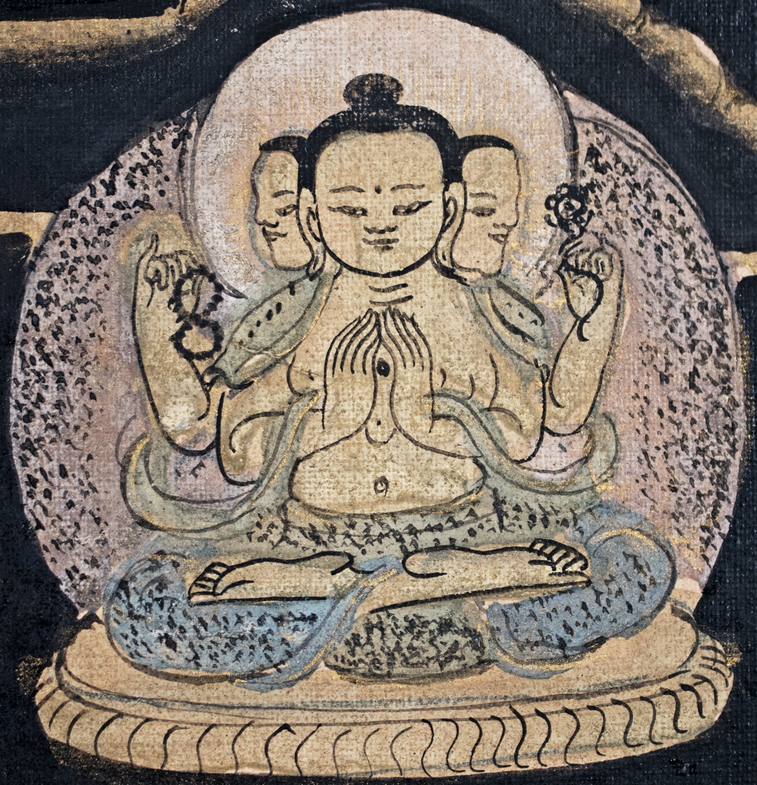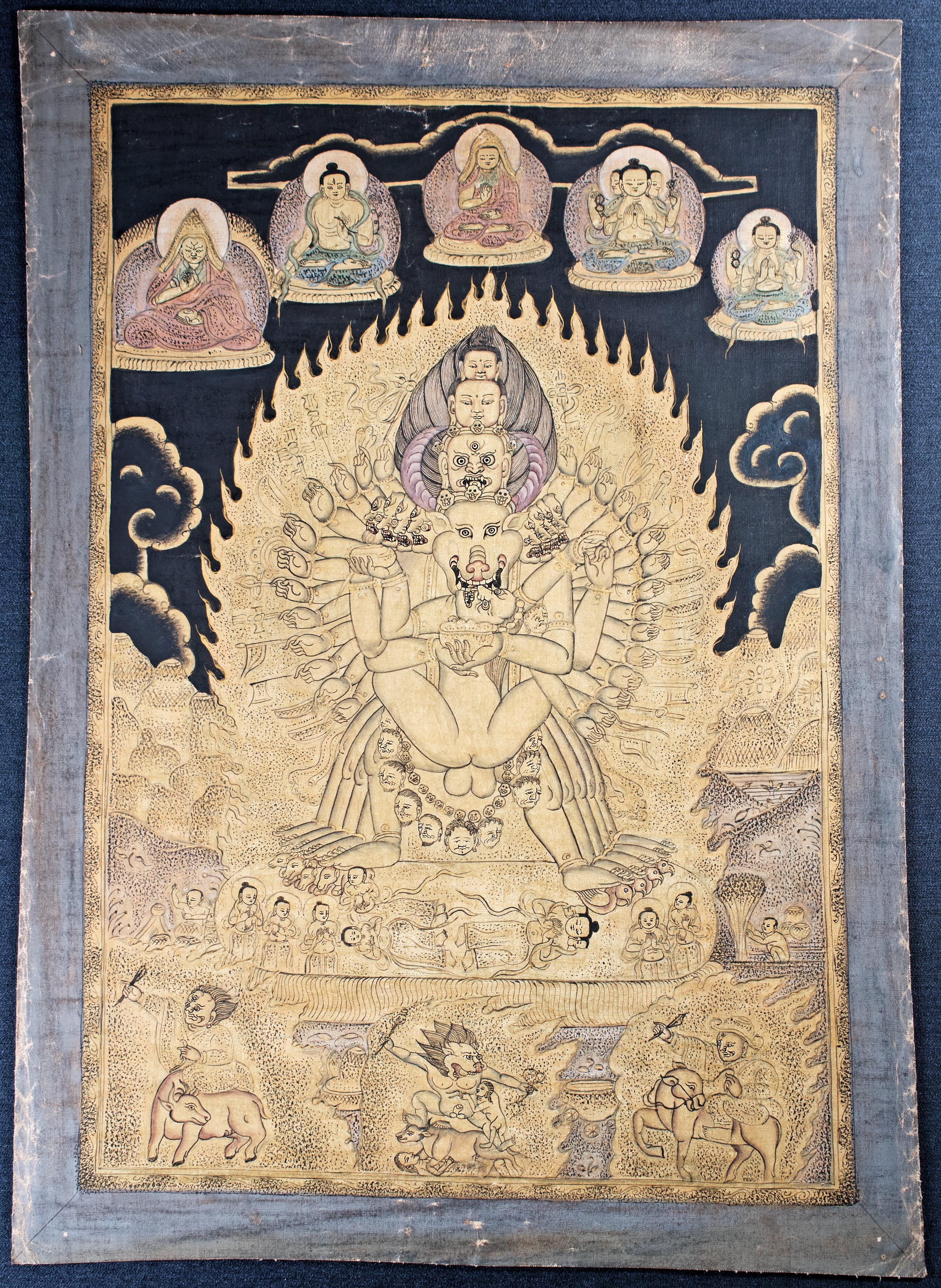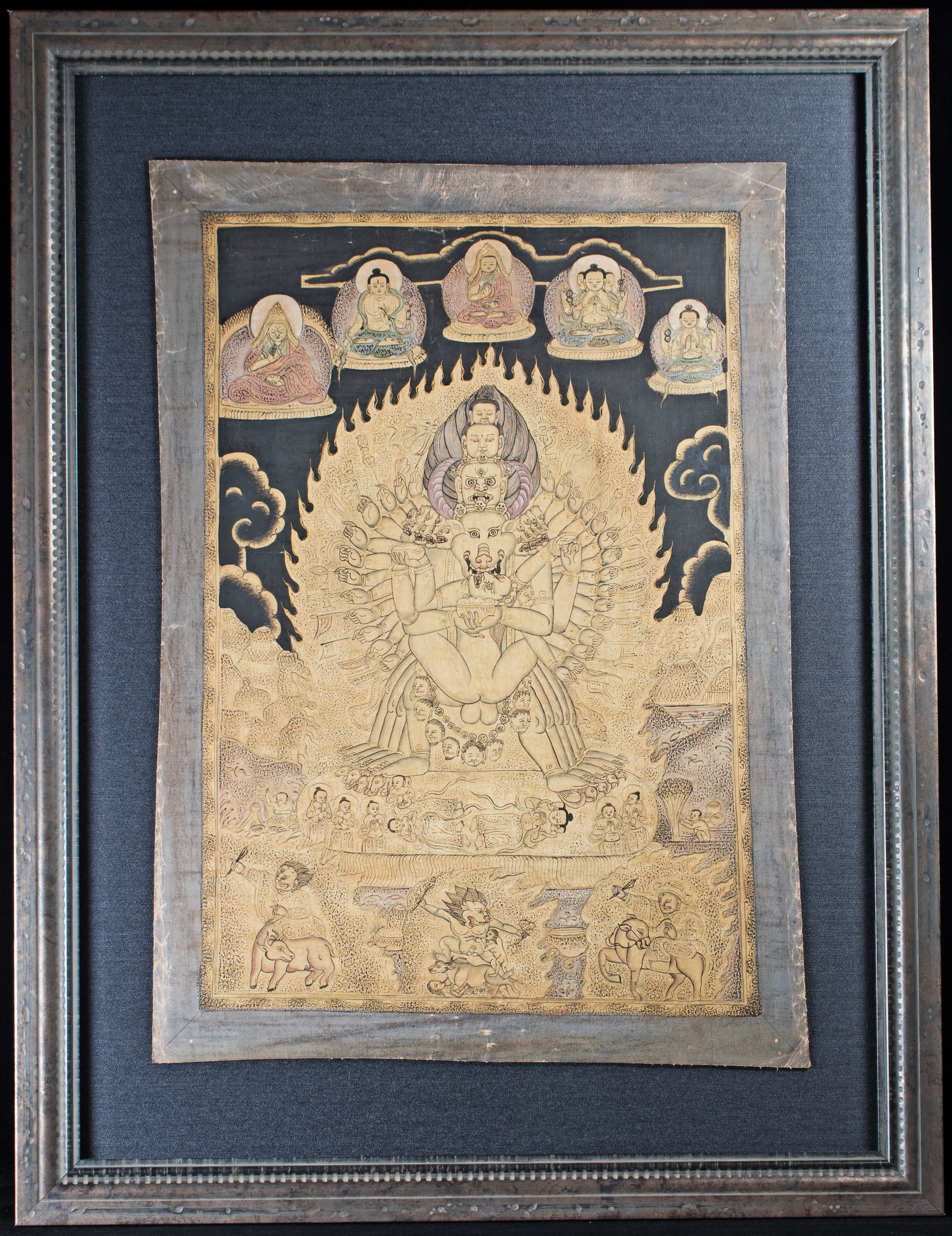 Antique Tibetan Thangka--unique in that it looks more like it was done with ink-like paint, so the detail is incredible and has a different quality than most thangkas. It has a mandala quality to it. Reportedly purchased by the previous owner's grandfather in the 1940s while in Asia during World War 2 and was supposedly not new when he bought it. I am guessing in the range of 100 years old. Custom-framed with museum glass and using Thai silk matting. Special; only seen one other like it in 30 years (from the same source--he had 2 closely related thangkas purchased at the same time 70 years ago). The other is also listed--item 8748--though this one may be even more amazing. Thangka measures 17 inches x 12 inches. Frame measures 22.75 inches x 17.5 inches .75 inches. Starting price lowered