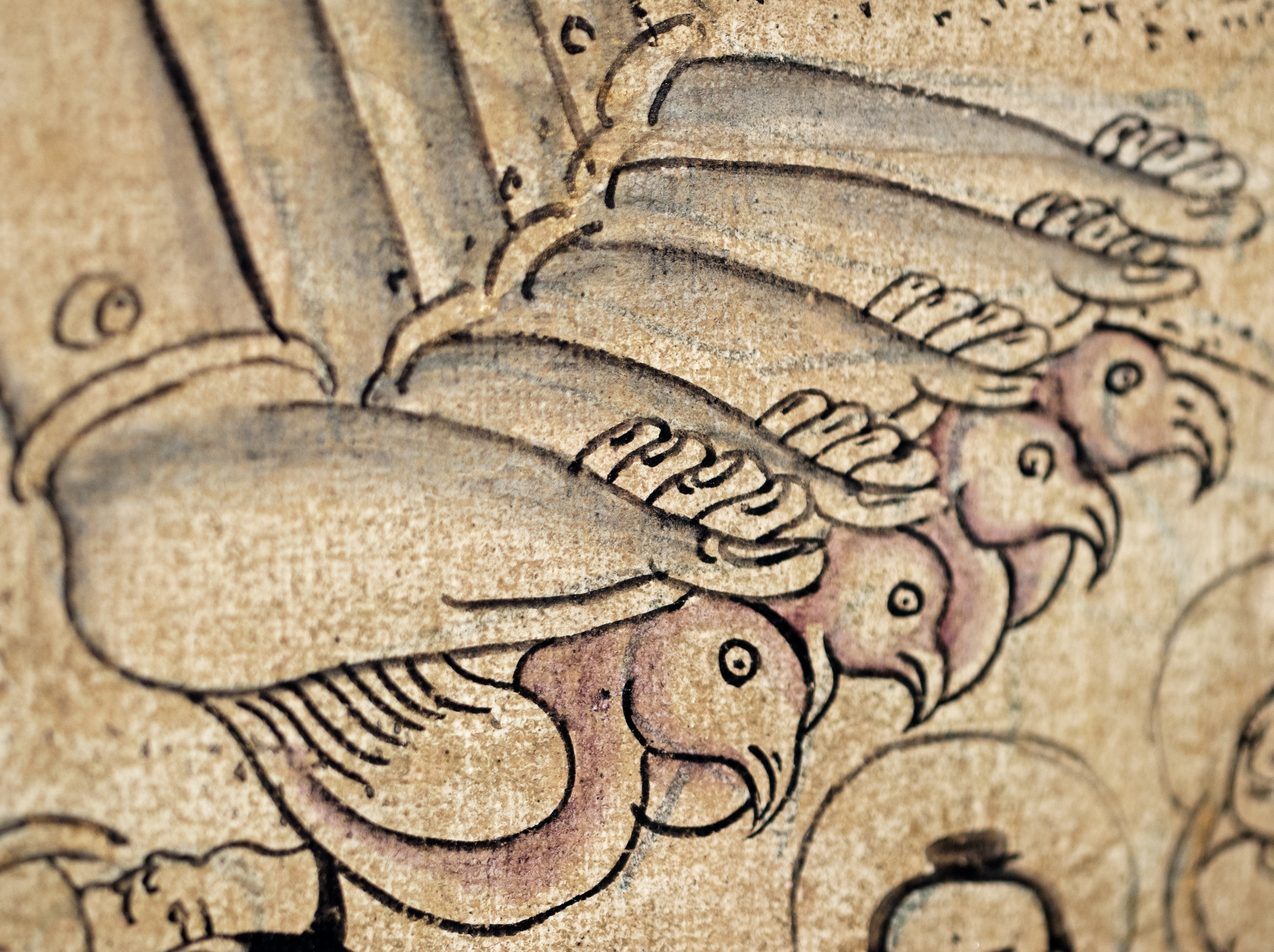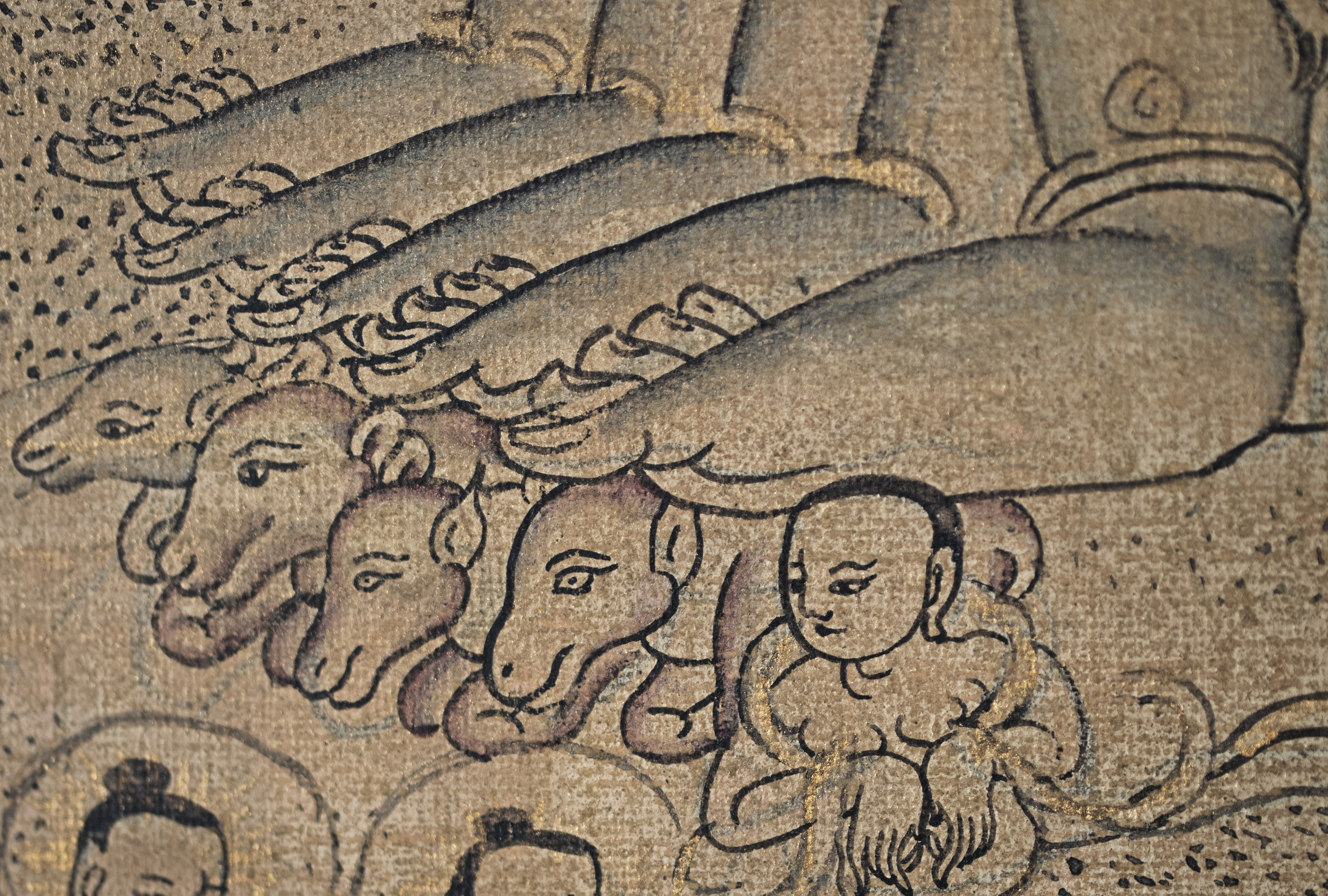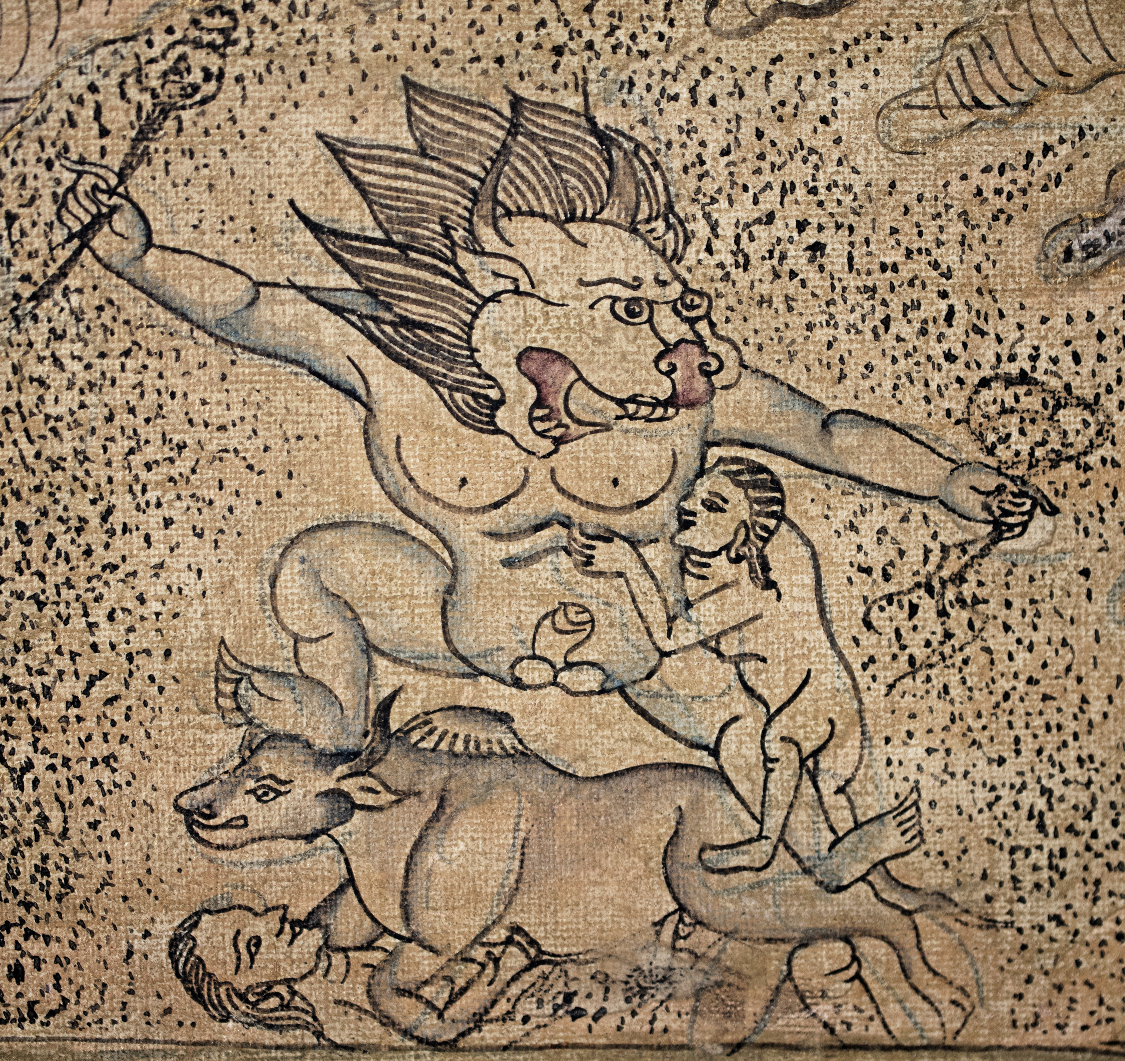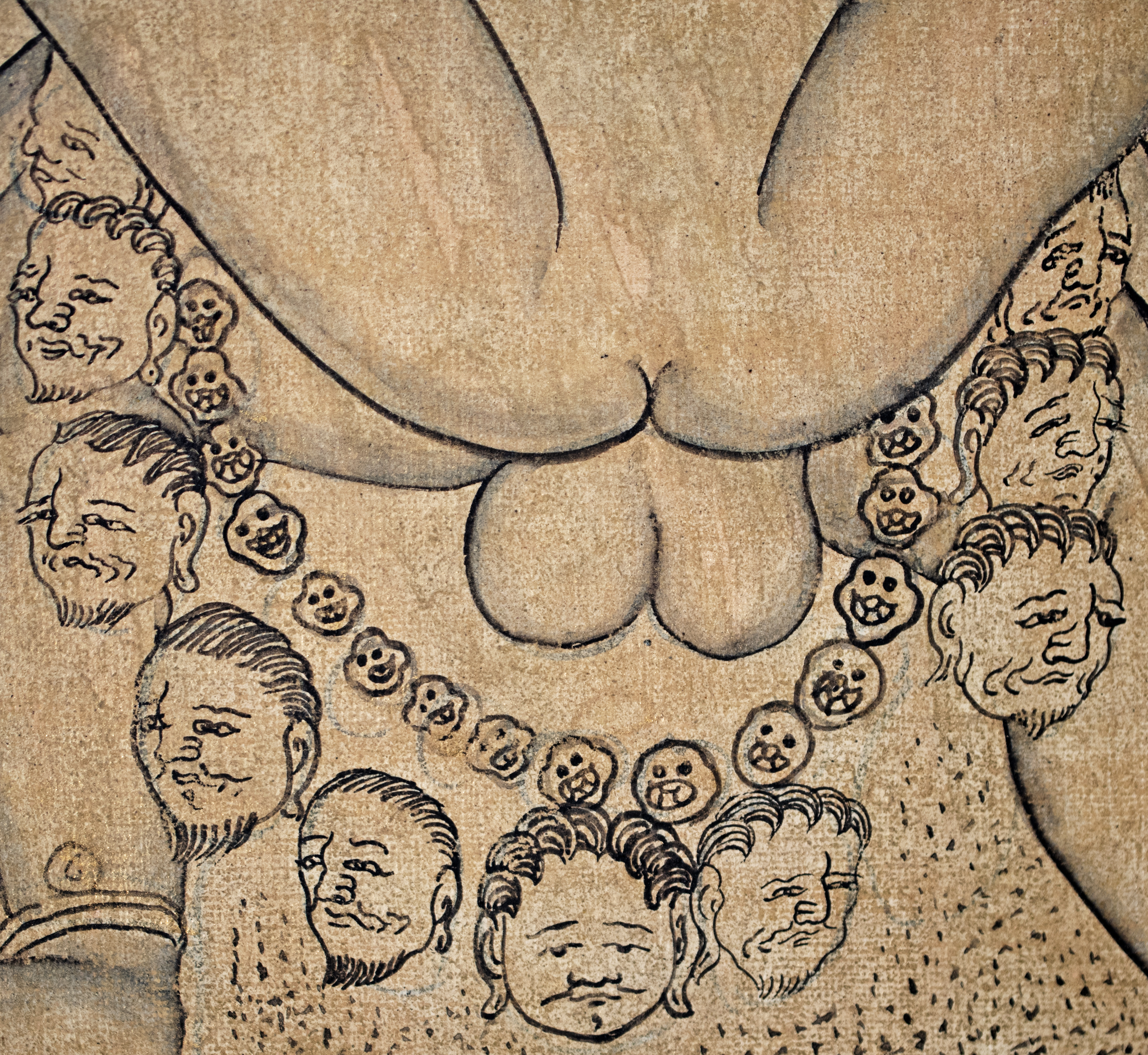 Antique Tibetan Thangka--unique in that it looks more like it was done with ink-like paint, so the detail is incredible and has a different quality than most thangkas. It has a mandala quality to it. Reportedly purchased by the previous owner's grandfather in the 1940s while in Asia during World War 2 and was supposedly not new when he bought it. I am guessing in the range of 100 years old. Custom-framed with museum glass and using Thai silk matting. Special; only seen one other like it in 30 years (from the same source--he had 2 closely related thangkas purchased at the same time 70 years ago). The other is also listed--item 8748--though this one may be even more amazing. Thangka measures 17 inches x 12 inches. Frame measures 22.75 inches x 17.5 inches .75 inches. Starting price lowered