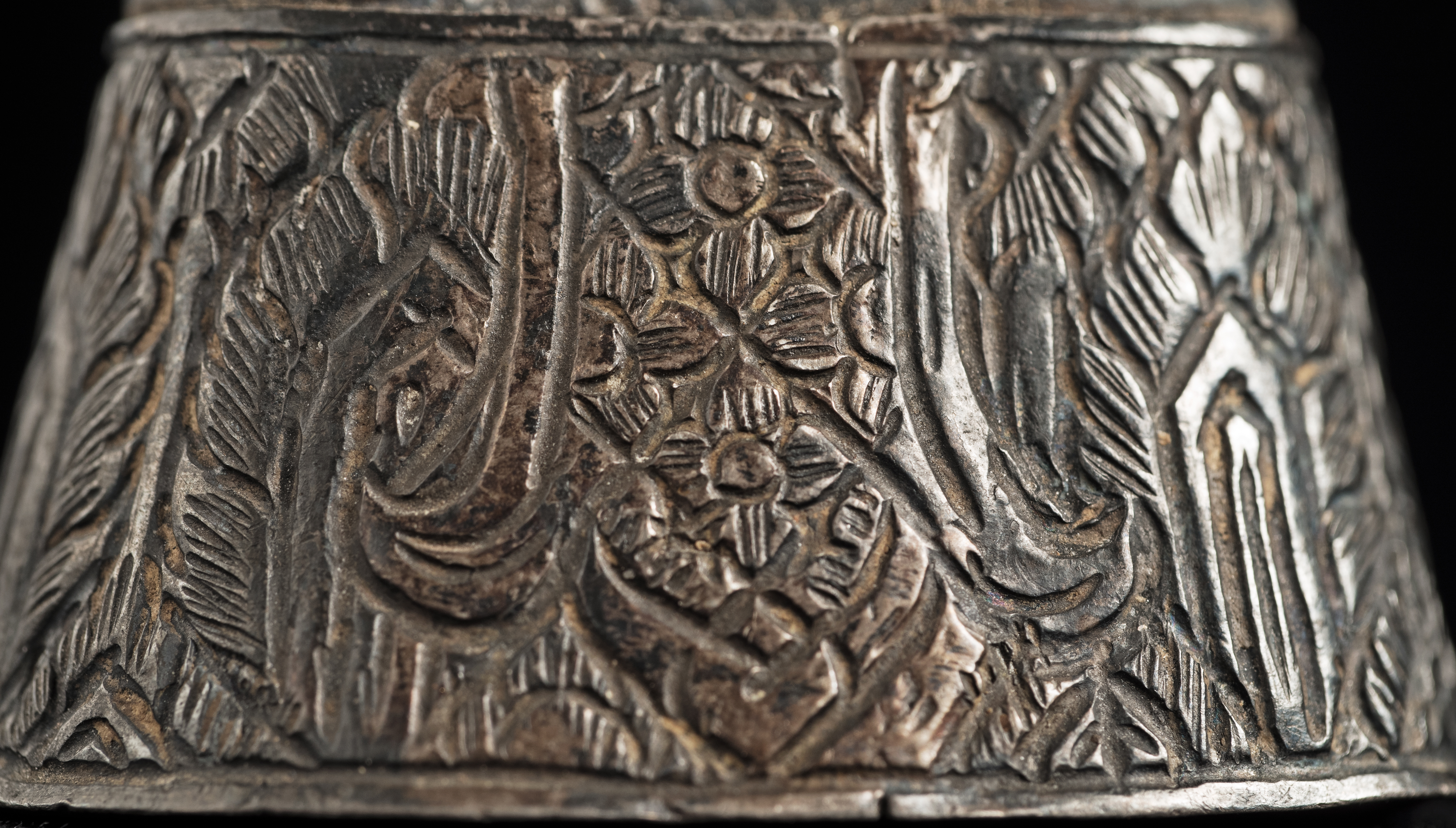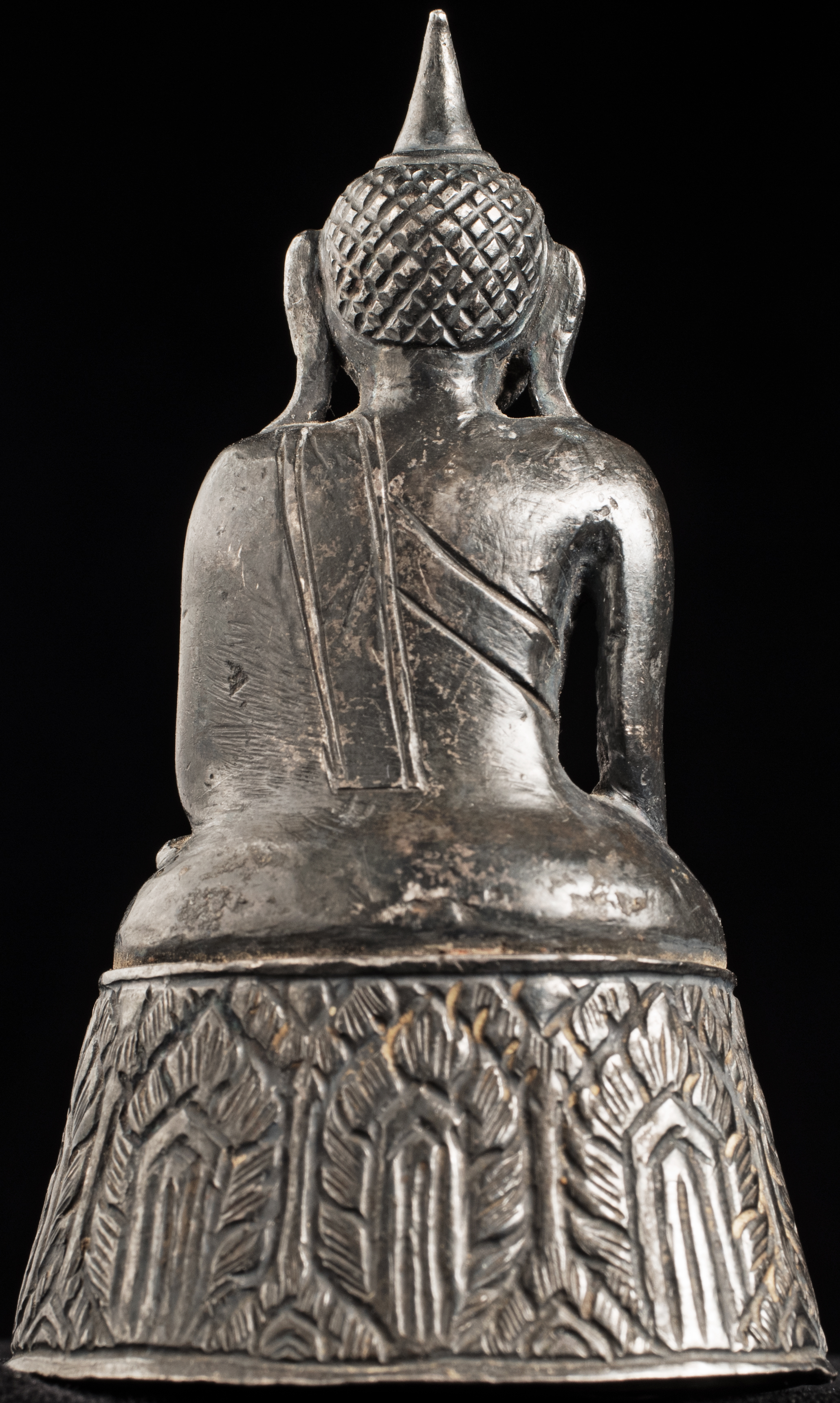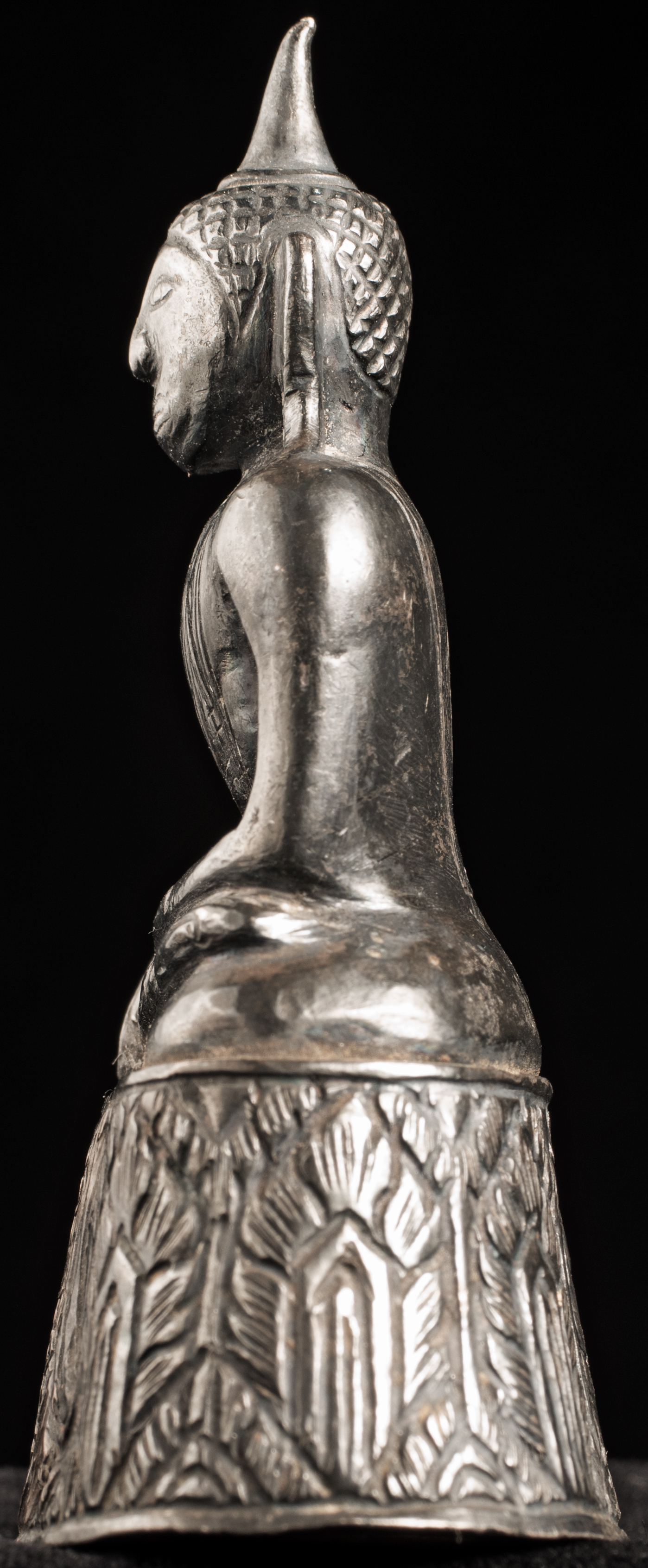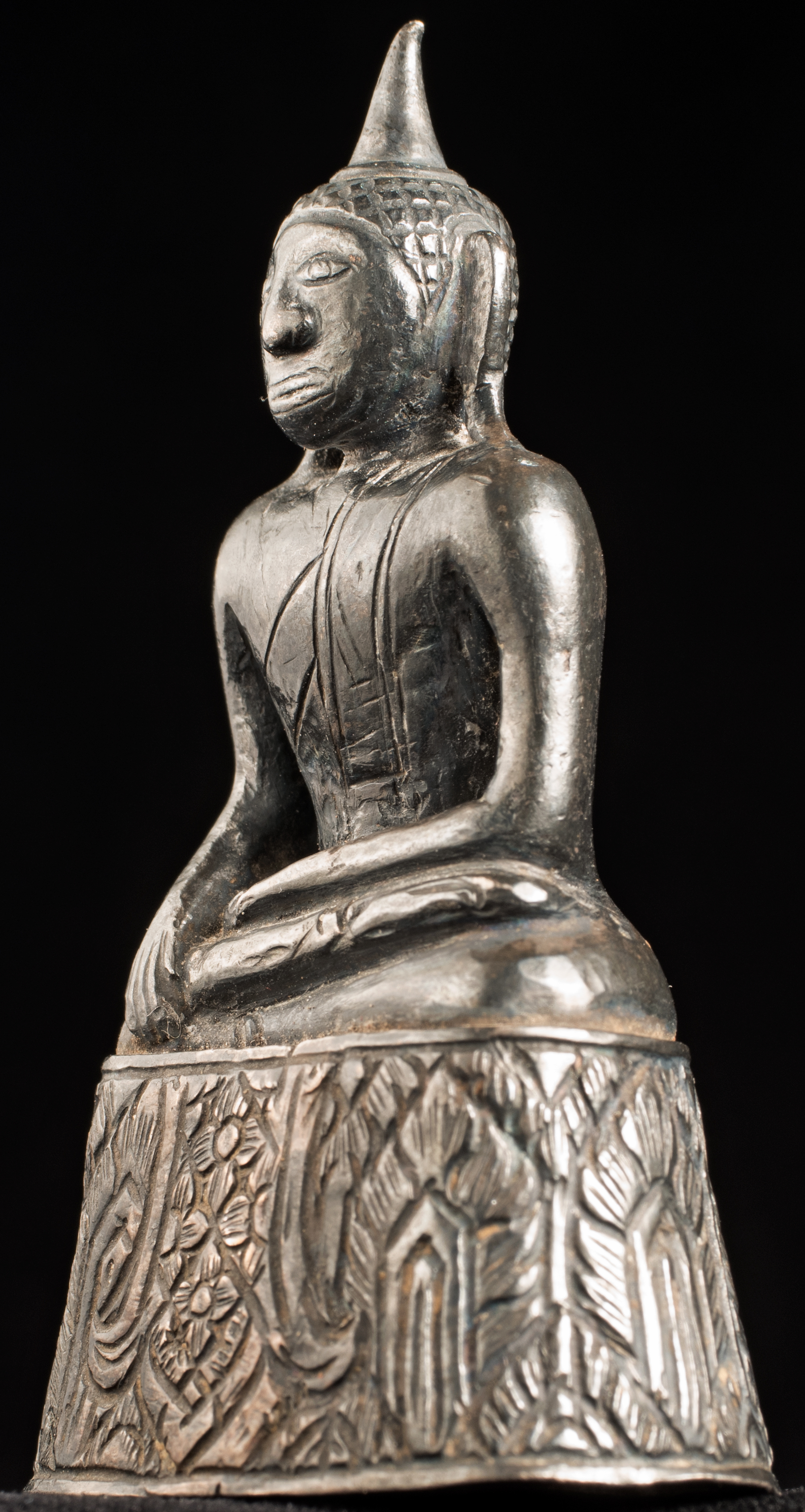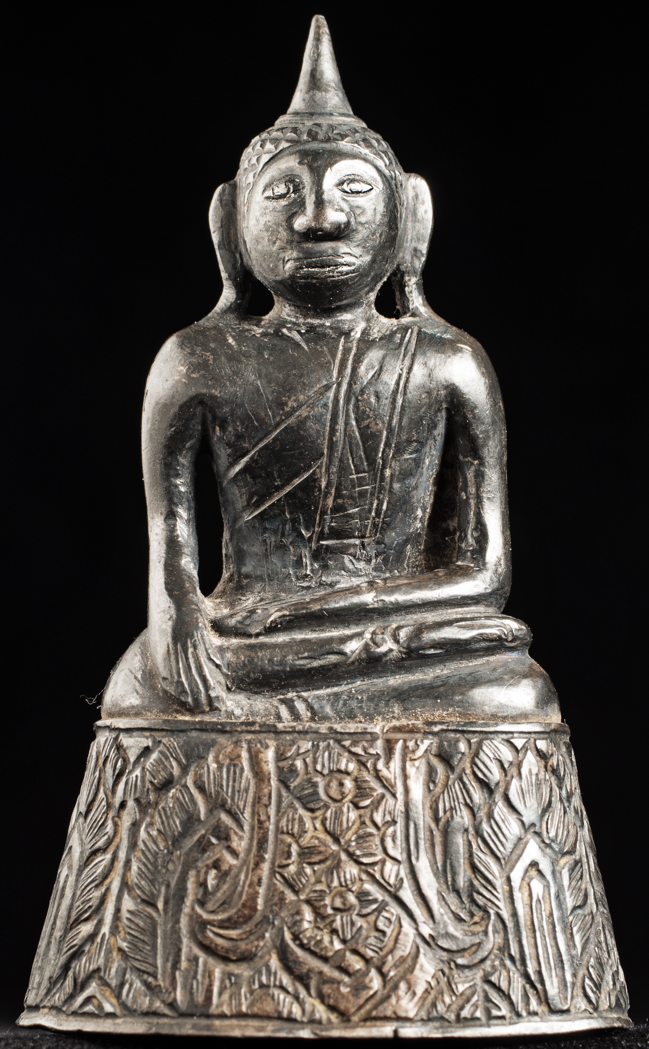 17/18thC Silver Cambodian Buddha--though this fellow has strong influence from Laos. Very high percentage silver, thickly cast over a clay core. This type is often very thin silver that can be easily bent--this one cannot be bent at all and is quite heavy for his size. He has very big Laos-style ears--an unusual feature that gives him an endearing look. Quite rare. Stands 2.75 inches tall. From a collection of small silver Cambodian Buddhas purchased many years ago as a group.