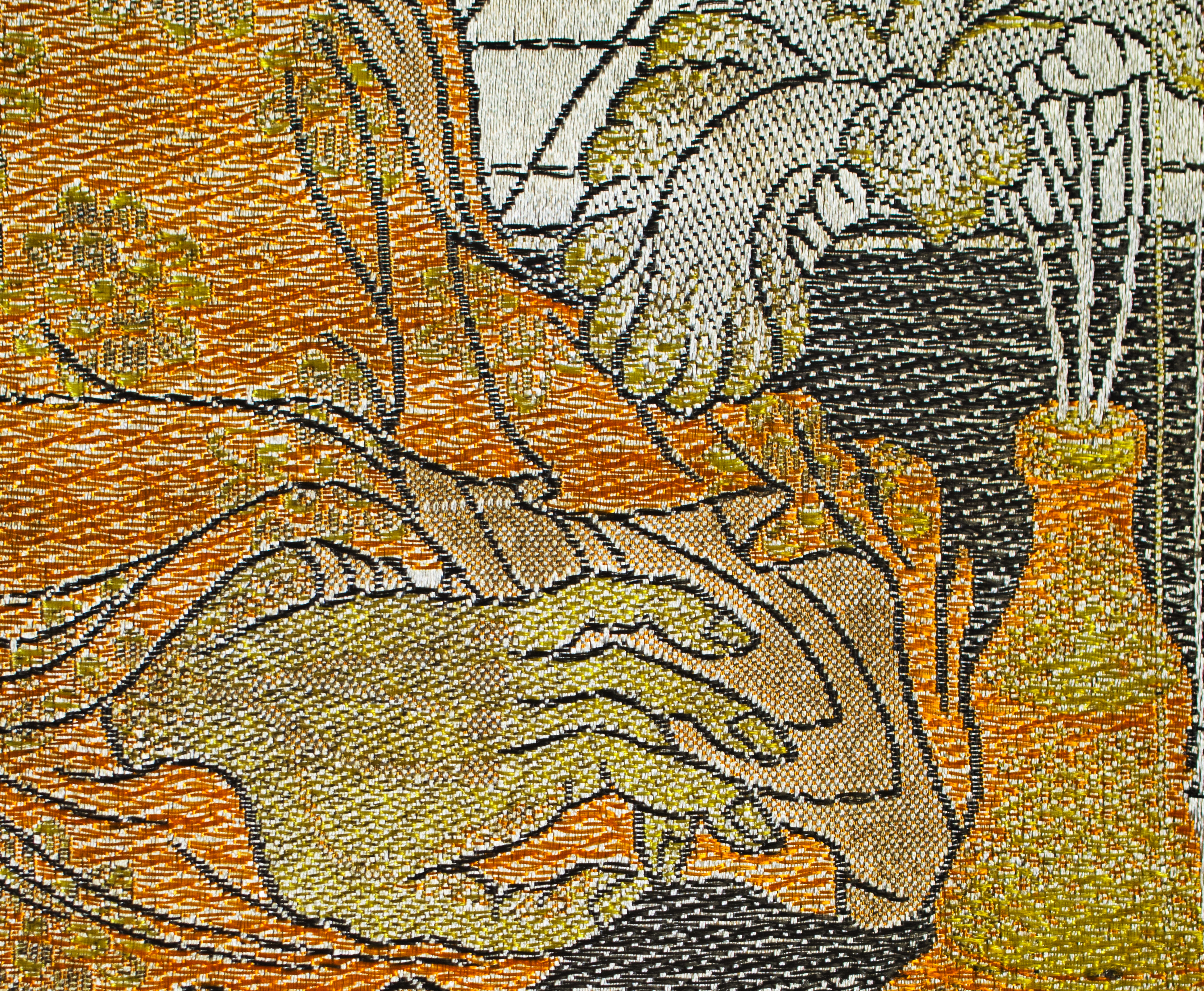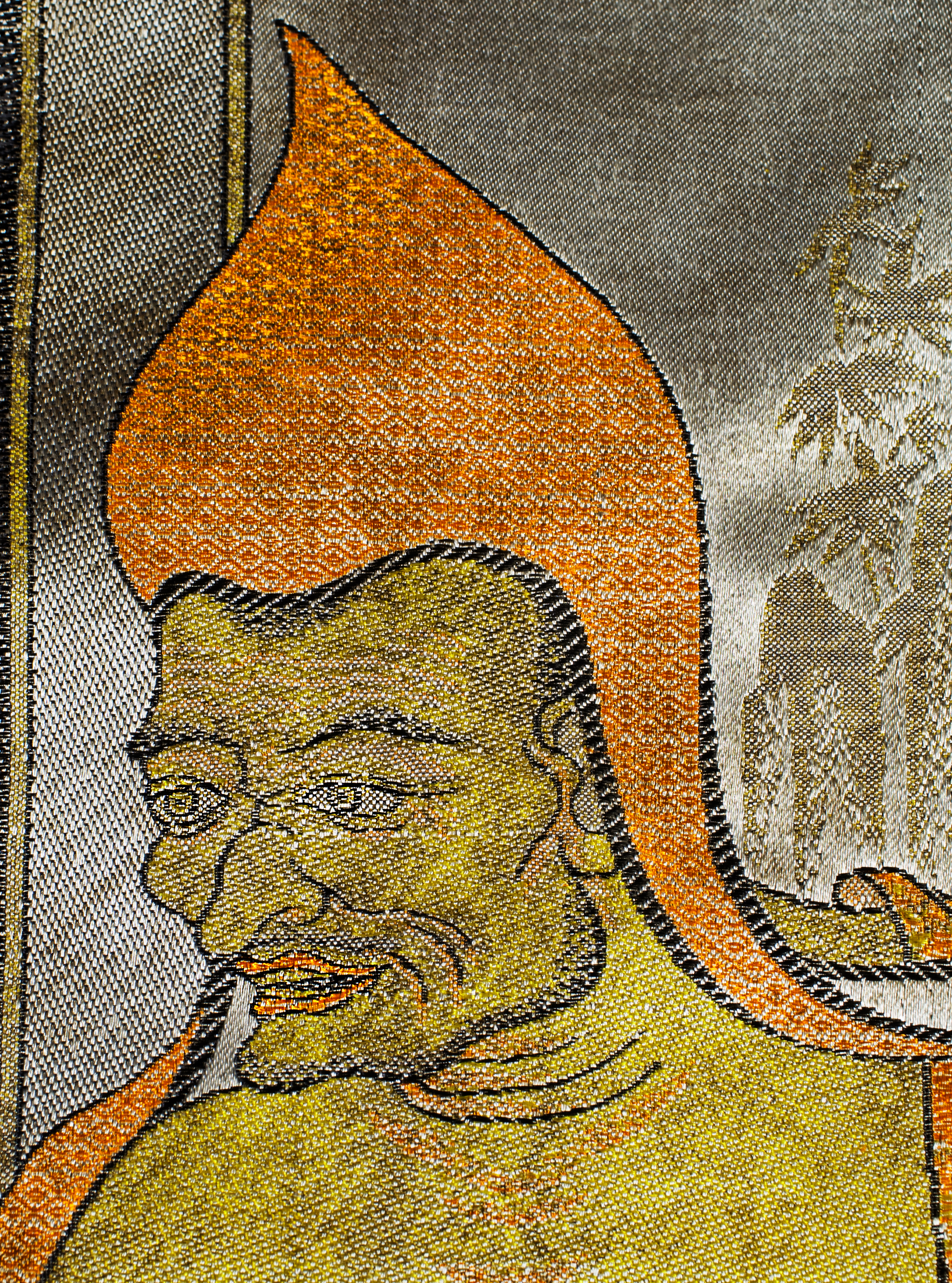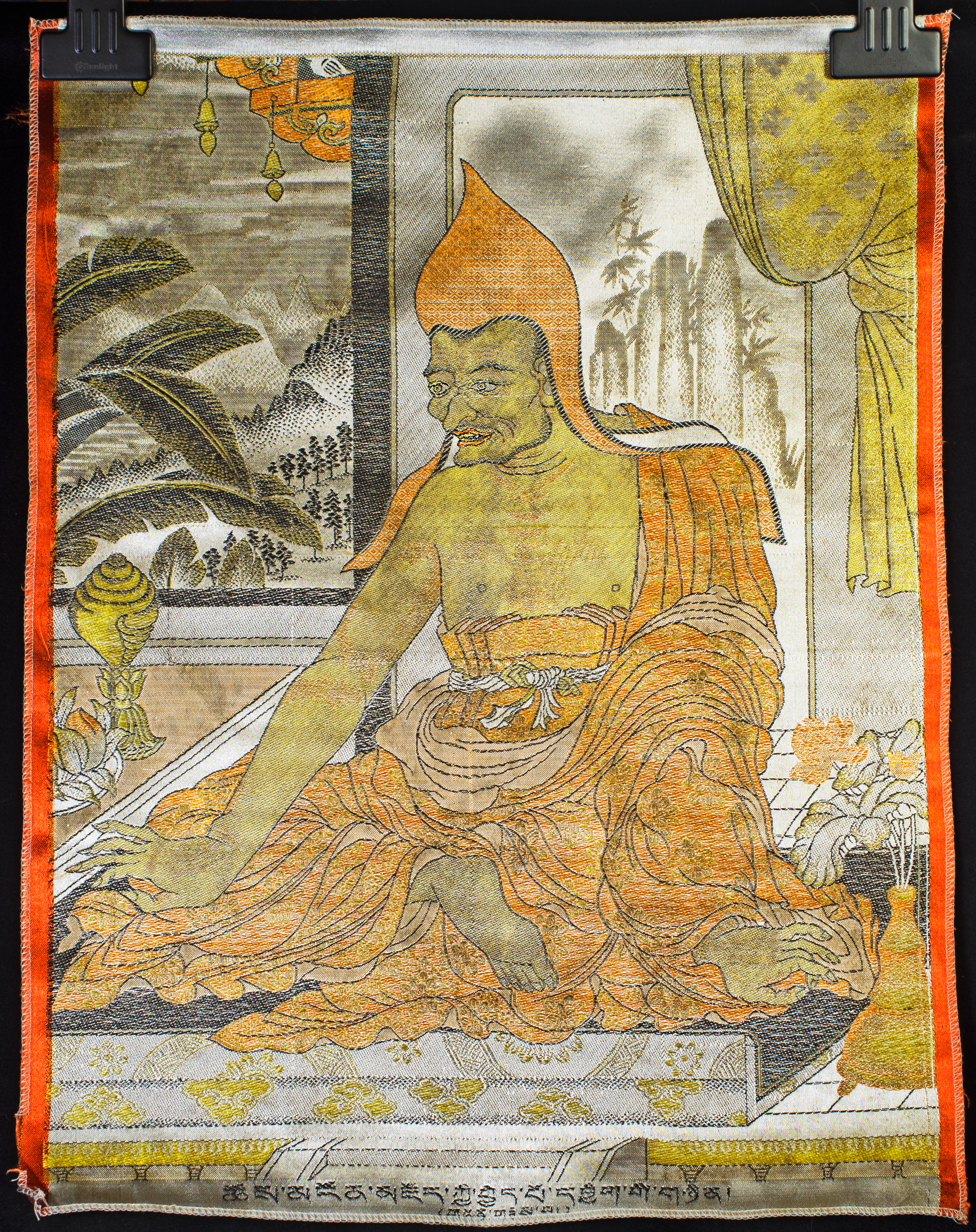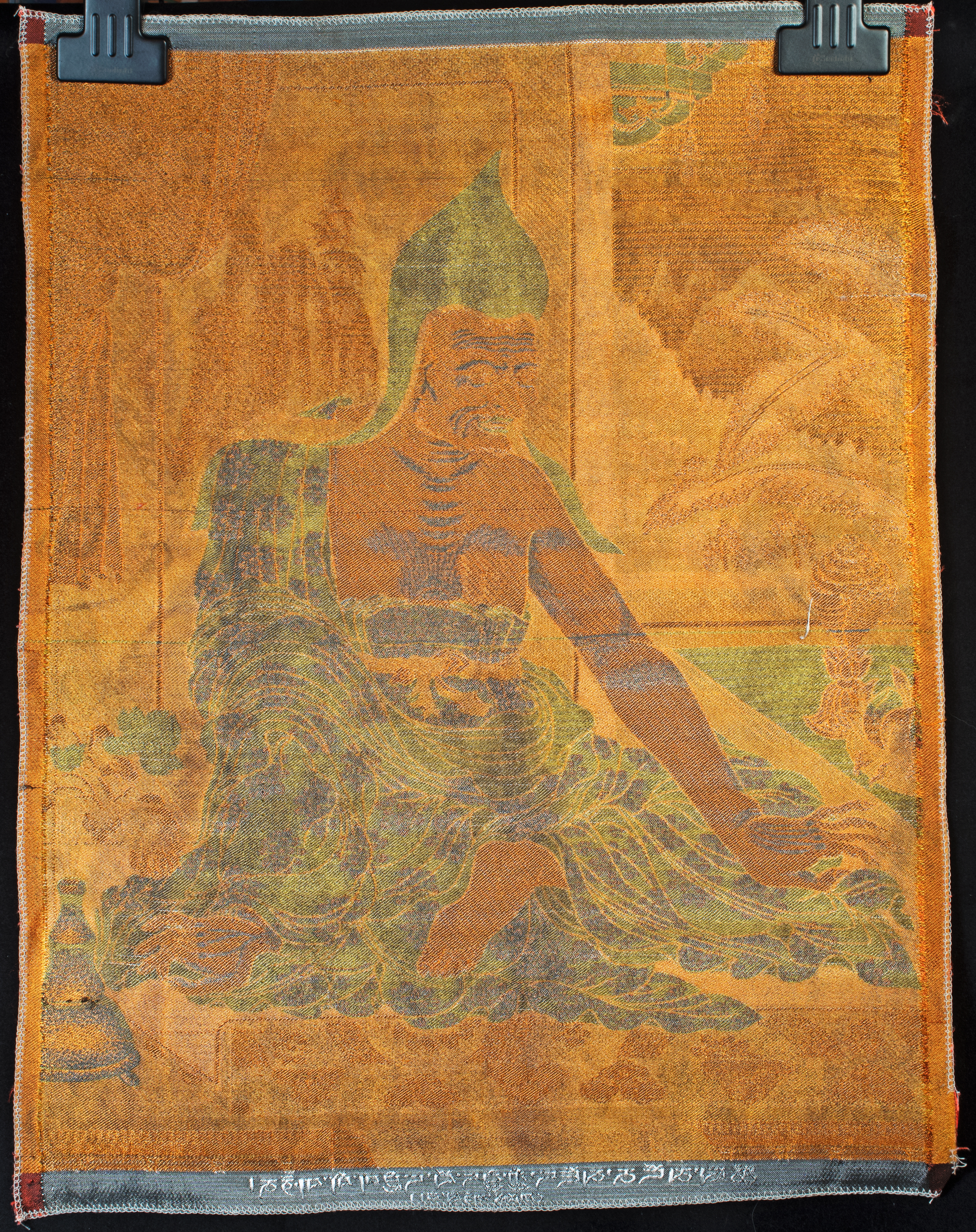 A shimmering Mongolian devotional tapestry of a scarce and highly desirable type, machine-woven approximately 50–70 years ago. Pieces of this quality and subject are exceptionally rare—I have encountered only two related examples in the past 25 years, one of which is listed on my website as #7125. When acquired, this work appeared dark and muted, but after a single professional cleaning—something I had never attempted before—it revealed its true brilliance. The transformation was extraordinary: the once-subdued image now radiates vivid golds, rich detailing, and a luminous presence. Woven in synthetic fibers, likely during the period of Russian rule, it remains a striking devotional artifact. It measures 16.25 × 21 inches and would look superb framed.