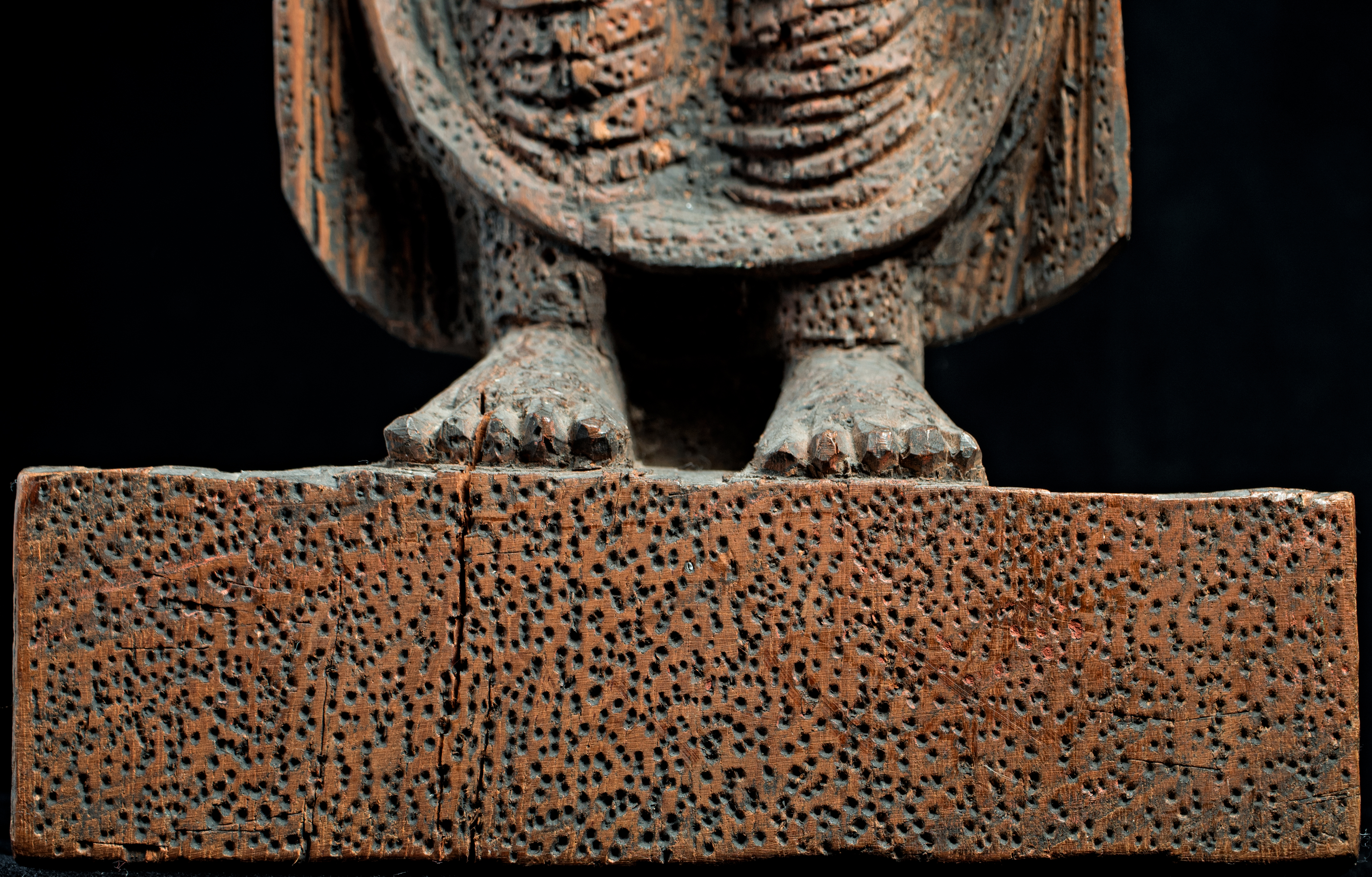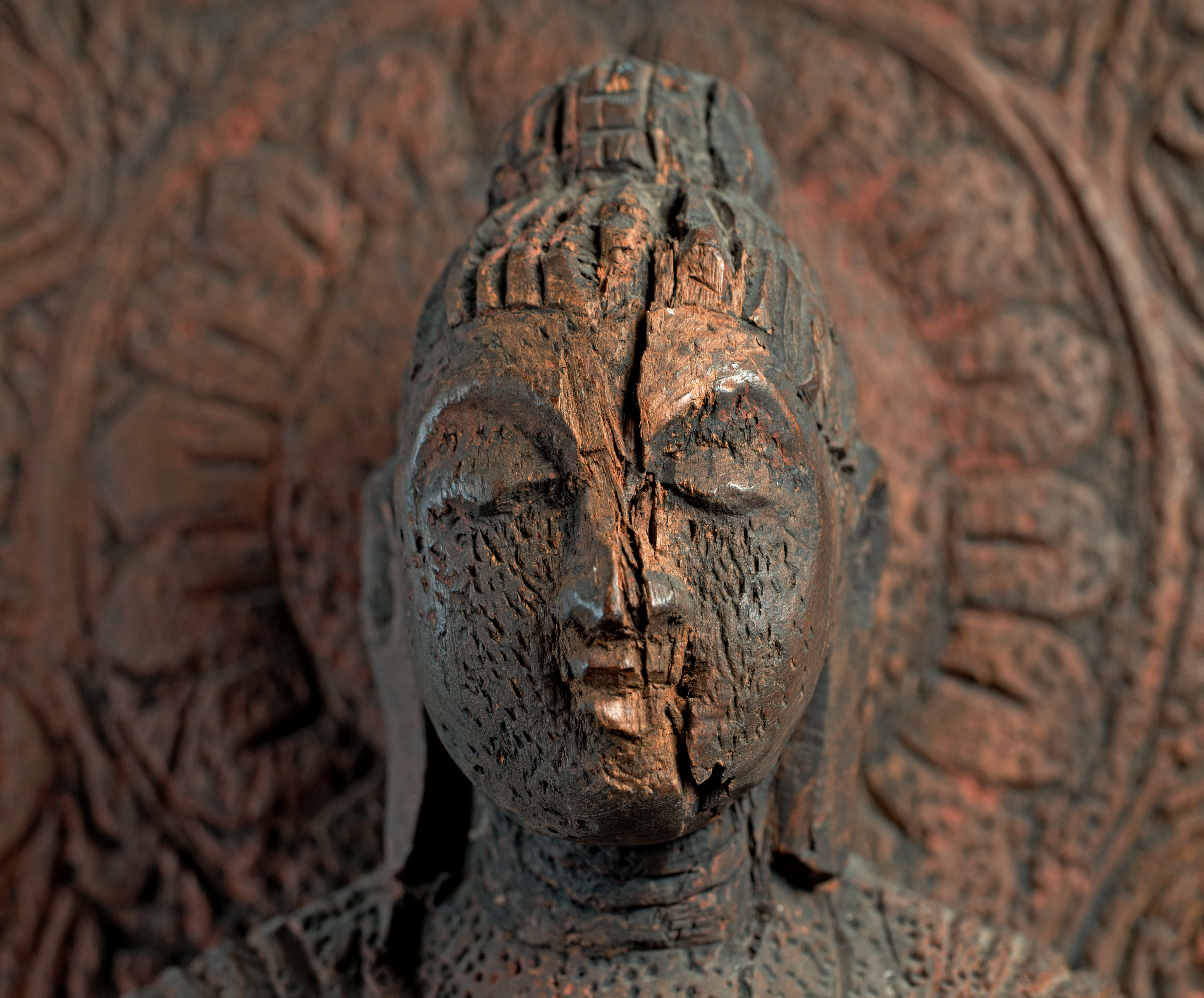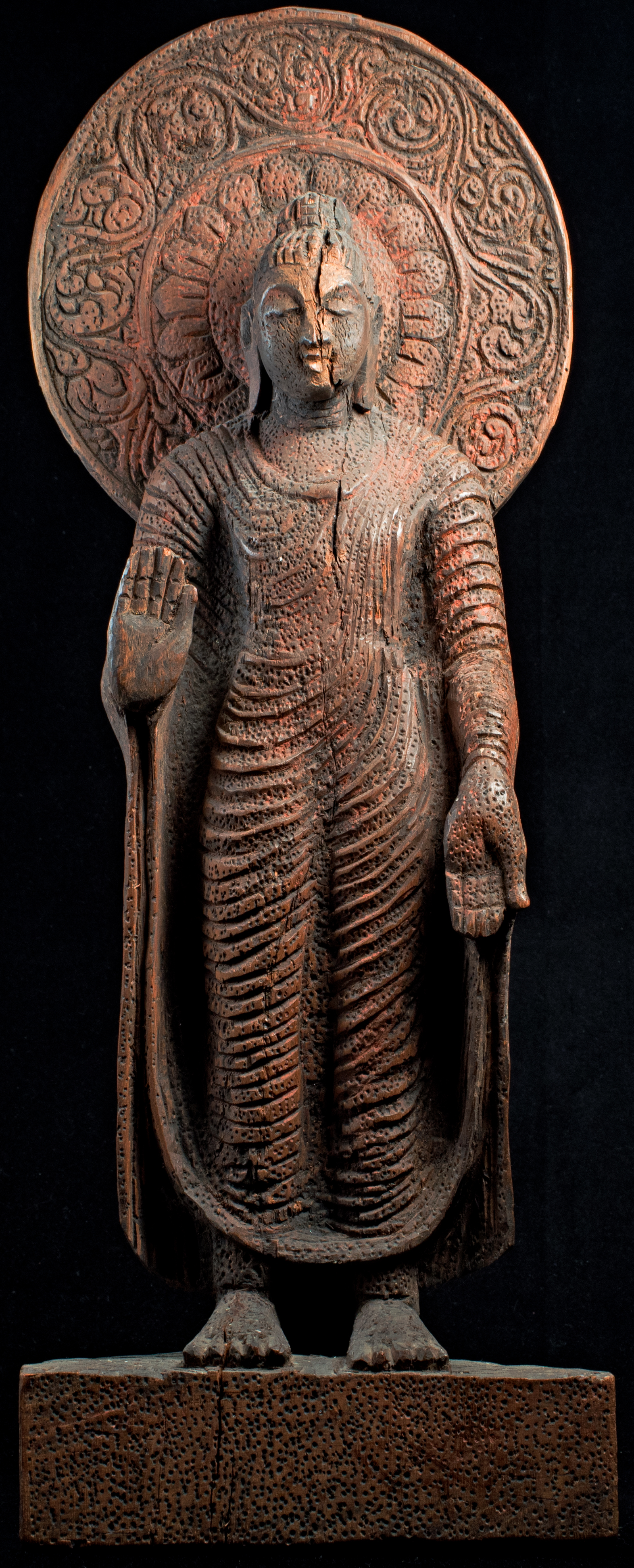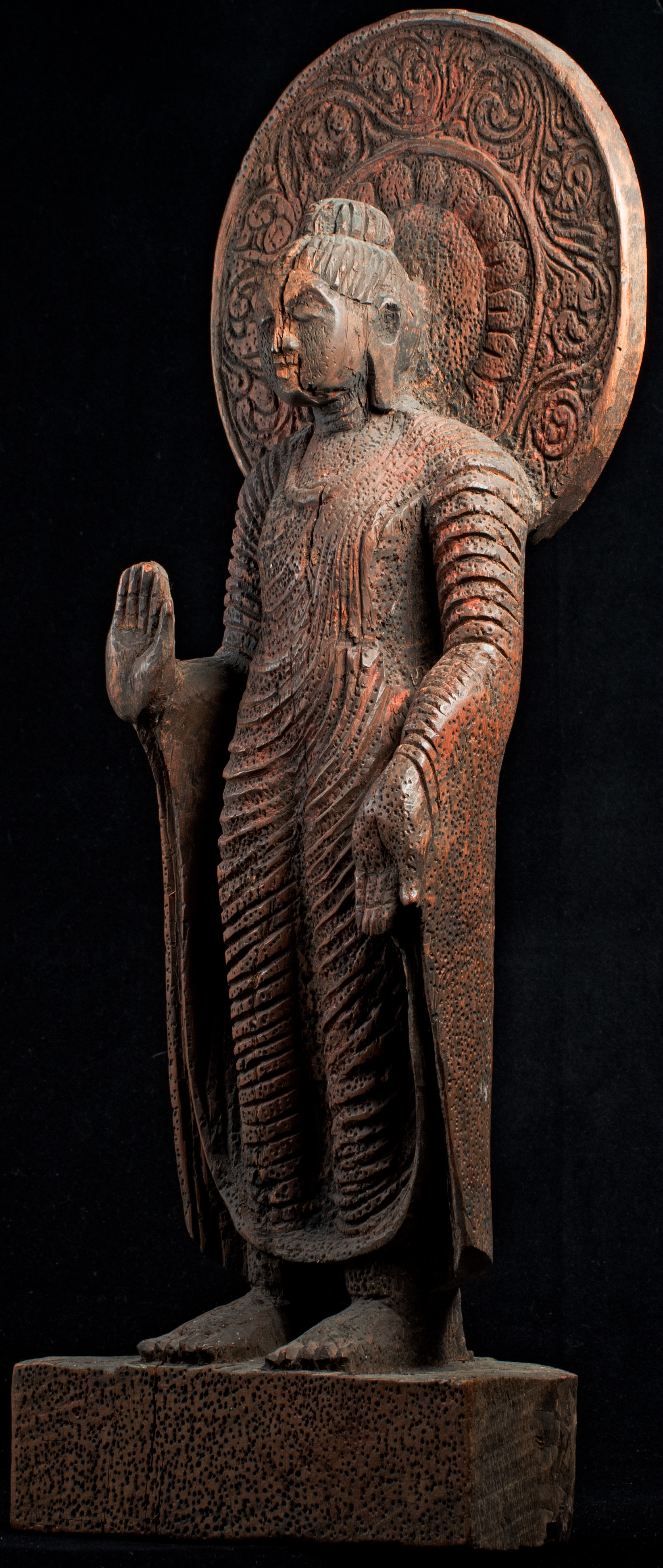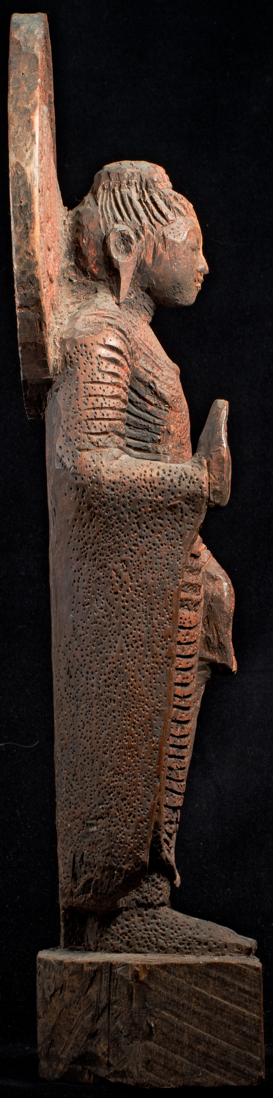 Large antique standing wooden Sri Lankan Buddha. Likely 19th to early 20th century. Flaw to face as seen in photos, but despite this, the face is remarkably sensitive in its modelling, and in its transmission of compassion, peace, and equanimity. Very interesting pyro-technique (I think using a hot pin?) to leave a pattern on the entire surface for design in a method that would have taken many many hours to complete, as it covers the entire body, back and base in great detail. The Mandorla behind the head is also very beautiful. Rare type. Total piece measures 19 1/4 inches tall x 7 1/8 inches wide x 4 inches deep.