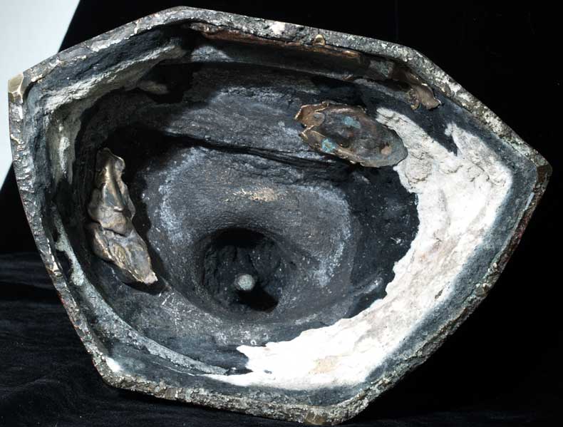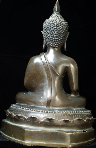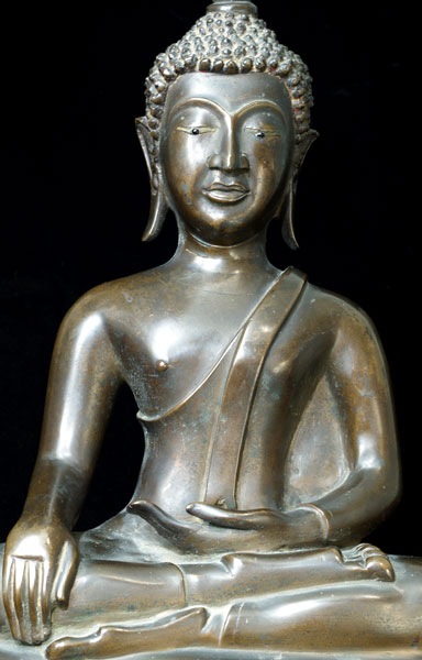 Offered for your consideration- a large and fine crisply cast Northern Thai Buddha of haunting beauty. He is thickly cast of very fine bronze. The eyes have what looks to be the original inlay, which is quite rare to find- this adds greatly to the intensity of his wonderful face. There are traces of deep red lacquer deep in the crevices of the base, the hair, and behind the ears which indicate that he was originally lacquered and probably gilded. He has some features related to Laos Buddhas (the finial, the ears), but he is most certainly Thai) The deep, rich patina suggests that his lacquer wore away long ago. This fellow sits 15.5 inches tall by 11 inches wide by 8 inches deep and weighs an astonishing 24 pounds with very little clay core.