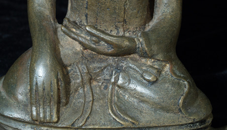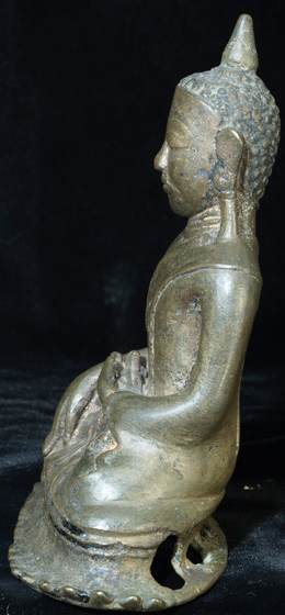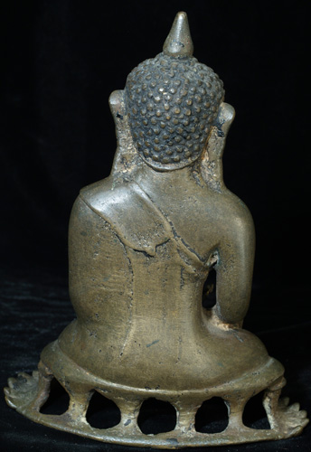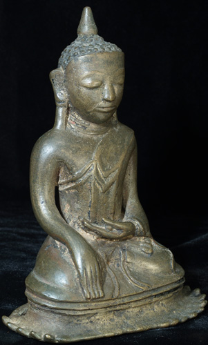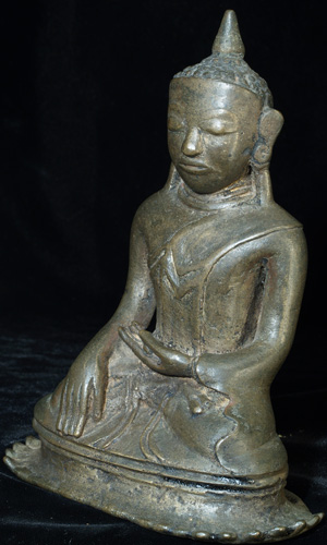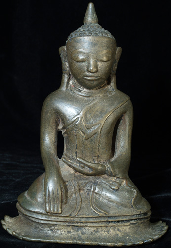 This is a true early Ava Buddha. These are quite rare, ant his one, with his unique base, is quite special. He is truly a one of a kind. Not inexpensive, but you will never see another quite like him. Seven inches tall by over 5 inches wide at the base.