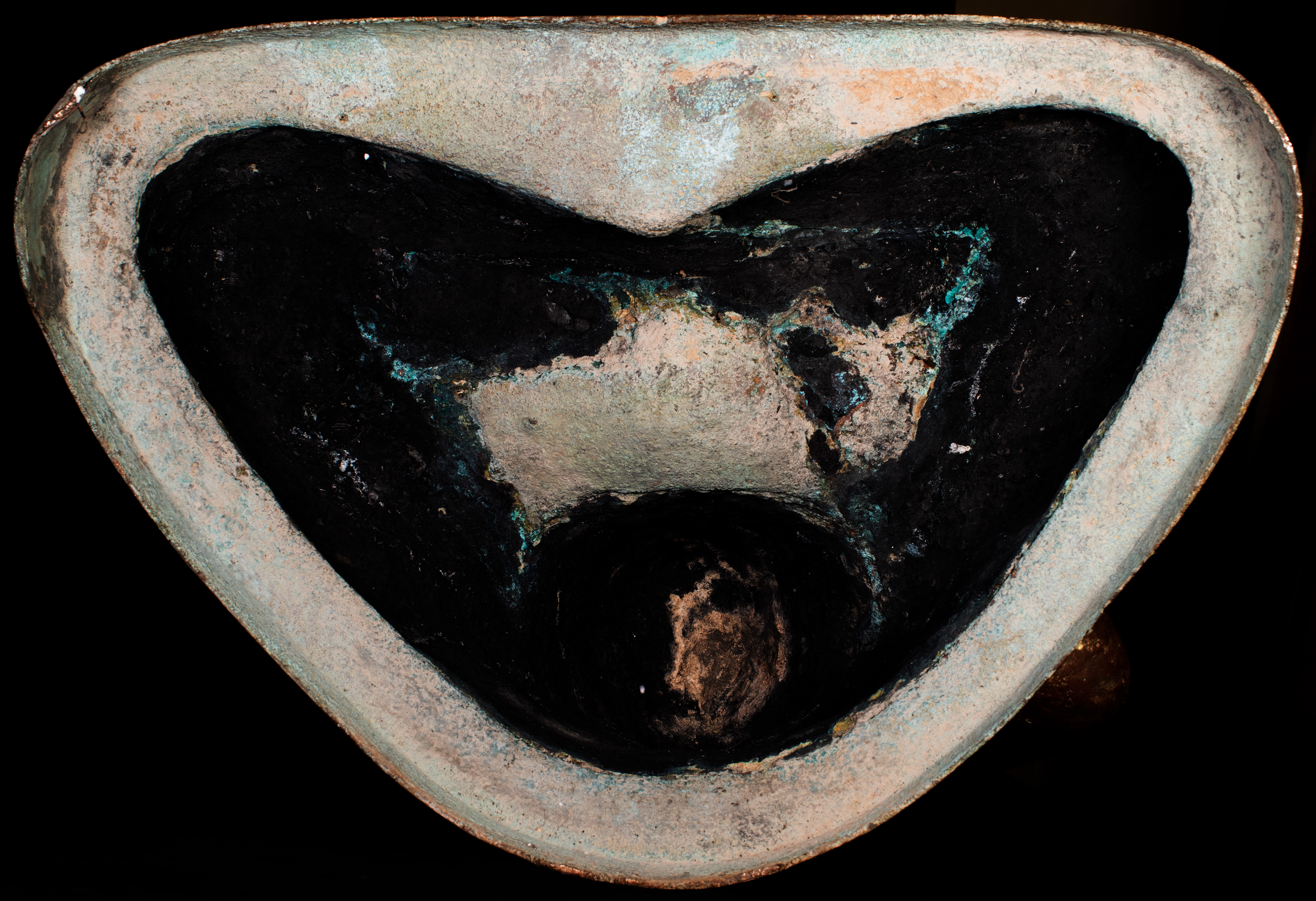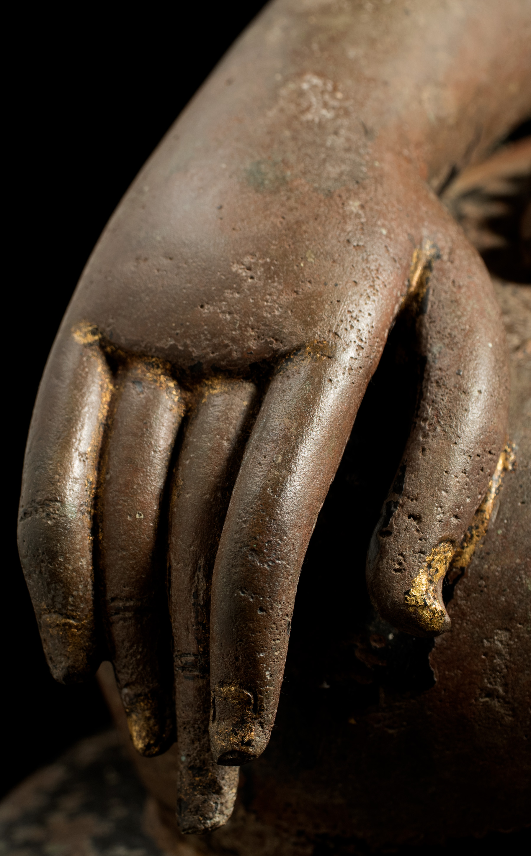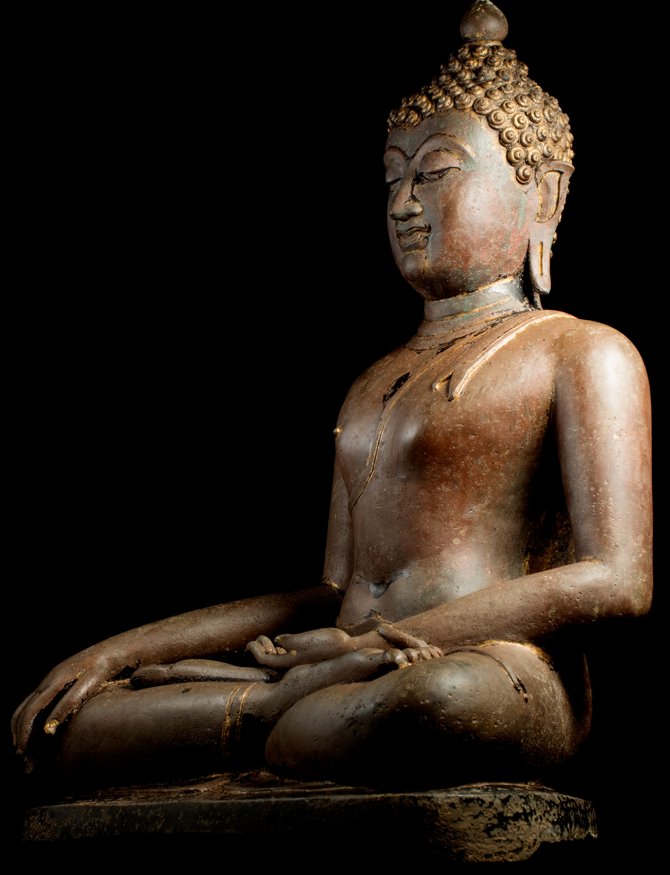 Exceptional Buddha- one of the best large Buddhas in the collection. A Northern Sukothai style-- a hybrid of Northern Thai style (Chen Sen Style) and Sukothai from central Thailand. Shows remains of original black lacquer and gilding, as well as an unusual reddish patina that suggests that it was a through fire long ago--likely a temple fire(not uncommon for a Buddha to experience fire during its 600-year life). I've had many Buddhas that have been in fires--some only singed, others ruined. This one transformed in a wonderful way. Strong casting and finishing of a very high standard from a major foundry. Large and extremely heavy at 23 inches x 12 inches x 17.5 inches. Larger than the dimensions suggest. A major Buddha with a powerful presence. ( H 23.25"x W 17.25"x D 11" ) Larger than the dimensions suggest. A major Buddha.