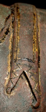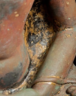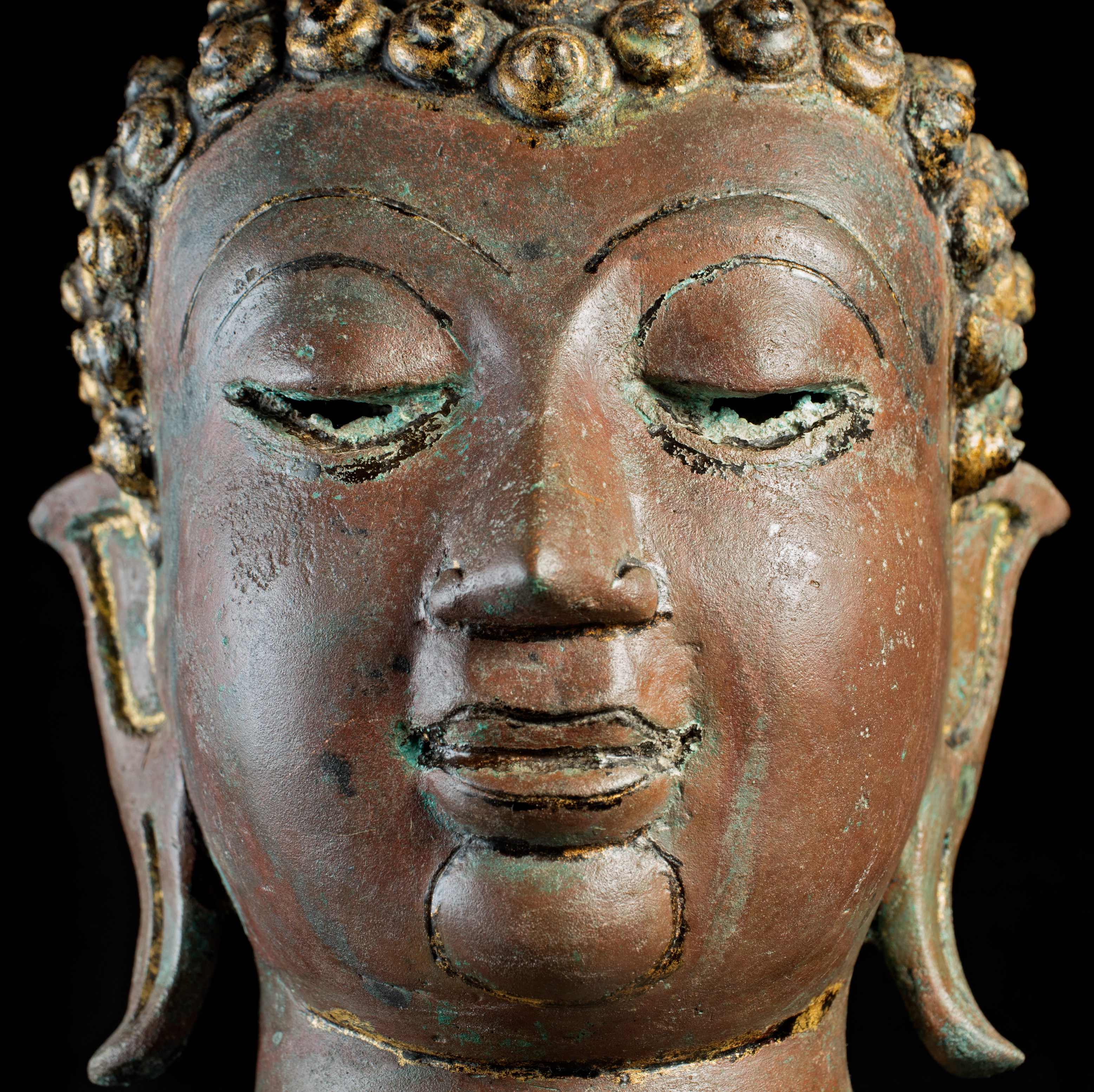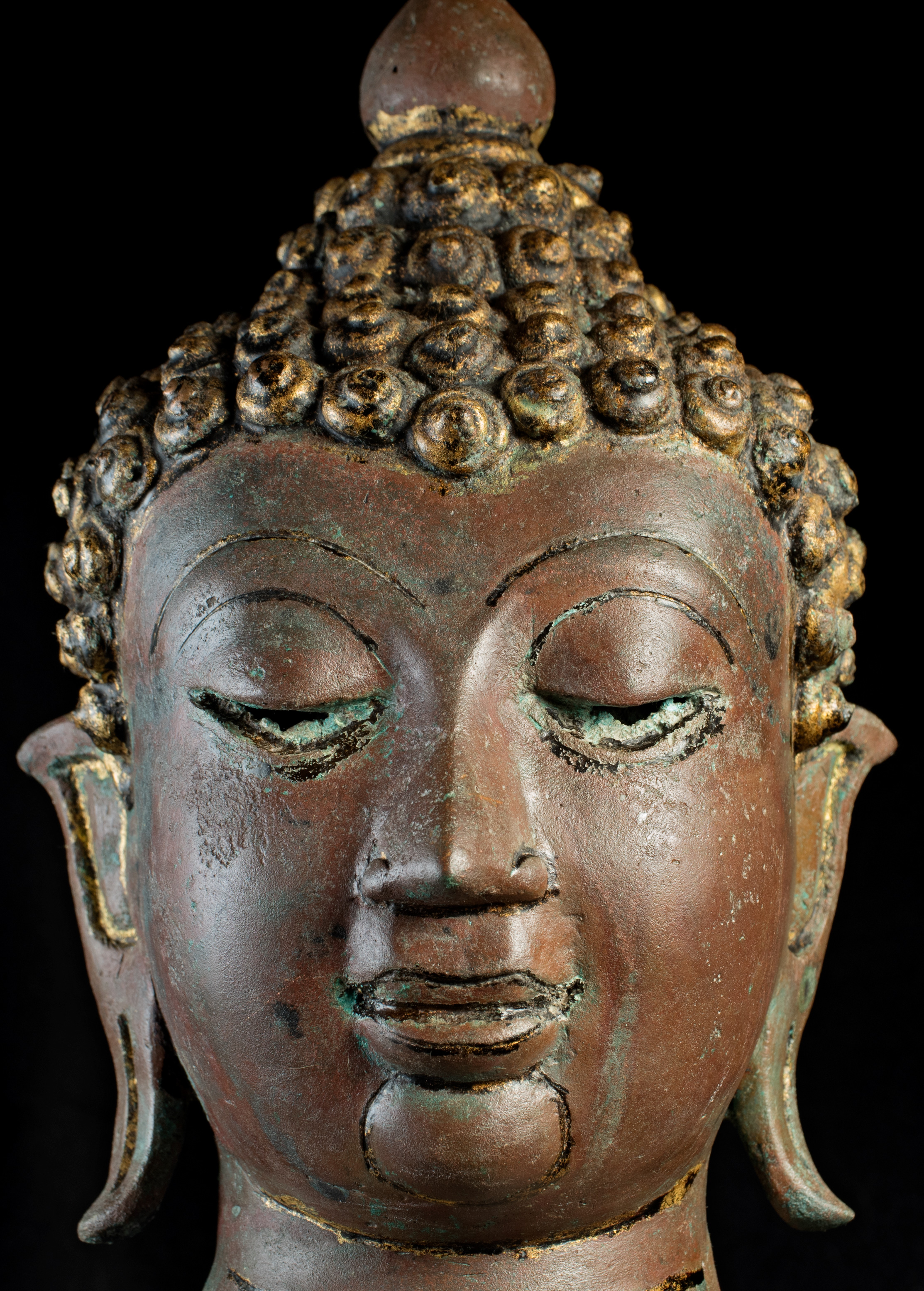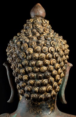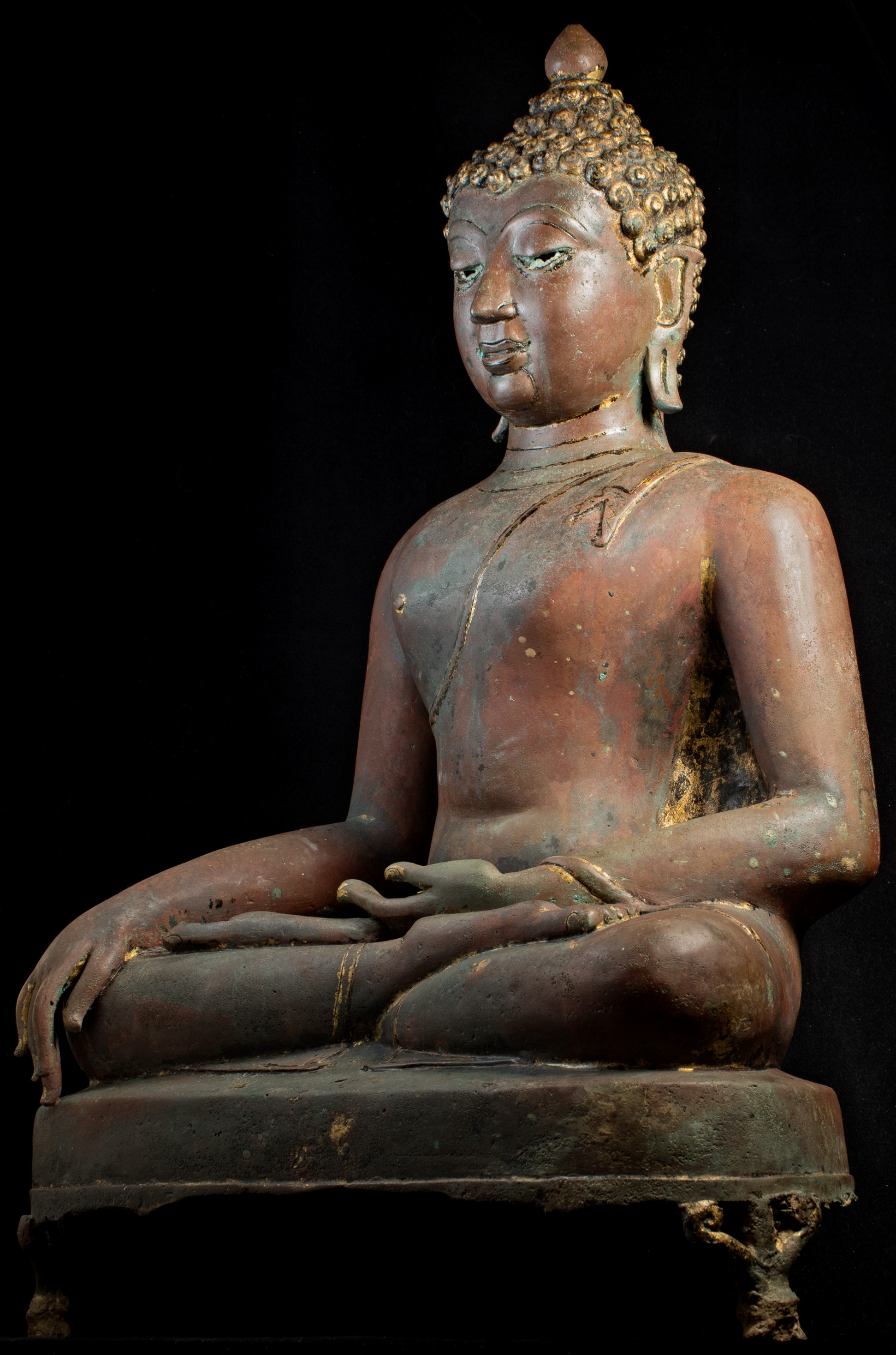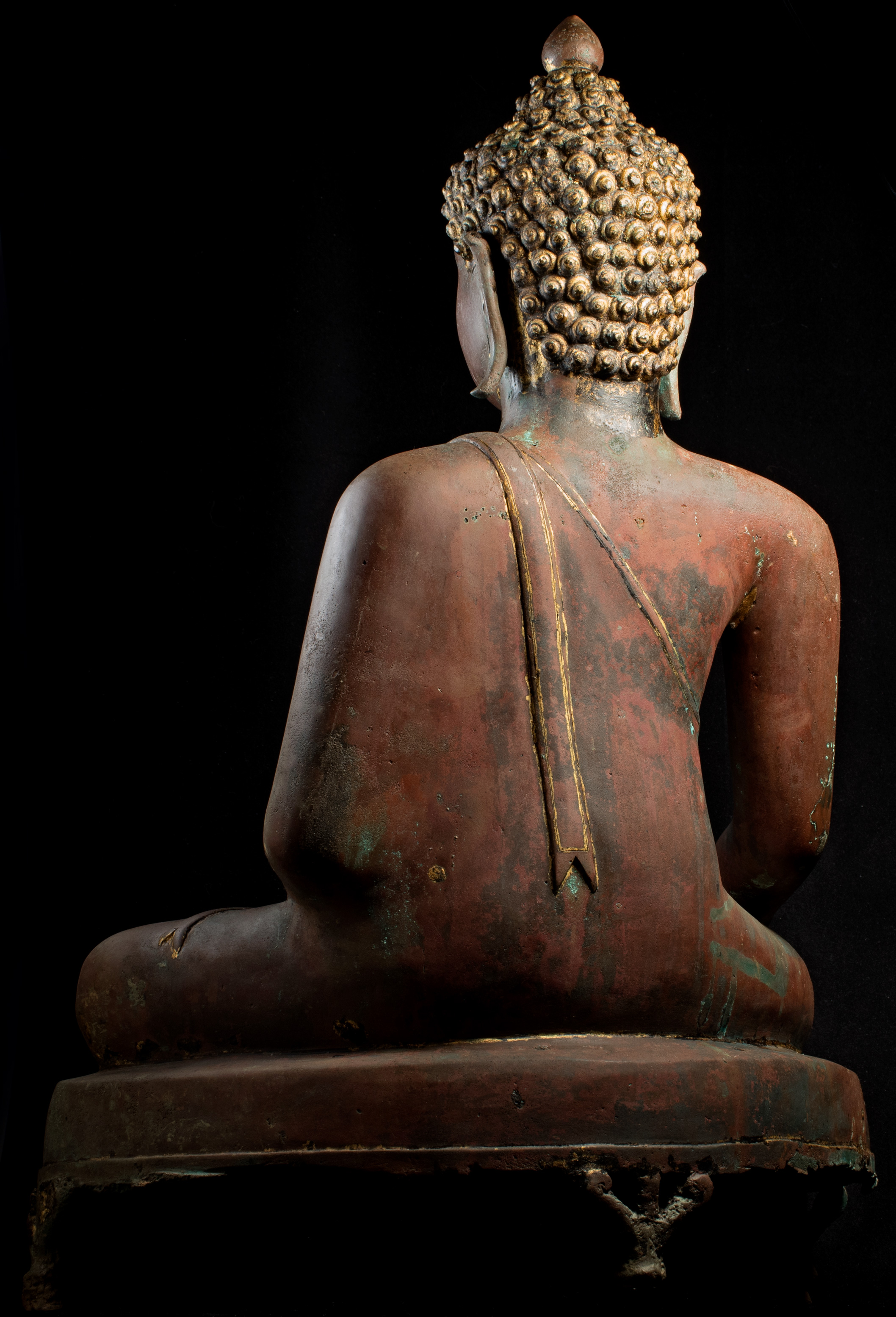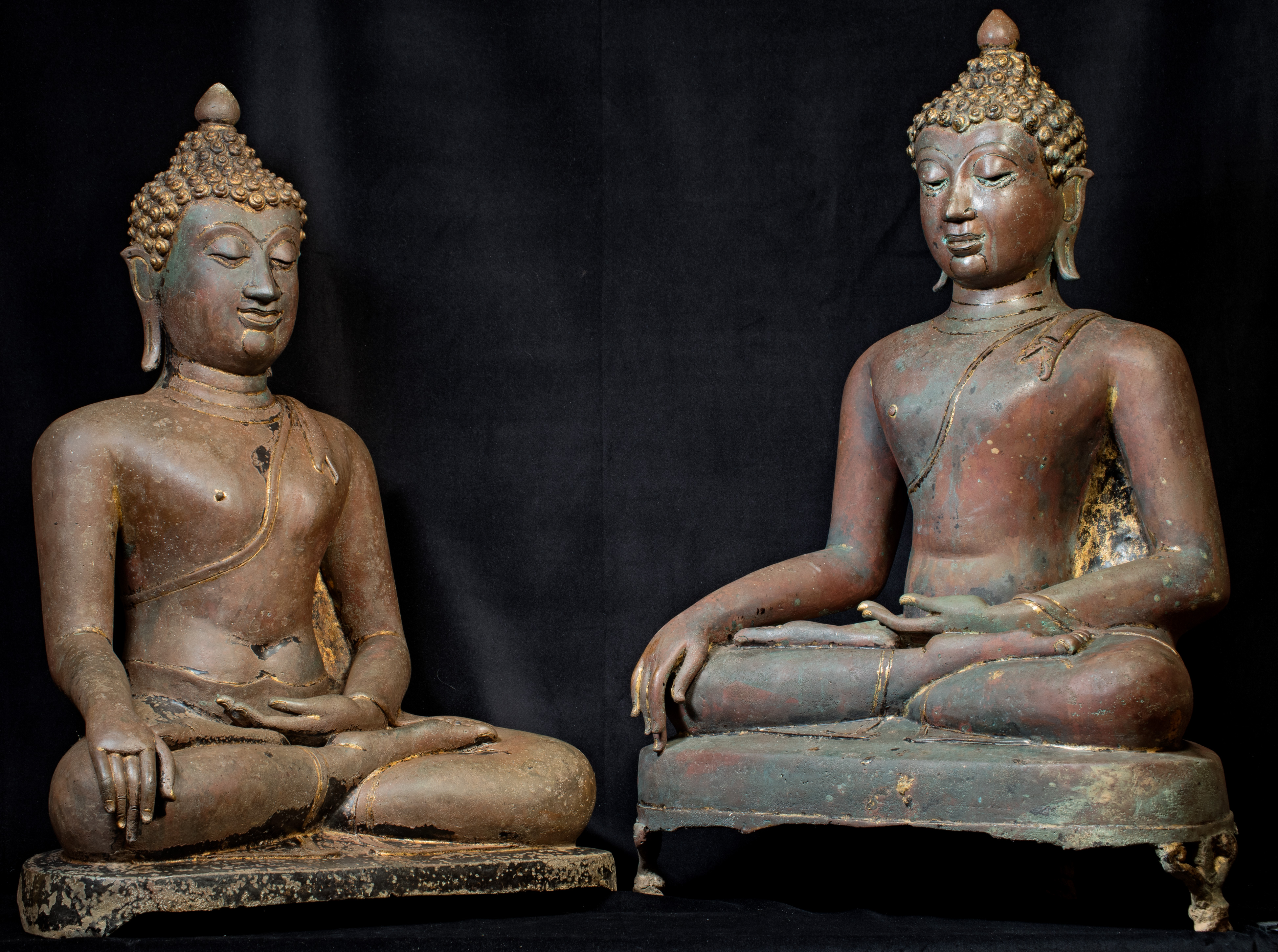 This Buddha and Buddha 8887 come from the same source. They are both a Northern Sukothai style--which is a hybrid of Northern Thai style (Chen Sen Style) and Sukothai in central Thailand. Both show remains of original black lacquer and gilding, as well as an unusual reddish patina that suggests that both have been through a fire together long ago--likely the burning down of a temple (not uncommon over the centuries). I've had many buddhas that have been in fires--some only singed, others ruined. These have been transformed, but not made worse from a beauty/piece of spiritual art point of view. All of the detail is still there. The patina is still pleasing. They are difficult to date. The quality (look closely at the hands and feet, as well as the face and hair) would suggest an early date, as would the type of lacquer and gilding and overall look. This type was first made in the 15th Century and has been made all the way until present day. I have waffled on this piece--at times, I was certain it was 15th Century, at others, I thought 19th/20th due to the thin base (though some pieces were made with thin bases in the 15th-17th Centuries). I really am not completely sure, and my price reflects that. It is large, beautifully sculpted, cast, and finished--and it shows magnificently and looks to have good age. It measures an impressive 25 inches x 18 inches x 11 inches.