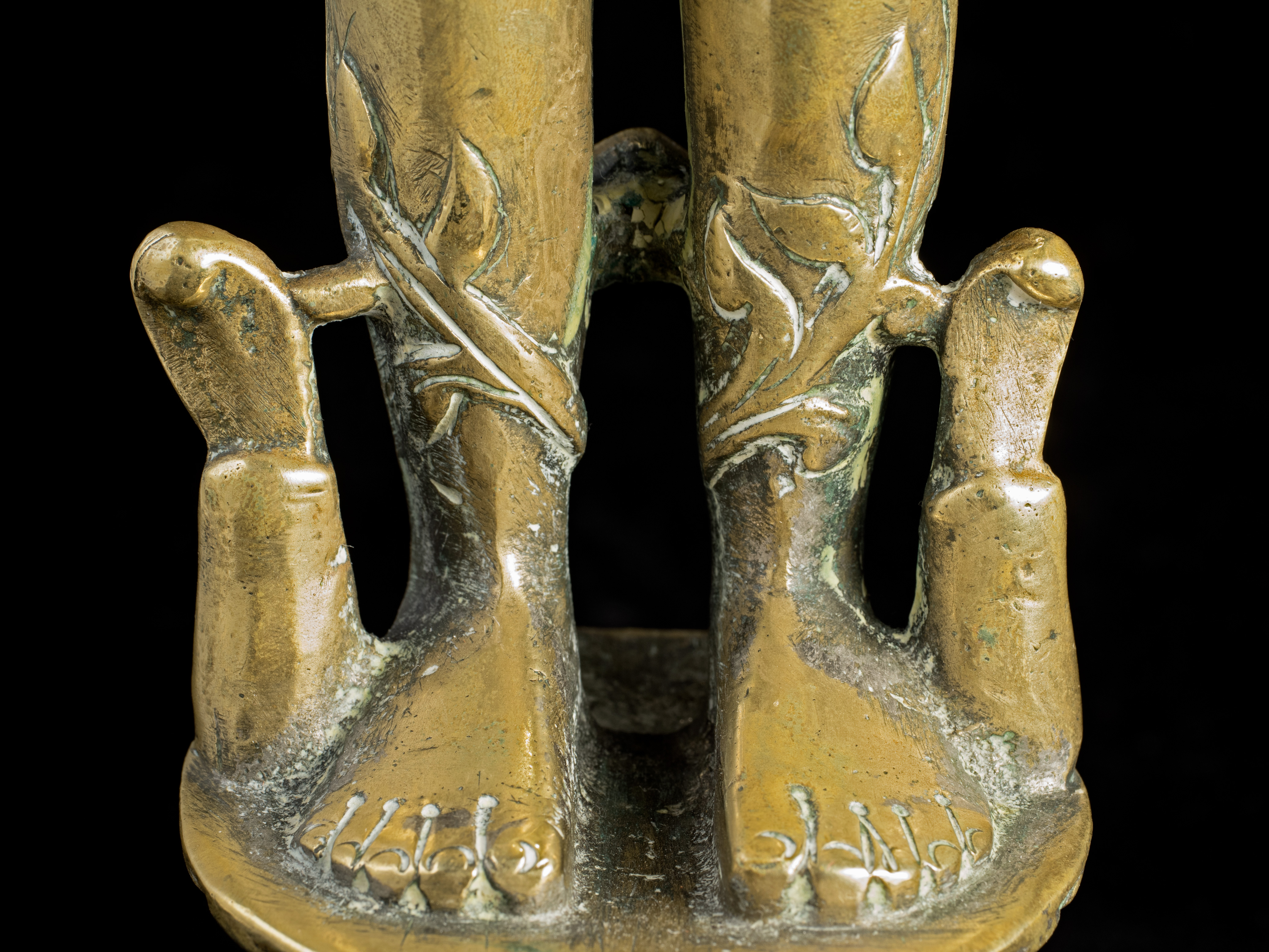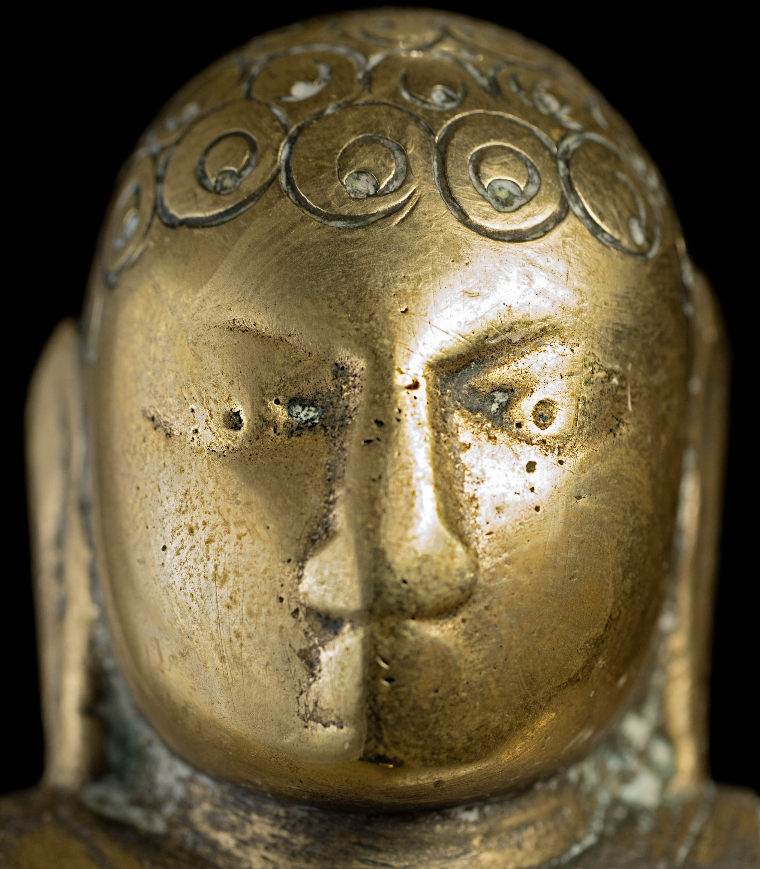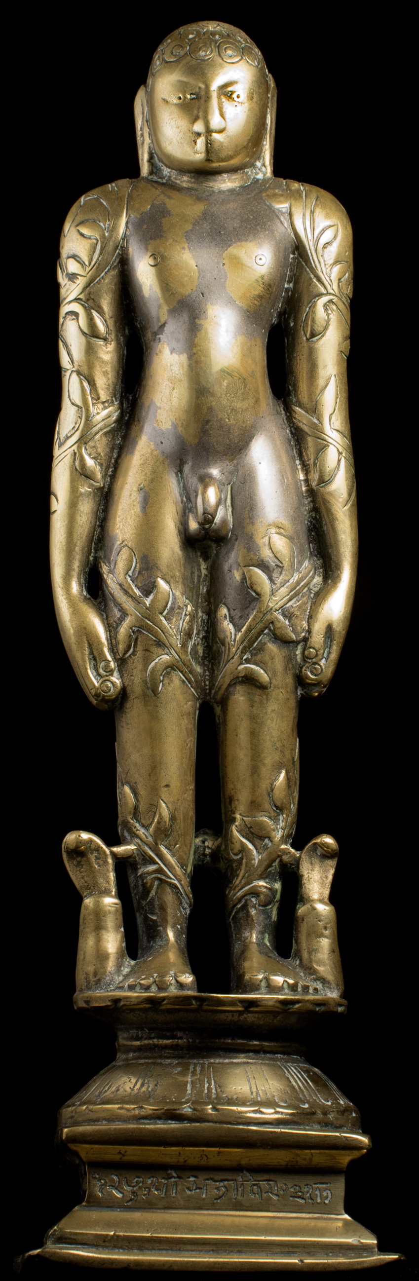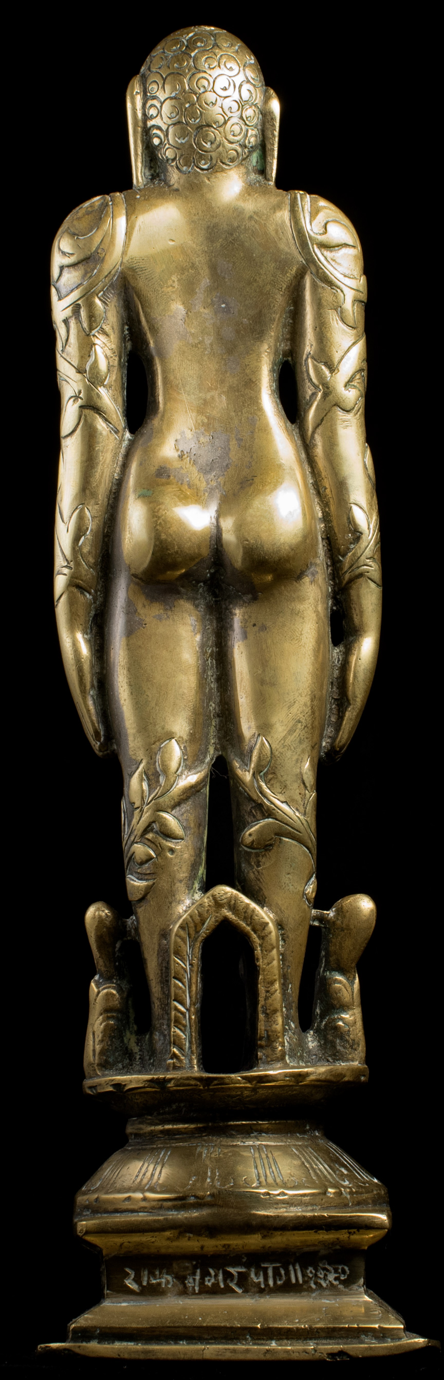 Very large 18thC (or earlier) very large Jain Deity from India. This piece measures an impressive 12 5/8 inches x 3 3/4 inches x 3 3/4 inches including the integrated base. It is solid cast of a high quality alloy and is very heavy. It has worn from ritual use in a wonderful way that has energized the statue, and given the face and body tremendous individuality and personality. There are very few examples on the market of this size and age that are of such nice quality--especially at reasonable prices.