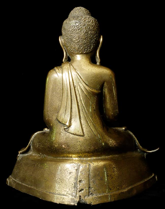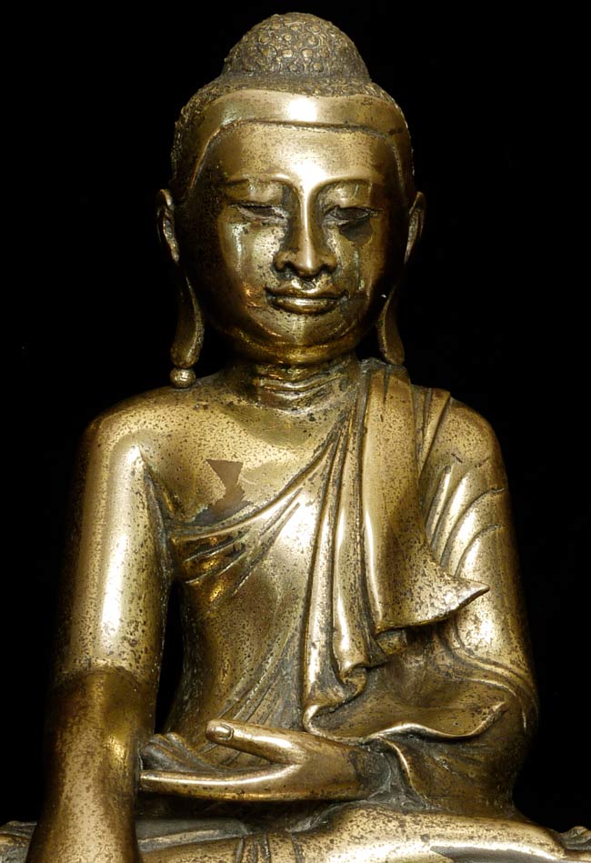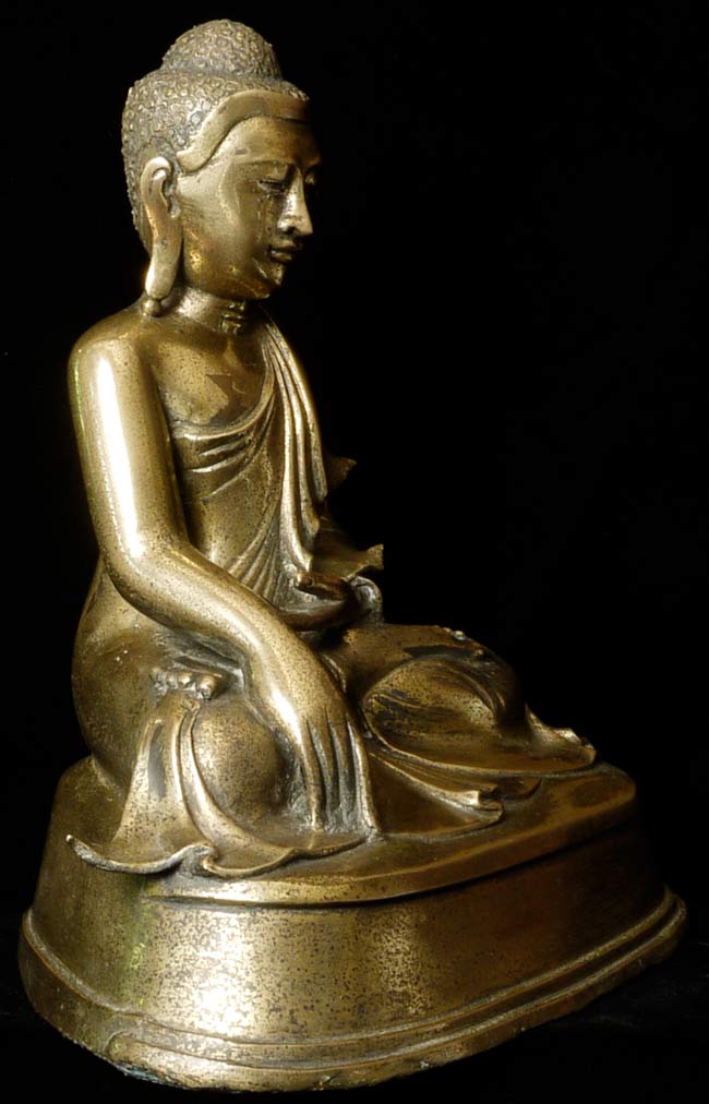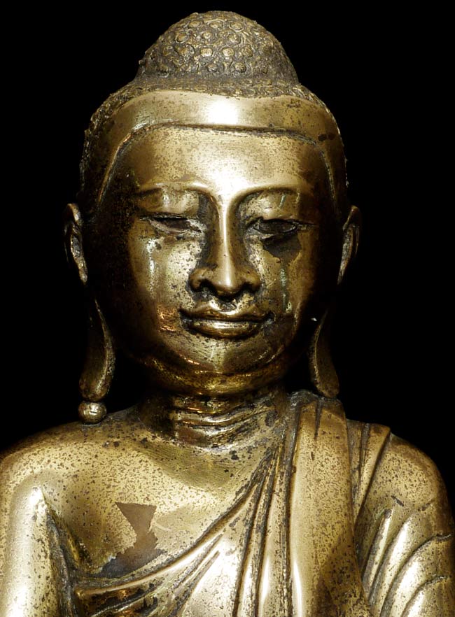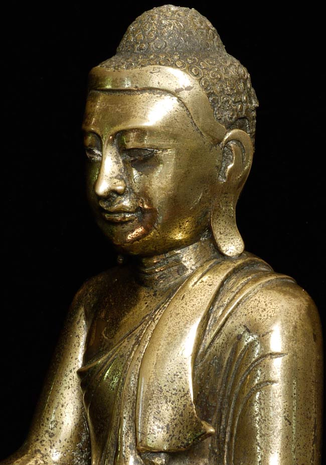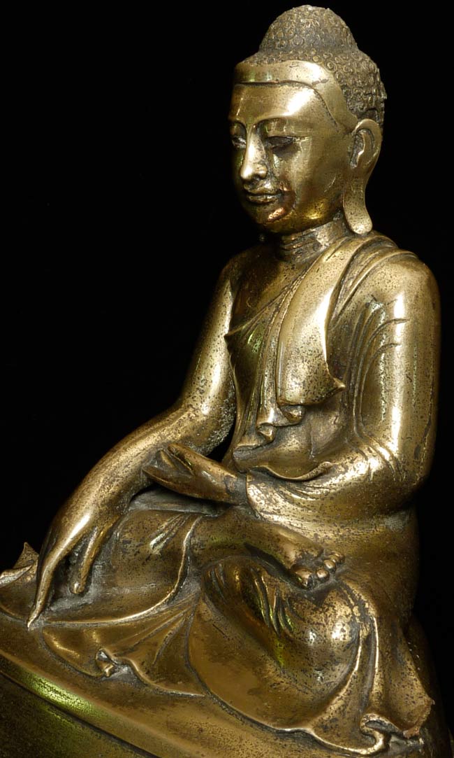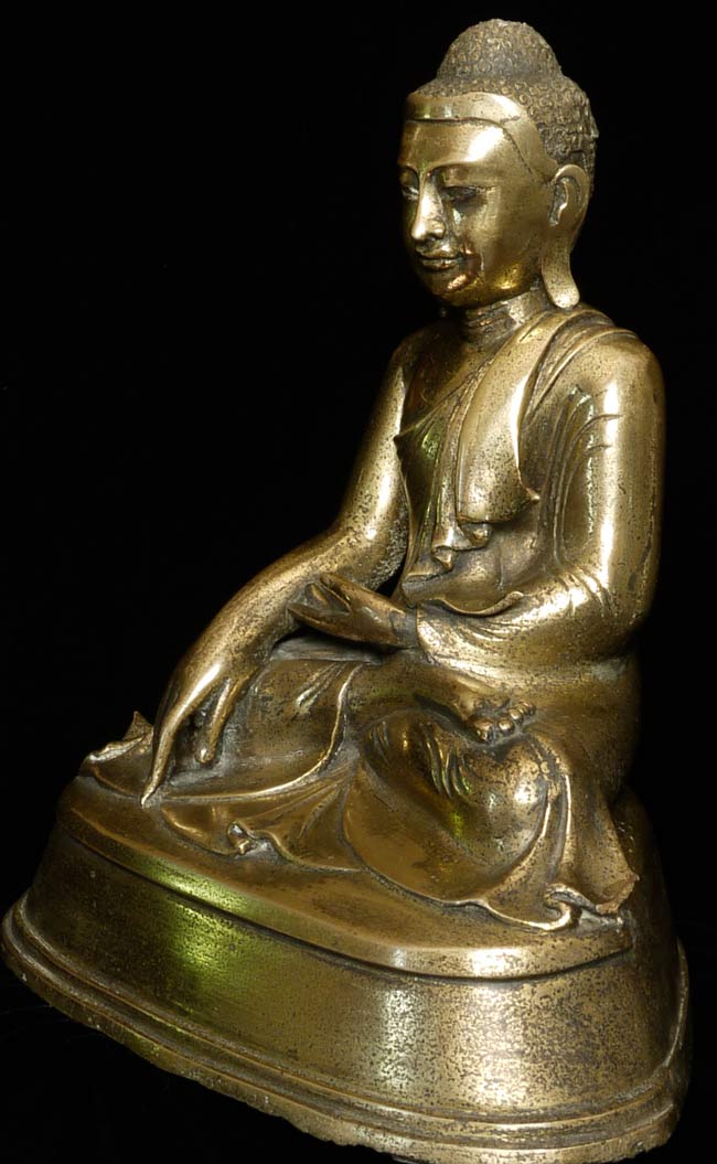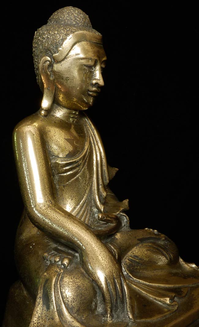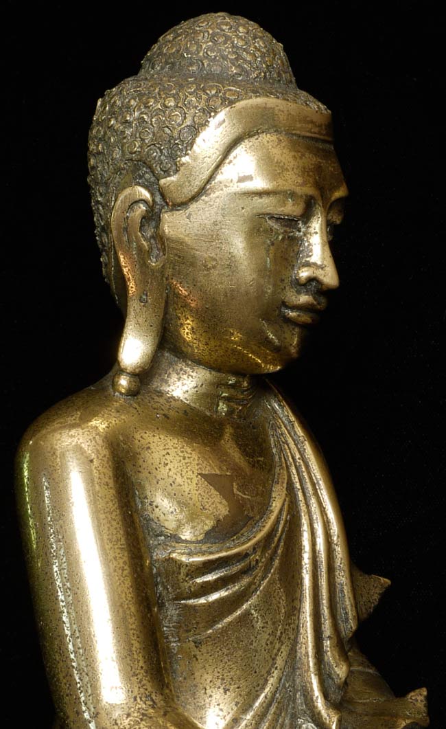 19thC Burmese Mandalay style bronze Buddha. Loss to the robe on the lower left side. Nice example. Sits 10" tall, bottom measures 9" x 6.25", and heavy.