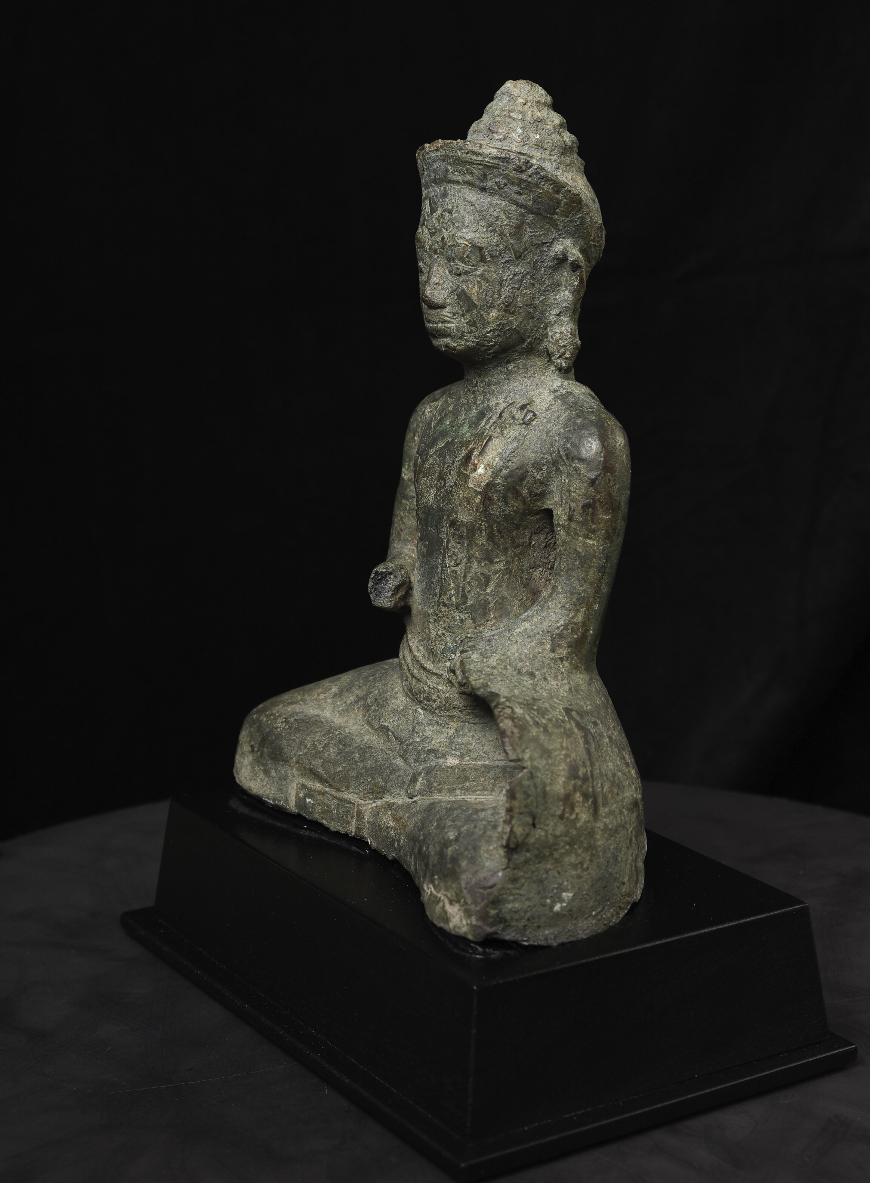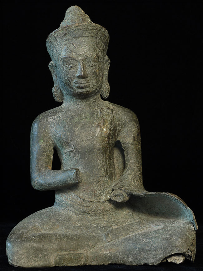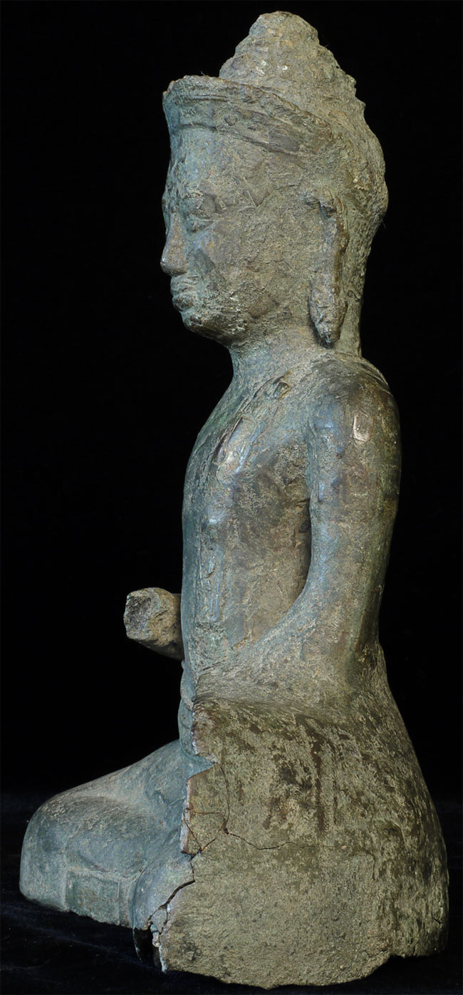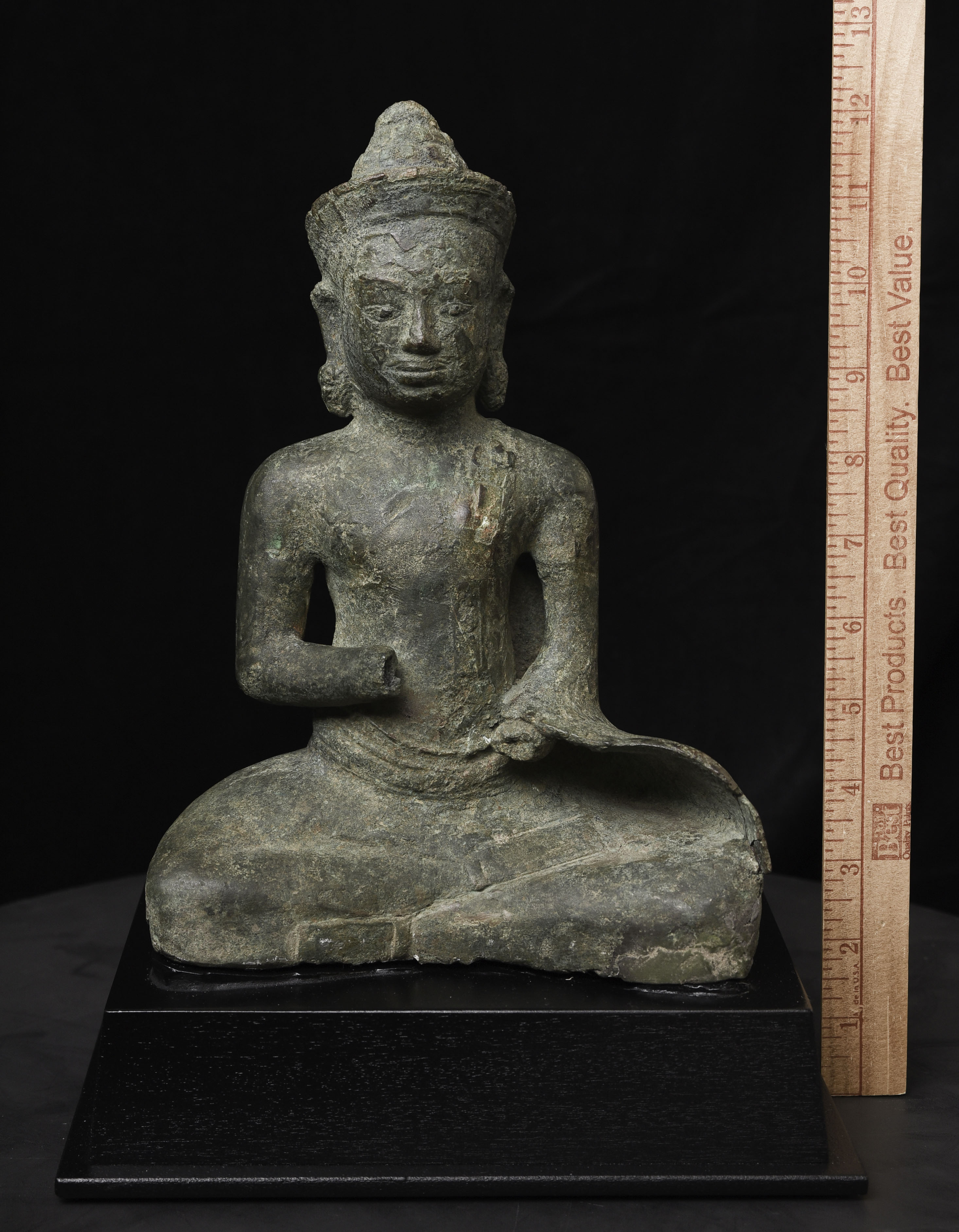 Large 11/12thC Cambodian Buddha. Loss of hands and original base. Other damage/loss as seen in the photos. The height of bronze alone is 9 7/8 inches tall not including the newly made custom museum-style base. (Please see the new photos that show the Buddha on the base).
