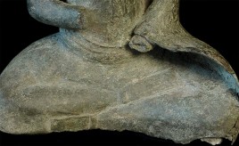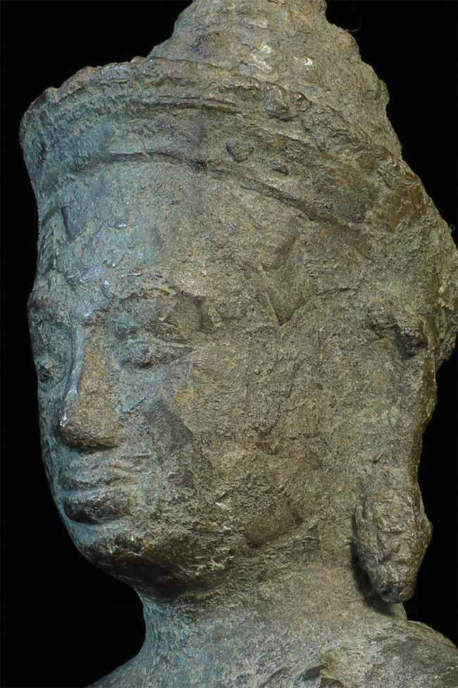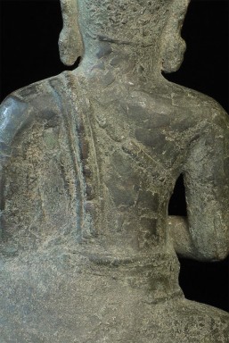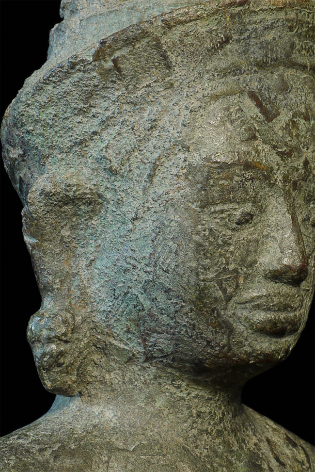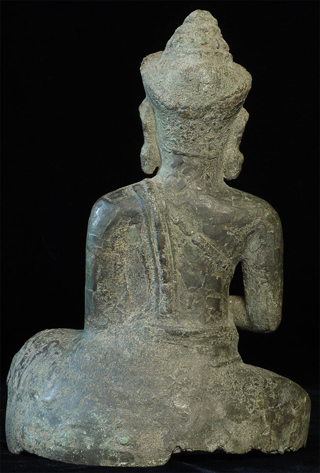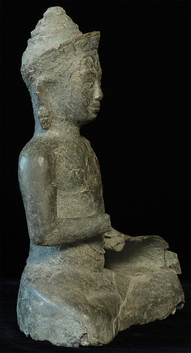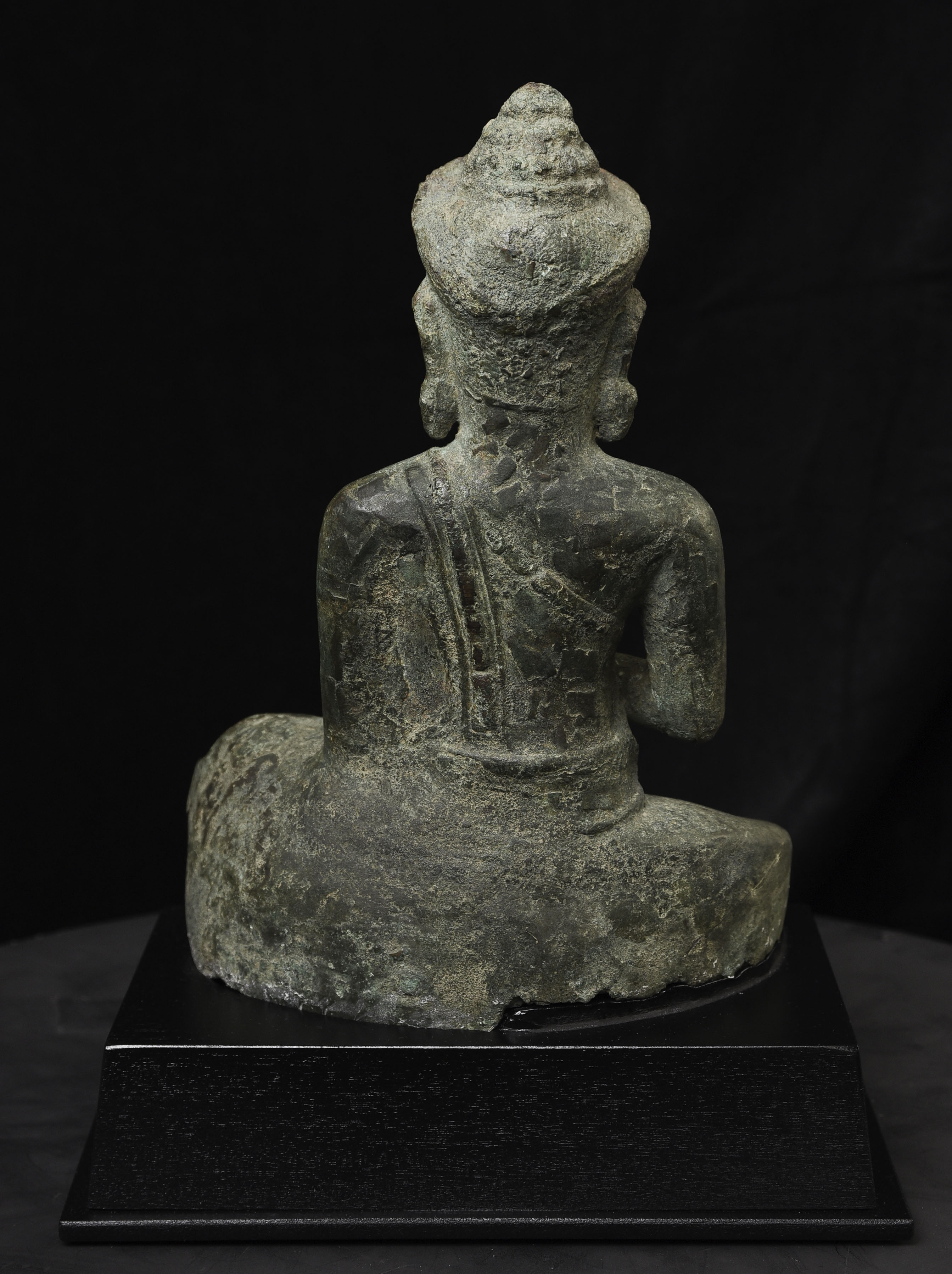 Large 11/12thC Cambodian Buddha. Loss of hands and original base. Other damage/loss as seen in the photos. The height of bronze alone is 9 7/8 inches tall not including the newly made custom museum-style base. (Please see the new photos that show the Buddha on the base).