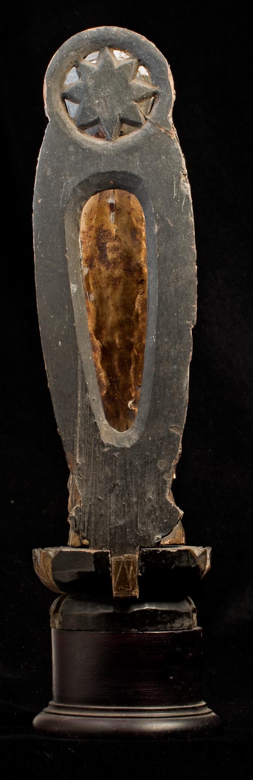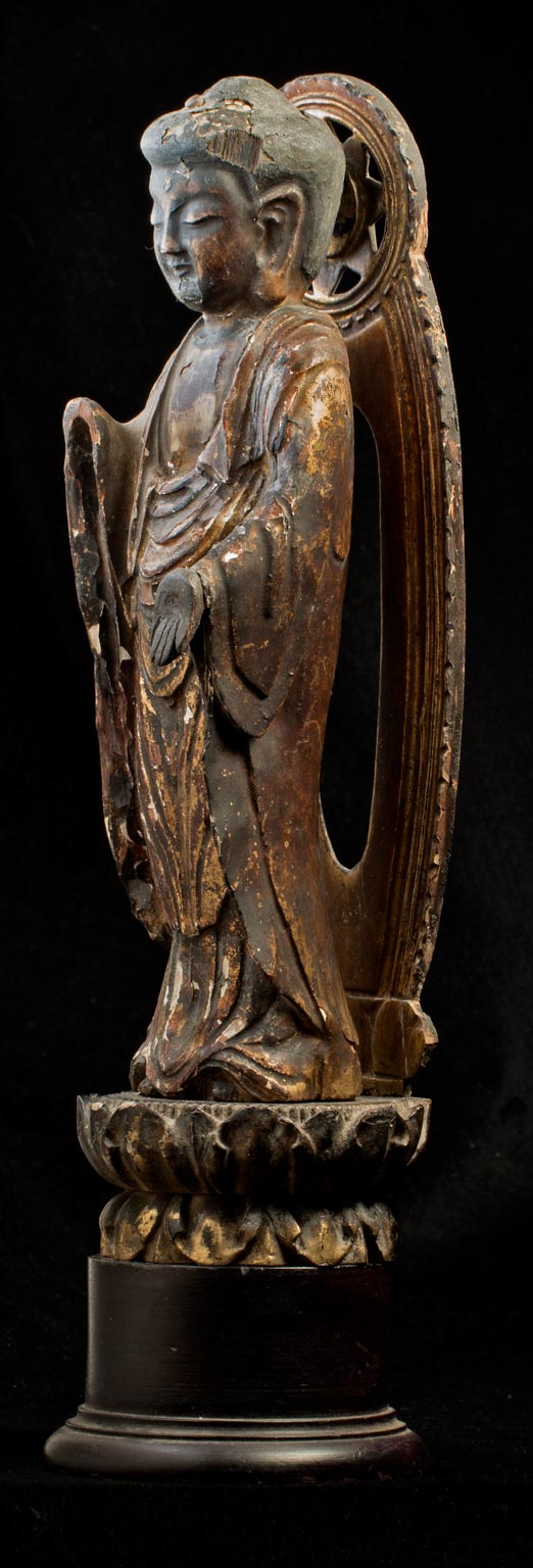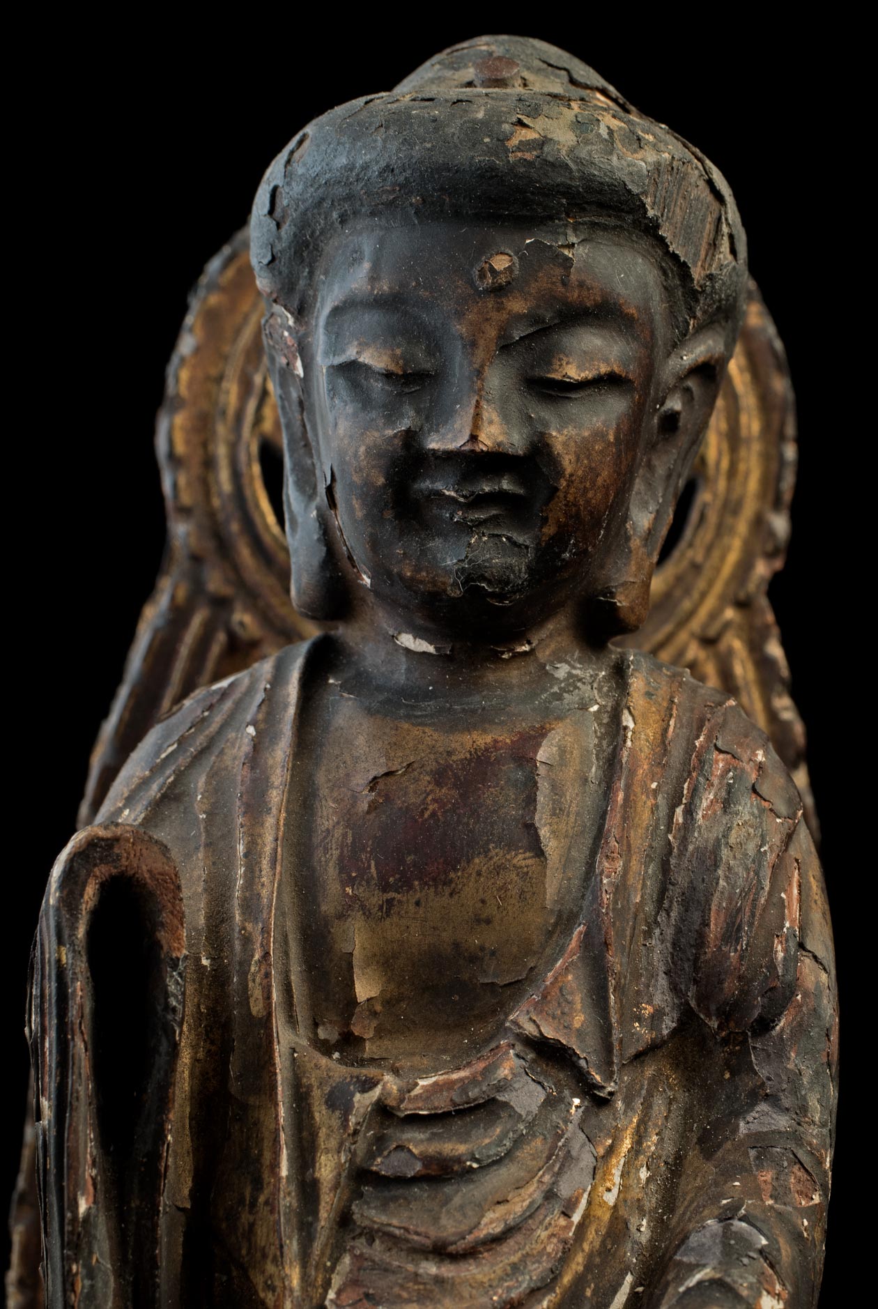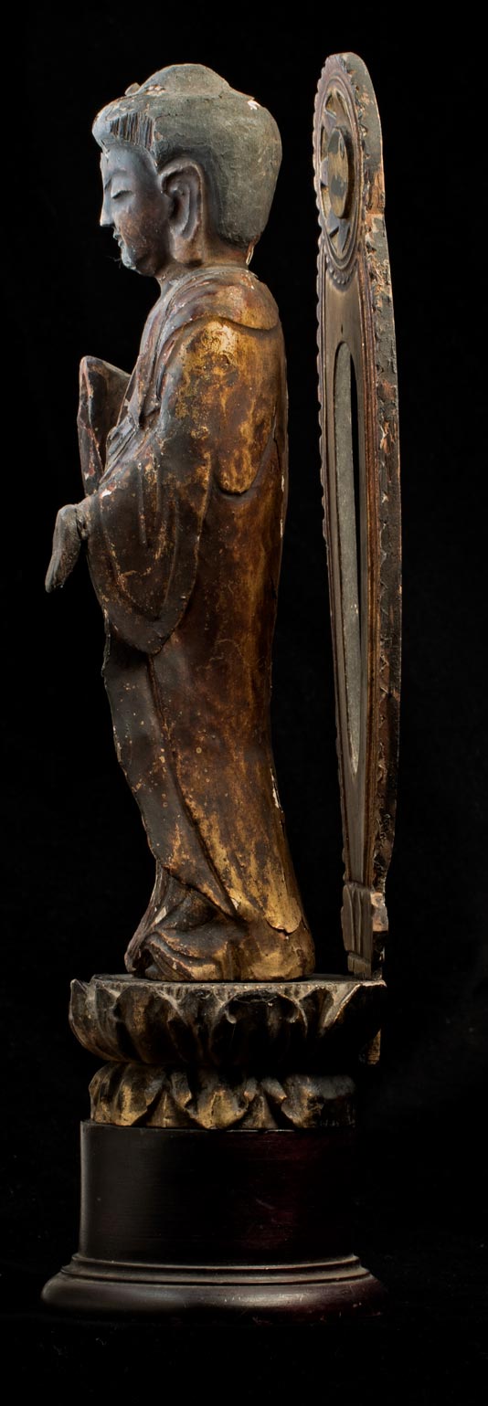 Japanese wood Buddha with very good age-likely 400 years old or older. Condition as shown in photos.This piece measures 11 1/4 inches tall x 2 1/2 inches wide x 3 inches deep. Great face.