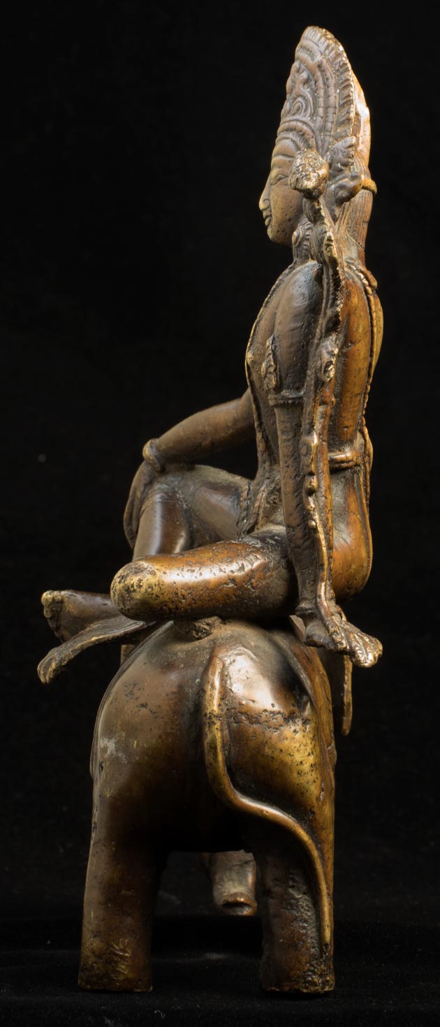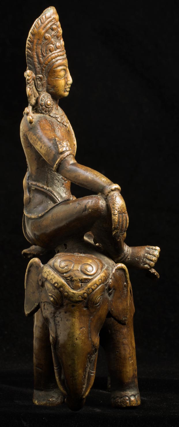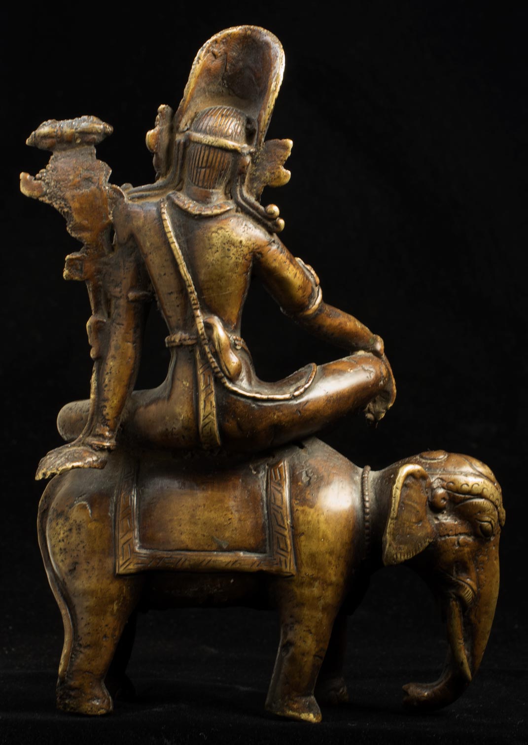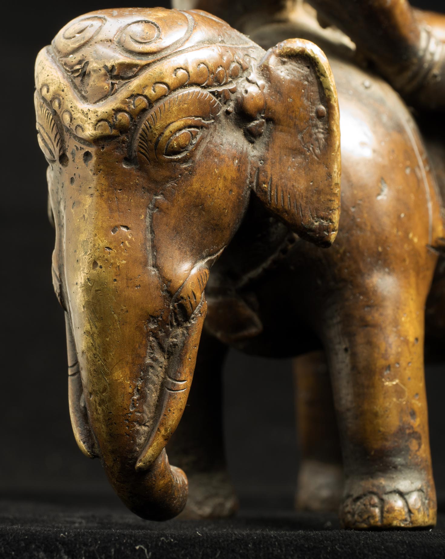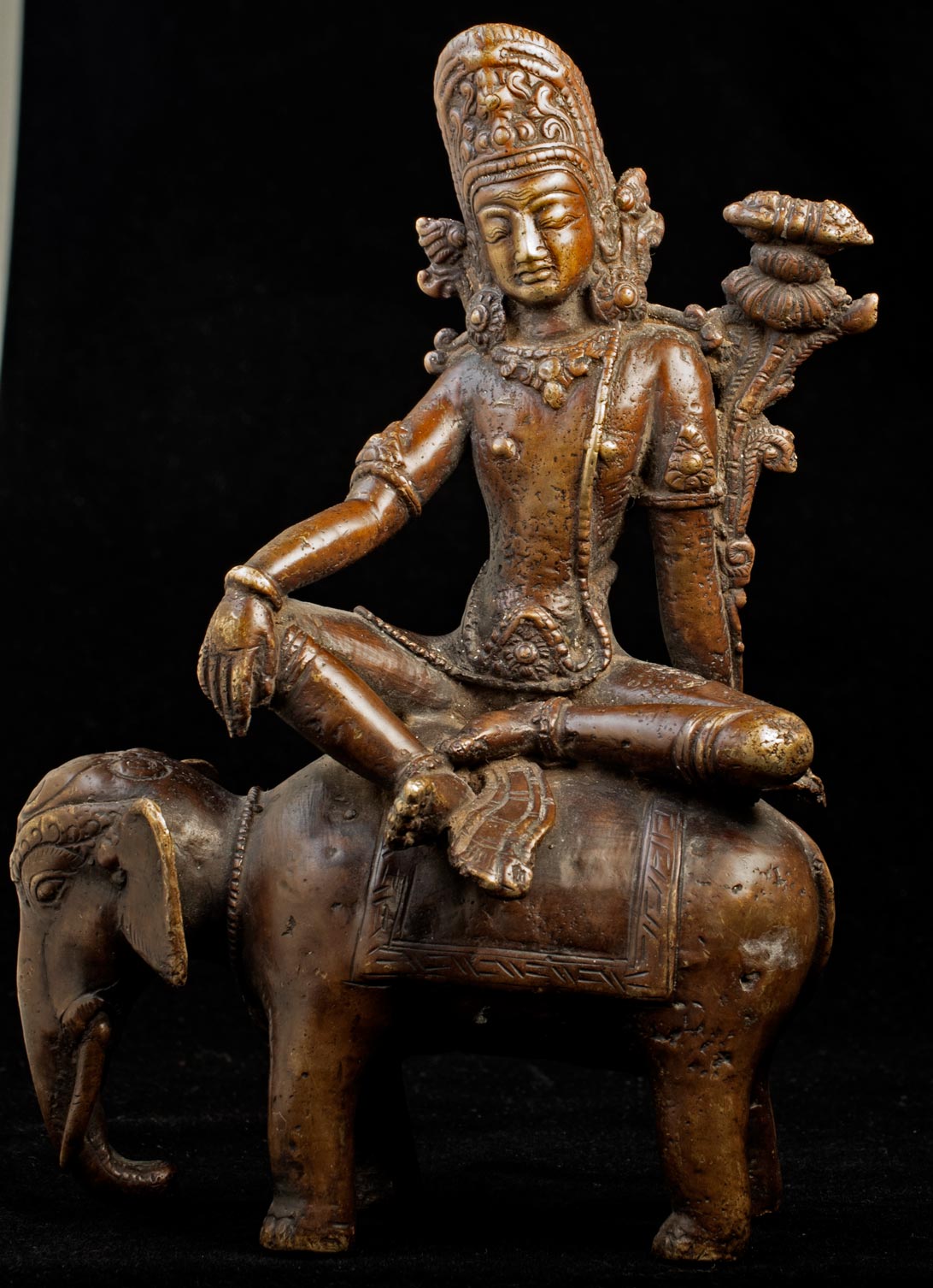 This is a 17 /18 century bronze from Nepal. Rare type- I've only seen comparable examples in books, or modern examples trying to emulate the authentic old examples like this one. It has a superb face, and sits on a very sweet elephant. This measures 7 1/2 inches tall x 5 inches across x 2 inches deep.