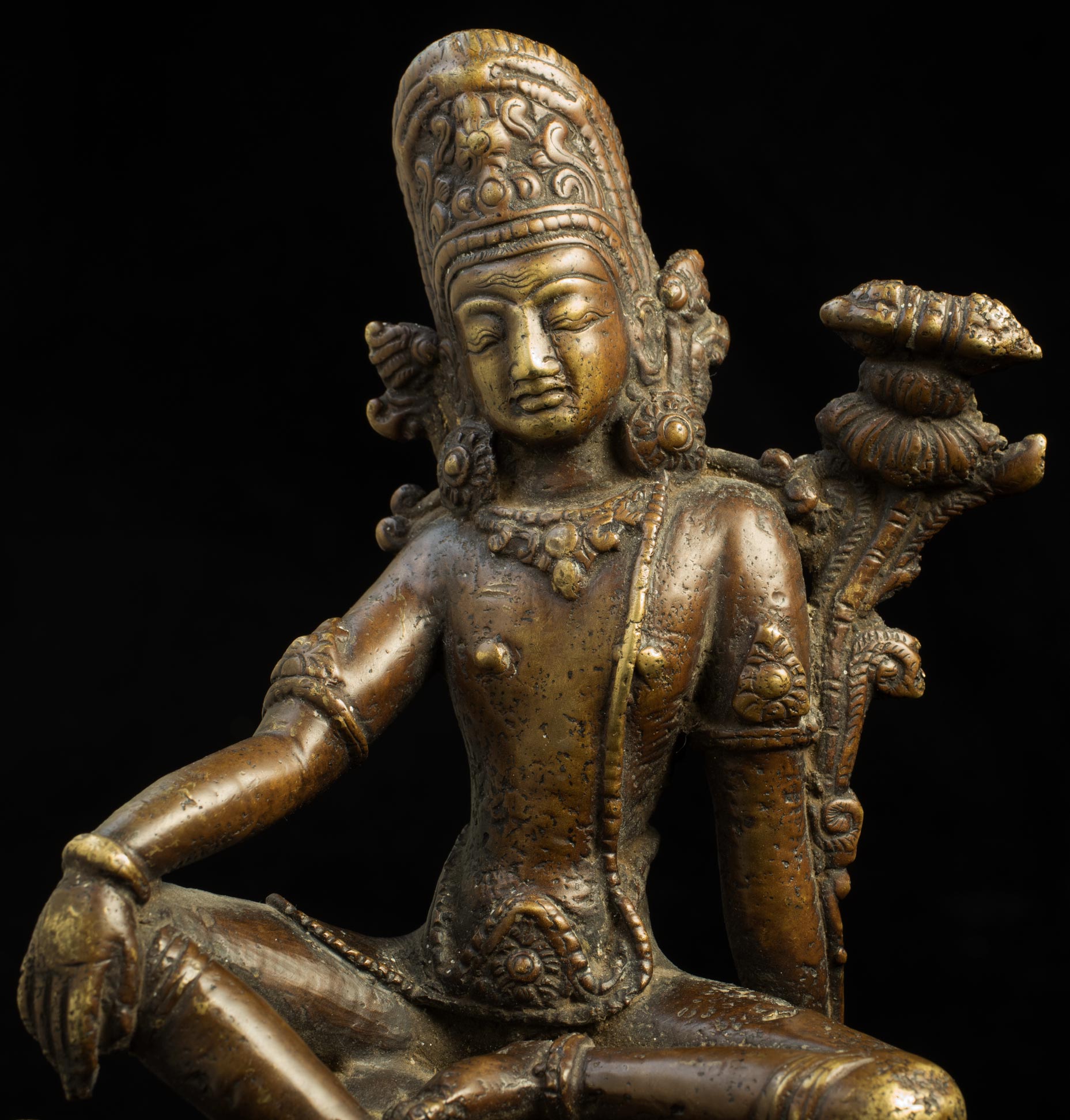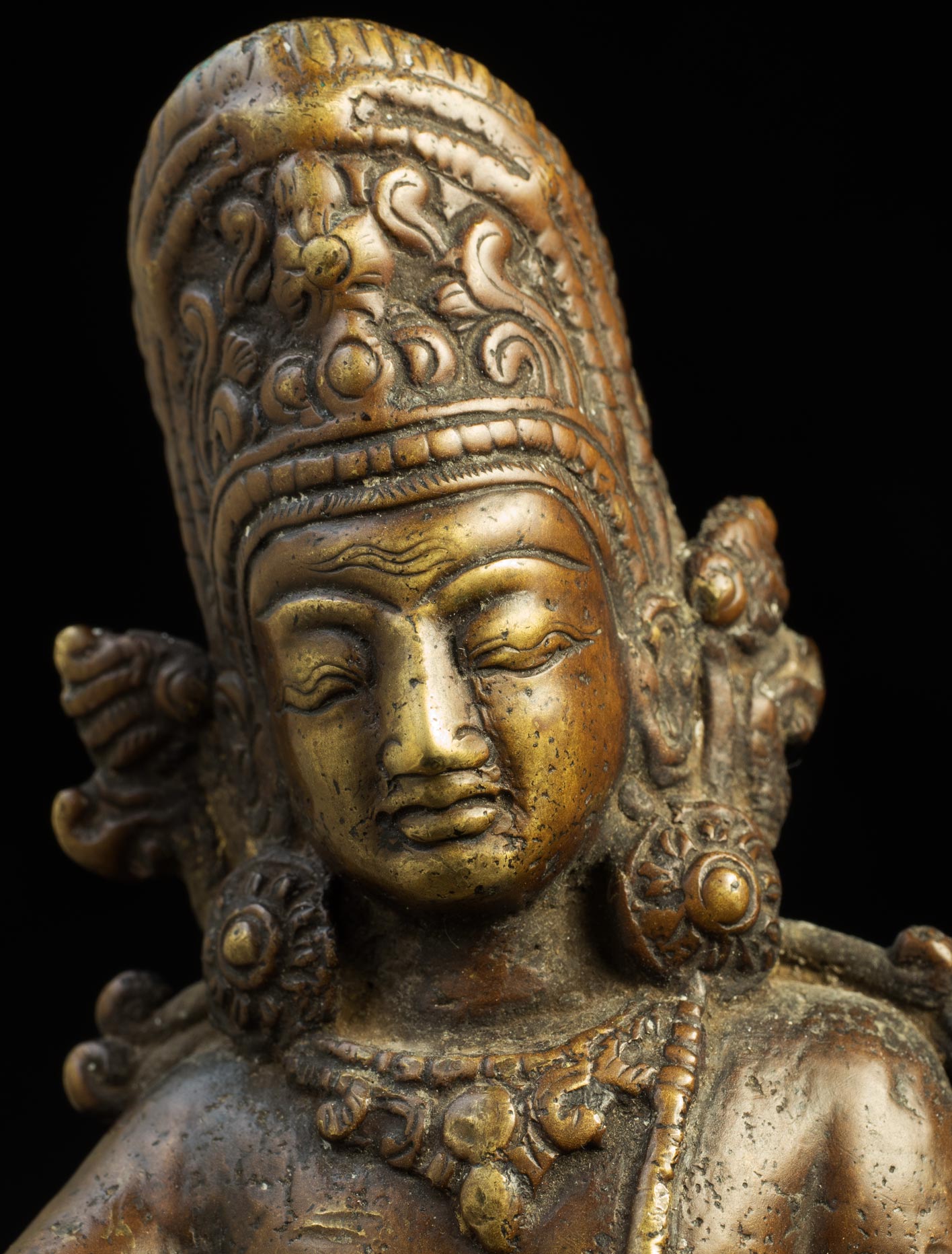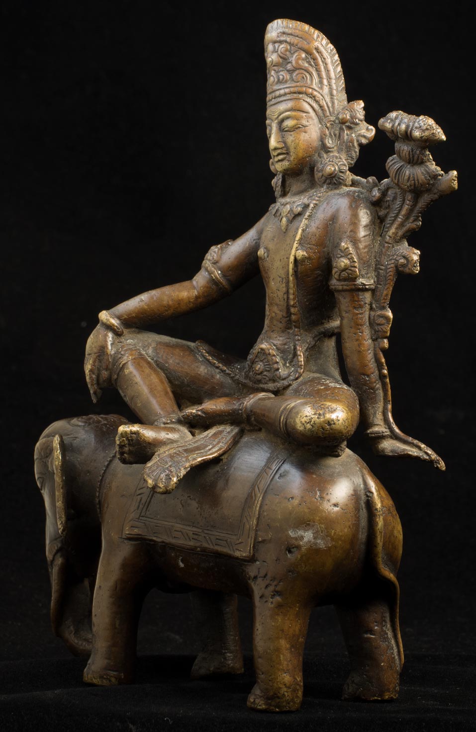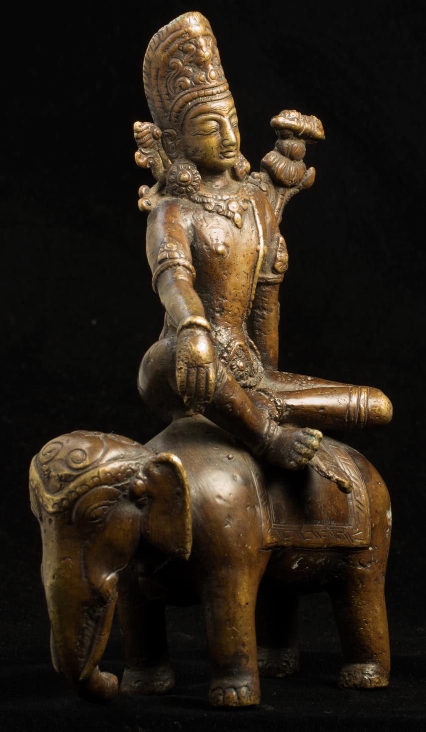 This is a 17 /18 century bronze from Nepal. Rare type- I've only seen comparable examples in books, or modern examples trying to emulate the authentic old examples like this one. It has a superb face, and sits on a very sweet elephant. This measures 7 1/2 inches tall x 5 inches across x 2 inches deep.