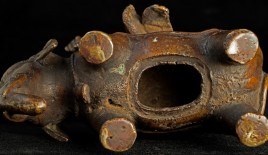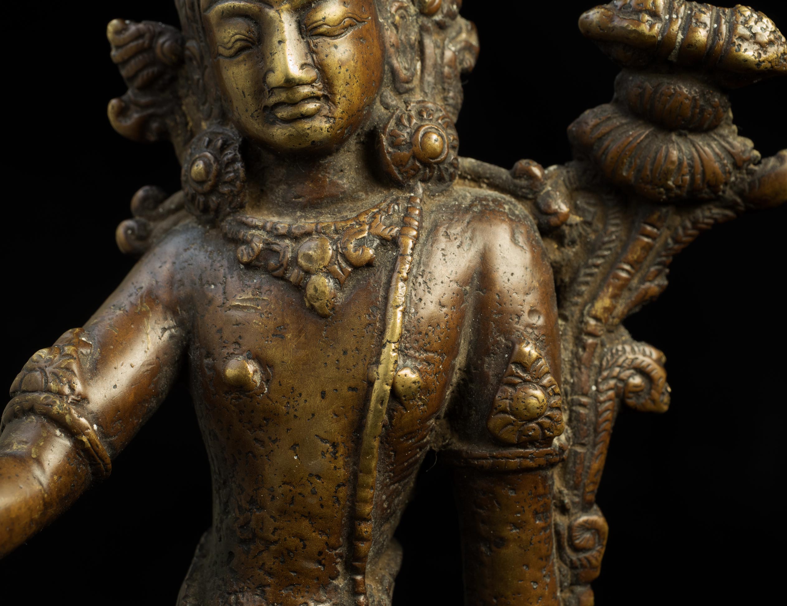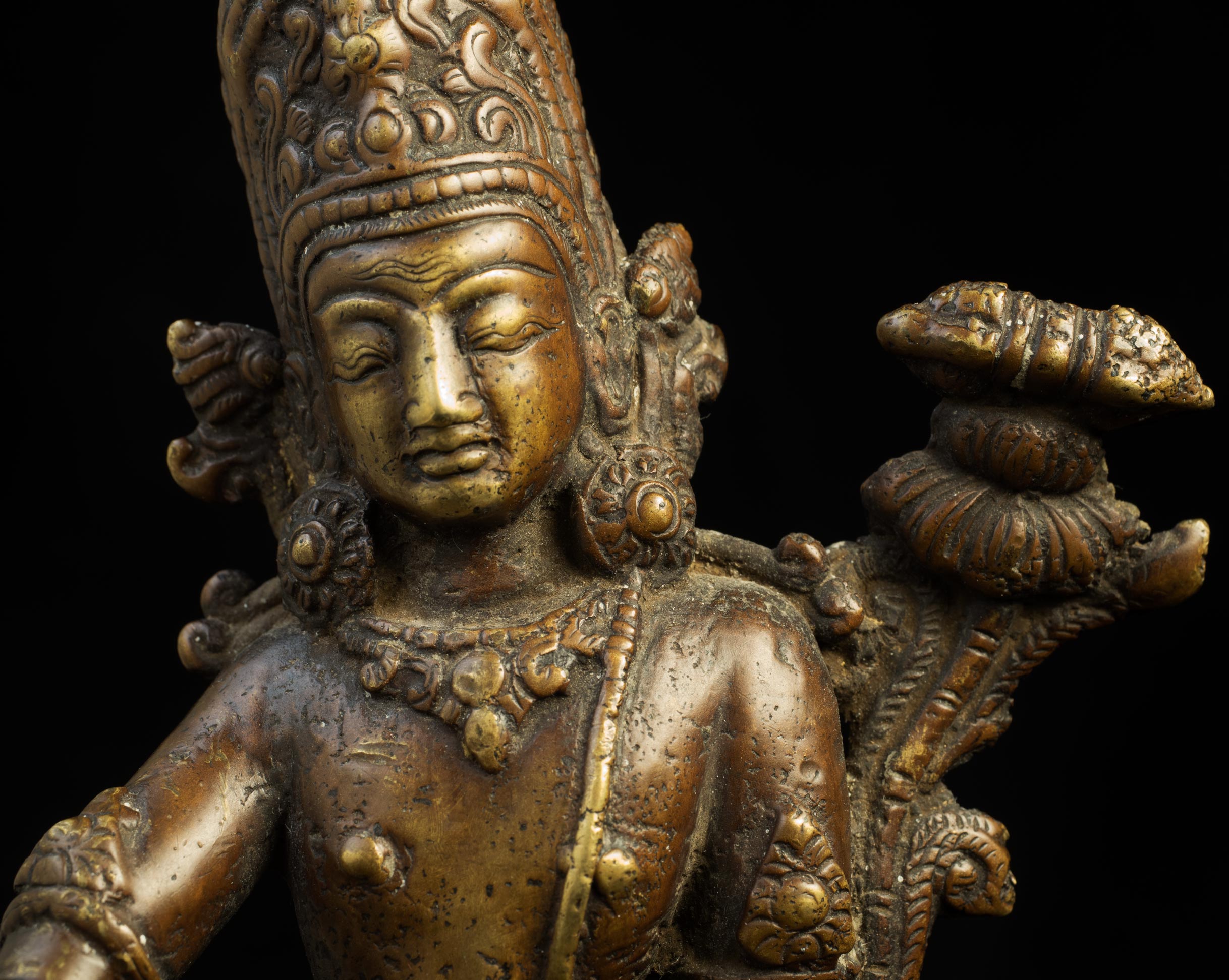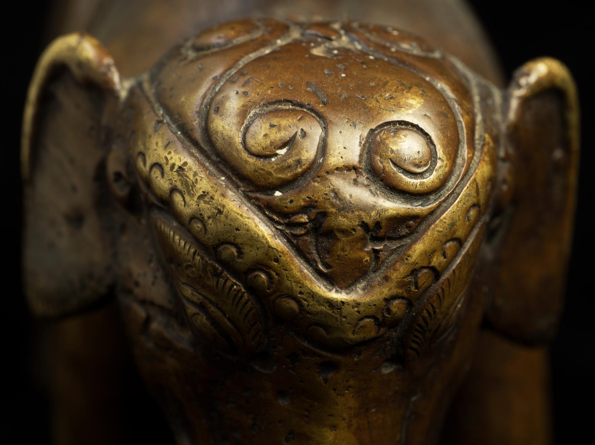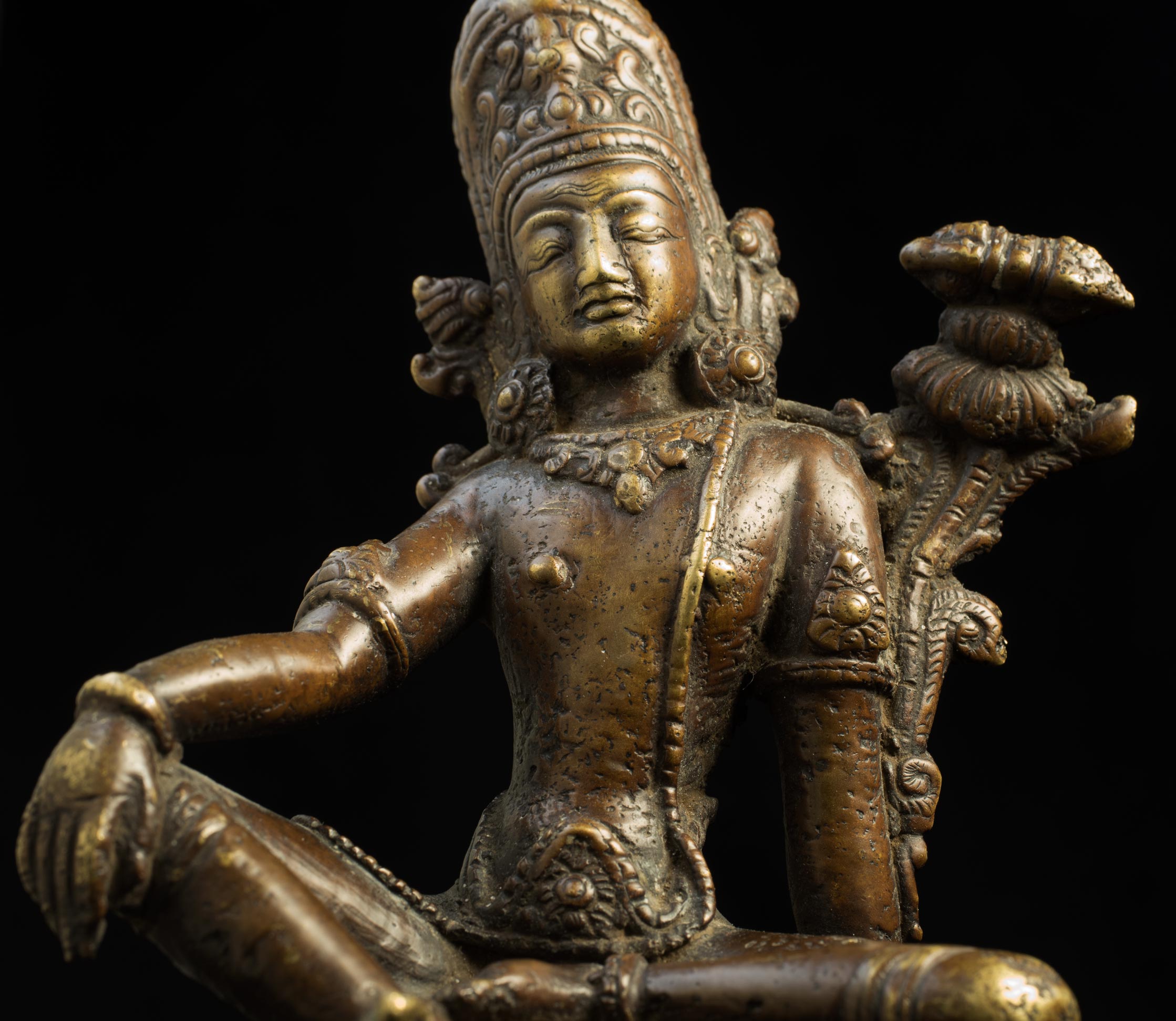 This is a 17 /18 century bronze from Nepal. Rare type- I've only seen comparable examples in books, or modern examples trying to emulate the authentic old examples like this one. It has a superb face, and sits on a very sweet elephant. This measures 7 1/2 inches tall x 5 inches across x 2 inches deep.