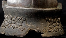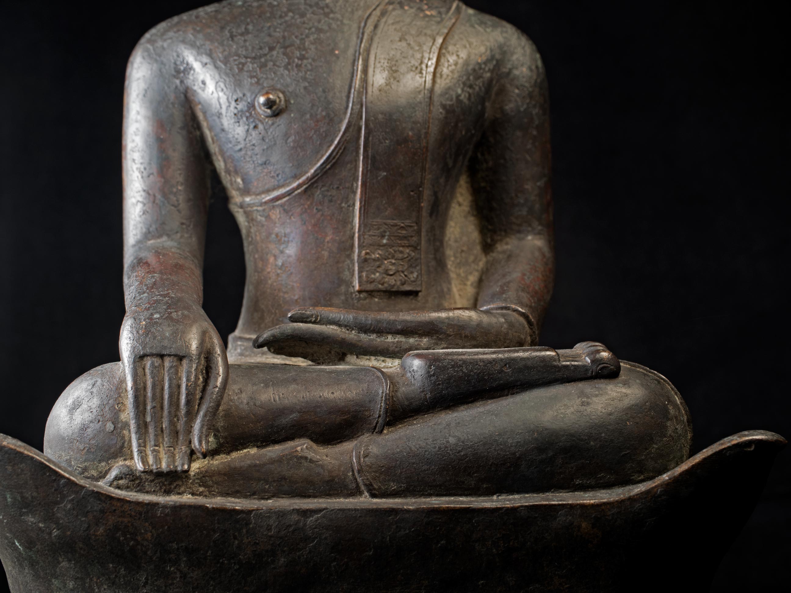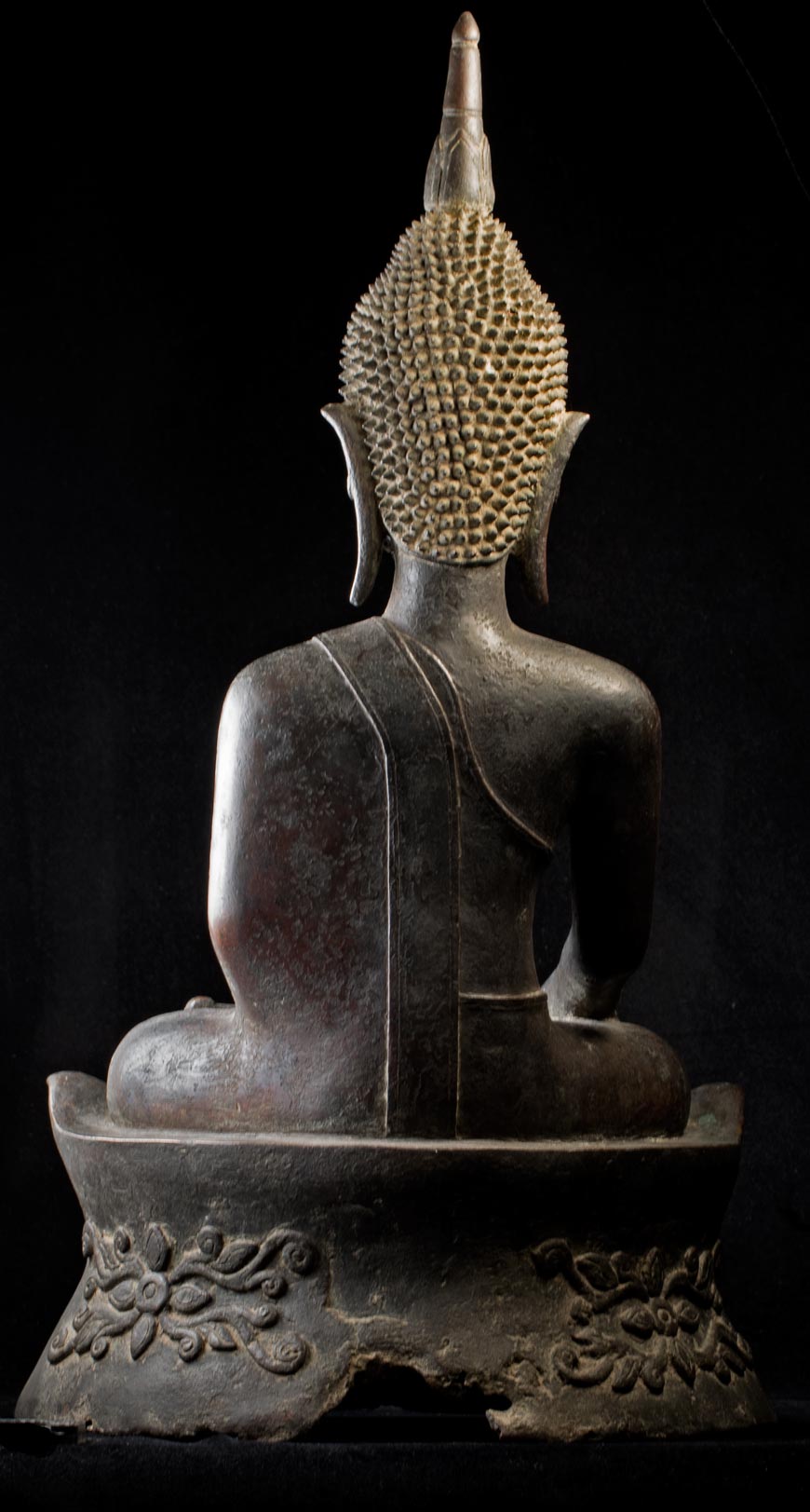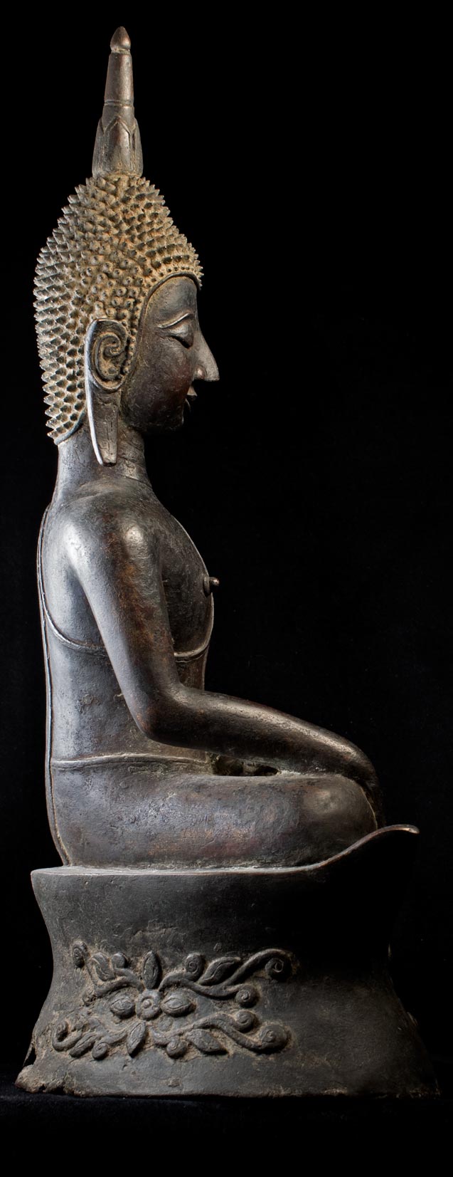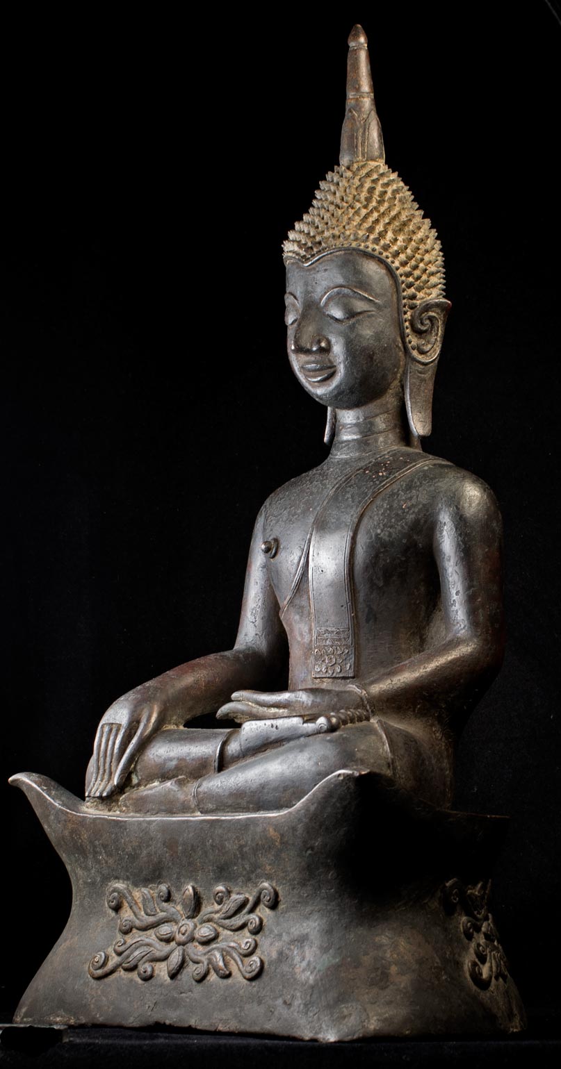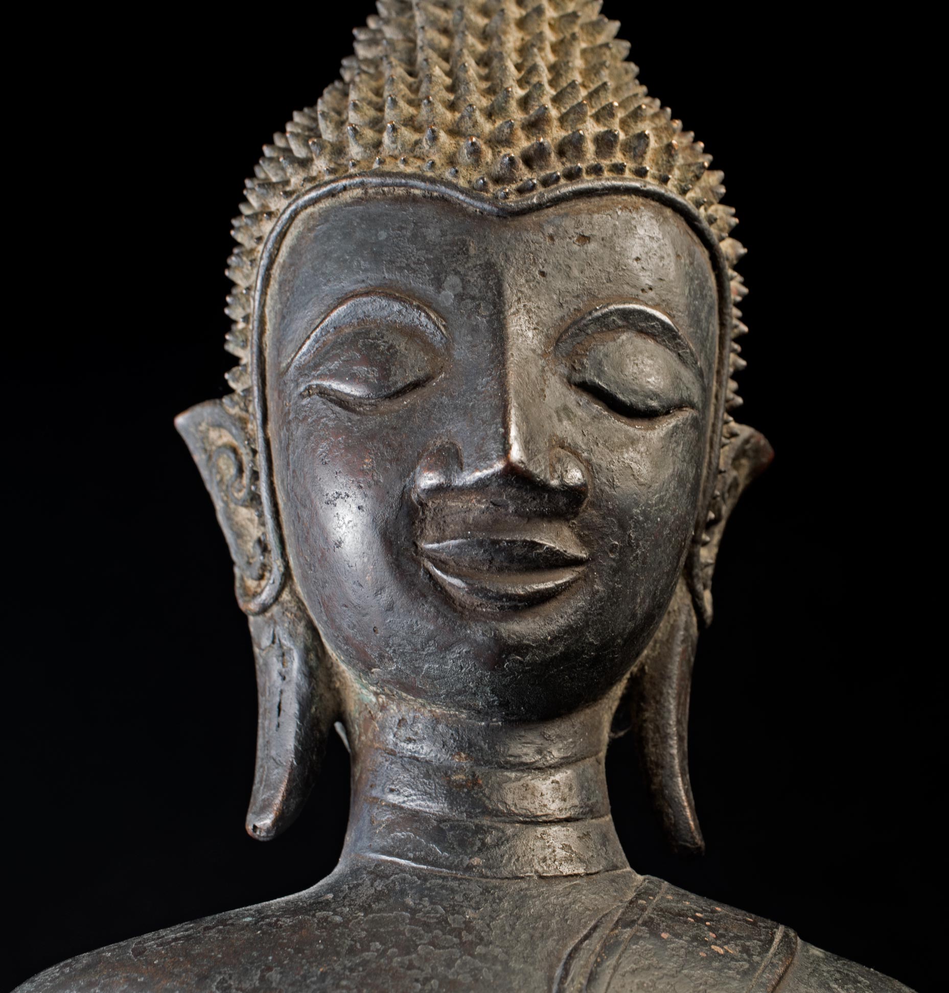 Extremely fine 17th century laos bronze buddha. From the lifelong collection of a world traveller and international rug dealer. I purchase five lao buddha from his estate, all of superb quality - several of which will be listed in concert with this one. Everything about it is in perfect balance from the very sweet face to the near perfect patina to the exquisite base. It is the finest example of its type I have ever offered for sale. Measures 16 1/2 inches tall x 8 1/2 inches across x 5 inches deep.