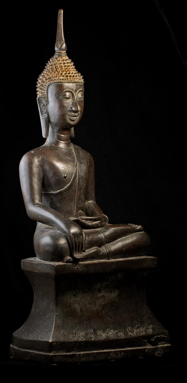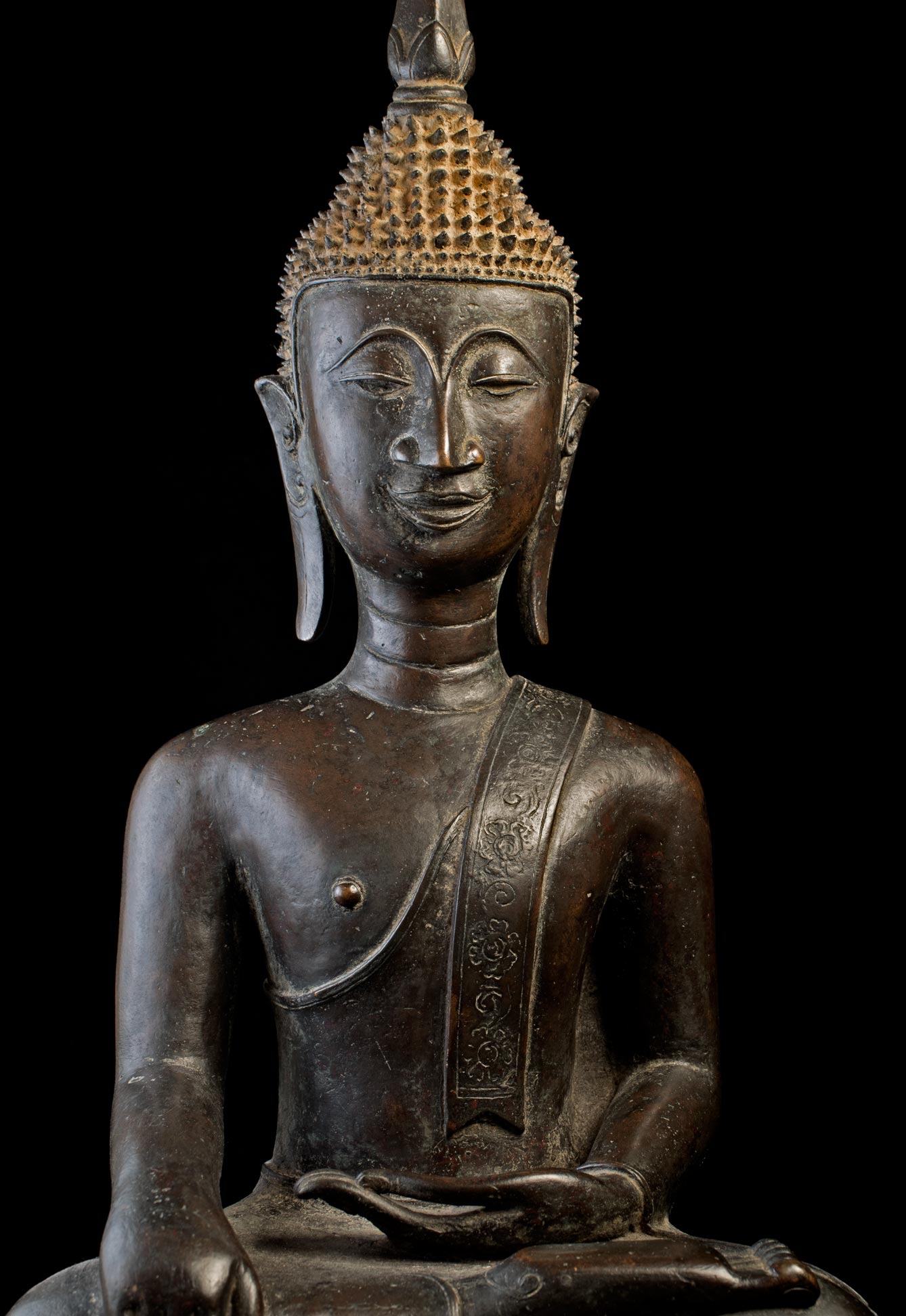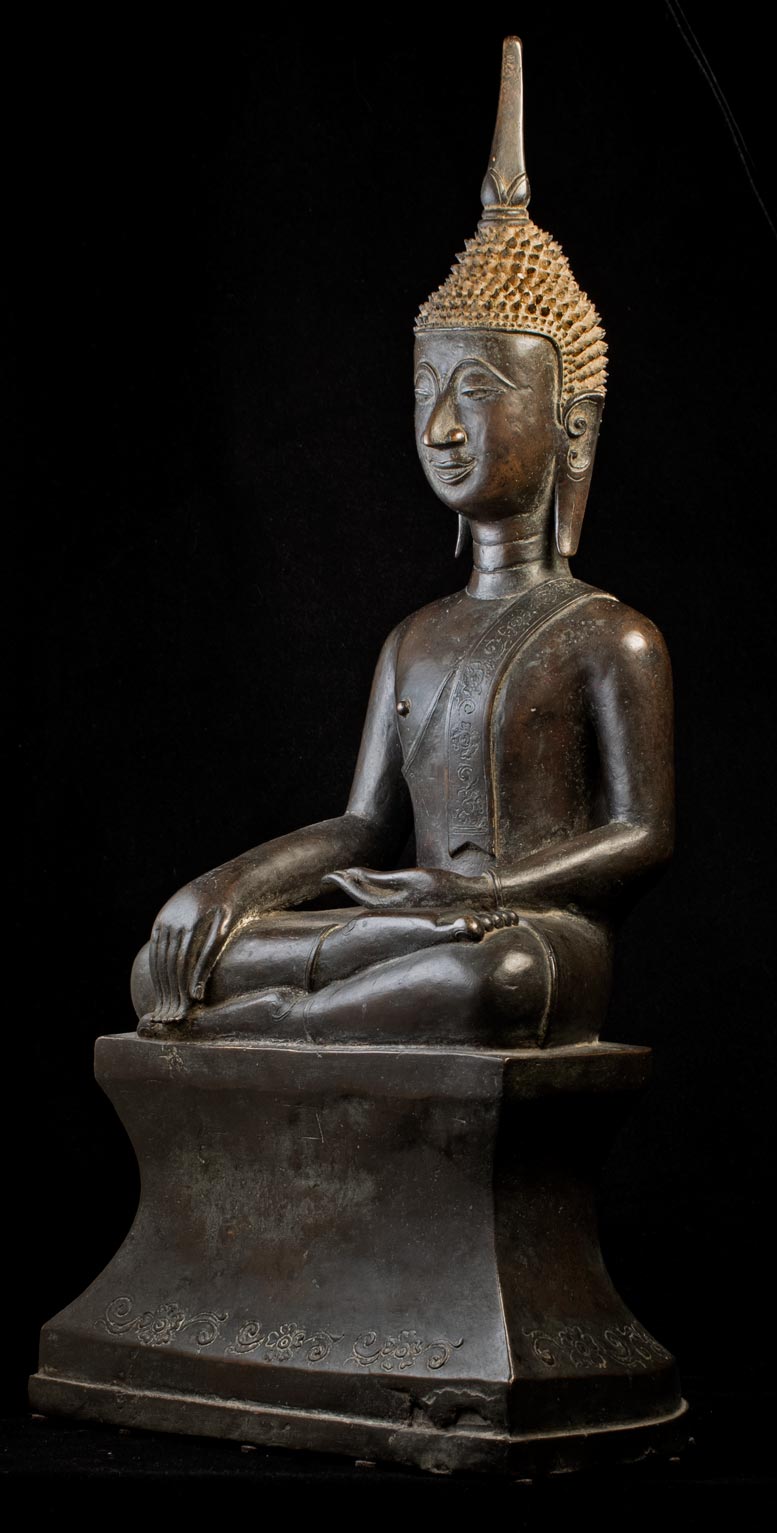 Extremely fine 16-17th century laos bronze buddha. From the lifelong collection of a world traveller and international rug dealer. I purchase five lao buddha from his estate, all of superb quality - several of which will be listed in concert with this one. Everything about it is in perfect balance from the very sweet face to the near perfect patina to the exquisite base. It is the finest example of its type I have ever offered for sale. Measures 18 1/2 inches tall x 8 1/2 inches across x 6 1/2 inches deep.