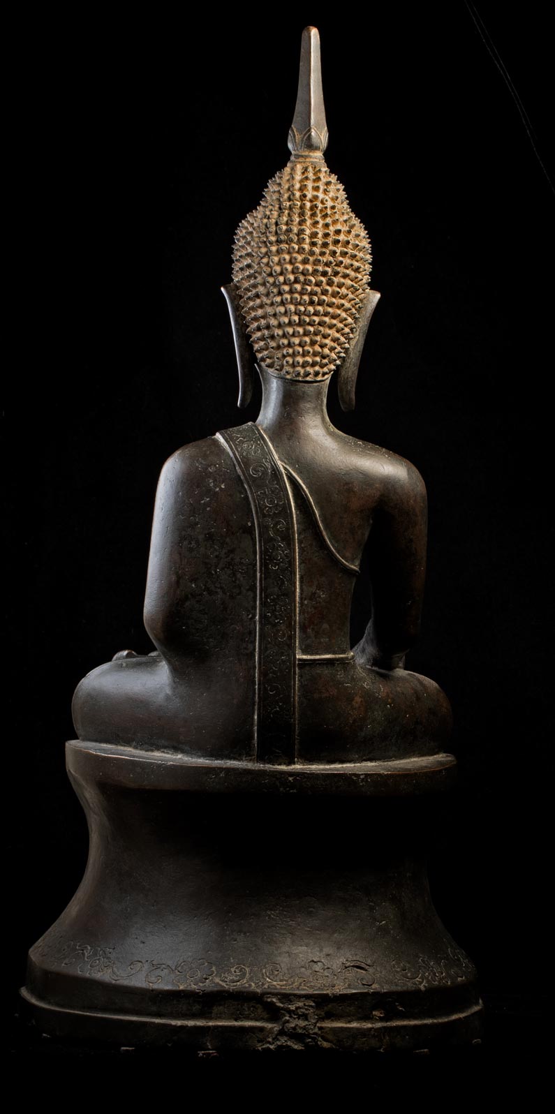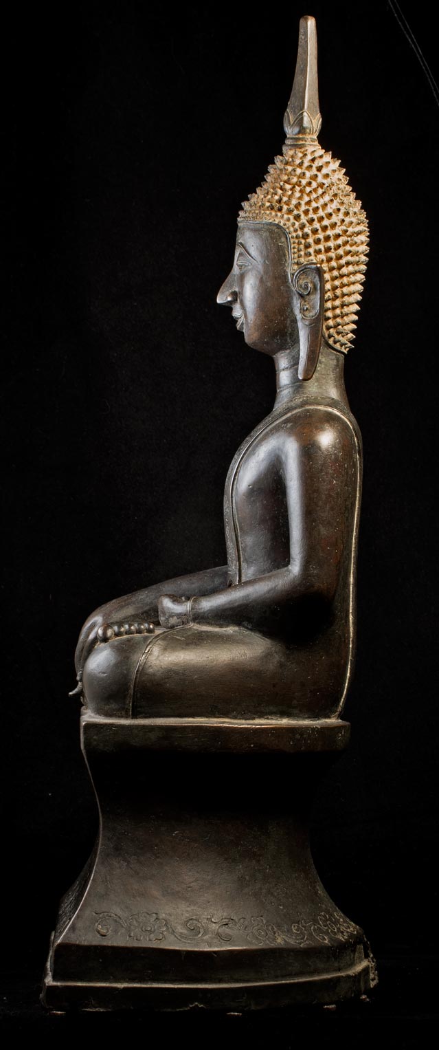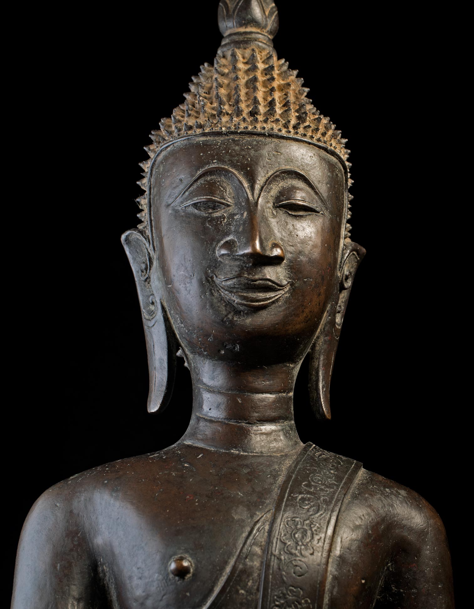 Extremely fine 16-17th century laos bronze buddha. From the lifelong collection of a world traveller and international rug dealer. I purchase five lao buddha from his estate, all of superb quality - several of which will be listed in concert with this one. Everything about it is in perfect balance from the very sweet face to the near perfect patina to the exquisite base. It is the finest example of its type I have ever offered for sale. Measures 18 1/2 inches tall x 8 1/2 inches across x 6 1/2 inches deep.