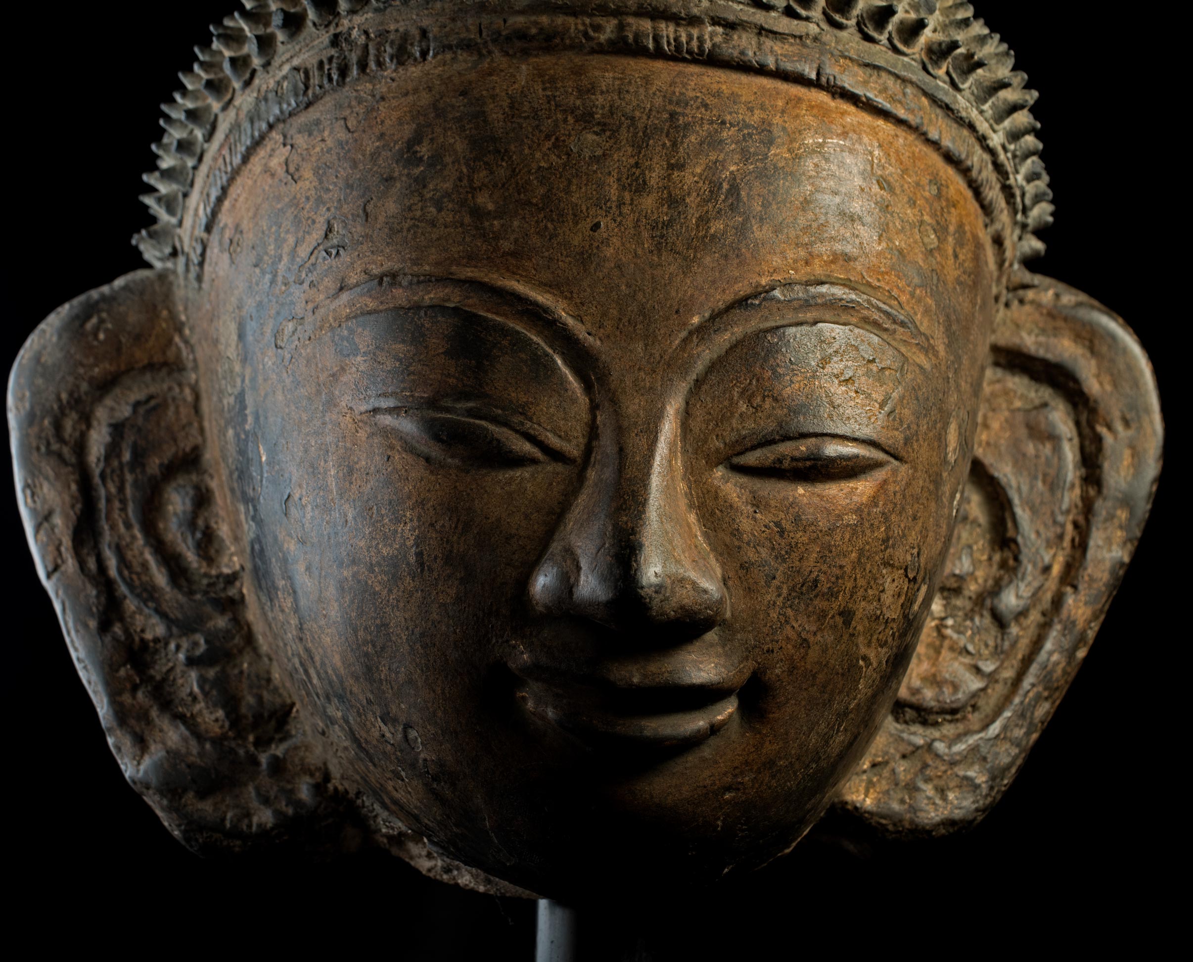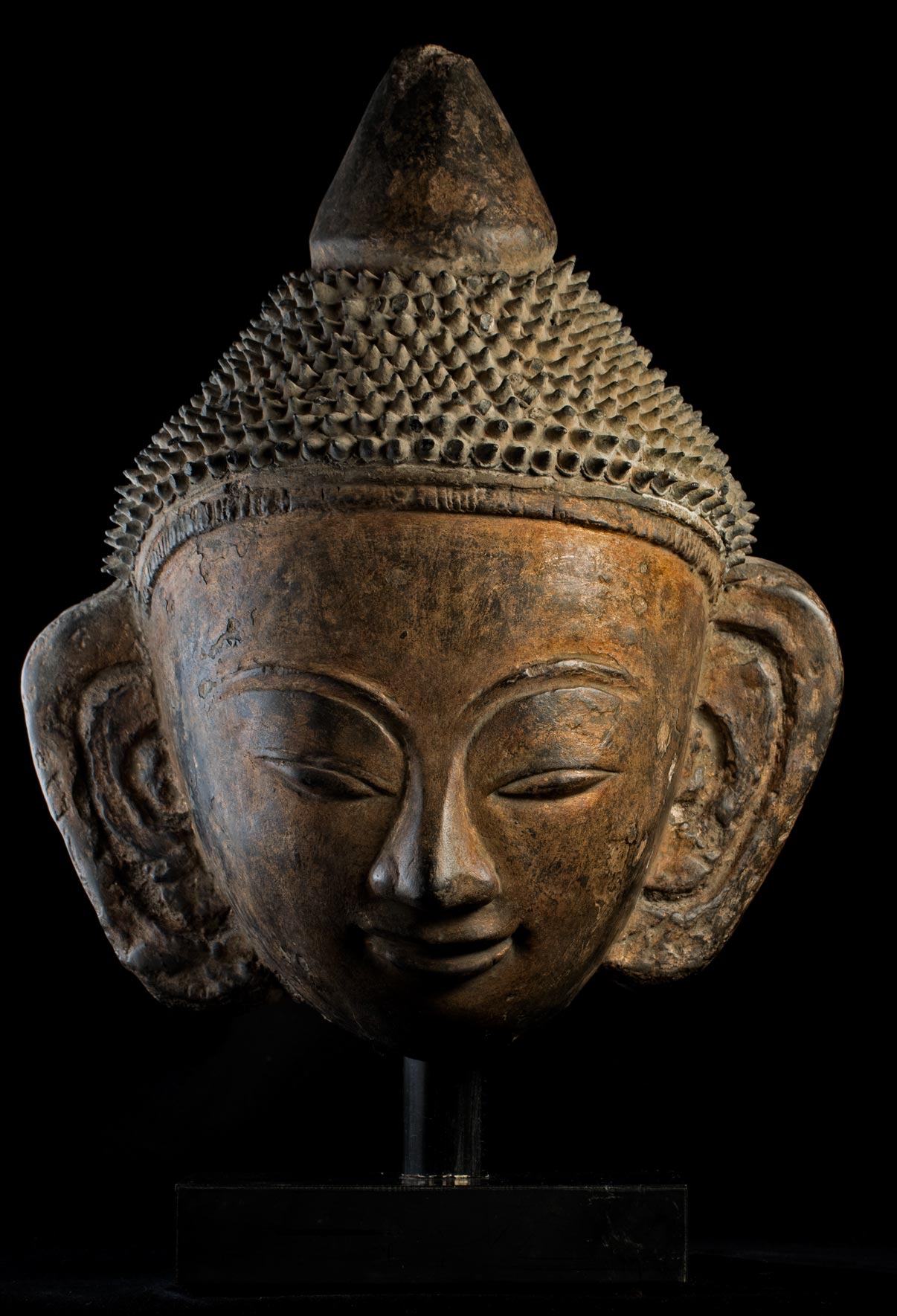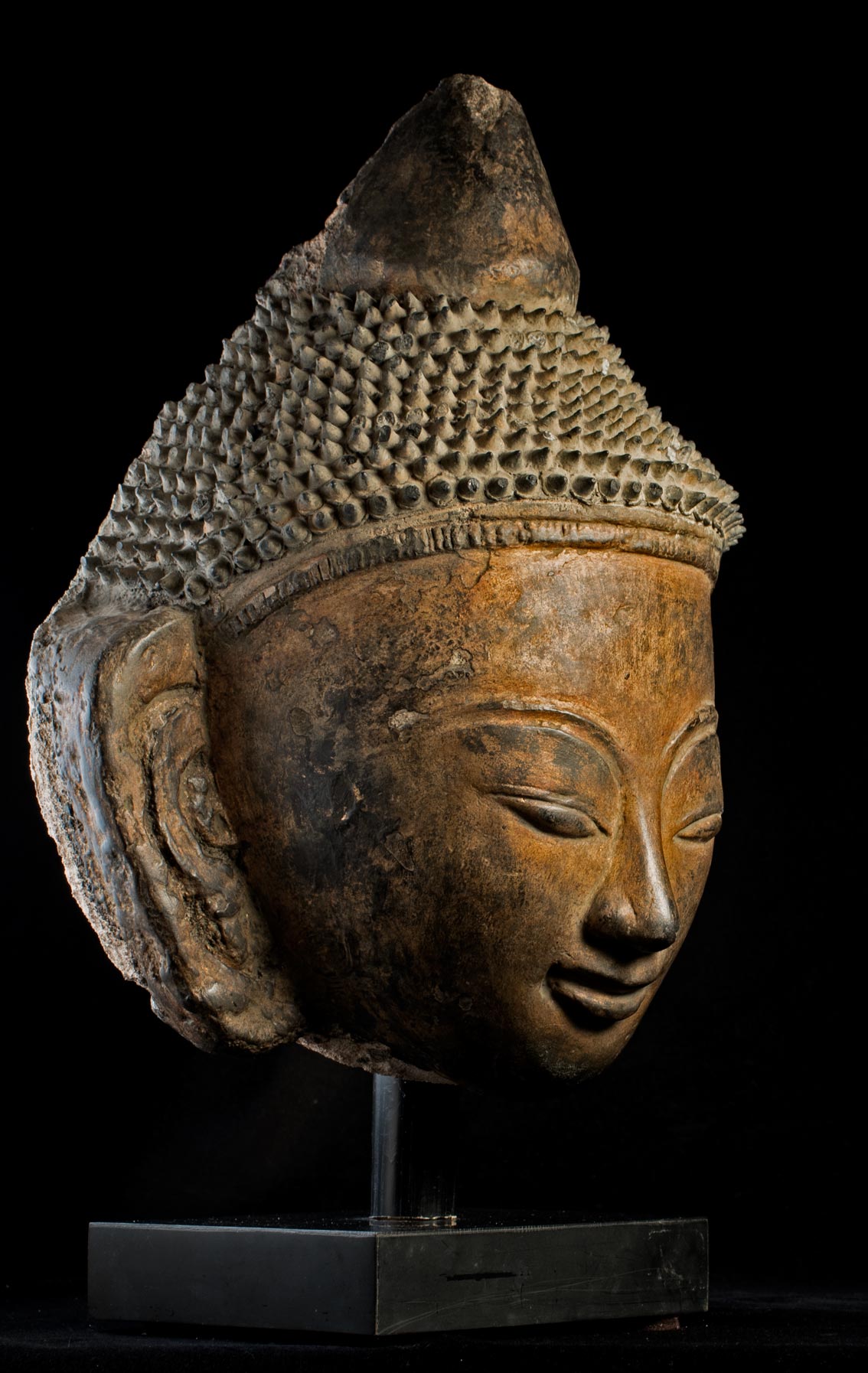 This piece is a 15-16th Century Burmese Ava style buddha head that part of a buddha that was built into the wall of a temple. If you look at the photo of the back of the head you will see that the center is made of ancient brick. The brick is then covered in stucco that is formed into the shape of the buddha. The stucco is then covered with black lacquer and finally the face is gilded. It is remarkable that the original lacquer and gilding had remained in perfect condition. The Ava period, in my opinion, produced some of the most beautiful buddha faces of all. They have round fleshy cheeks that are strongly influenced by the Ming style, only they are more accessible and friendly. It is extremely rare to find one as large and as beautiful and in as good condition as this one is. Measures 15 inches tall on its base, the base measures 1 1/4 inches tall x 6 inches across x 4/12 inches deep, the piece measures 12 inches tall x 9 inches across x 5 1/2 inches deep.