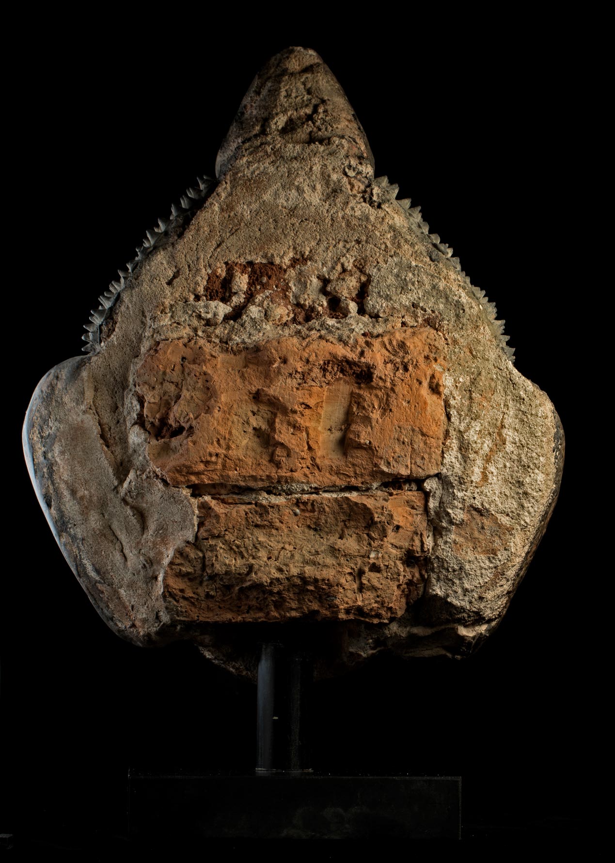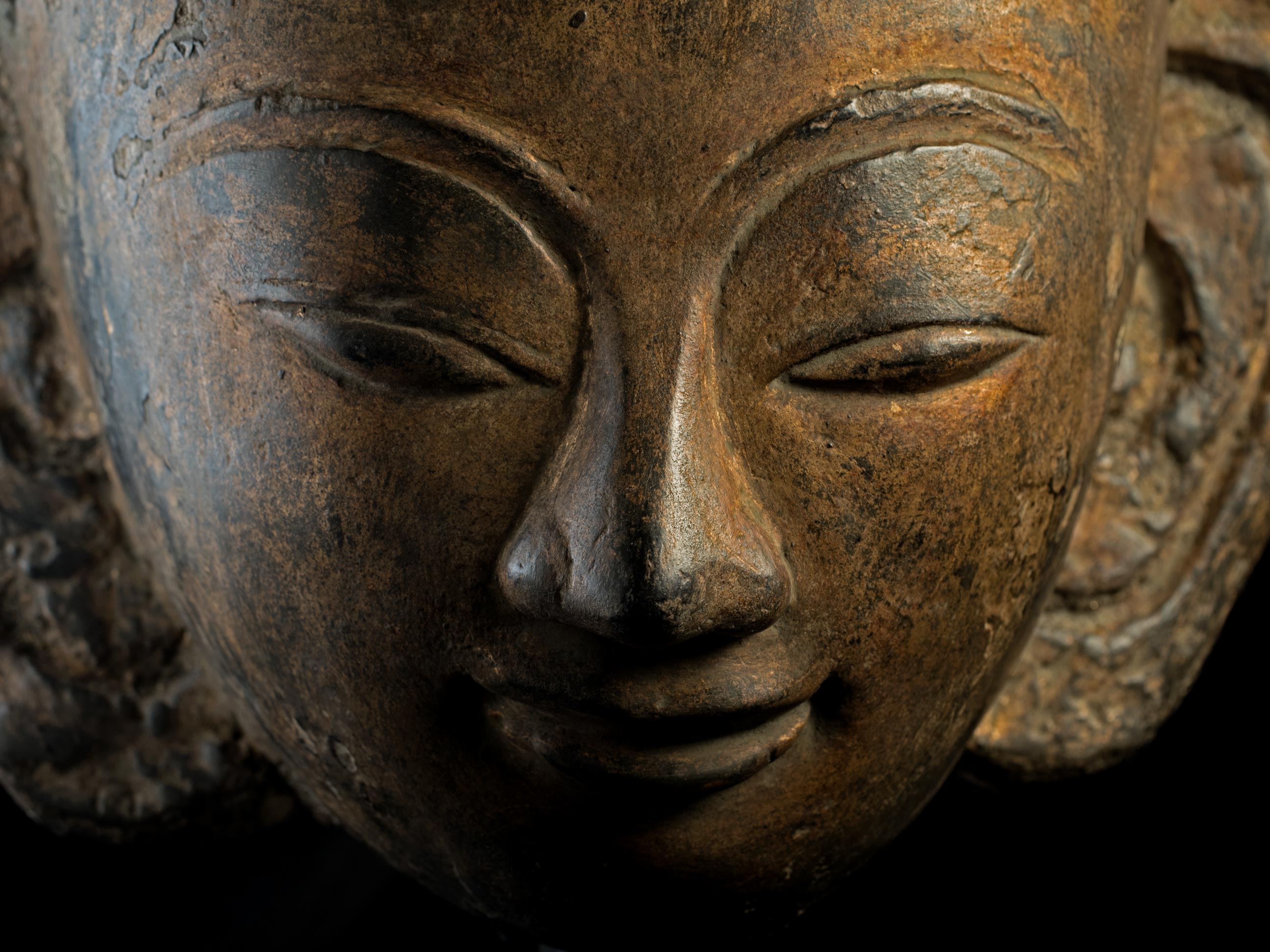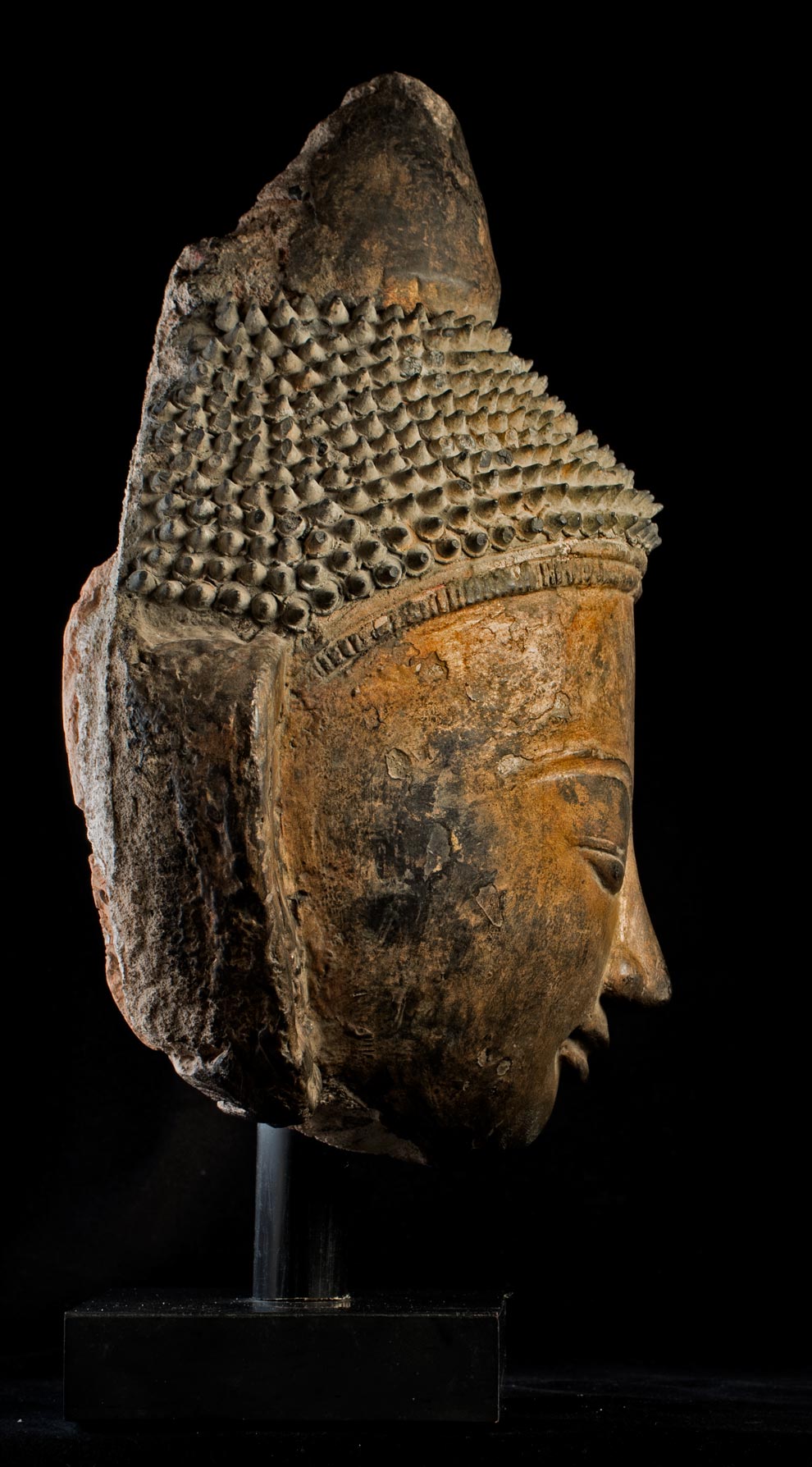 This piece is a 15-16th Century Burmese Ava style buddha head that part of a buddha that was built into the wall of a temple. If you look at the photo of the back of the head you will see that the center is made of ancient brick. The brick is then covered in stucco that is formed into the shape of the buddha. The stucco is then covered with black lacquer and finally the face is gilded. It is remarkable that the original lacquer and gilding had remained in perfect condition. The Ava period, in my opinion, produced some of the most beautiful buddha faces of all. They have round fleshy cheeks that are strongly influenced by the Ming style, only they are more accessible and friendly. It is extremely rare to find one as large and as beautiful and in as good condition as this one is. Measures 15 inches tall on its base, the base measures 1 1/4 inches tall x 6 inches across x 4/12 inches deep, the piece measures 12 inches tall x 9 inches across x 5 1/2 inches deep.