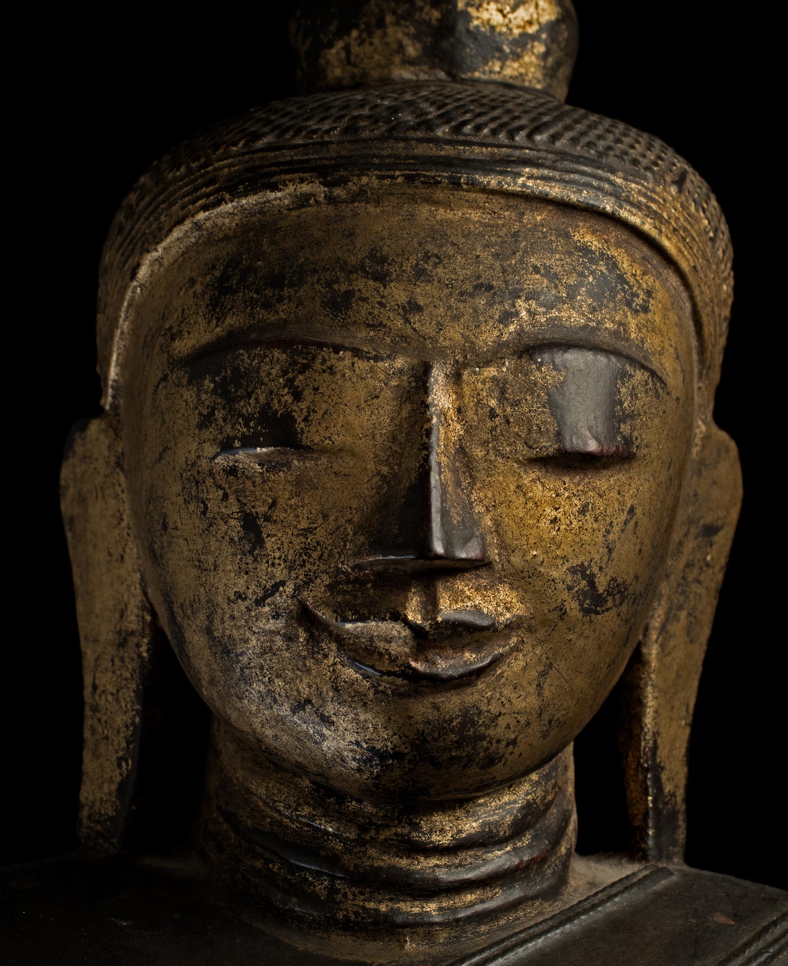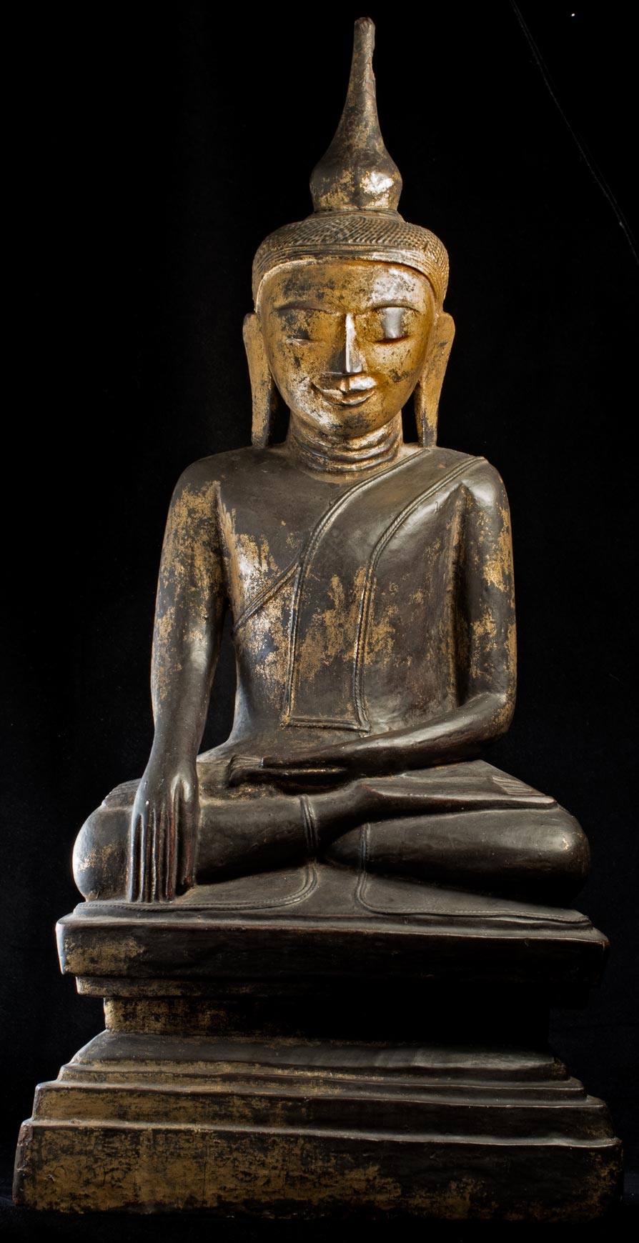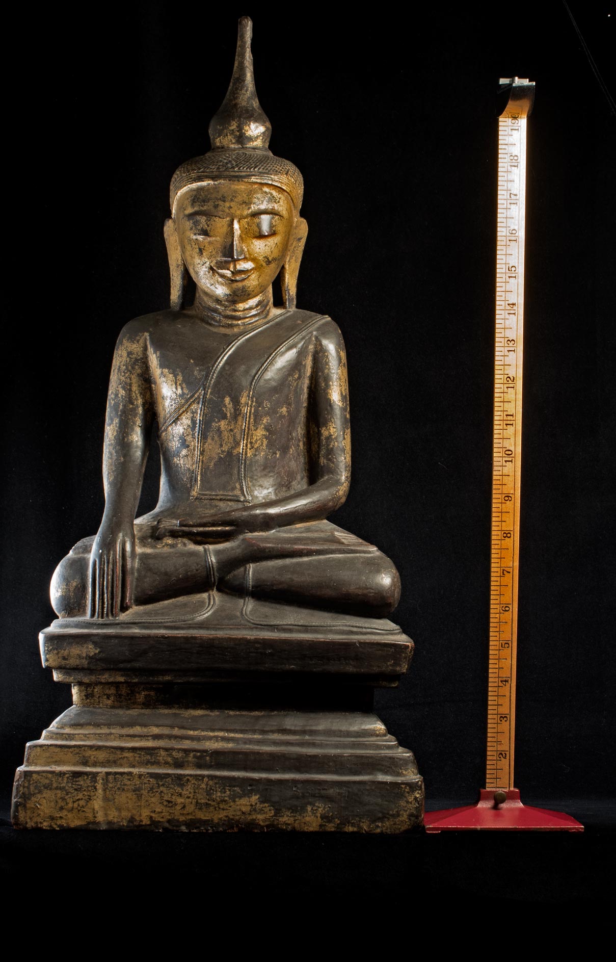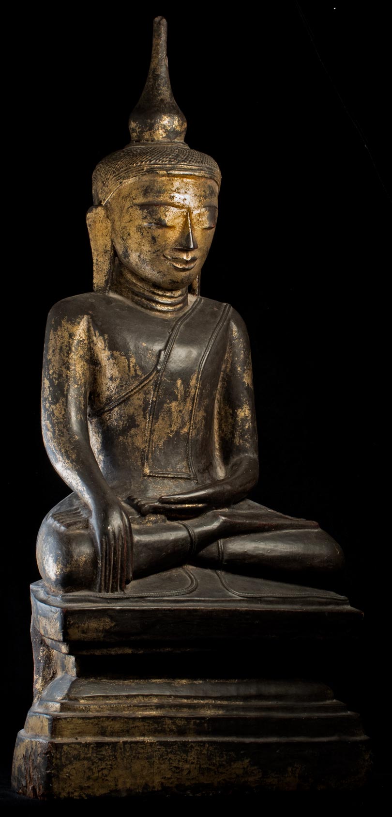 This piece is a 17th century late Ava early Shan style Burmese wood buddha. It is in remarkably good condition for a 300-400 year old buddha made of wood. Part if the reason for this is because it is made of one solid piece of teak wood. The other reason is because the original lacquer covering the surface is almost completely intact. The back of the base has a carved out chamber that was likely filled with a consecration at one time. This Buddha has a particularly compelling face. This type is a personal favorite. Measures 22 1/2 inches tall x 11 inches across x 5 inches deep.