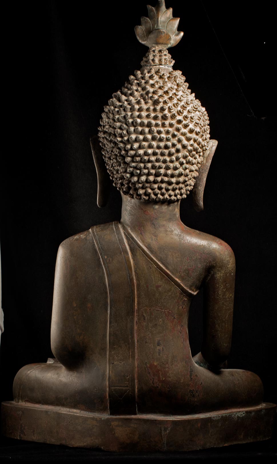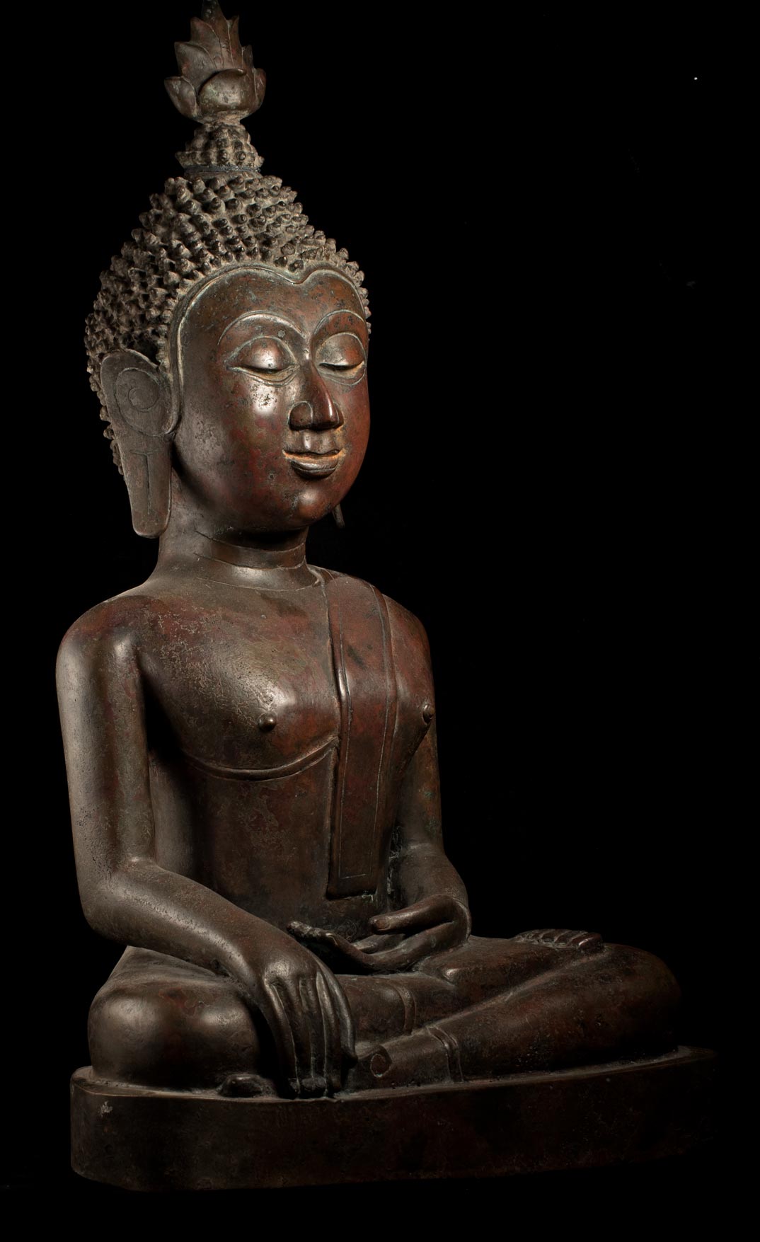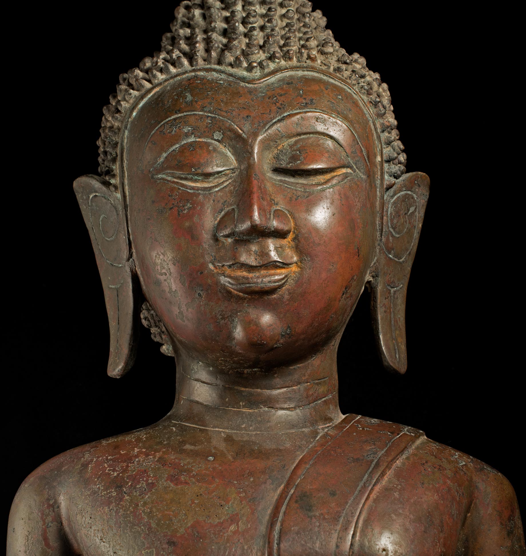 Personal favorite- from the kingdom of Nan in Northeast Thailand, this special large 18/19 thC Buddha exudes a joyful exuberance like few others. His extremely large head gives him a child-like appearance. Measures 24 inches tall x 15 inches across x 7 inches deep. Larger than dimensions convey due to stout body, almost no base, and short finial-actual body is the size of a typical sitting 36+ inch Thai Buddha. Finial likely repaired. Superb patina. Never seen another quite like him. Special.