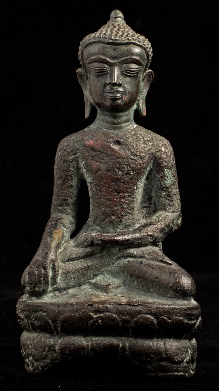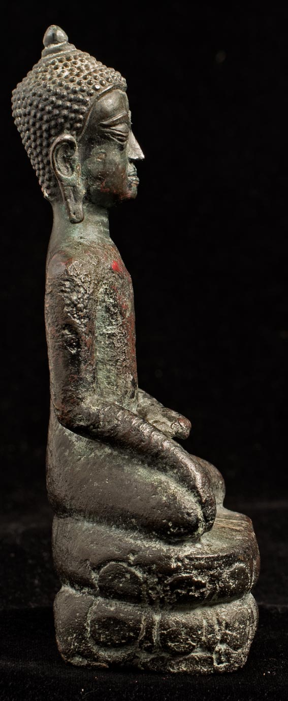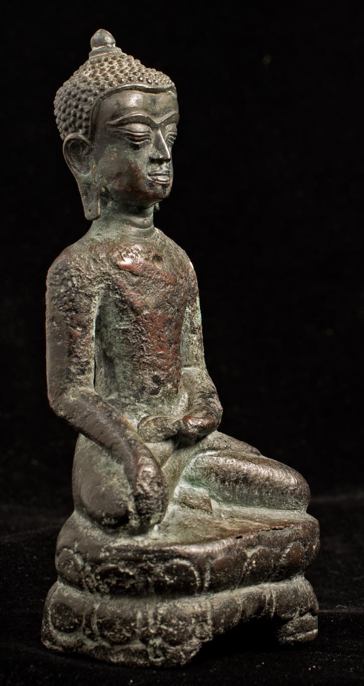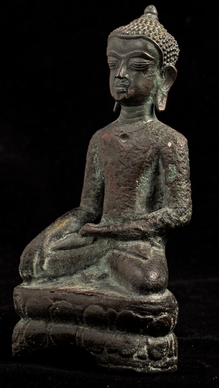 13/14thC Utong "A" Thai Buddha. Very uncommon type- rarely seen for sale in any size-sometimes you see a head only, but rarely a complete example in good condition, as so few were made. A transitional type between earlier Cambodian Khmer types and later true Thai styles. This piece measures 5 1/2 inches tall x 2 1/2 inches across x 2 inches deep.