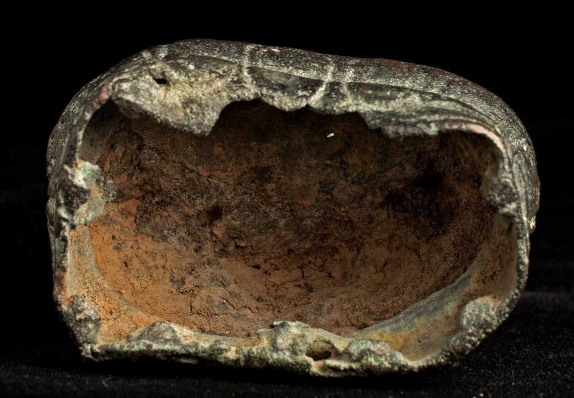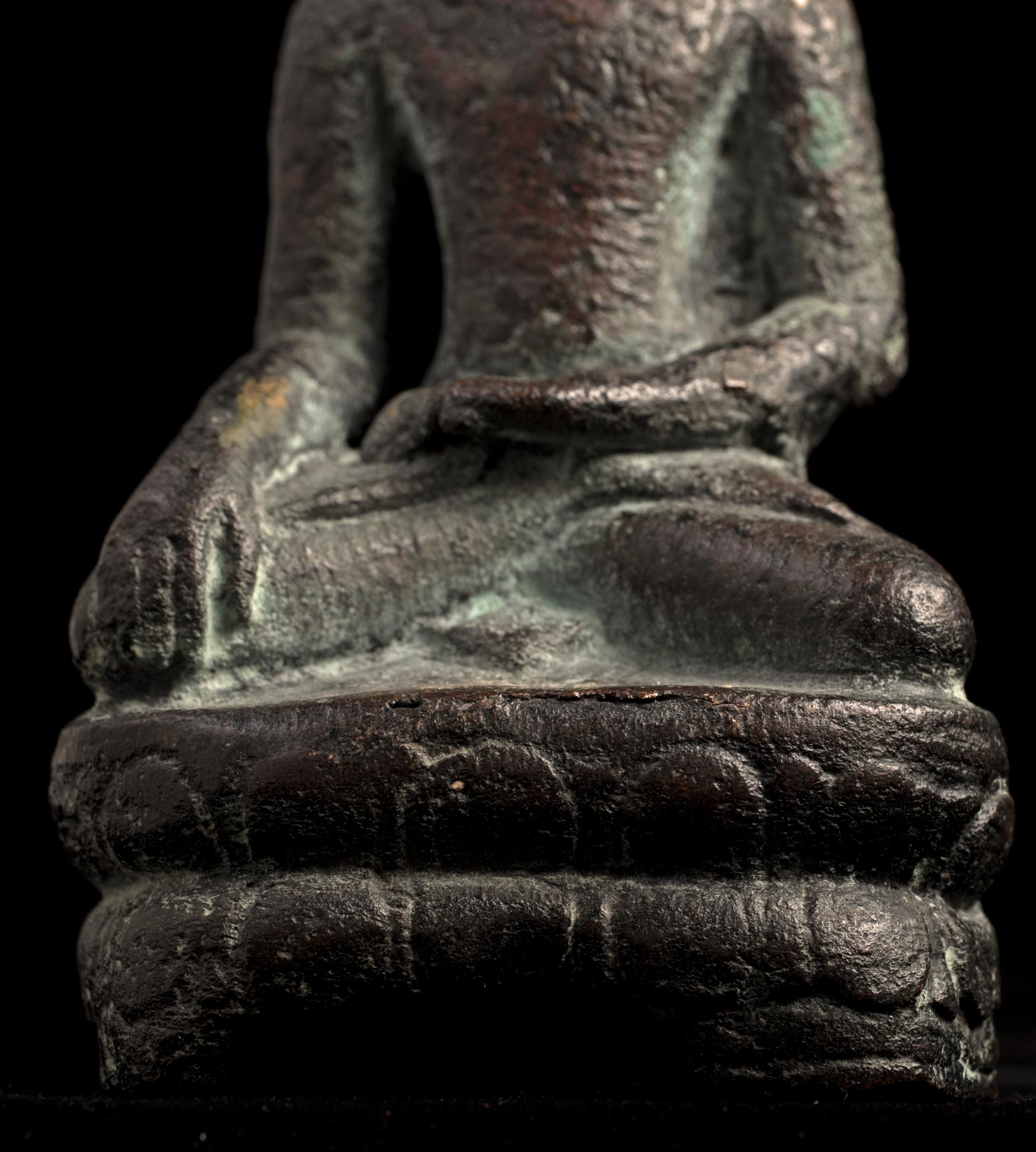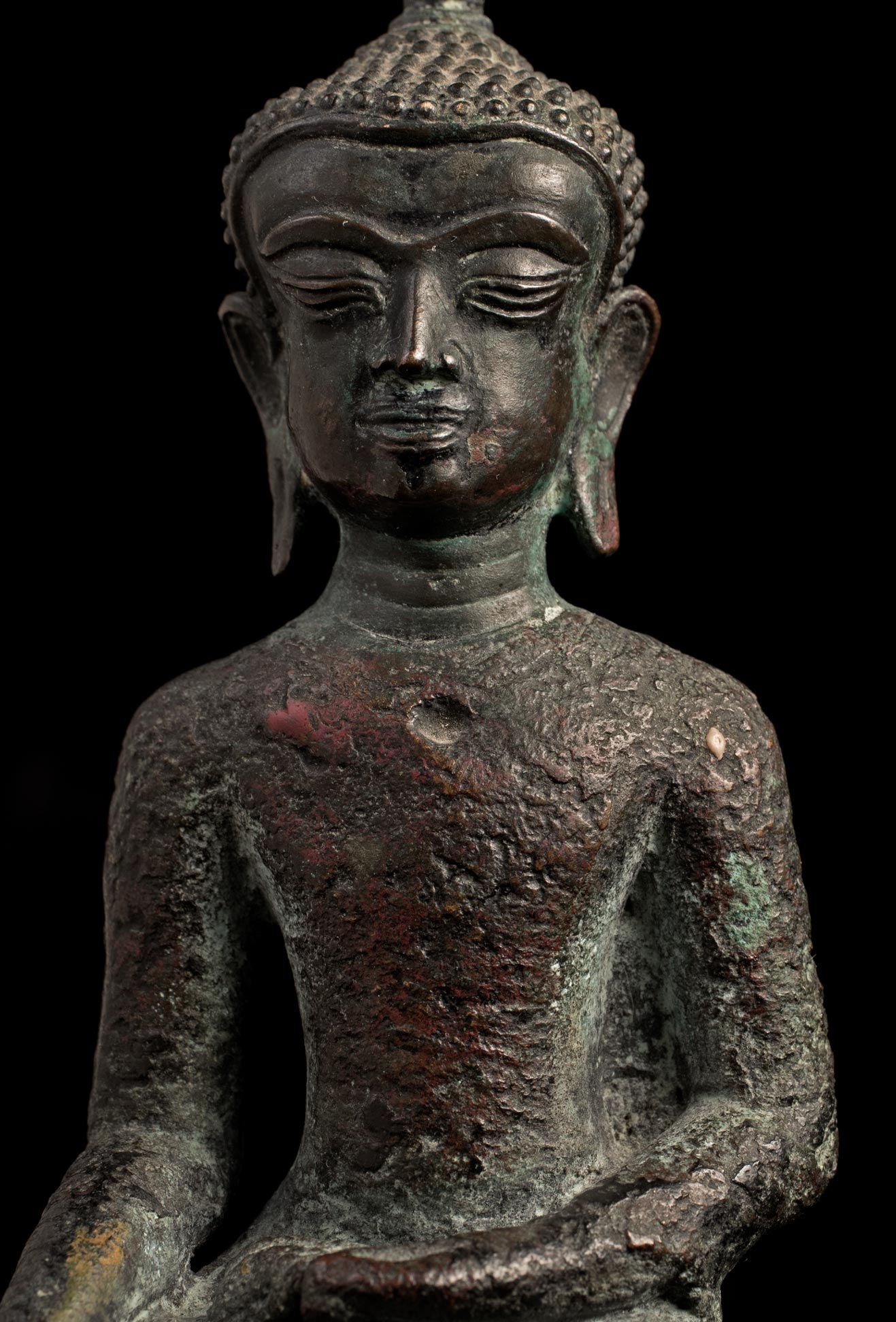 13/14thC Utong "A" Thai Buddha. Very uncommon type- rarely seen for sale in any size-sometimes you see a head only, but rarely a complete example in good condition, as so few were made. A transitional type between earlier Cambodian Khmer types and later true Thai styles. This piece measures 5 1/2 inches tall x 2 1/2 inches across x 2 inches deep.