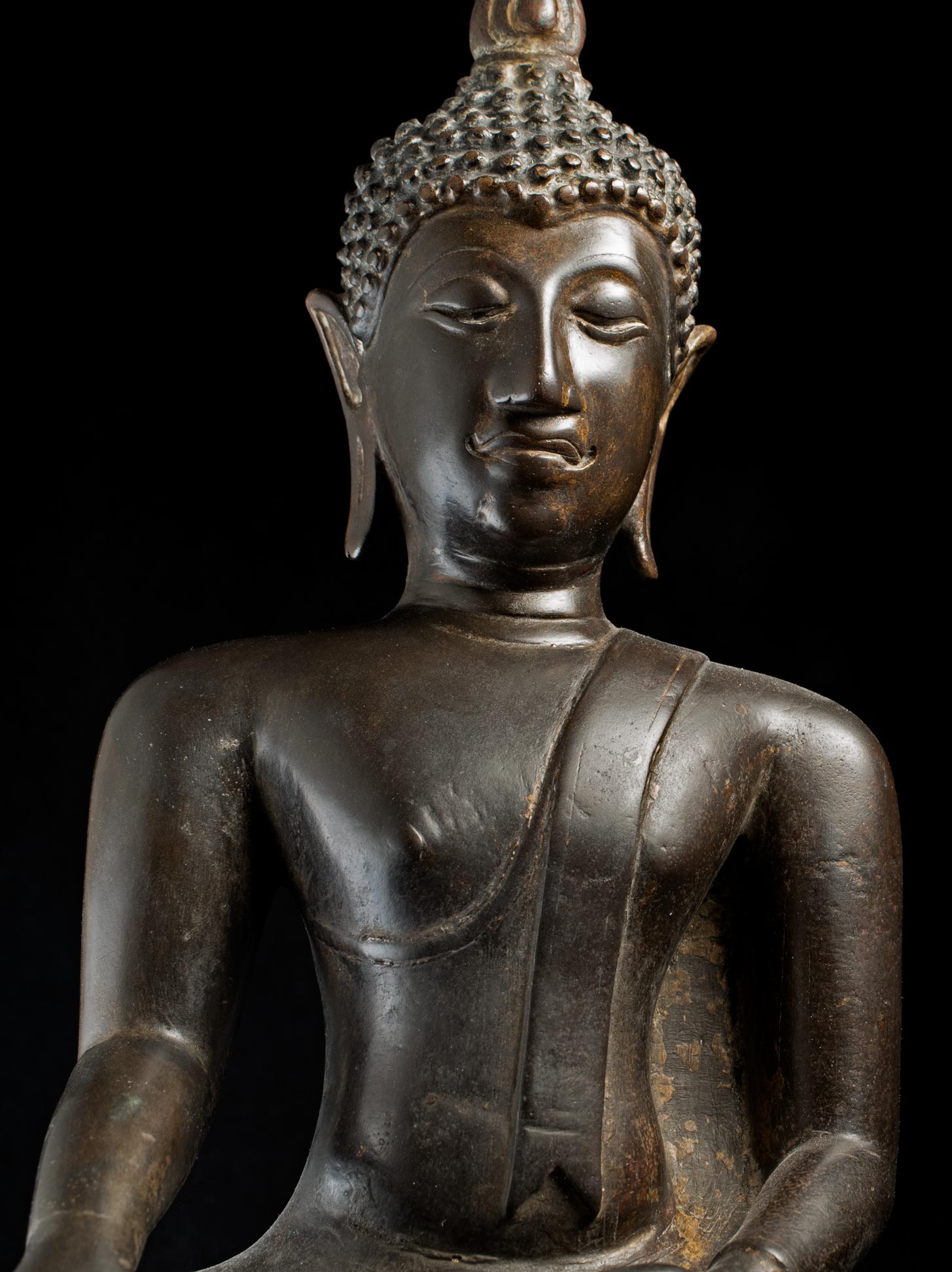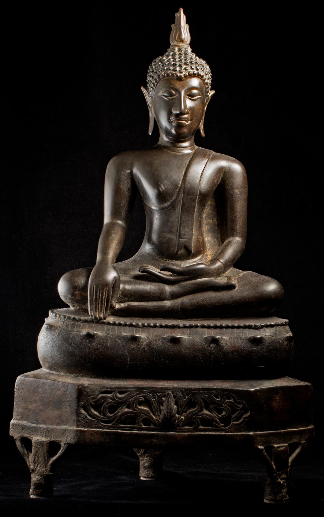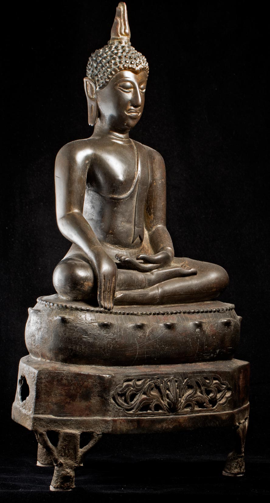 Superb large 16thC Northern Thai-Best of its type. Incredible face, splendid base. Chocolate brown patina. This Buddha almost glows in the dark. Best of Northern Thai Buddhist sculpture in a big size, from the best period. Measures 17 inches tall x 11 inches across x 6 inches deep.