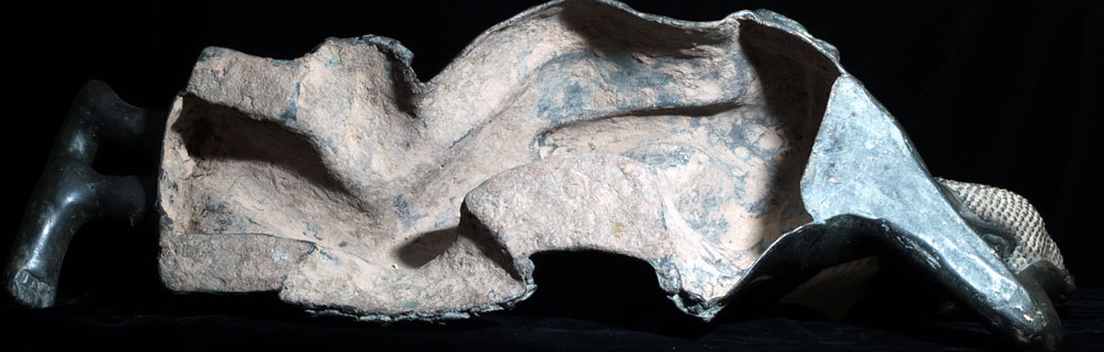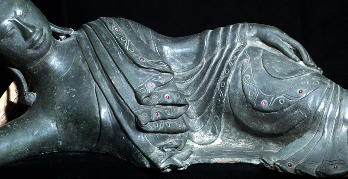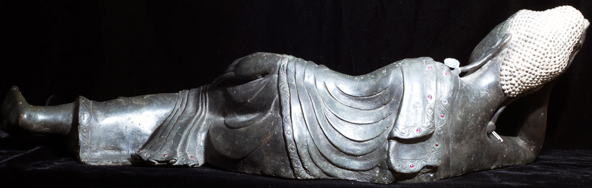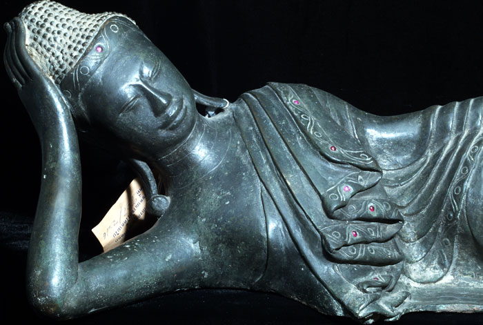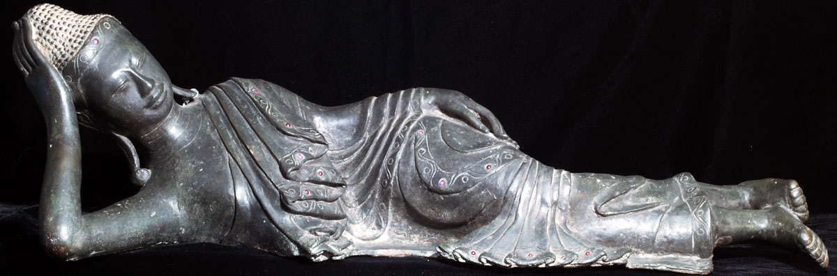 This is a superb and quite large reclining Manadalay bronze Buddha. Purchased from a U.S. estate, I have not seen an authentic comparable piece of this size in 10 years. Retains most of its original stones., which I believe may be low grade rubies, although I am not positive- they do not appear to be the standard glass ones used on the wooden Buddhas- they are not all the same exact color which speaks to them probably being stones. Take a look at the wonderful face, which radiates joy and calm. He is a very good size at 24 inches long by 7 inches at his tallest by 7 inches at his widest. In excellent condition with no damage or repair. Came out of S.E. Asia legally through Thailand (still has the export tag attached) in 2511, which translates to 1968. My estimate on age is 19th to early 20th century. Lovely!