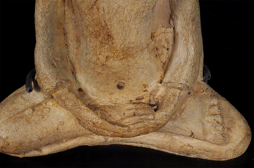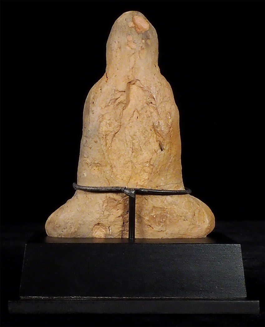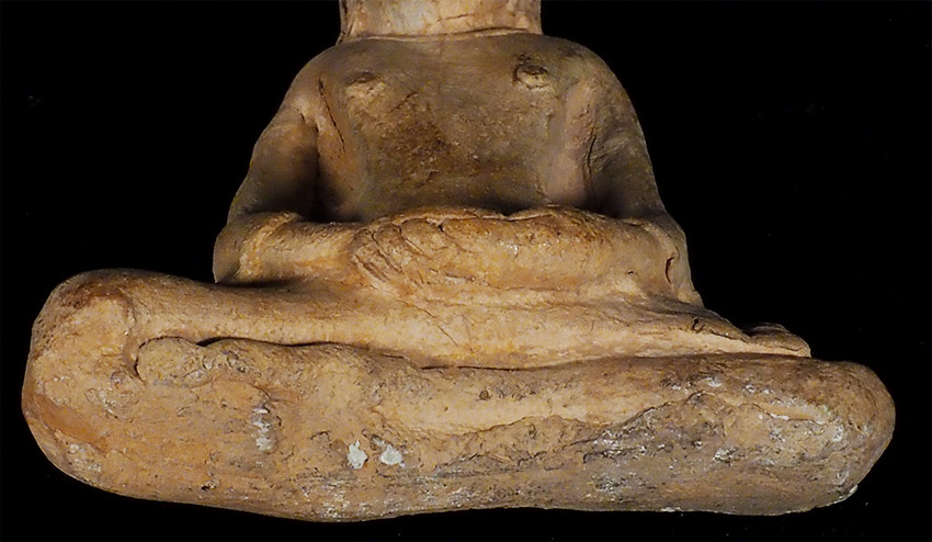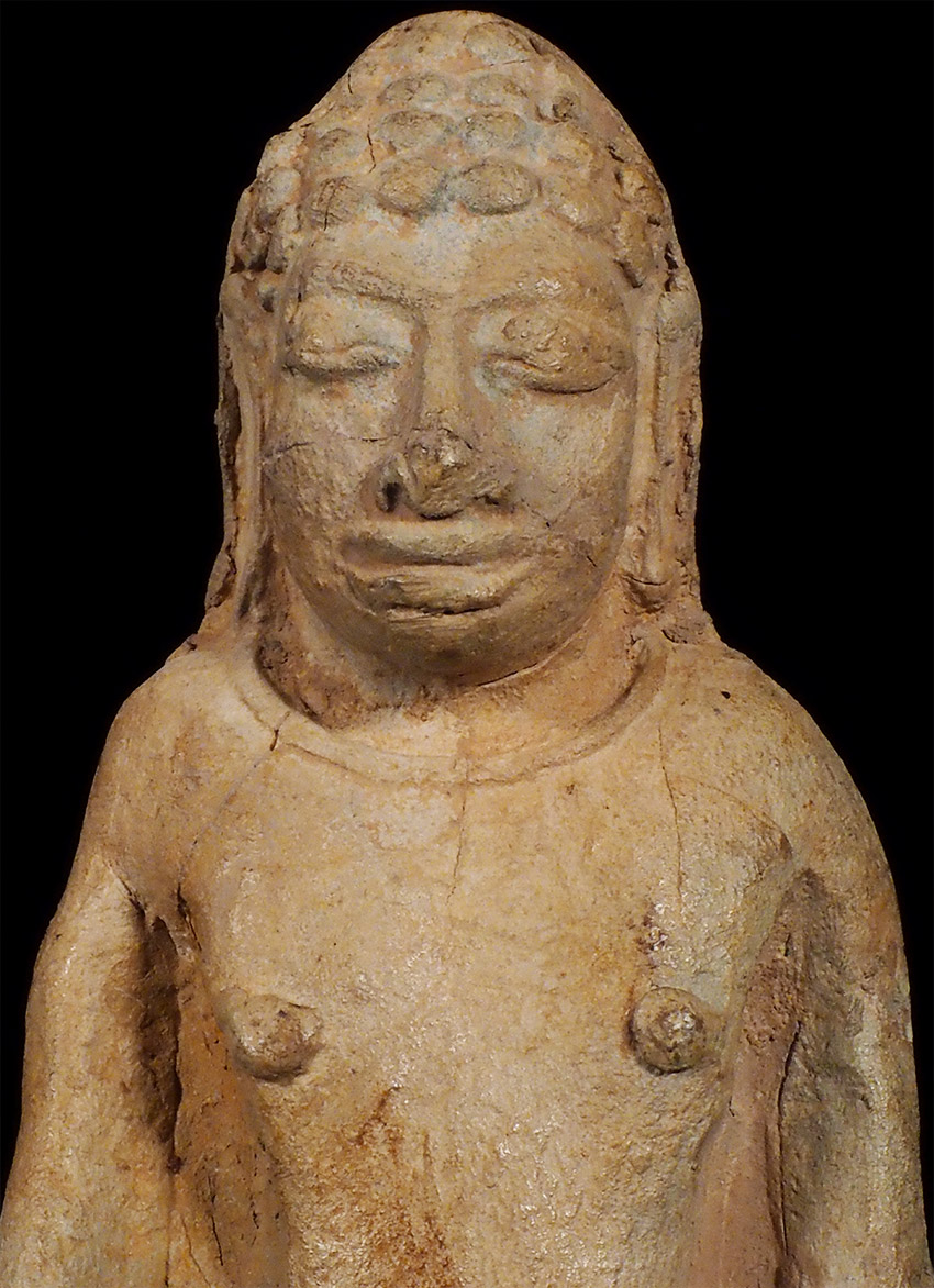Authentic 7/8thC Dvarati Buddha in terracotta or related material. looks to possibly have some repair/restoration, but in remarkably good condition for a 1200+ year old Buddha made of such a fragile material. Figure alone is 4.5 inches tall, 5.75 inches on custom stand. I've owned this piece 25+ years and finally had a stand made for it to properly display it. I've not seen another complete one like it in all that time. Country of origin could be Thailand, Cambodia, Laos, or Burma, as Dvarati culture touched parts of what are now parts of all of those modern day countries. I am putting under “Cambodia”, as it looks like a prototype for some early Khmer Buddhist sculpture.