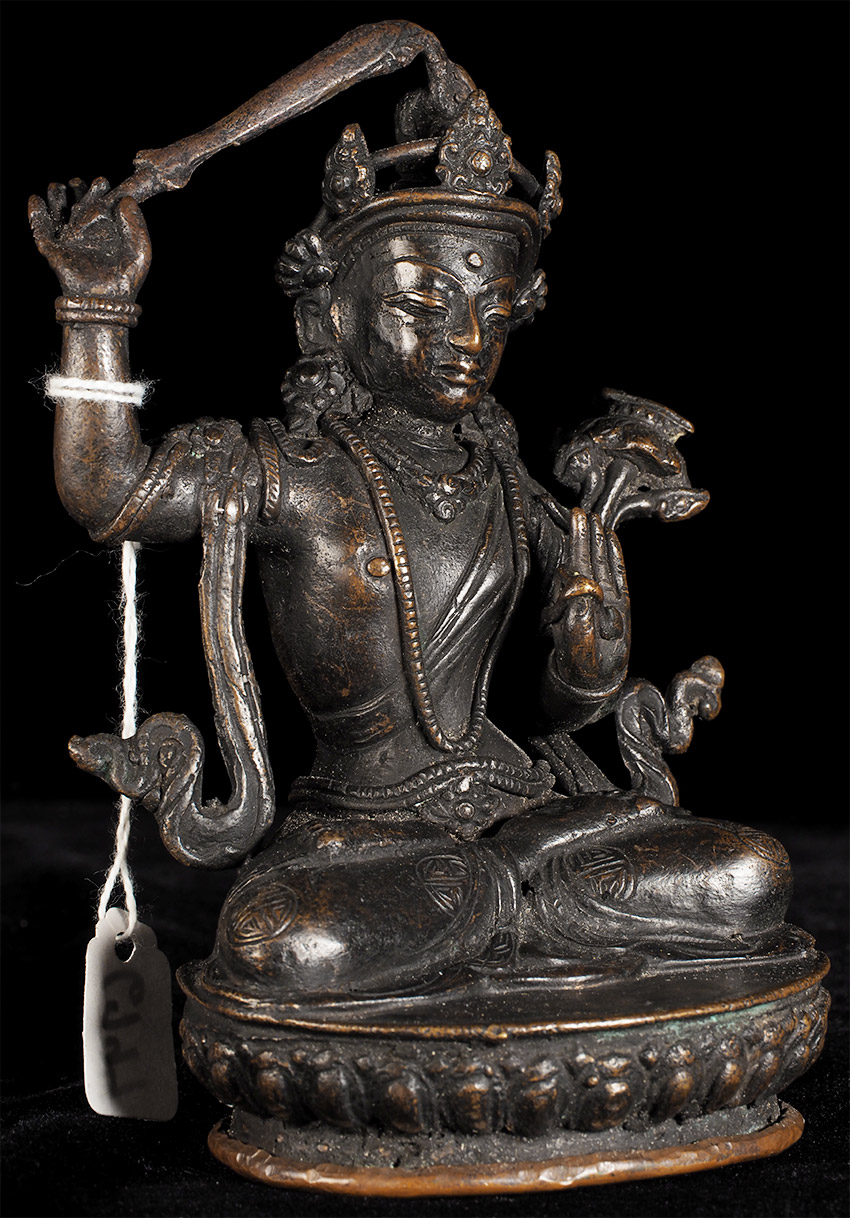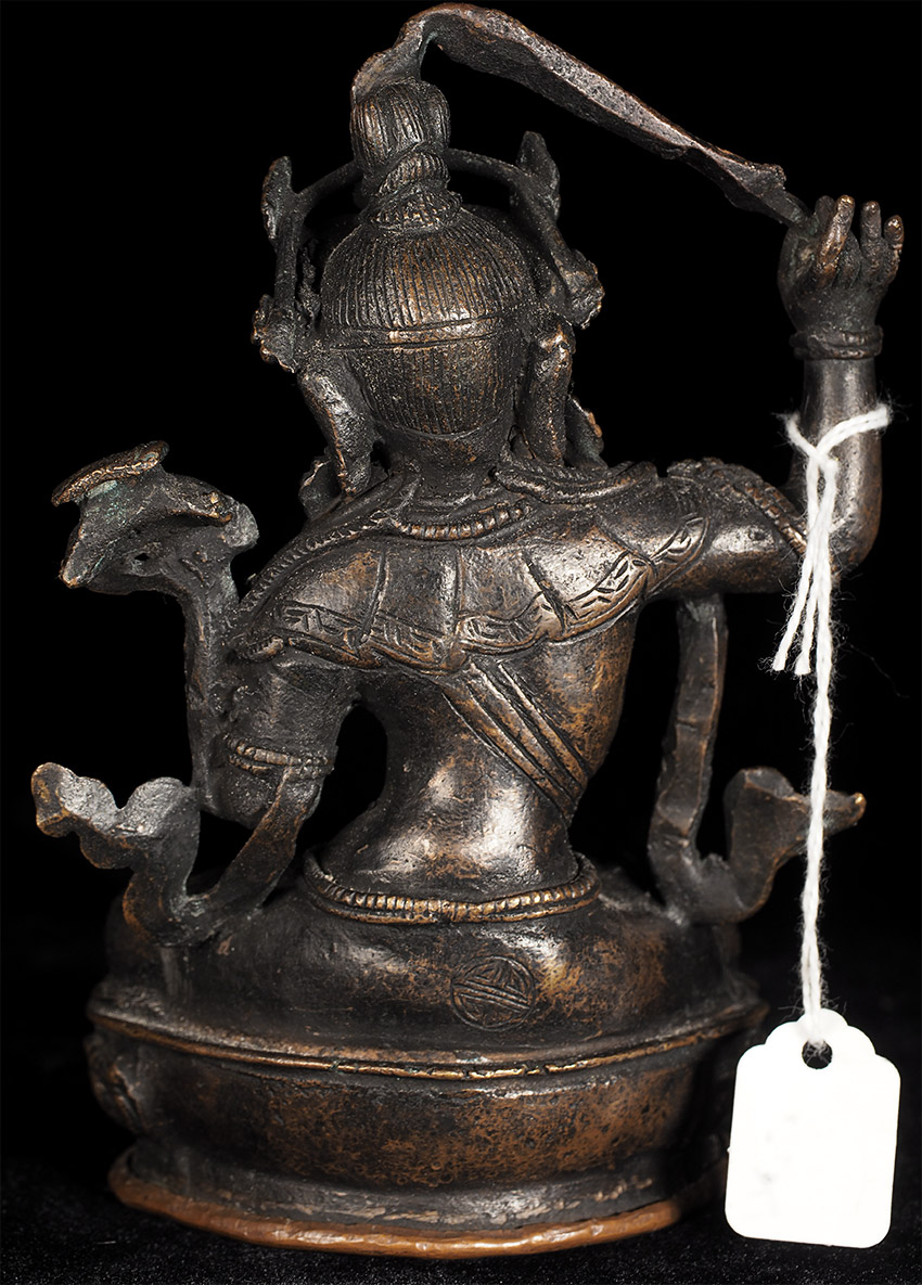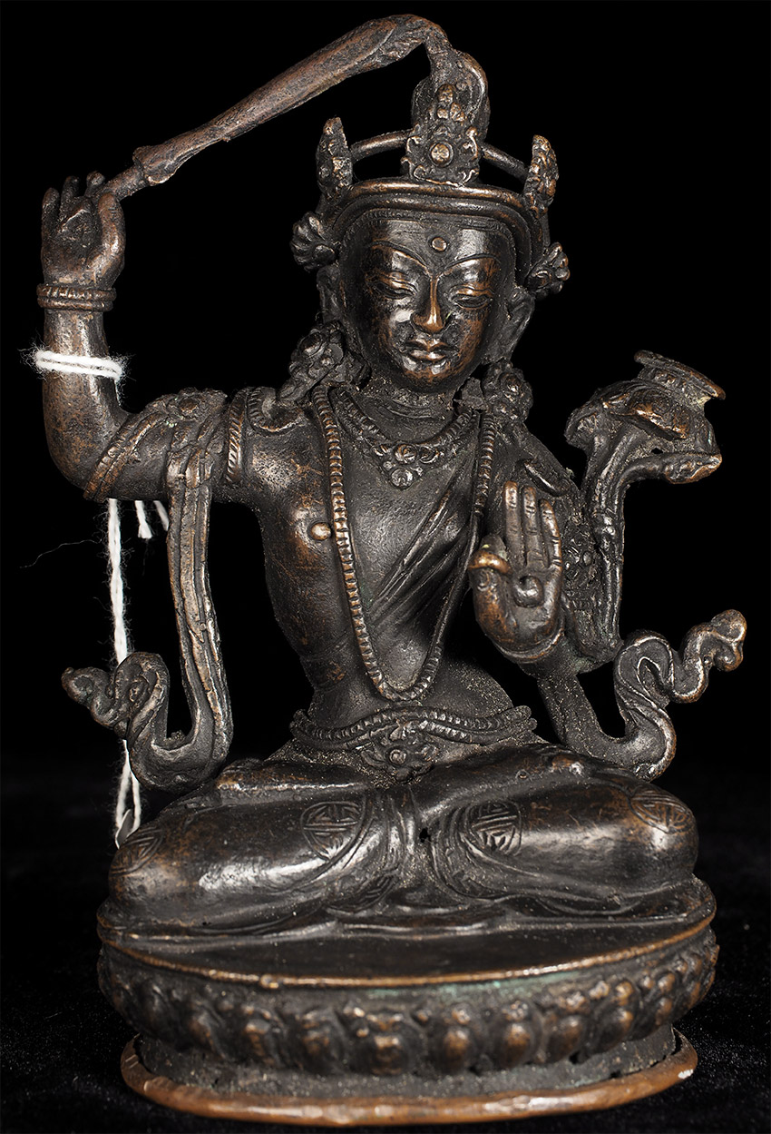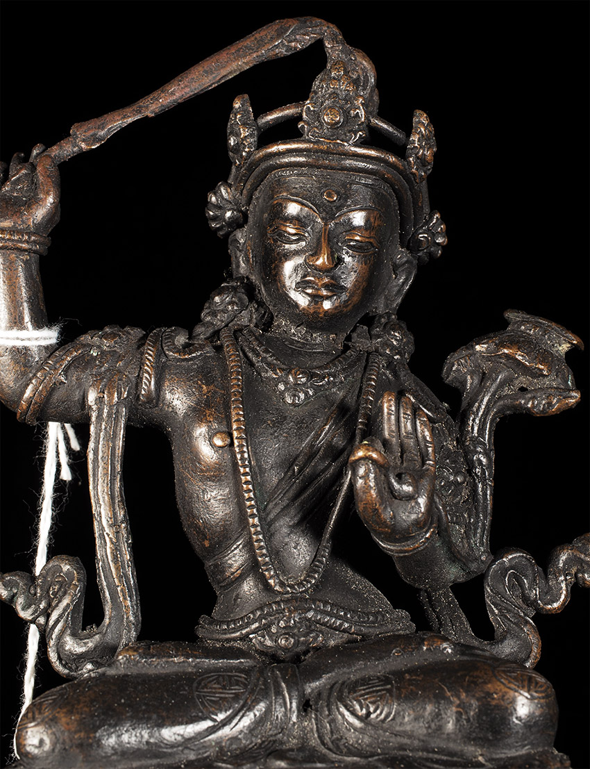 Antique Nepalese Manjushri- Bodhisattva of Wisdom, cutting through "that which gets in the way of seeing clearly". Sits 5 5/8 inches tall. Particularly beautiful consecration cap (Nepalese style-folded over the edge of the bottom of the base, original, never opened).