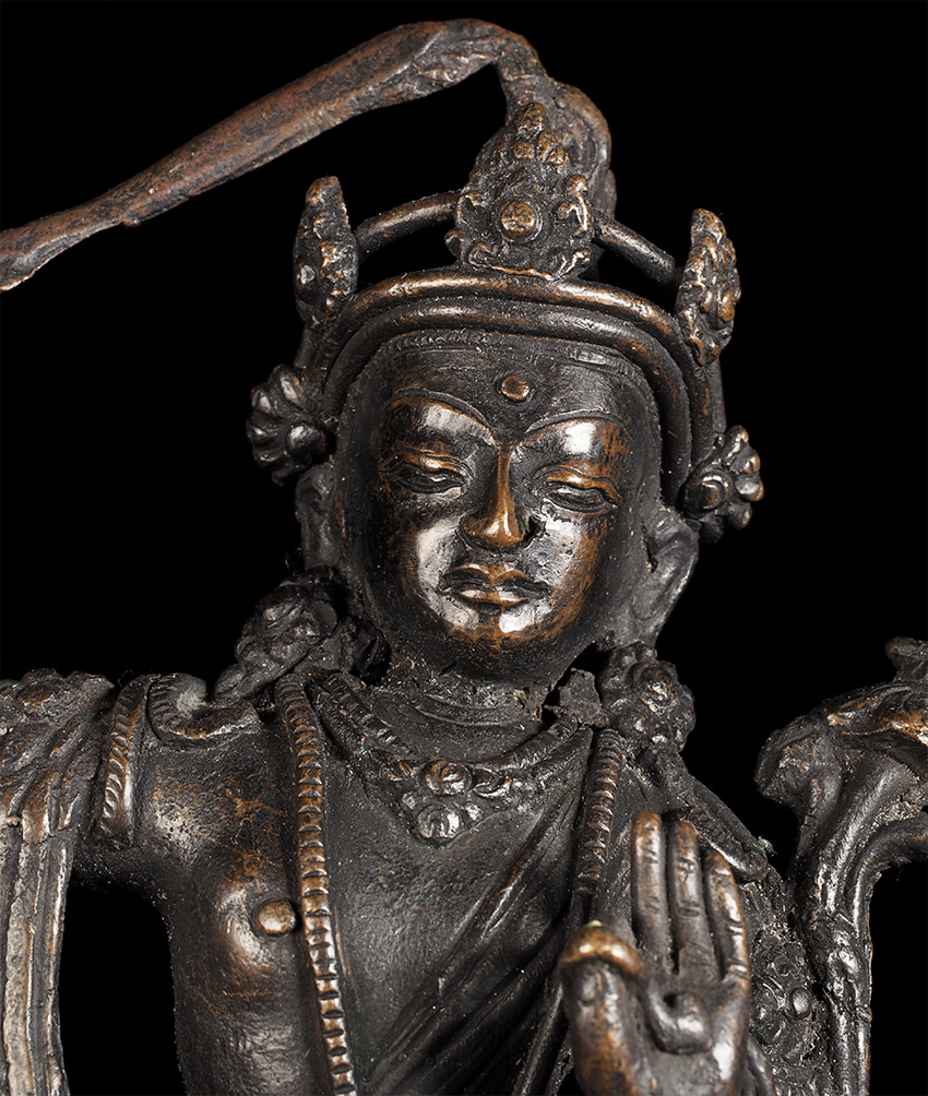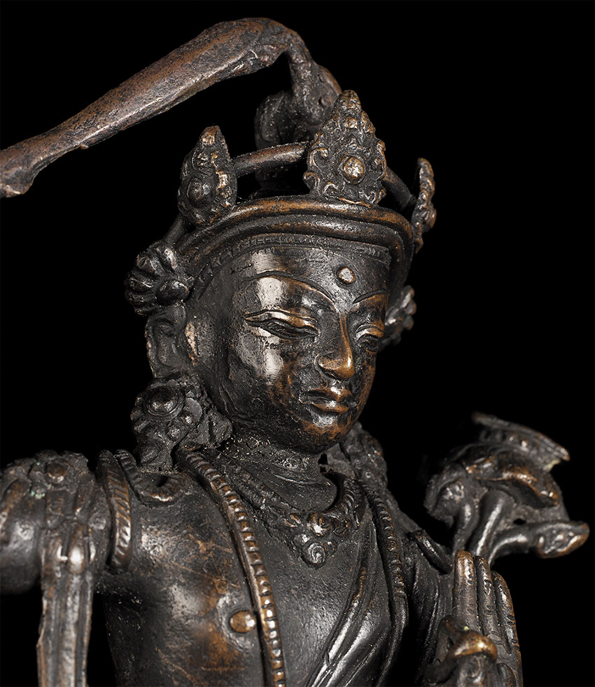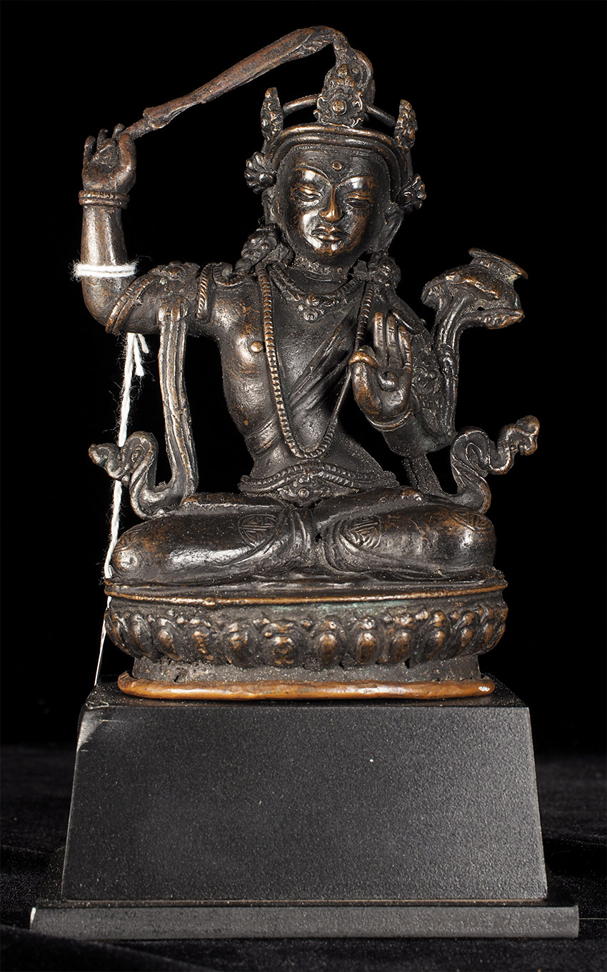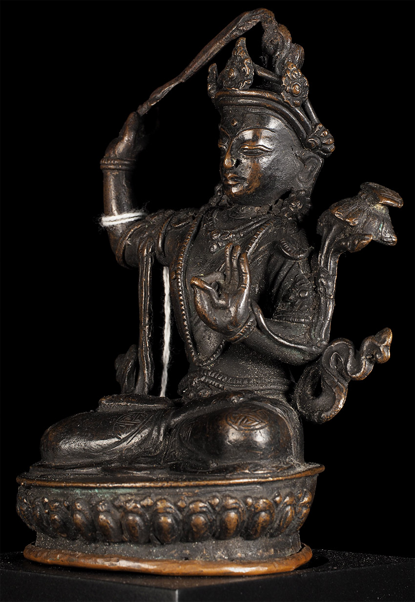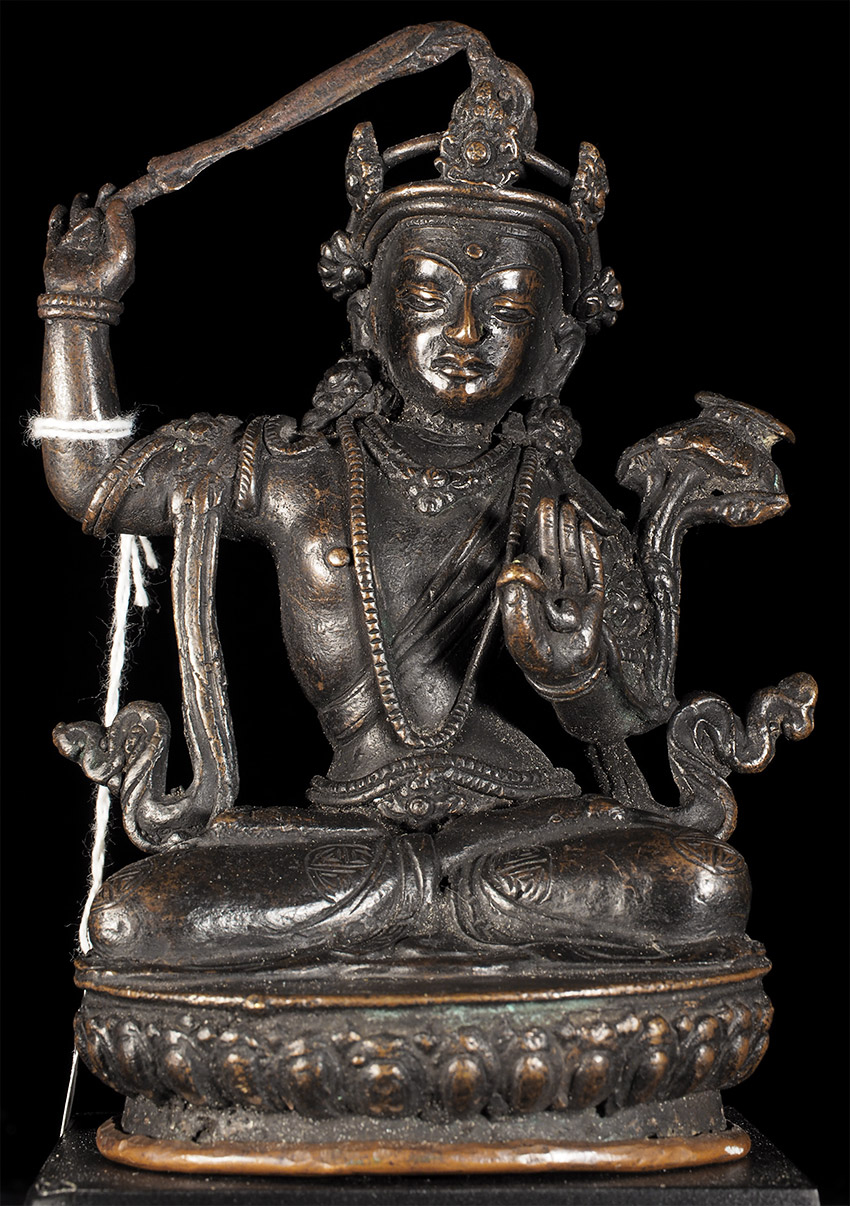 Antique Nepalese Manjushri- Bodhisattva of Wisdom, cutting through "that which gets in the way of seeing clearly". Sits 5 5/8 inches tall. Particularly beautiful consecration cap (Nepalese style-folded over the edge of the bottom of the base, original, never opened).