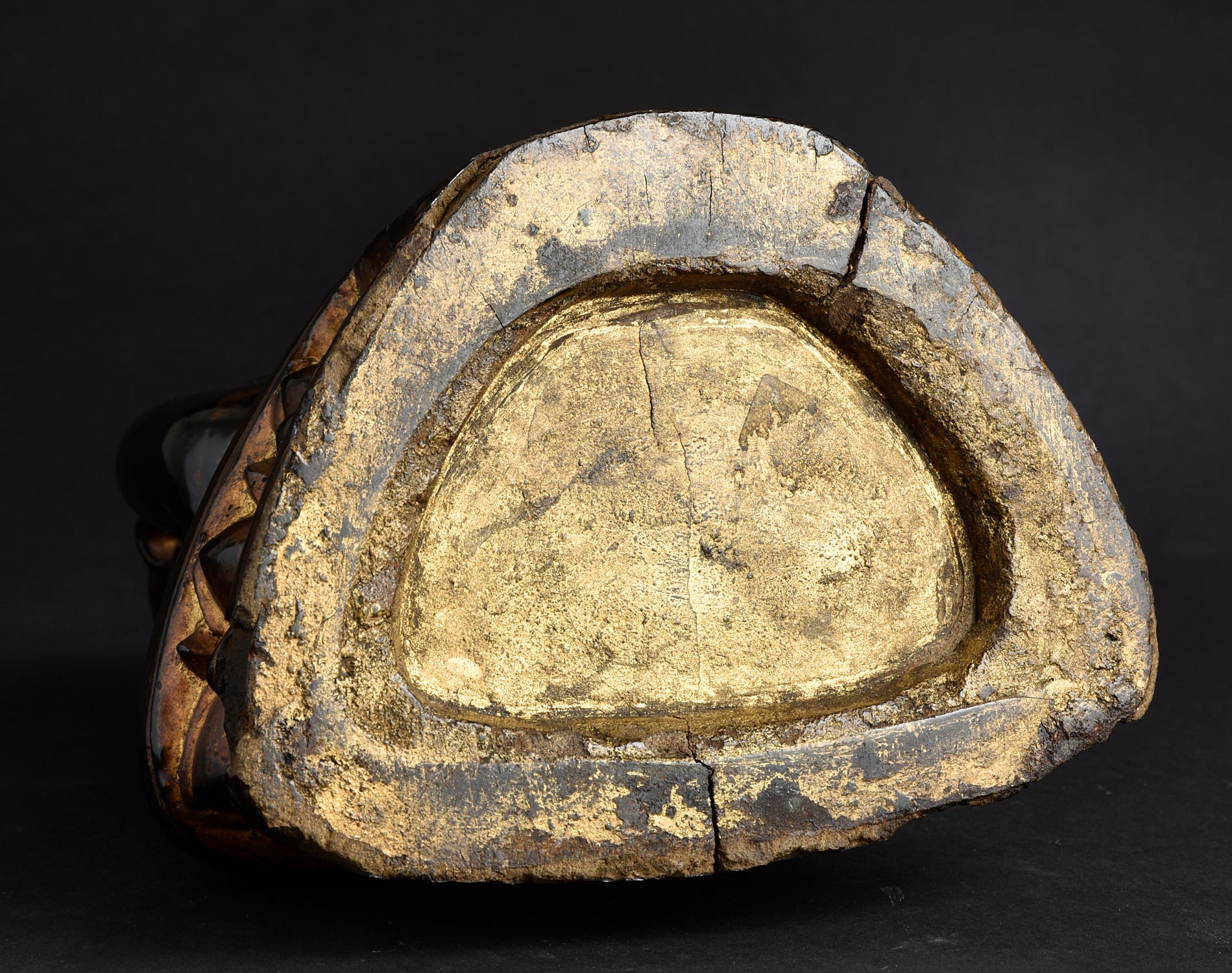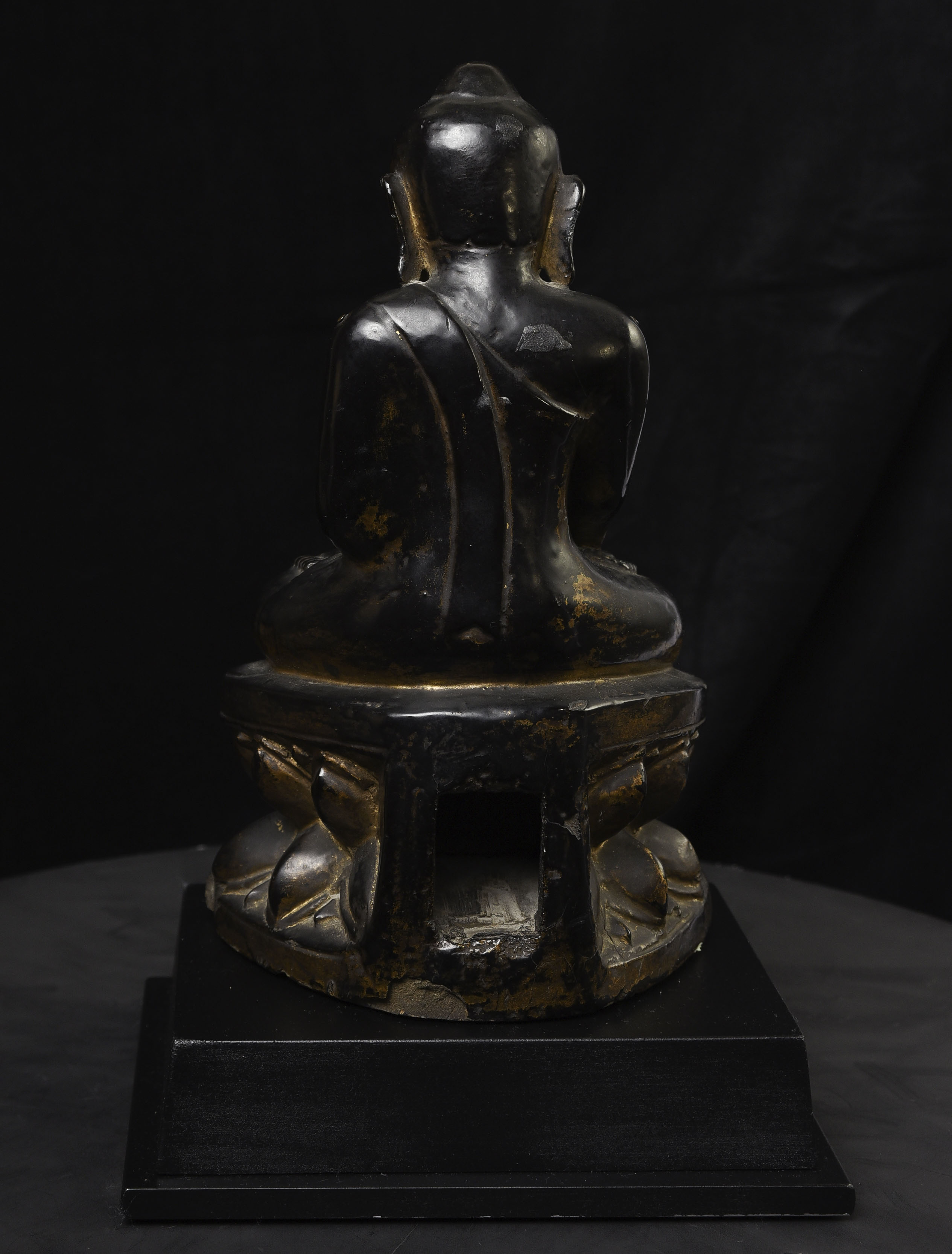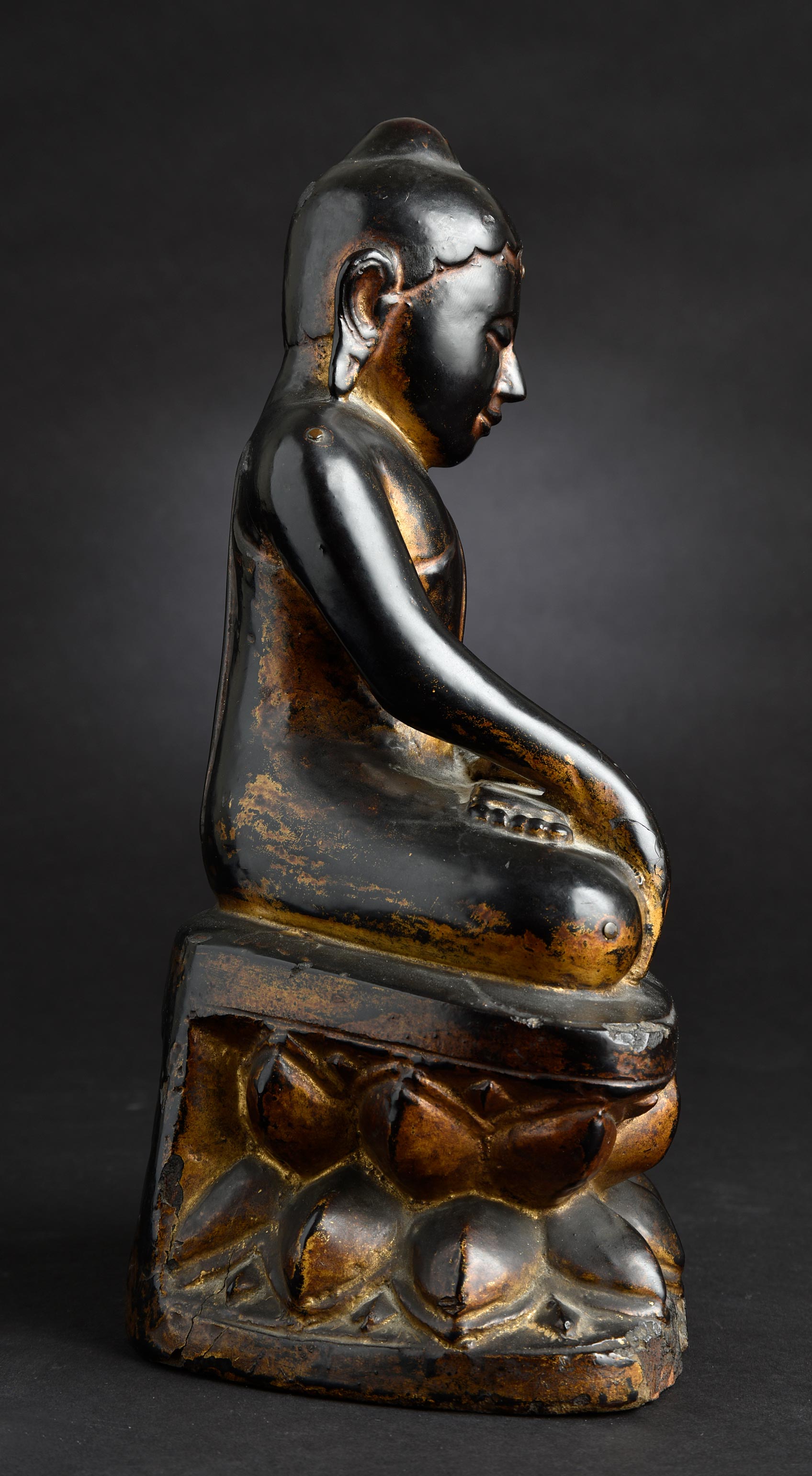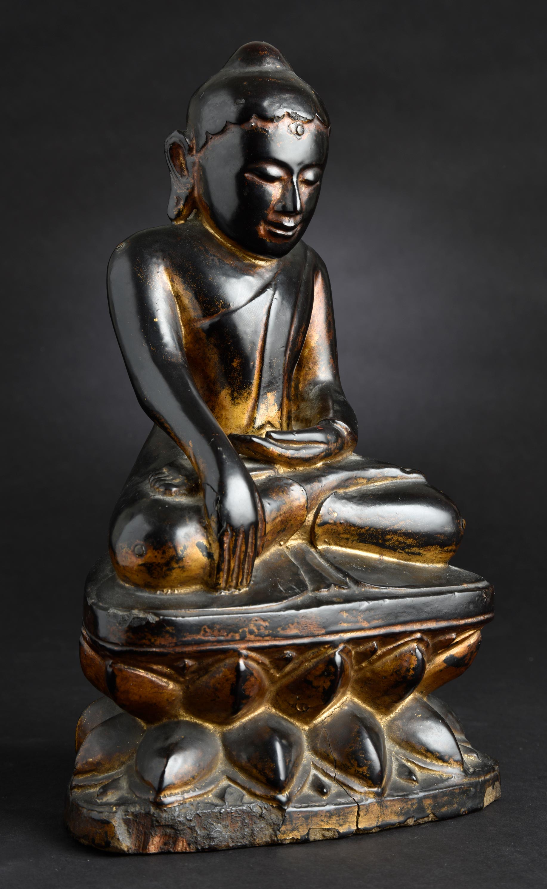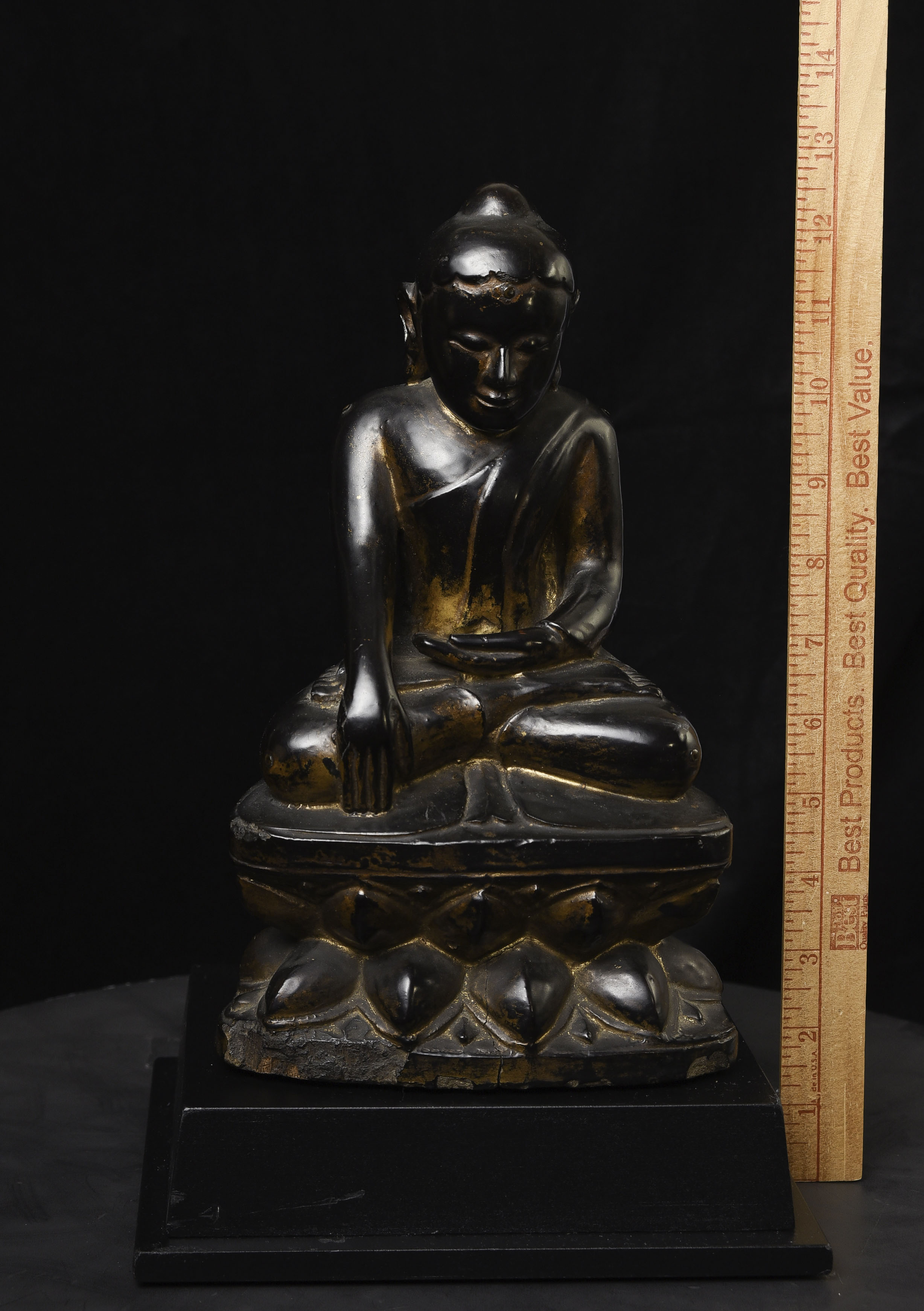 This is a special form of protective Buddha from Burma- "Lotus Buddha". Considered good luck, and to be protective-especially from fire. Often with small "bumps" on the joints (knees, elbows, hips etc). I believe this one is a genuine early one (150 to 200 years) carved out of teak and coated with layers of lacquer.. Very fine face- s