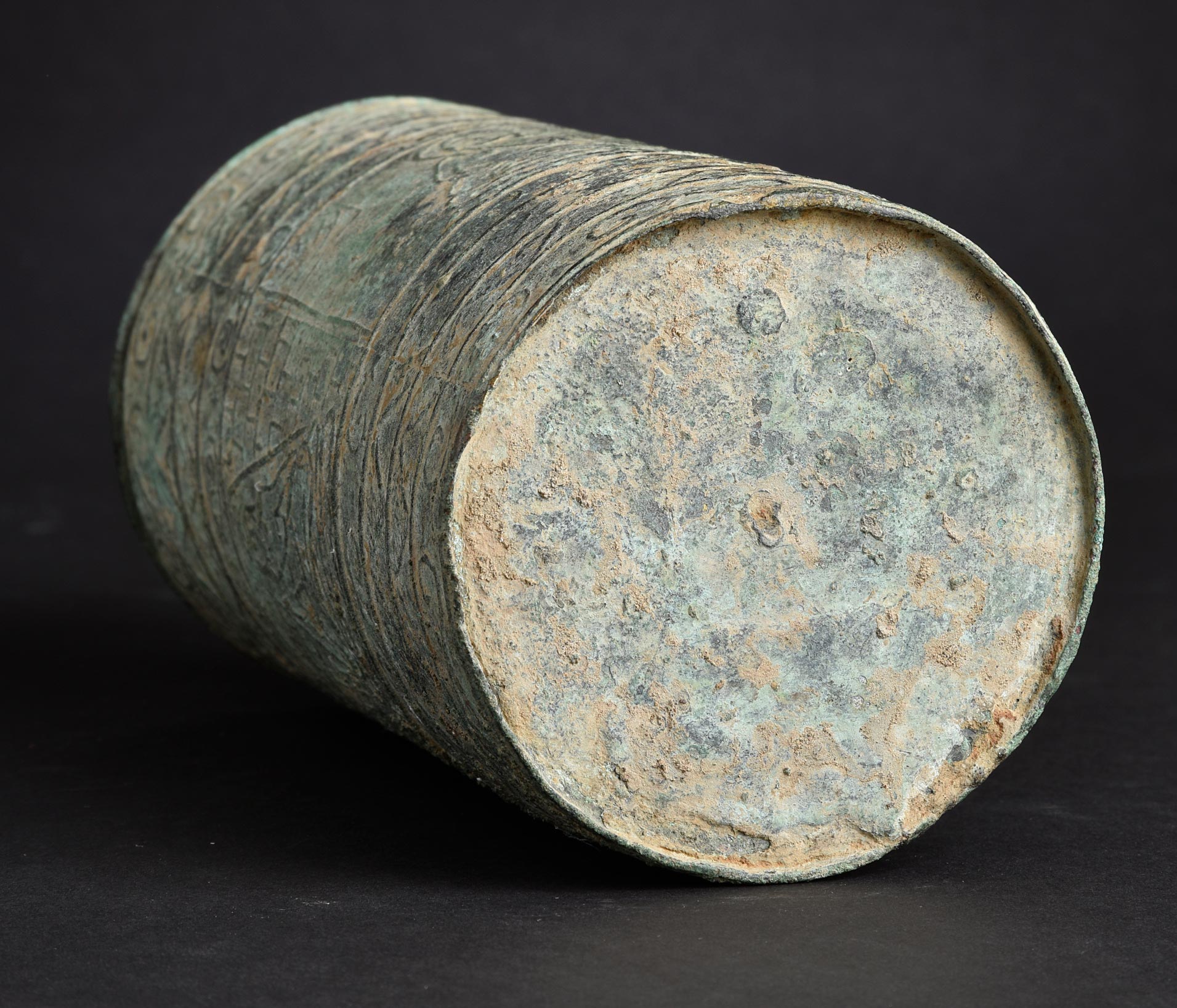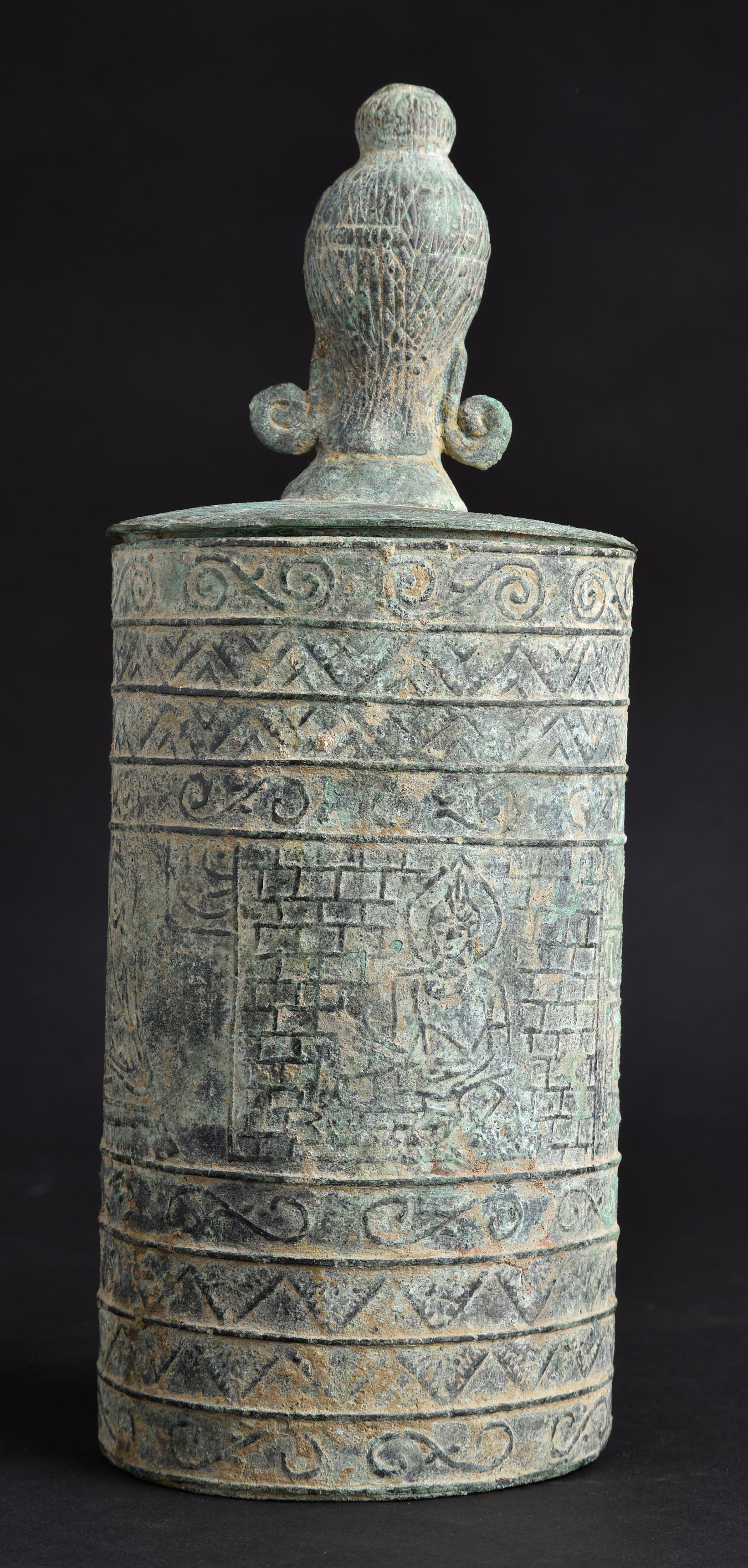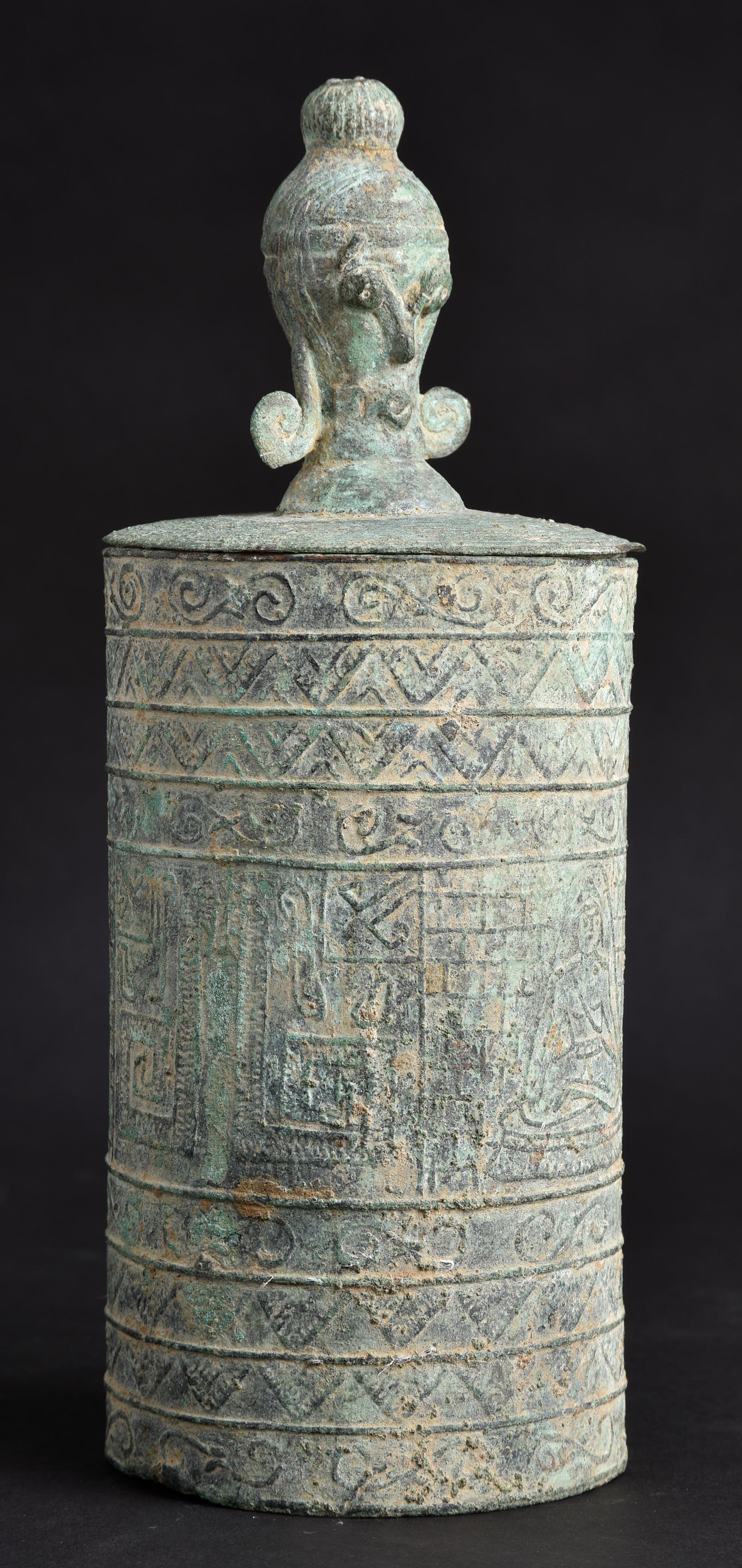 Dong Son Culture, which is one of, if not the earliest S.E. Asian bronze using culture. It is a Lime Container-Museum level in both condition and quality. Probably between 1500 and 2000 years old. OF the earliest bronze-using cultures of SE Asia, and likely the 1st Buddhist one. Measures 9 1/2 inches tall x 3 1/2 inches across x 3 1/2 inches deep. The best example I have ever seen of one of these (it is a typical form of this culture) Rare object..
