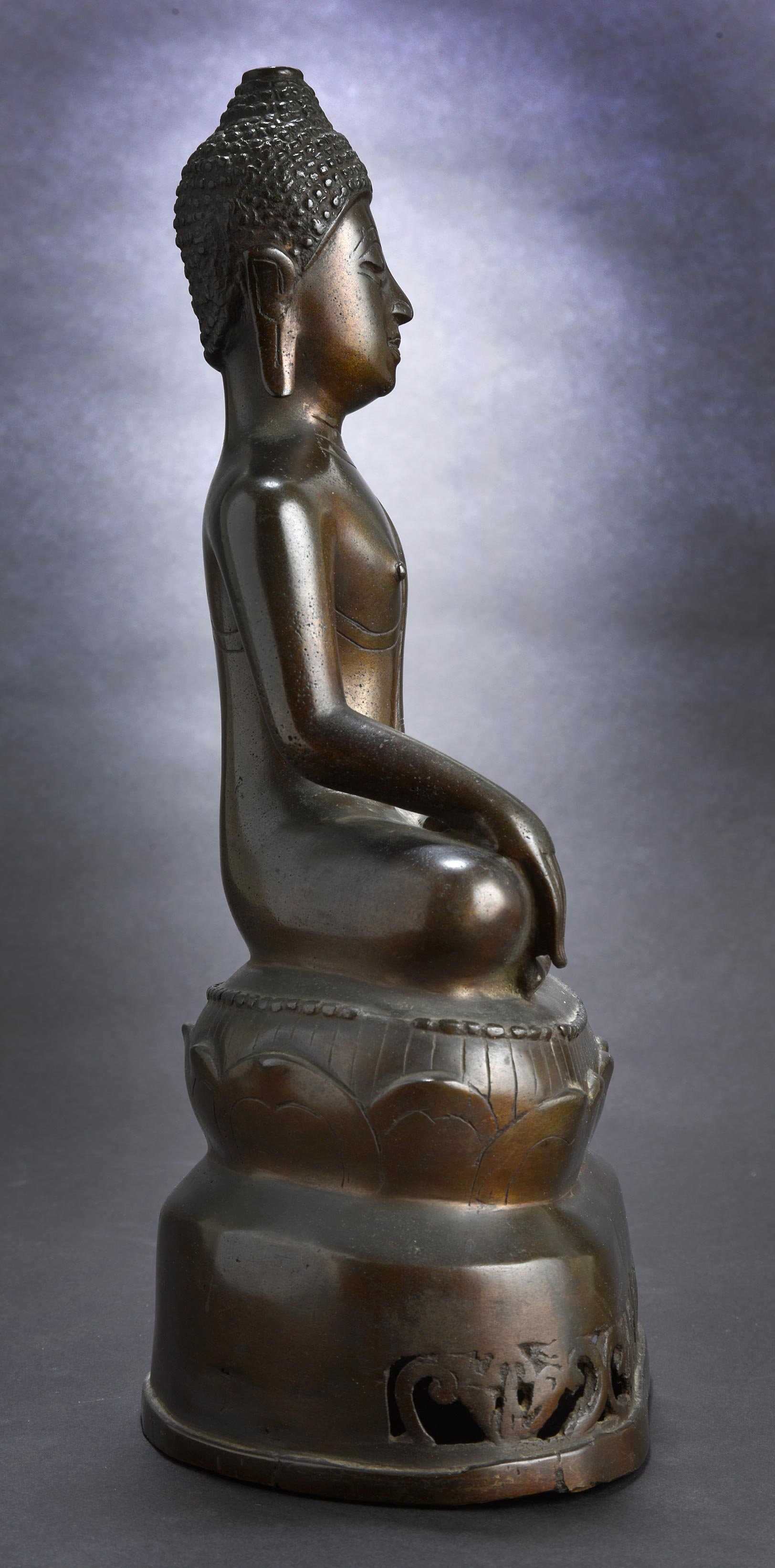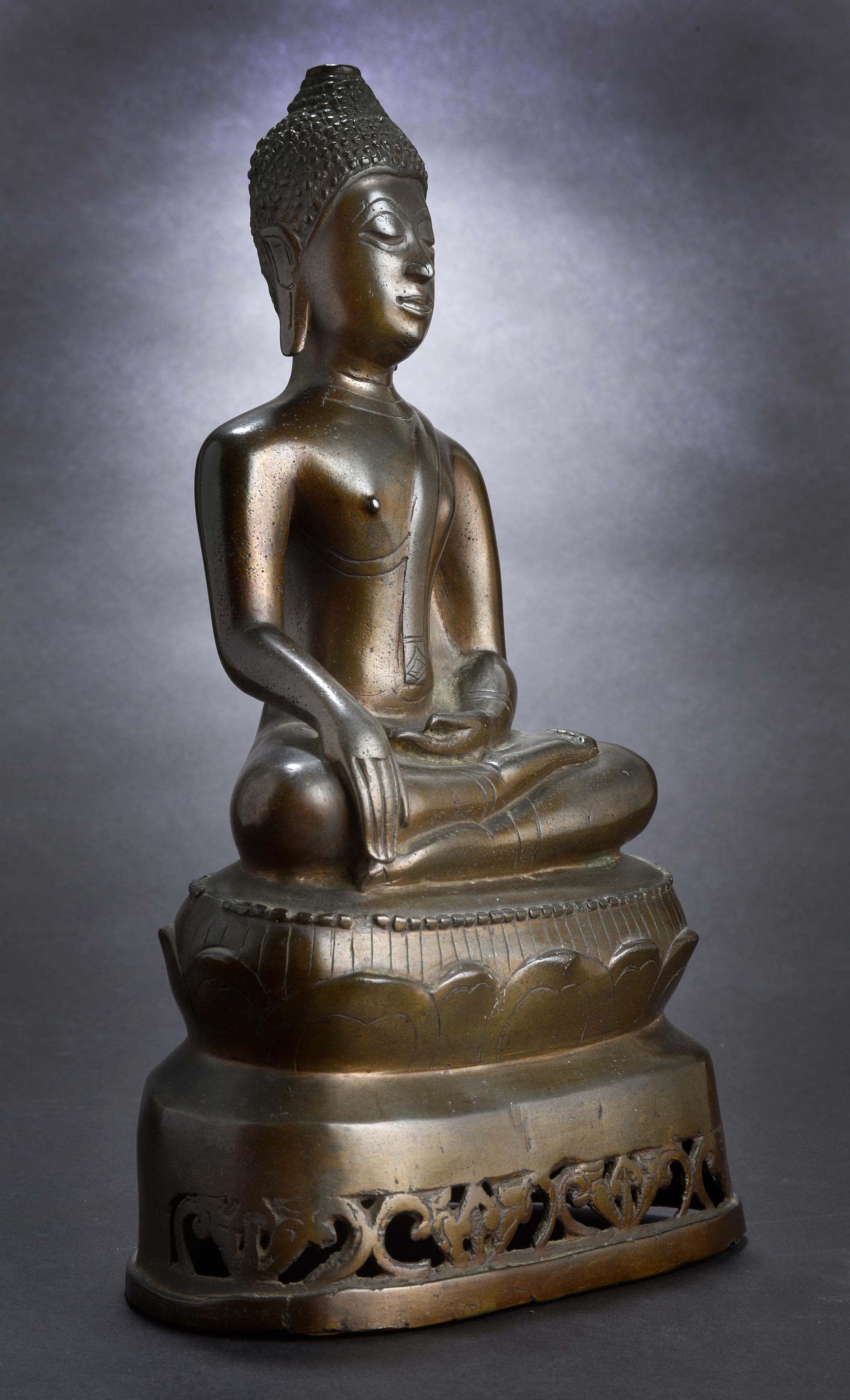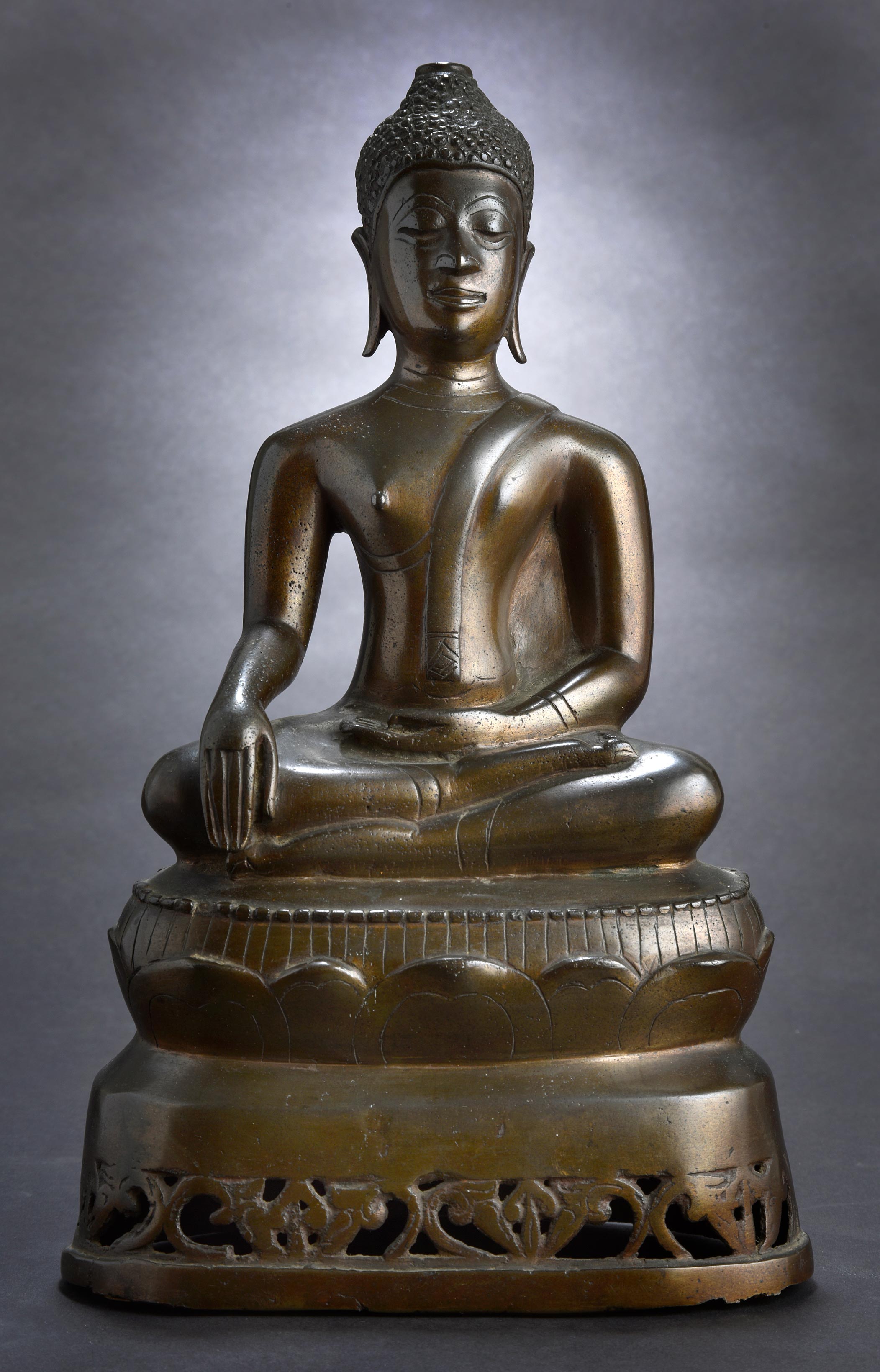 Exquisite and quite rare 15th16thC Northern Thai and Cambodian combination , Thai features include the casting/sculpting and the overall feel and style of the piece. . The Cambodian features include: The distinctive "Bat Wing" symbols on the base. the distinctive head shape and hairline seen on post Khmer bronze sculpture. . 11 1/2 inches tall x 6 1/2 across x 3 1/2 deep. Finely cast of a high quality alloy. Special.