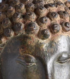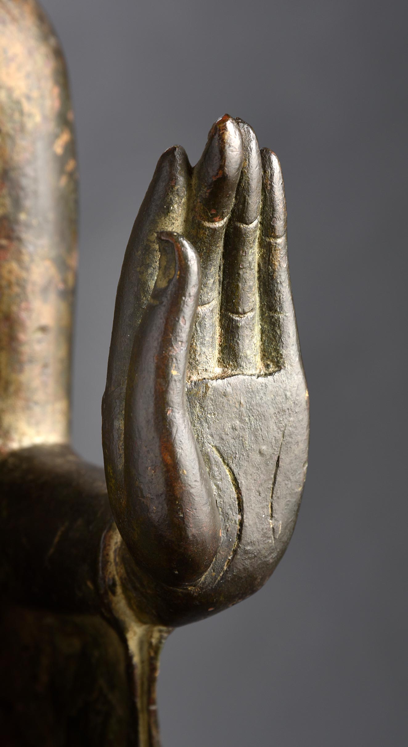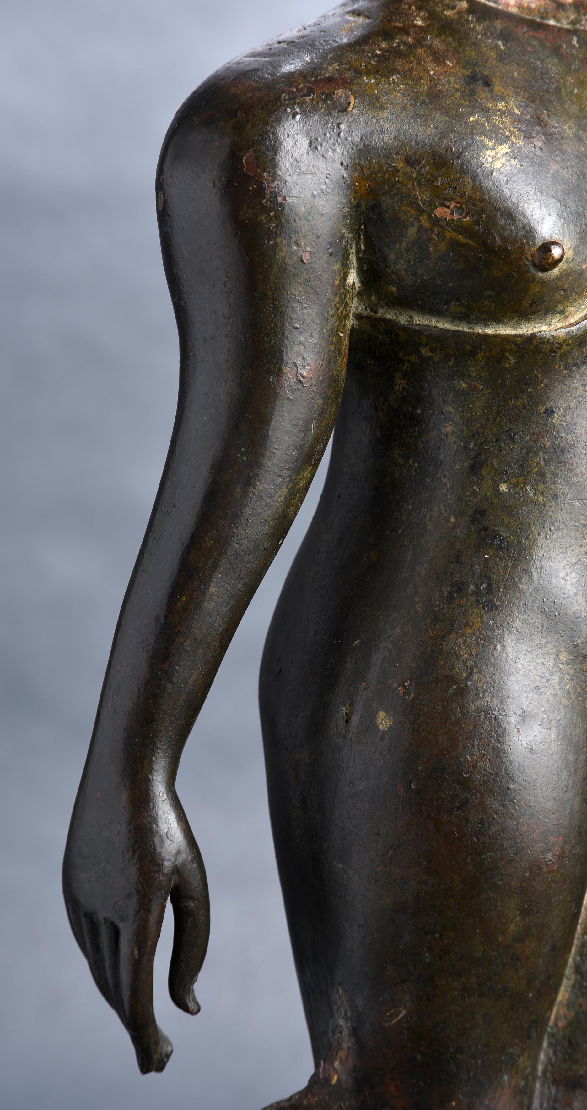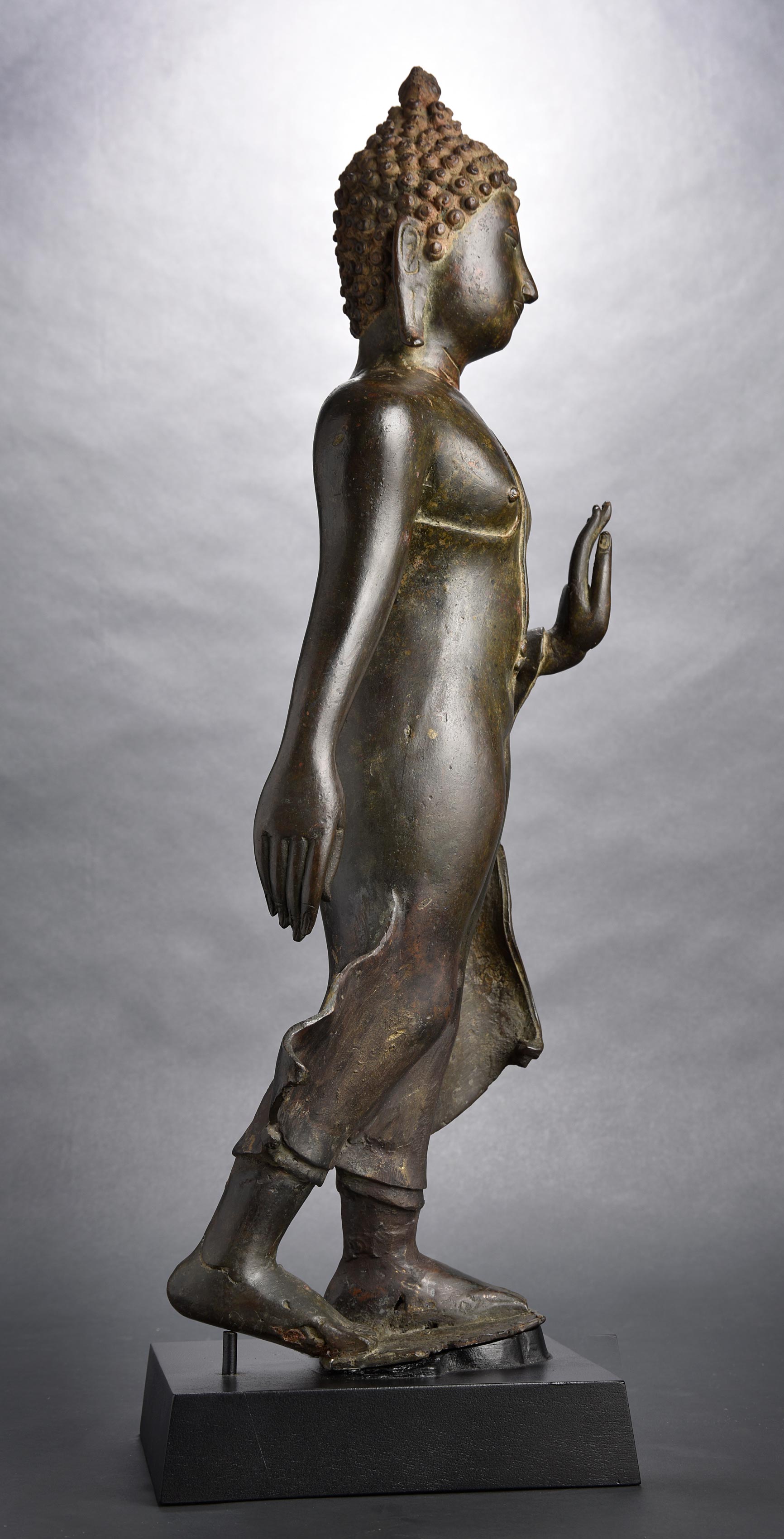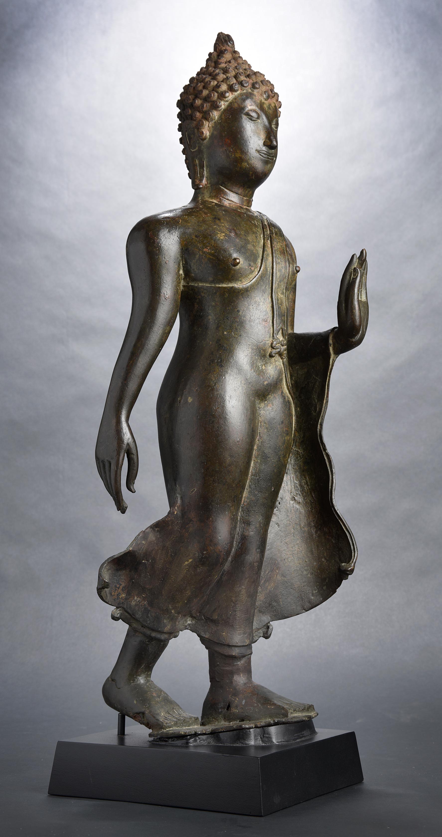 Best of my collection, this is of the earliest of all Walking Buddhas- A Superb, Large and Fine 13th/early 14th C Sukhothai Walking Buddha with a rounded body with defined buttocks, short, thick, well-formed limbs leading to elegant yet broad hands, and wide, thick feet. Later, Sukothai's sculpture became more stretched out and overall more remote- this fellow is warm, loving, and completely available. Not inexpensive, but he is rare, large, and in great condition. He is also beautiful, spiritually potent, and a highly sought-after type. Measures 26 1/2 inches tall with the base (base is 2 inches tall x 7 1/2 inches across x 8 inches deep). Without the base 24 inches tall x 7 inches across x 6 inches deep. Perhaps my single favorite out of more than 10,000 owned over 35+ years of collecting. Much rarer than the later SukoThai Buddhas, especially in this size quality and condition. I don’t often use the term, museum, quality, but in this case, it clearly applies..