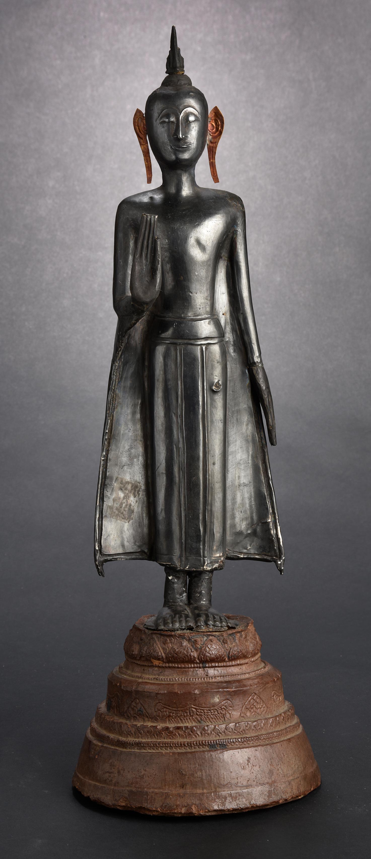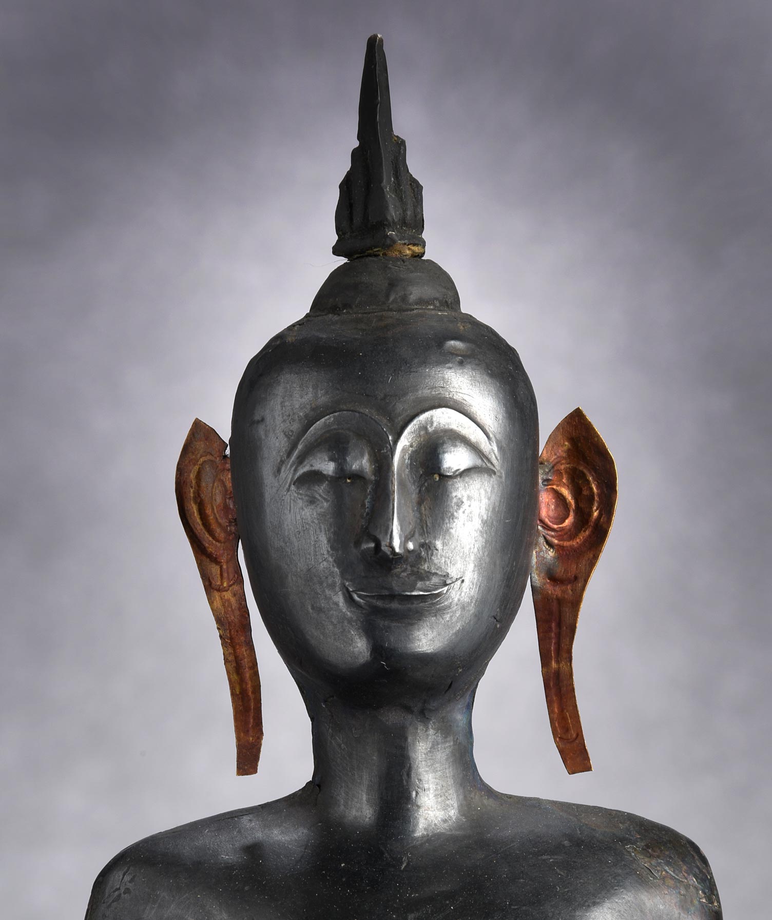 Supremely beautiful 18/19th C. Thai/Laos Silver over Clay Buddha. Best face I have ever seen on this type (Thai with Laos influence) measures 6 1/2 inches tall x 5 1/2 inches across x 2 1/2 inches deep. This type (authentic ones) always have repairs,because they are so delicate. Ears are not original.