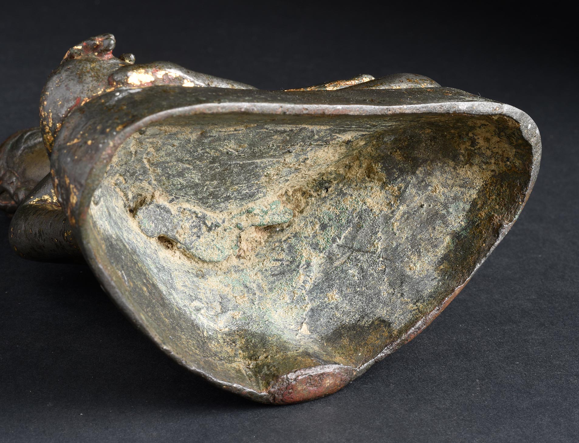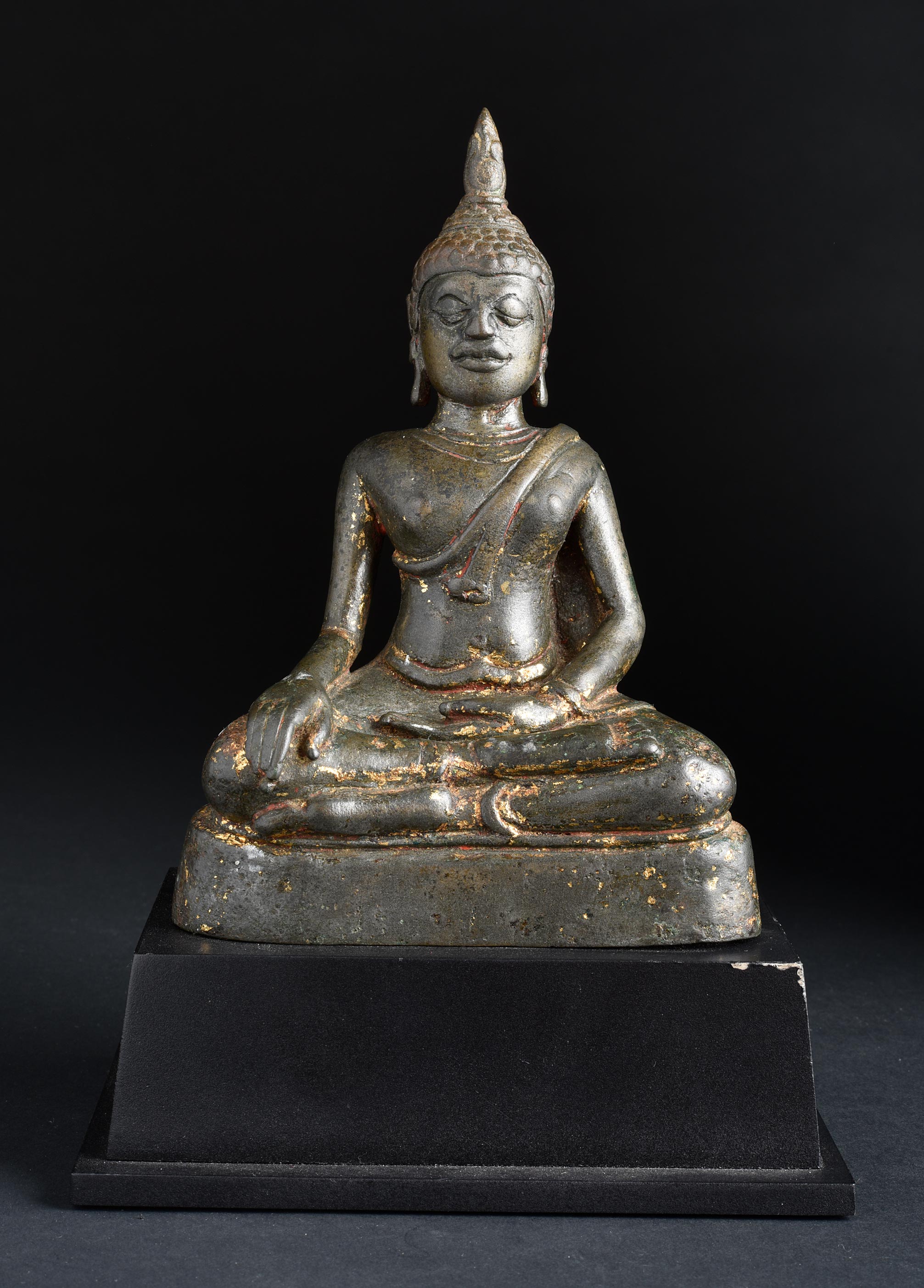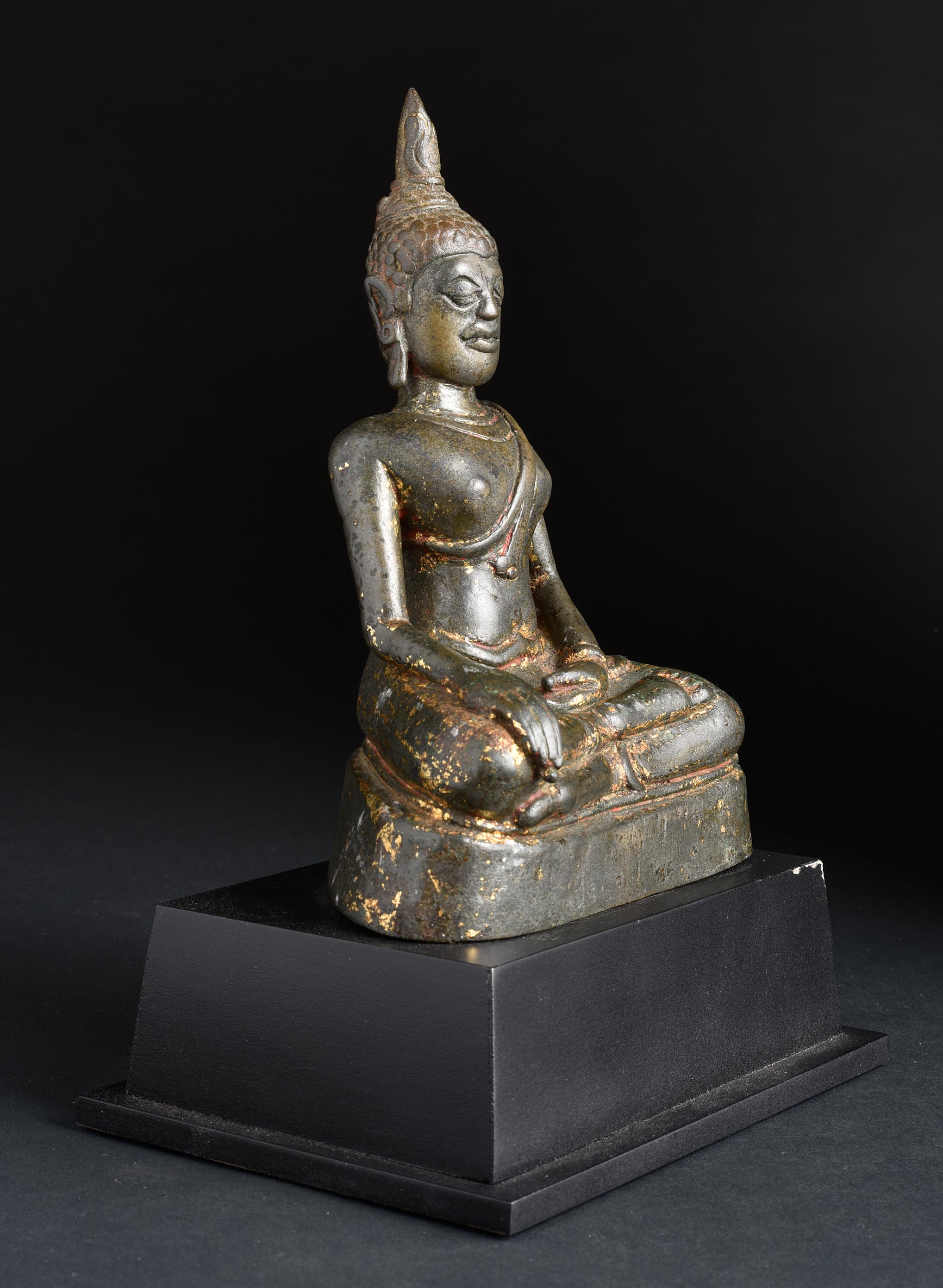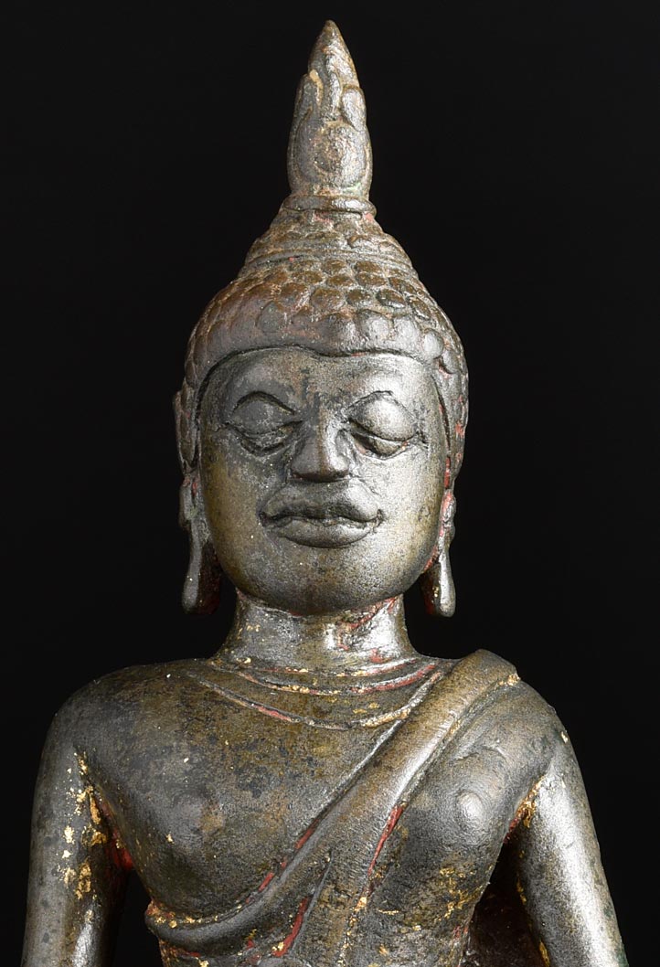 Early SE Asian Buddha. Fascinating and unique piece, with elements of Burmese, Thai, and Khmer influence. Almost certainly 13thC and possibly much earlier Remains of high karat gilding and red lacquer. Casting style is consistent with early Mon examples. This piece sits 6.5" tall and approximately 8.25" with its custom base. ( 4.53lbs / 2.055kg ) *with Base