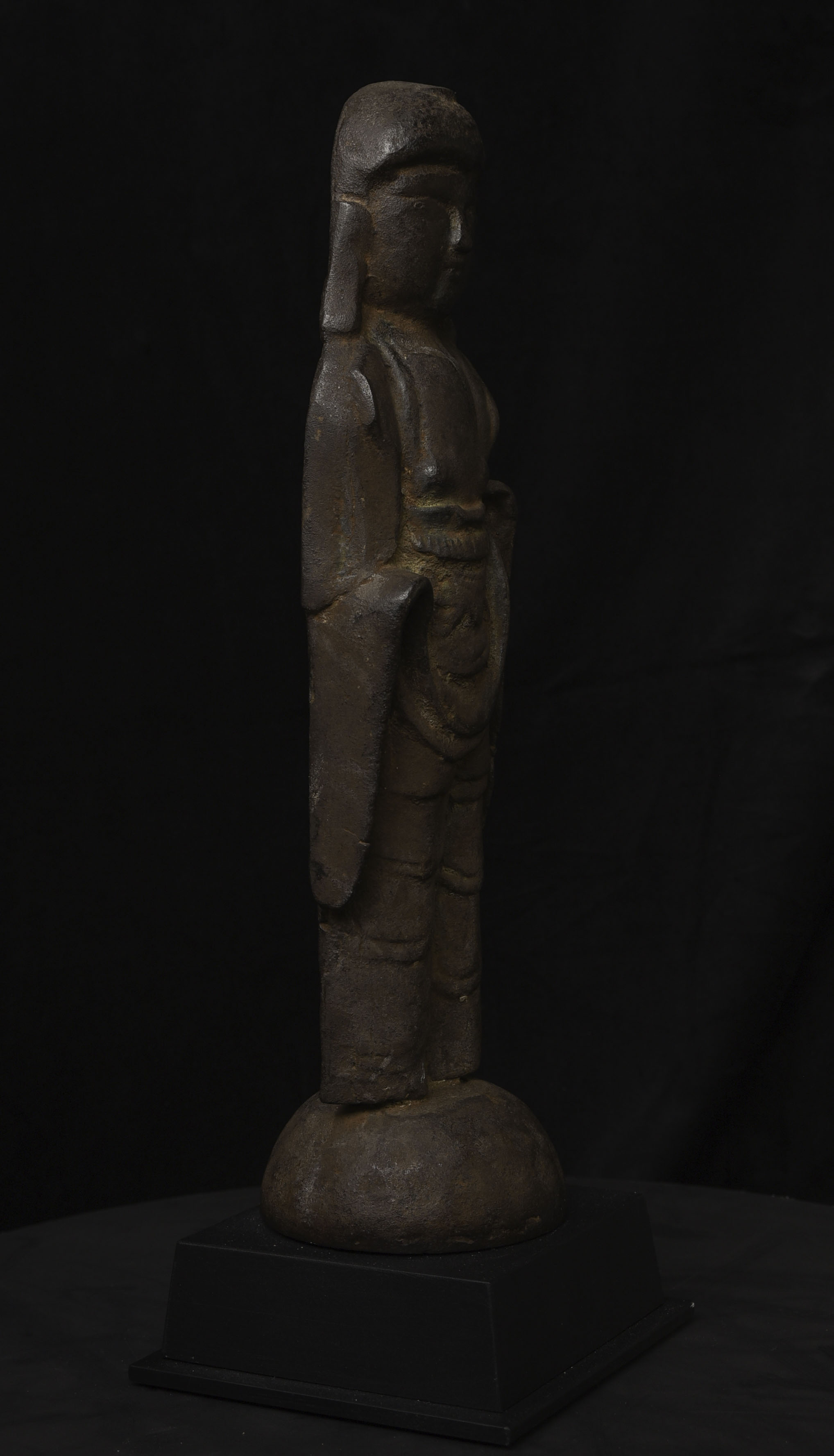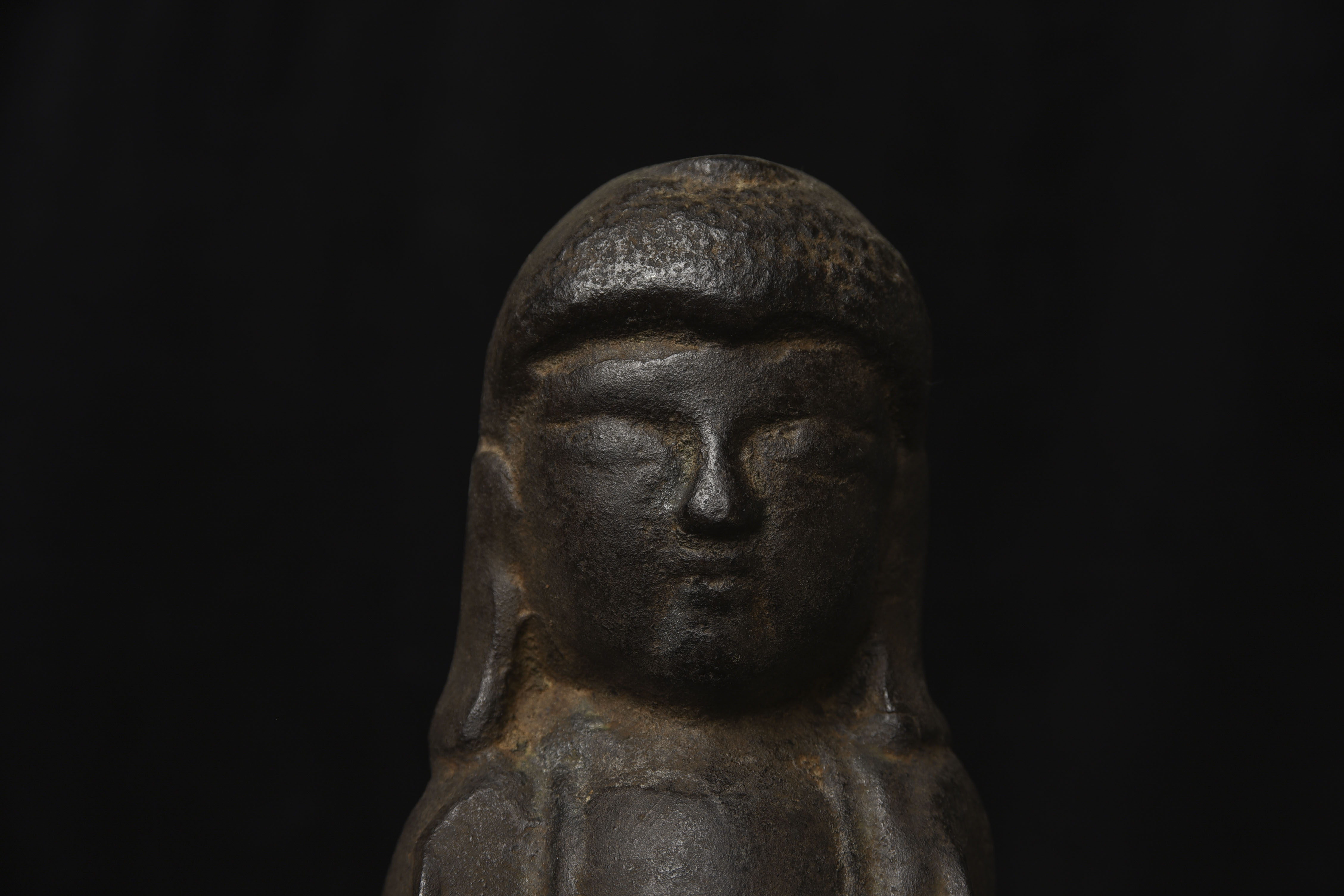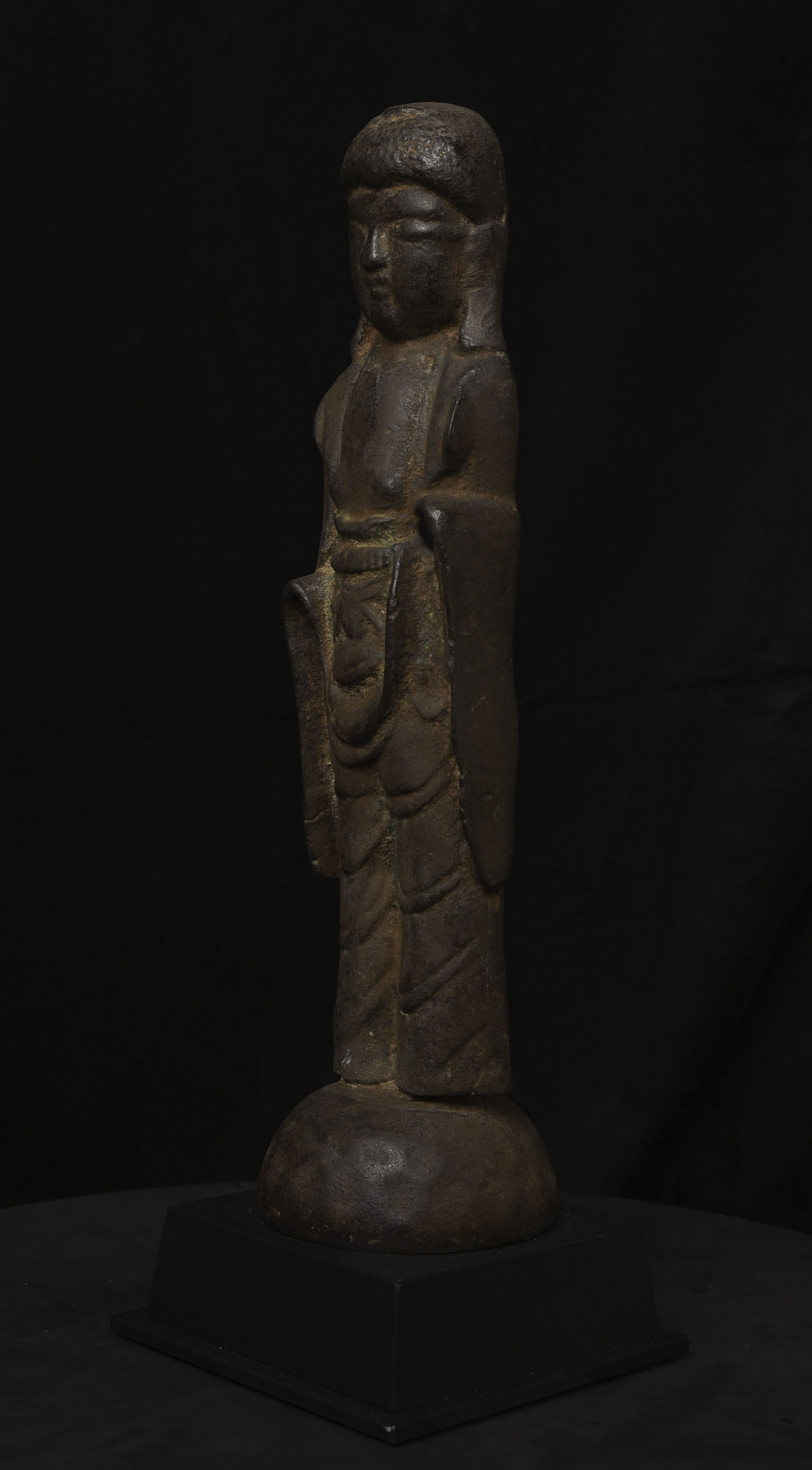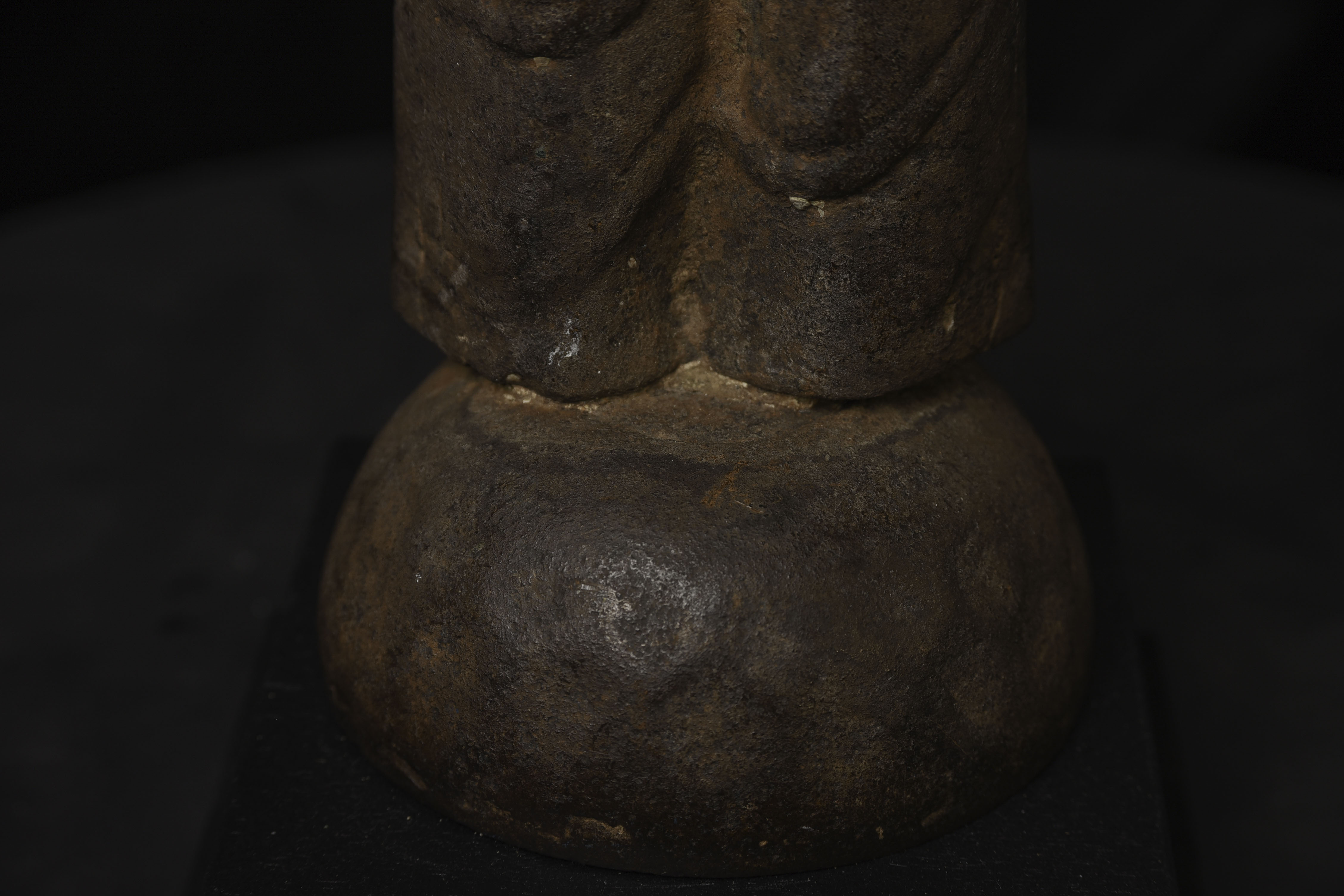 13/14thC Korean Buddha-large and thickly cast in iron in an early backless style. Rare and large for its type at 16 inches tall not including the museum type custom base. Beautiful smooth, untouched patina. Missing (separately cast) hands. The bottom has a diameter of 4 inches (without modern base). Very peaceful expression. You are unlikely to see another of this type in this size and quality outside a book or museum. Note- I just purchased a very closely related bronze pair of standing Buddhas in bronze from the same period which you can find in the "Korean" section of my website. ( 16"H x 4"W x 4"D ) 12lbs . Strong spiritual feel
