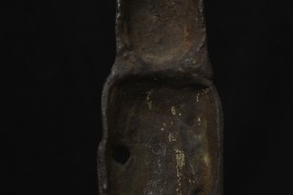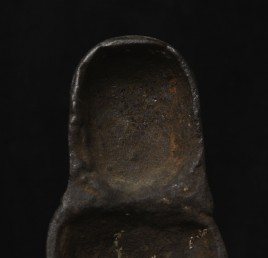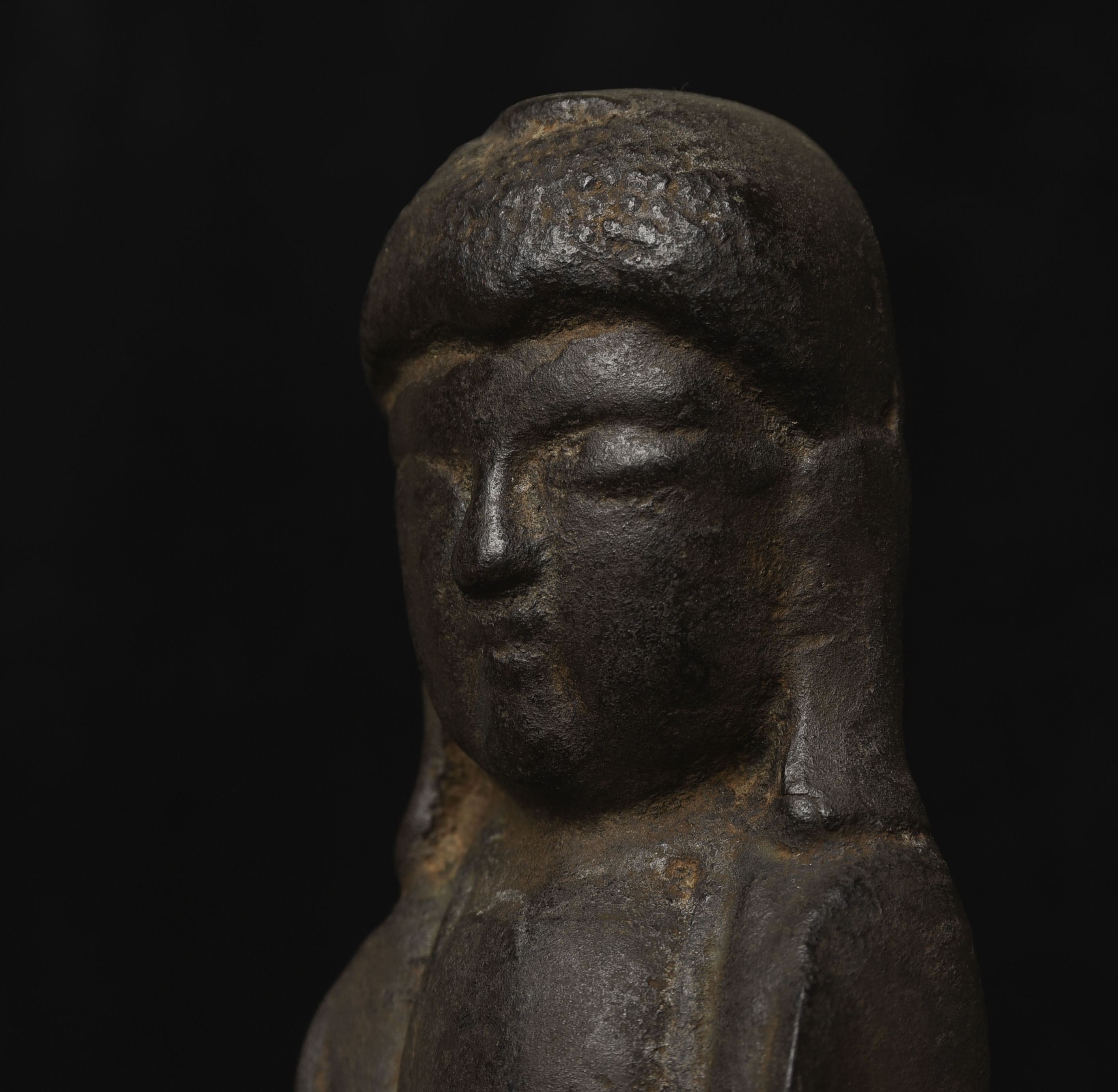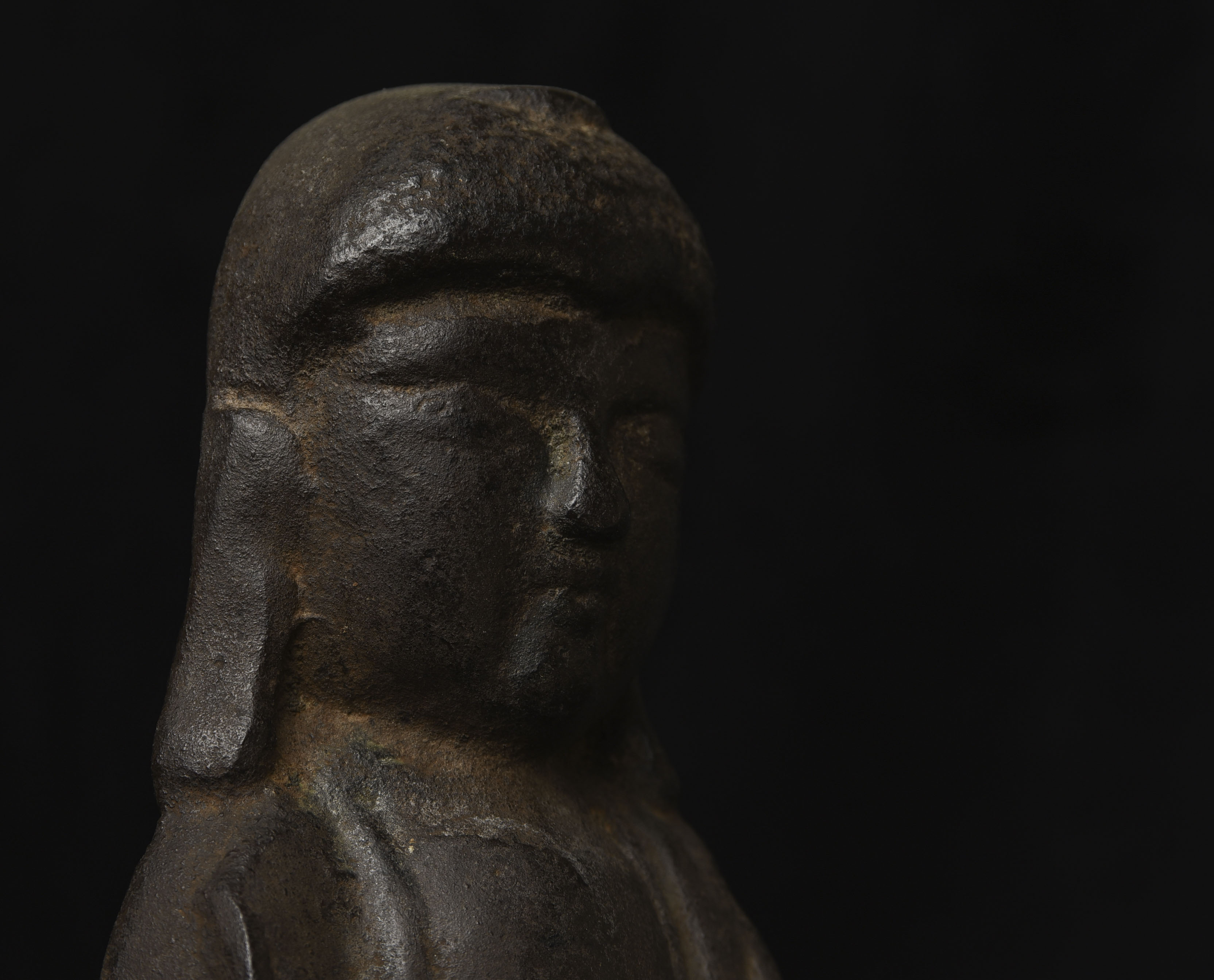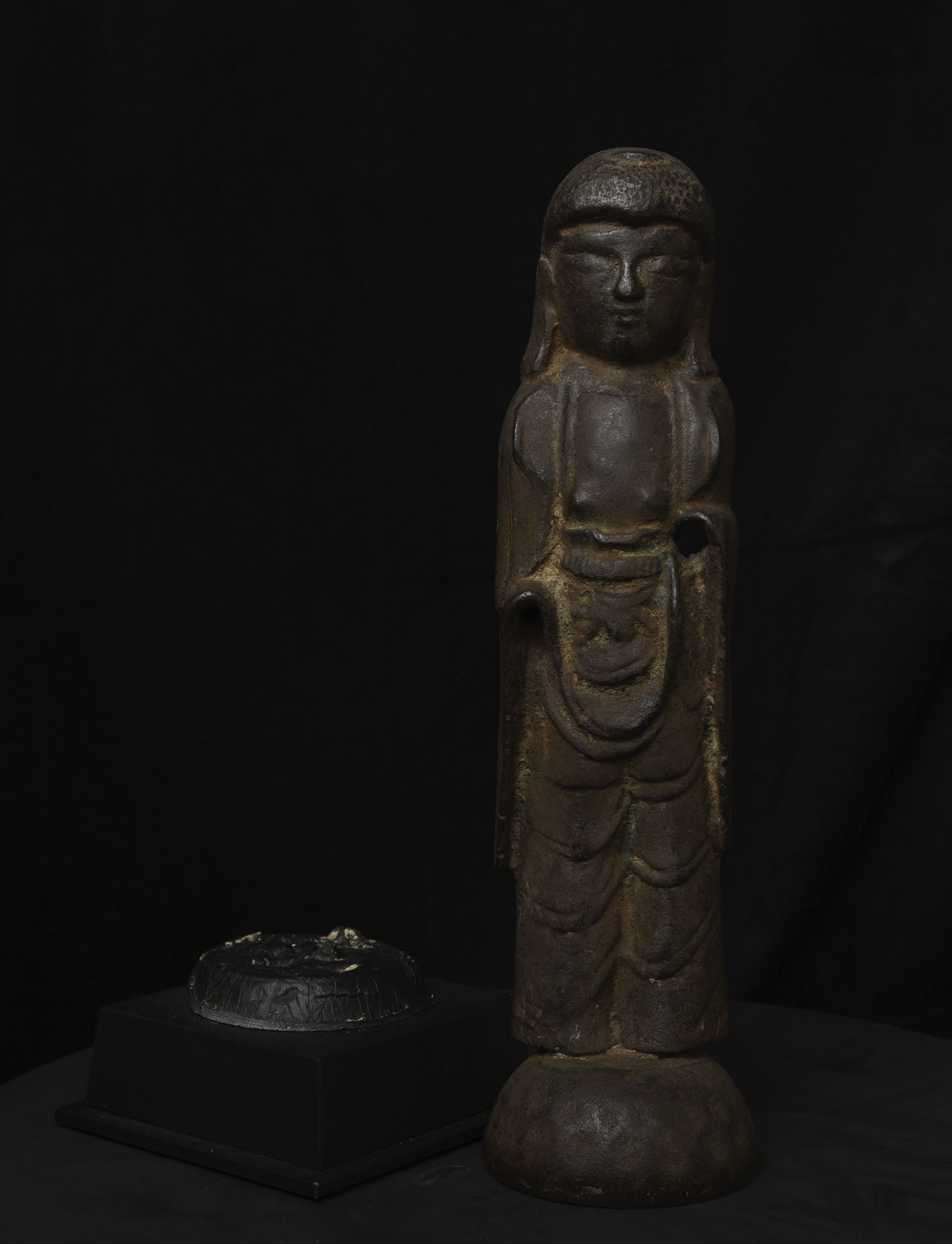 13/14thC Korean Buddha-large and thickly cast in iron in an early backless style. Rare and large for its type at 16 inches tall not including the museum type custom base. Beautiful smooth, untouched patina. Missing (separately cast) hands. The bottom has a diameter of 4 inches (without modern base). Very peaceful expression. You are unlikely to see another of this type in this size and quality outside a book or museum. Note- I just purchased a very closely related bronze pair of standing Buddhas in bronze from the same period which you can find in the "Korean" section of my website. ( 16"H x 4"W x 4"D ) 12lbs . Strong spiritual feel