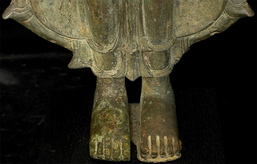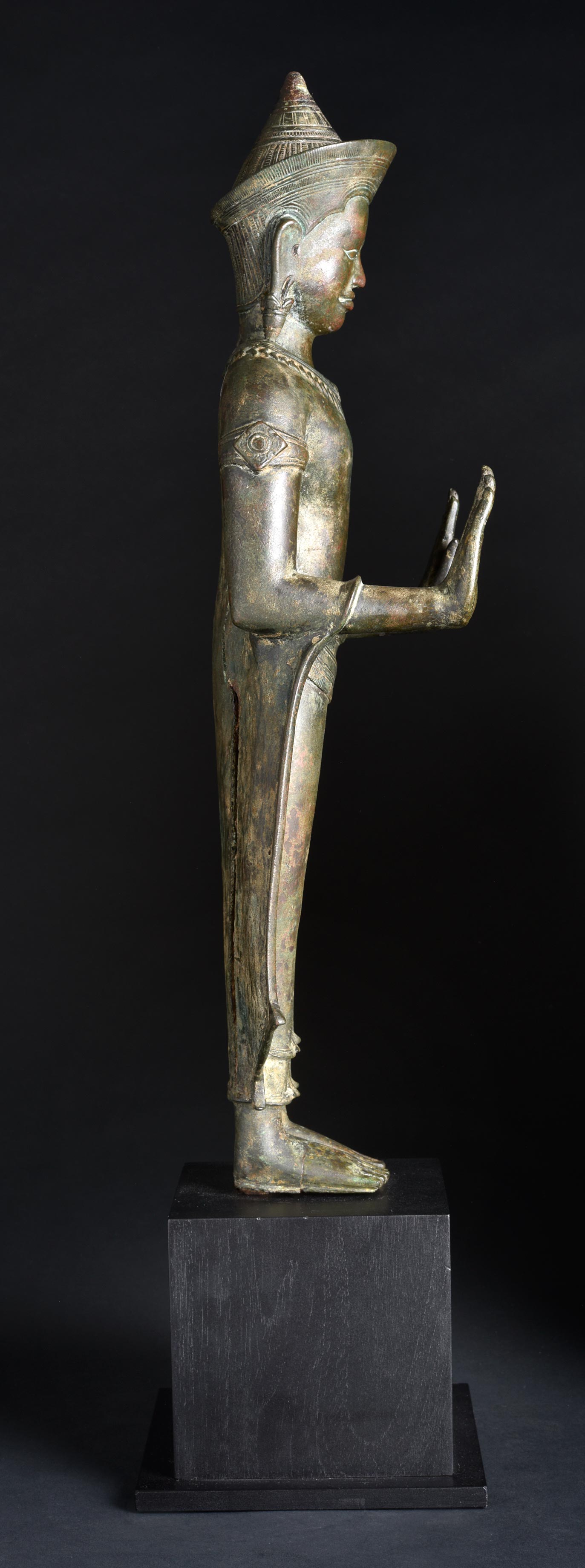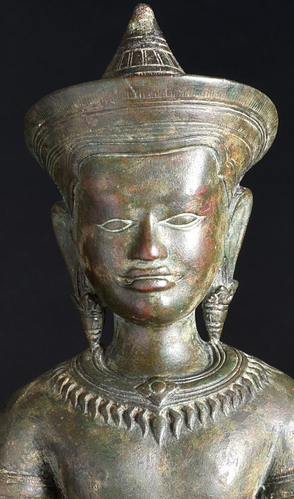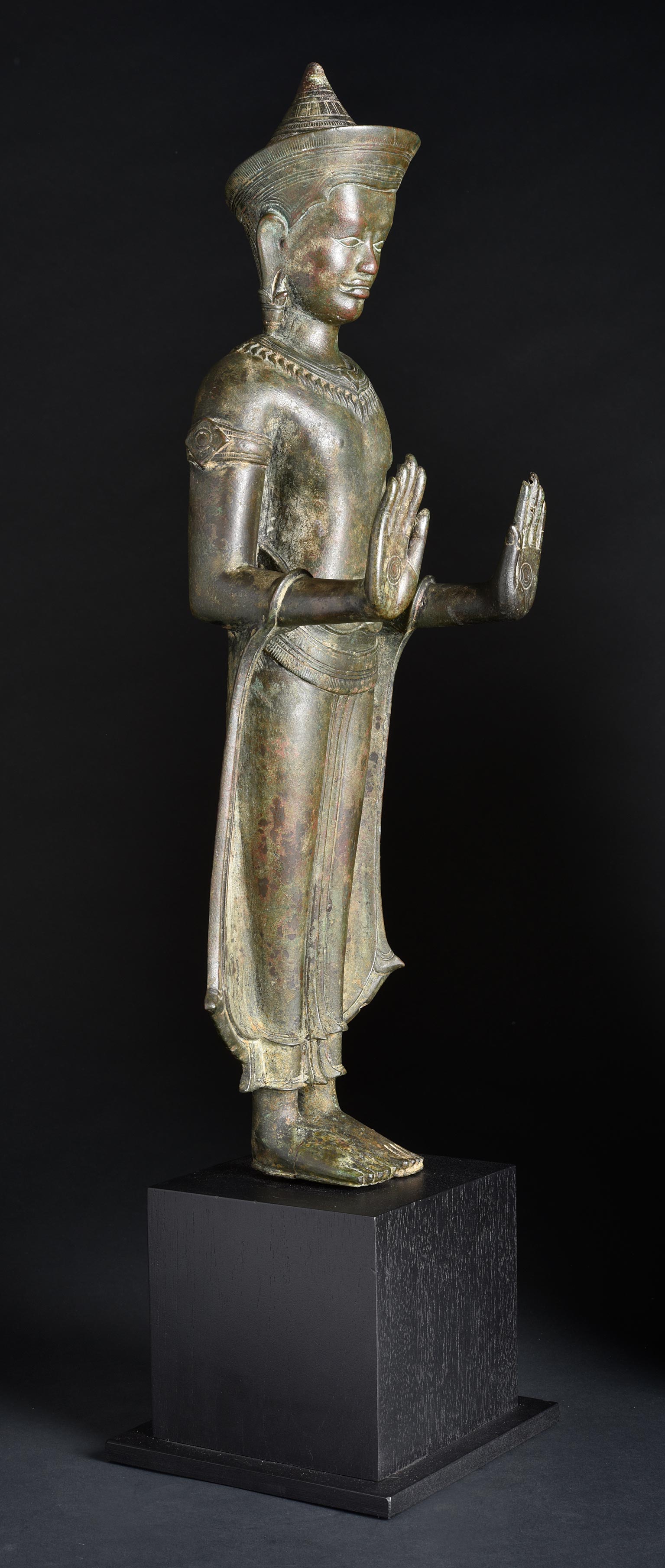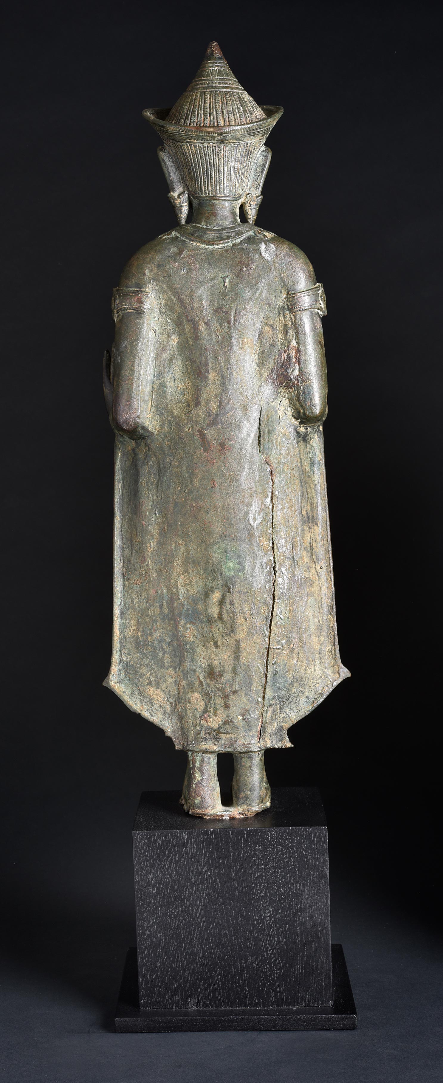 13thC Crowned Khmer Buddha. From the collection of a wealthy east coast physician who put their collection together over 50 years. This Buddha is 20 inches tall, height on attached stand is almost 25 inches. Heavy, as it is either solid or nearly solid cast. Ninety eight% of this type of Buddha in this large size that looks so perfect tends to be fake, or to be 18thC emulations-this one is qualitatively different- based on the quality and feel of the casting, patina growing out of the metal, and overall "feel believe this one to be the real thing. I have had people who buy high end pieces like this want to take them to local experts or to get scientifically tested for age. Everyone who buys on my site can automatically return any piece for any reason for 2 or 3 weeks after purchase. If you want to do a test and need more time you can negotiate with me for additional time to study the piece in advance- I'll work with you to do whatever makes sense. The reason this piece is listed is because I recently made a very large purchase at the same time I medically retired from my "day job" and will be putting up some of my high end pieces in my personal collection.