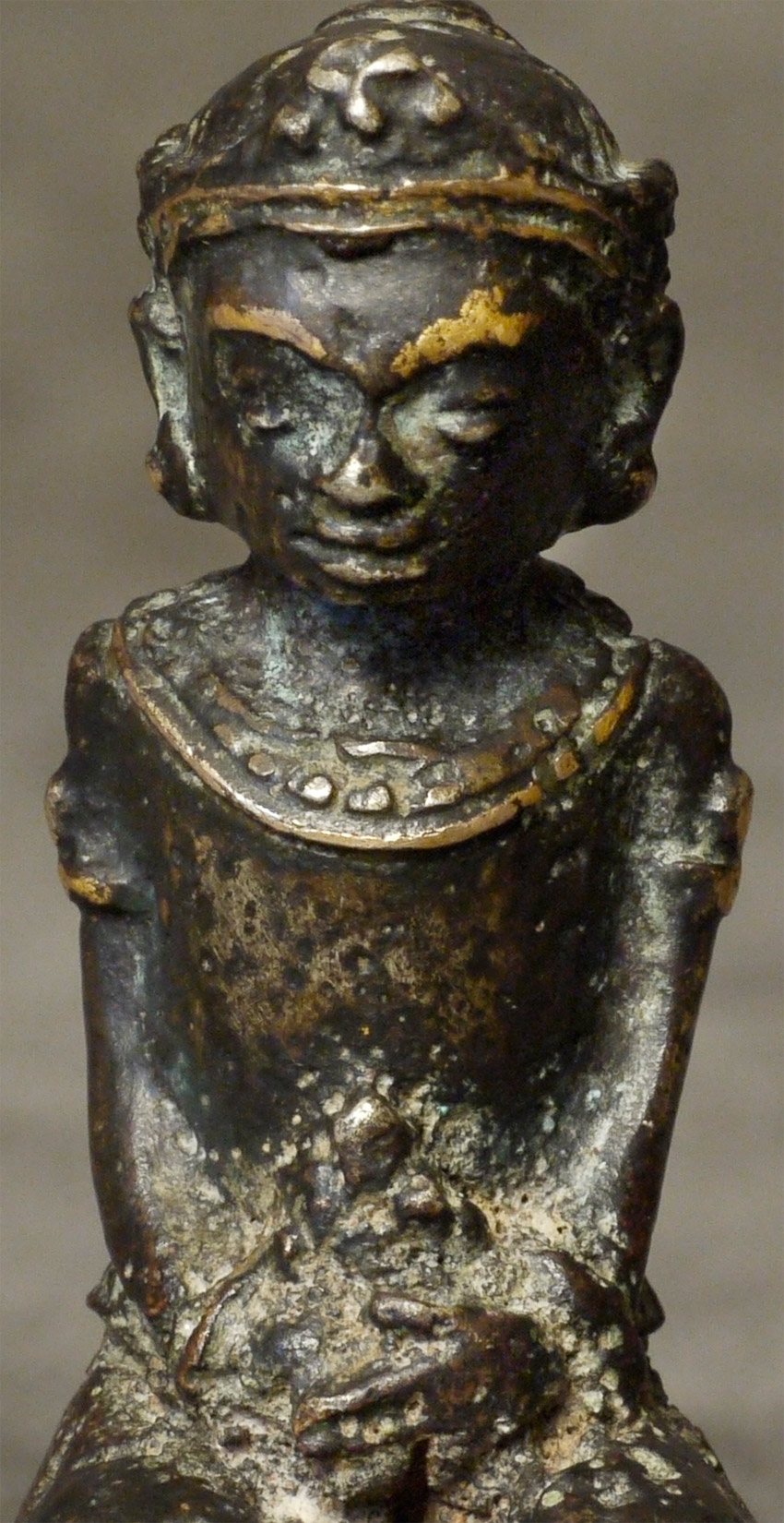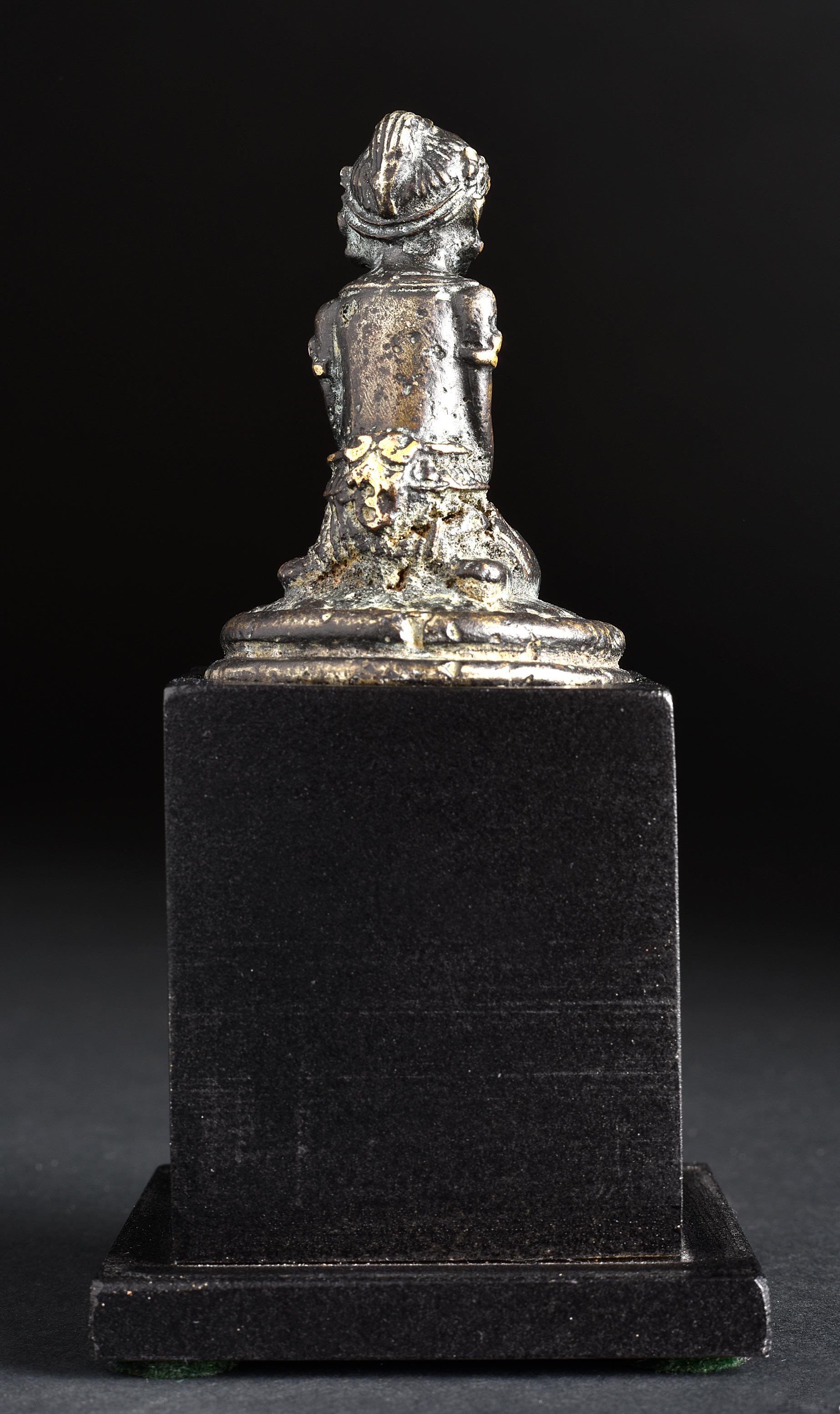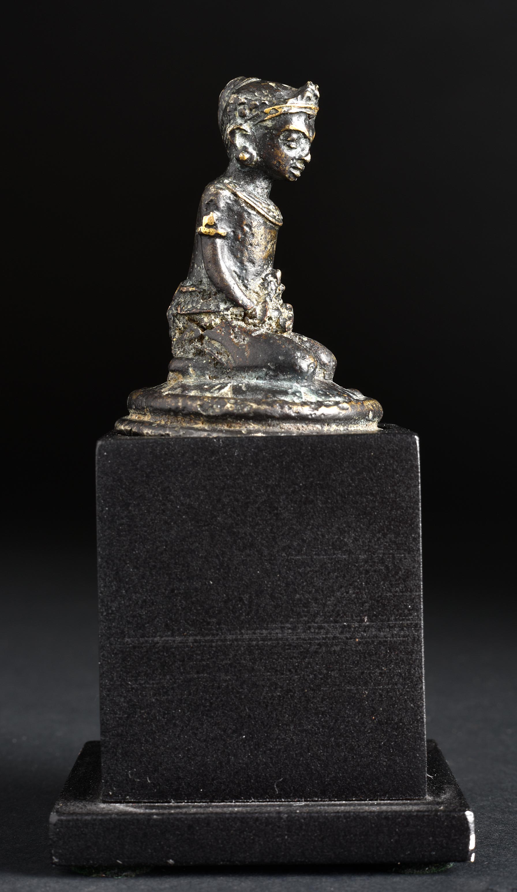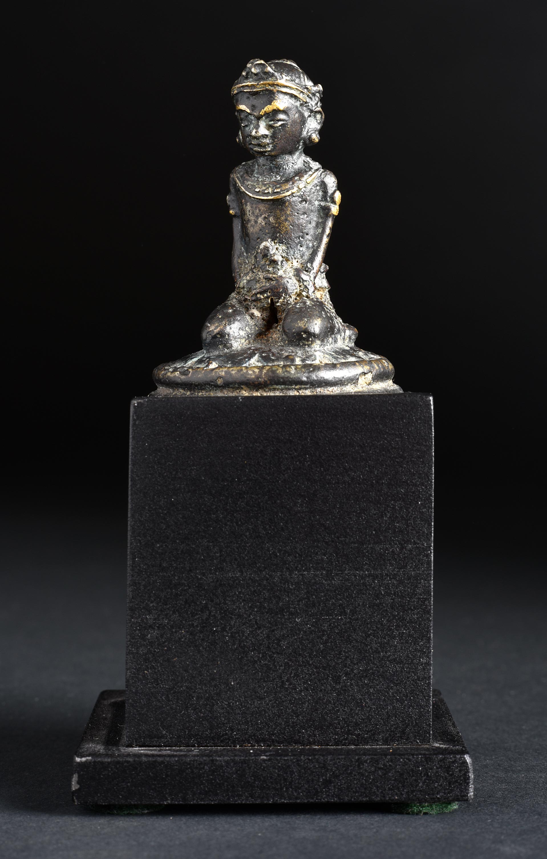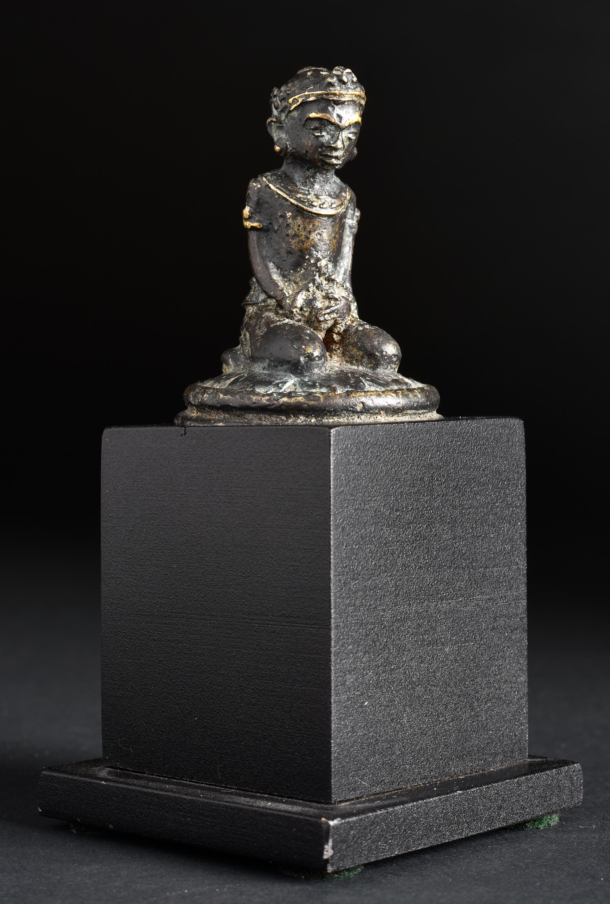 Fine 14th Century Indonesian miniature figure. 1 5/8 inches tall, 3 7/8 inches on custom stand. Of best Majapahit quality.